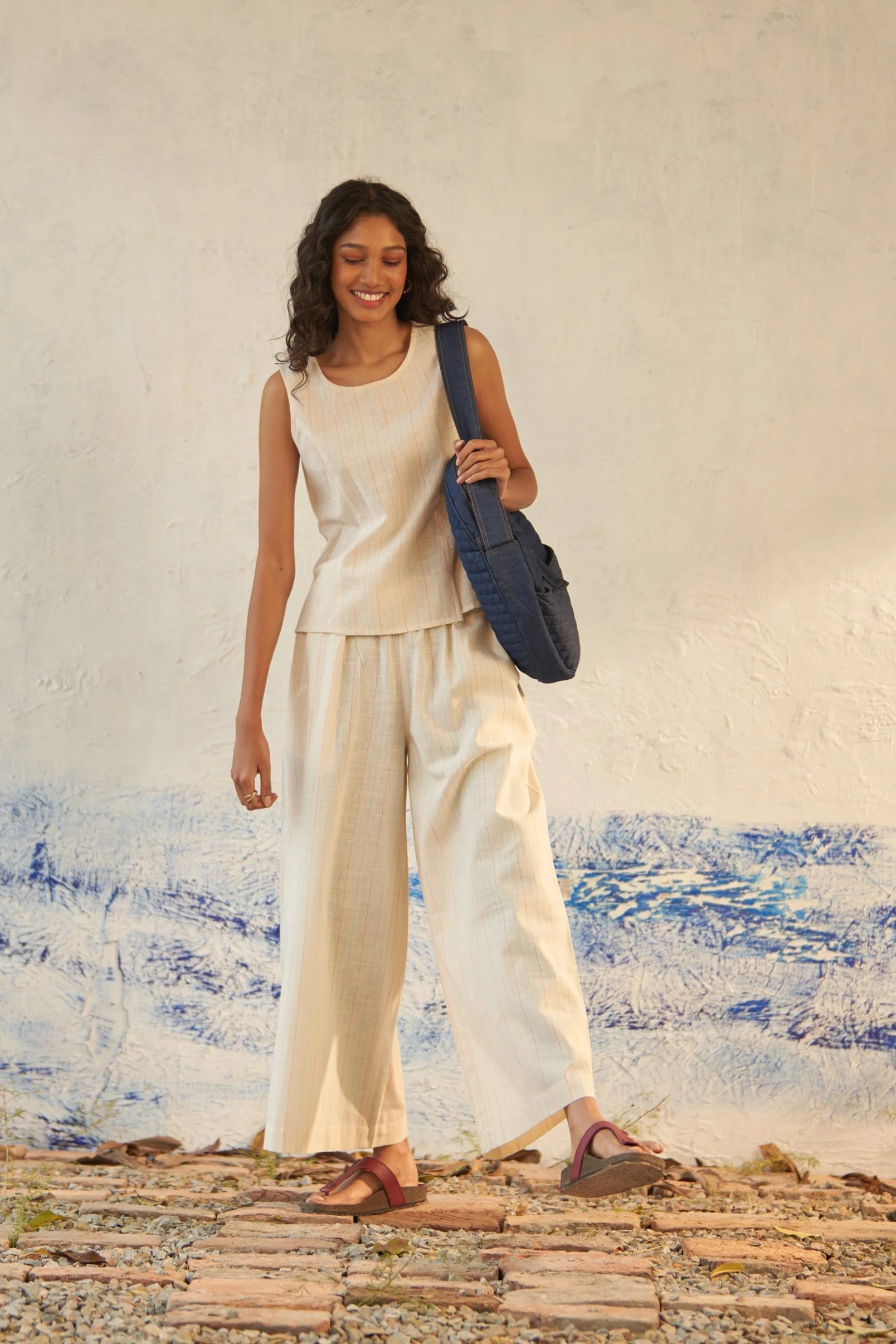 Crafted from textured cotton with a delightful hint of colorful stripes sprinkled throughout, this ensemble is reminiscent of the comforting sweetness of vanilla ice cream with a playful touch of colorful sprinkles. The sleeveless top features a round neckline and a delicate front slit, adding a subtle charm to the look. Paired with flared pants boasting a simple gathered elasticated waist and practical side pockets, this ensemble offers both style and comfort.