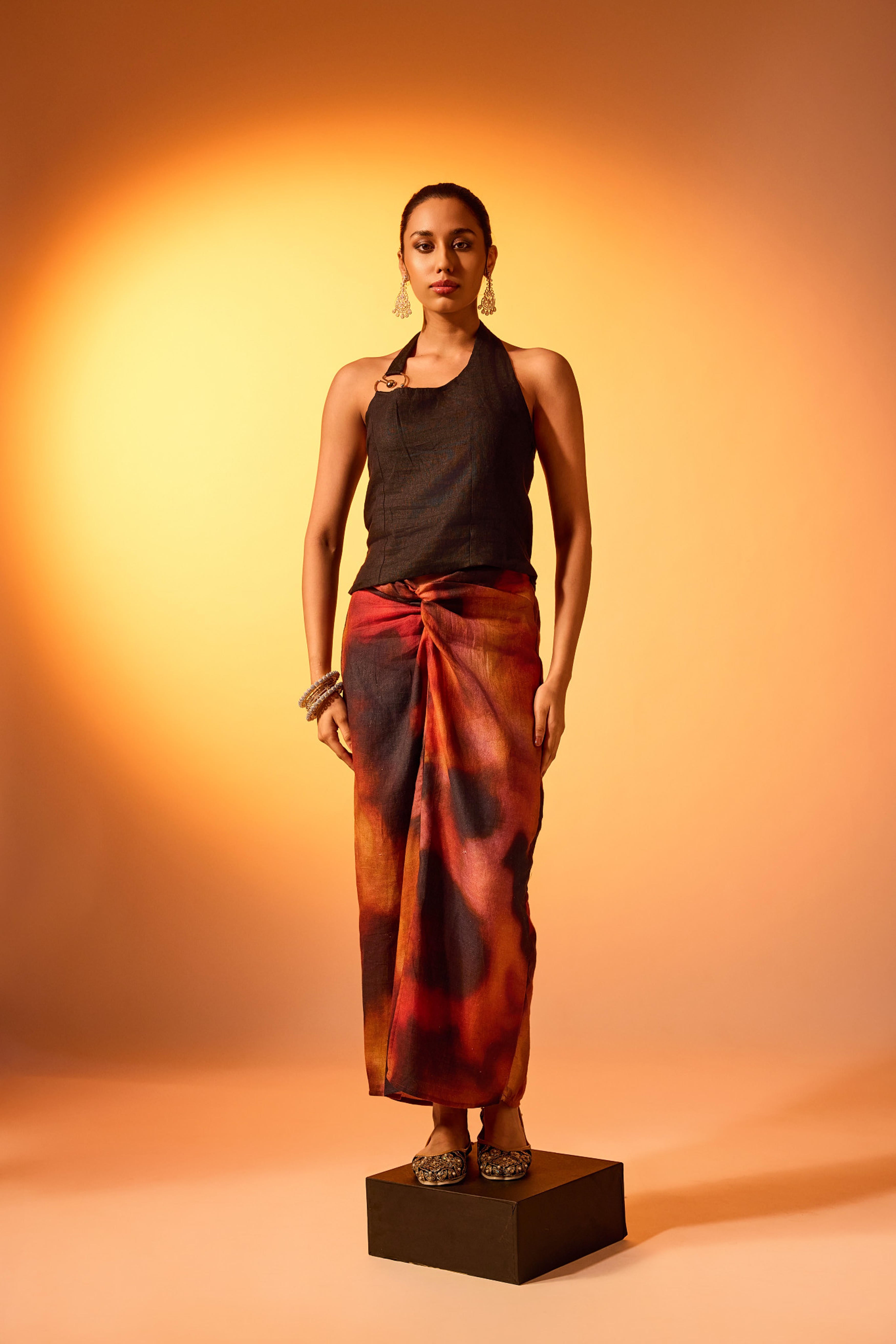 Meet the Aakansha Set in Inferno, a modern take on co-ords that pairs a minimalist halter top with a sculptural sarong skirt in smouldering colours. The top is tailored in balck linen with a curved neckline and a statement metal ring connecting the single halter strap, while the back is smocked for a secure yet flexible fit and a hidden side zip makes dressing easy. Sitting on the natural waist, the ankle-length skirt is cut from 100% linen in our Inferno print, a marbled swirl of crimson, burnt orange and midnight hues, and drapes in a sarong wrap with a pleated knot that flatters the silhouette. This two-piece set is perfect for an intimate sangeet, or reception cocktail hour. Style it with statement earrings and embroidered flats for a festive look. After the celebrations, wear the top with high-rise jeans or pair the skirt with a black bodysuit for a resort dinner or beachside soiree.