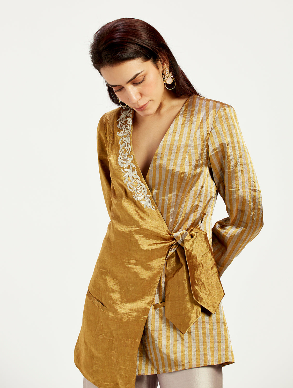 Make a statement with the Cusco Golden Bow Blazer. The luxurious golden bow adds a touch of opulence to this timeless blazer. Elevate your wardrobe with this luxurious and versatile piece.