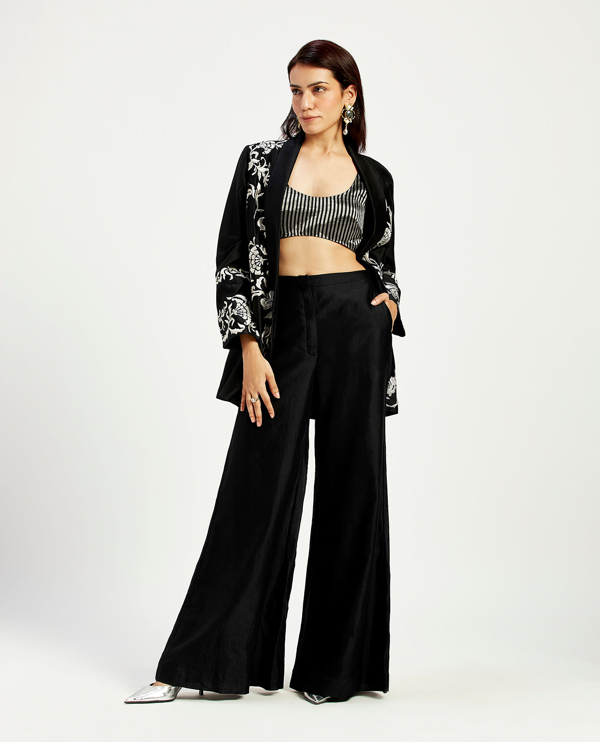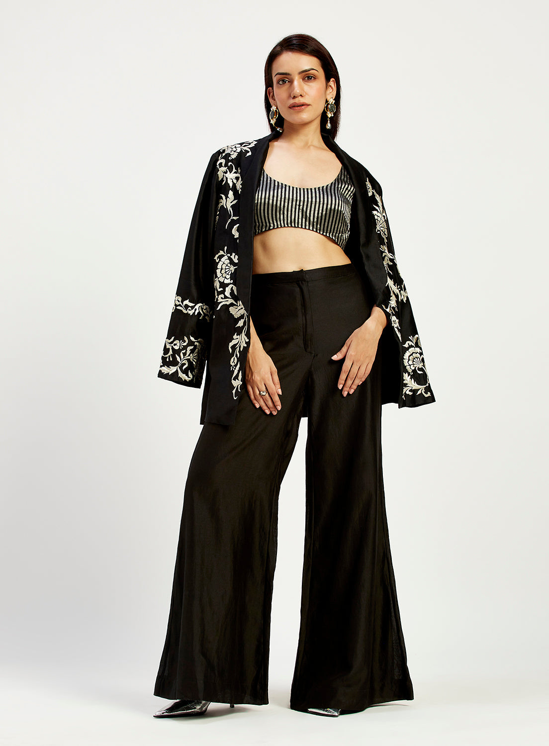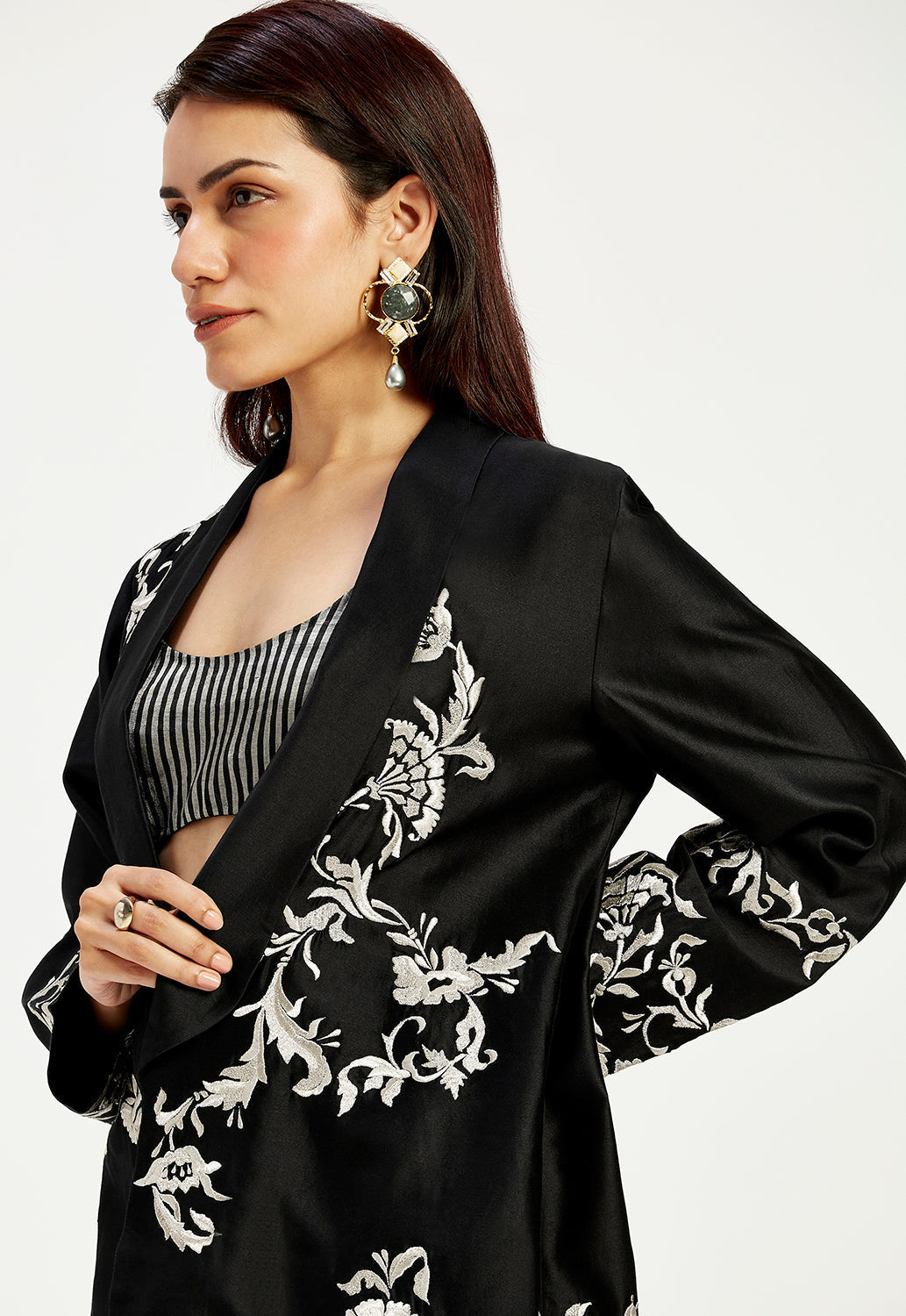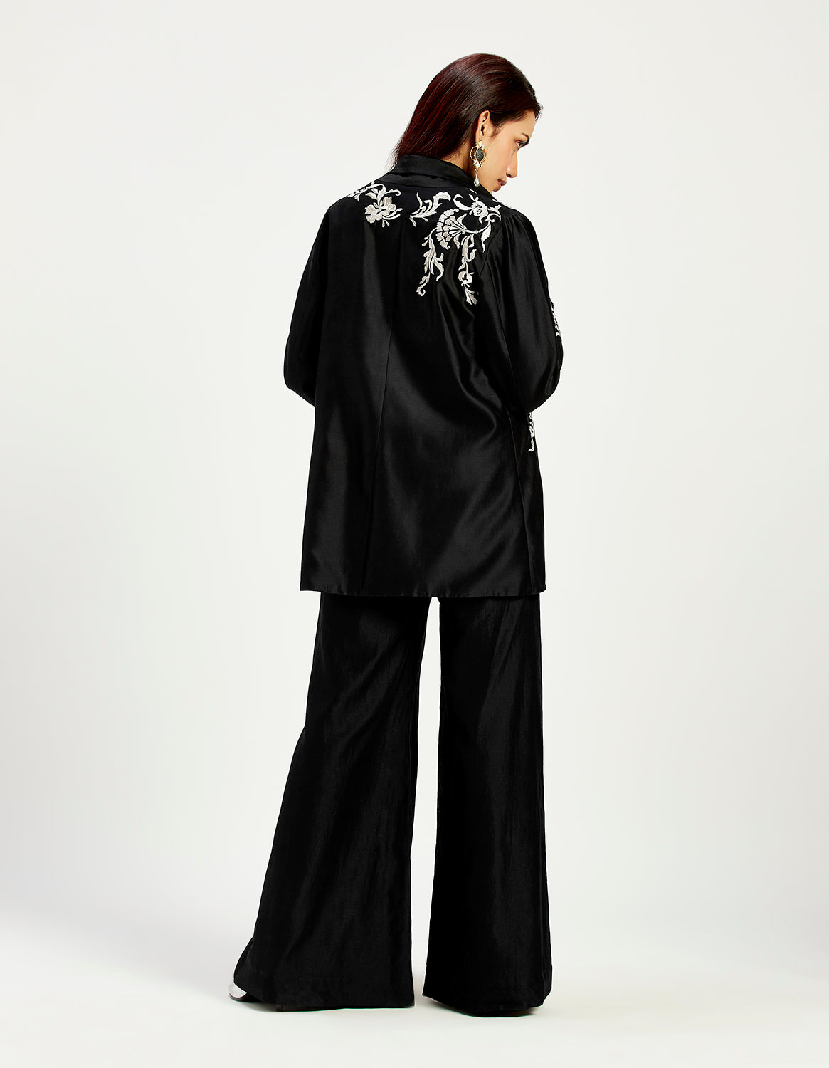 Indulge in refinement with our Ebony Tendril Jacket and Pant Set. The intricate tendril embroidery adds a touch of sophistication, while the luxurious fabric offers comfort and style in one. Elevate your wardrobe with this exclusive set, perfect for any occasion.
