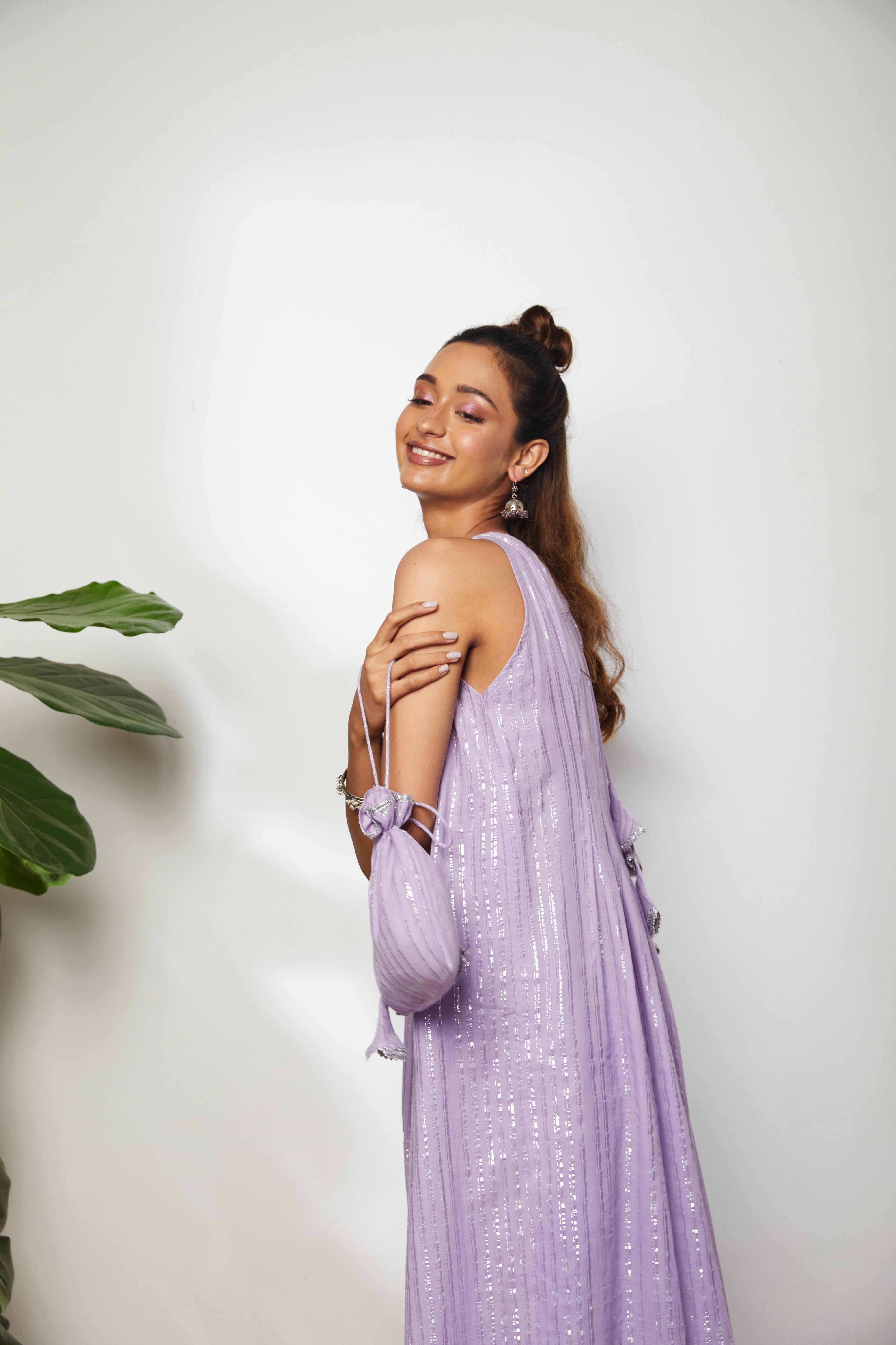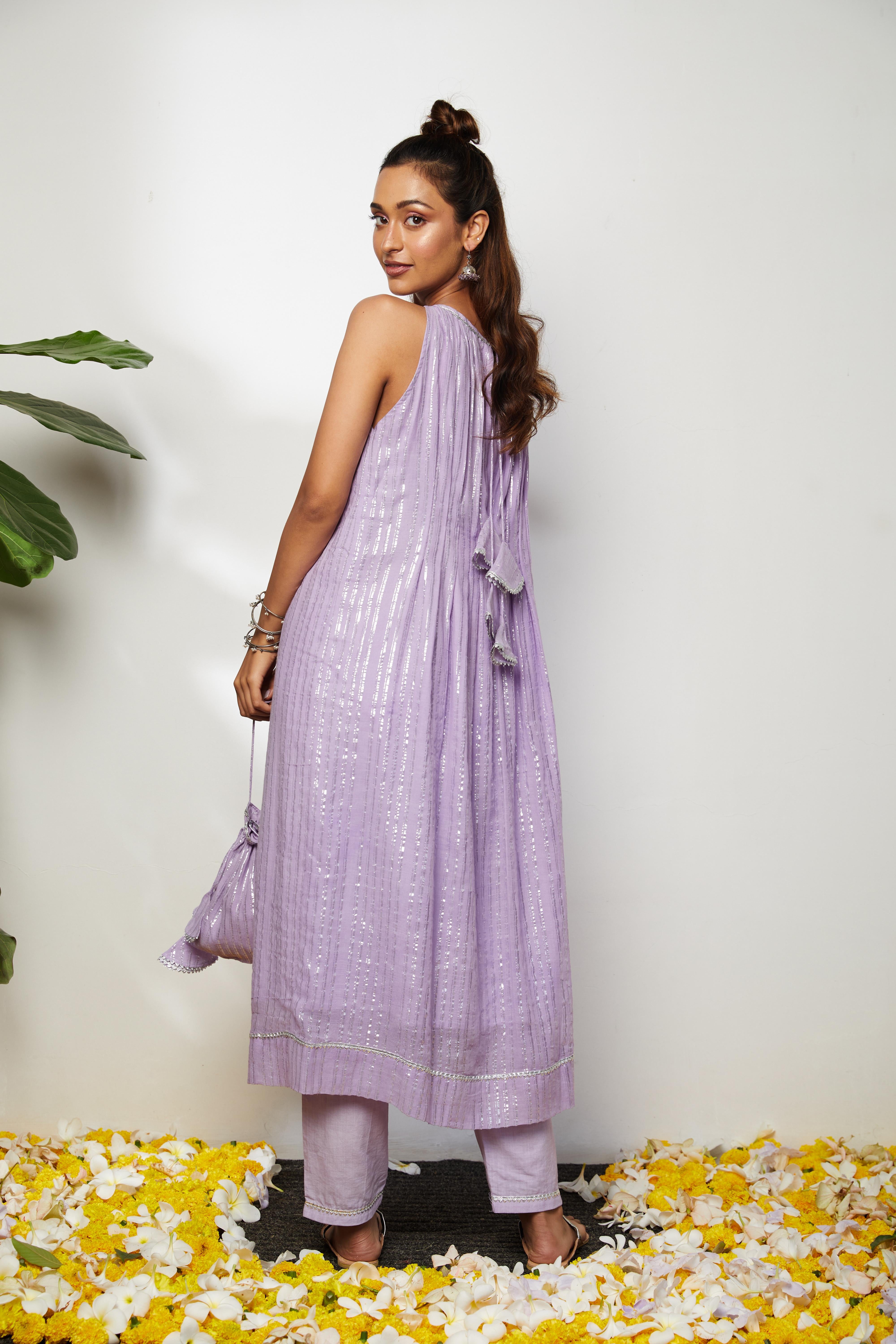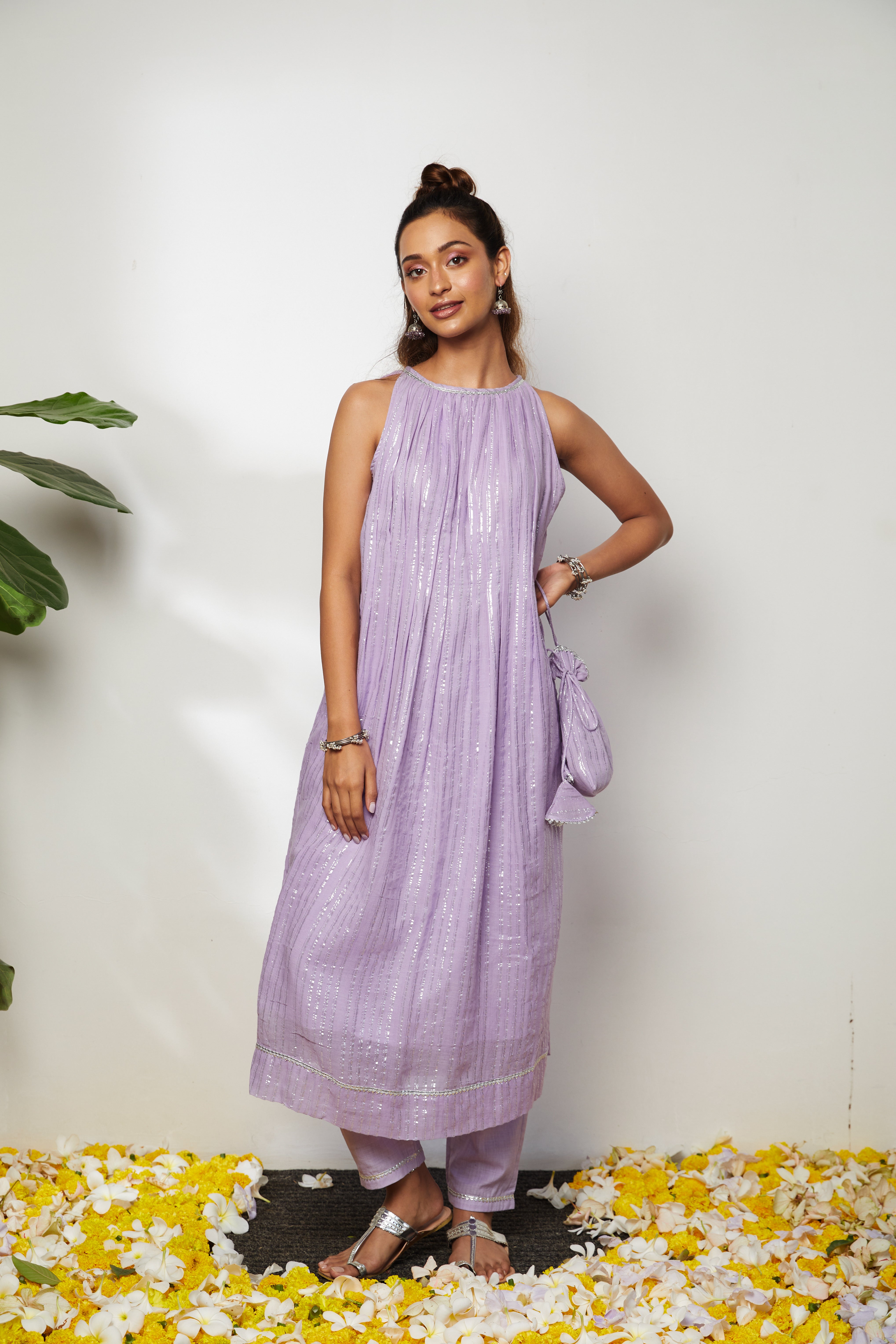 For a simple-toned occasion, create a sleek and stylish look with a halter neck kurta paired with straight pants. Keeping the ensemble minimalistic with delicate detals of tassel tie ups at the back.