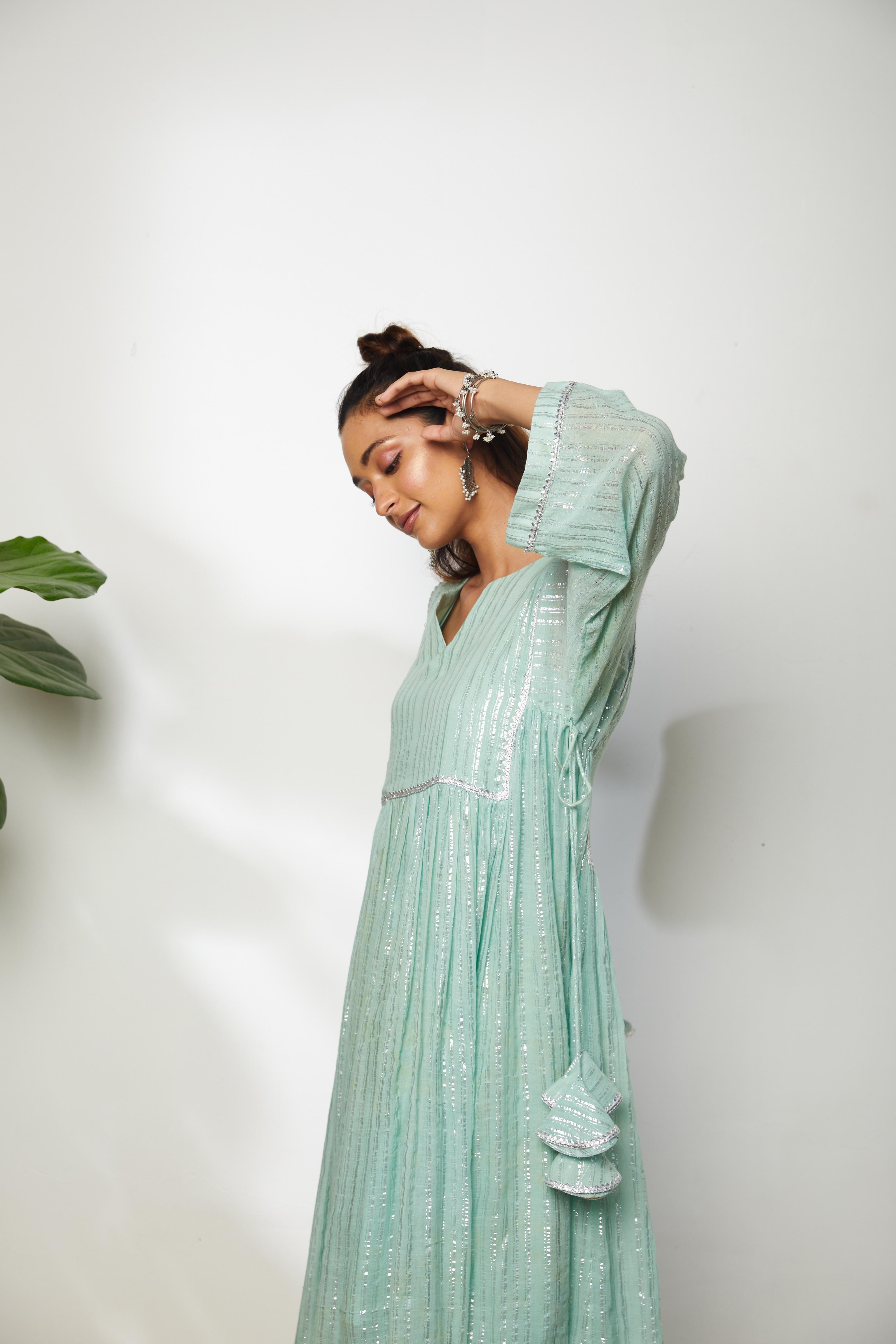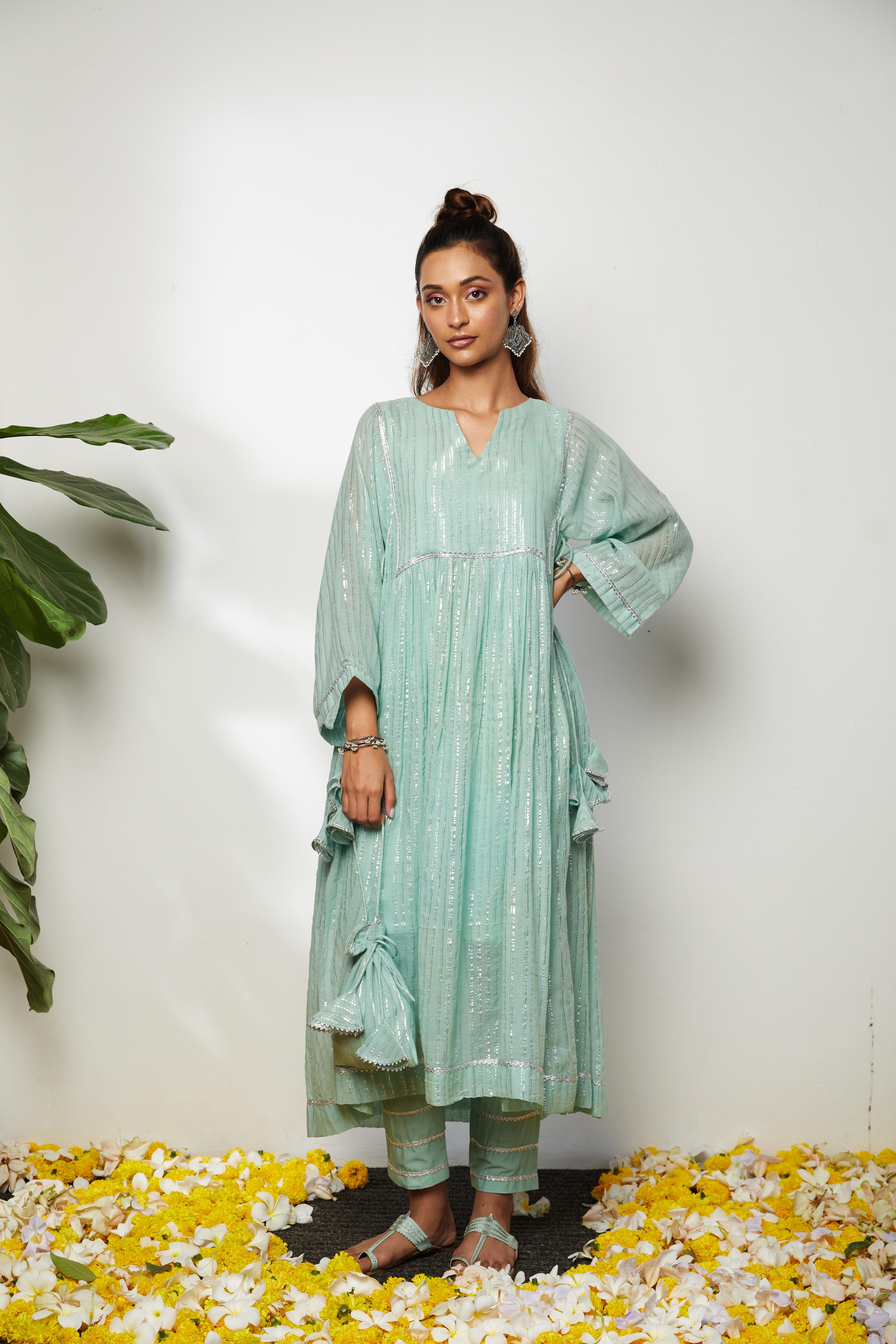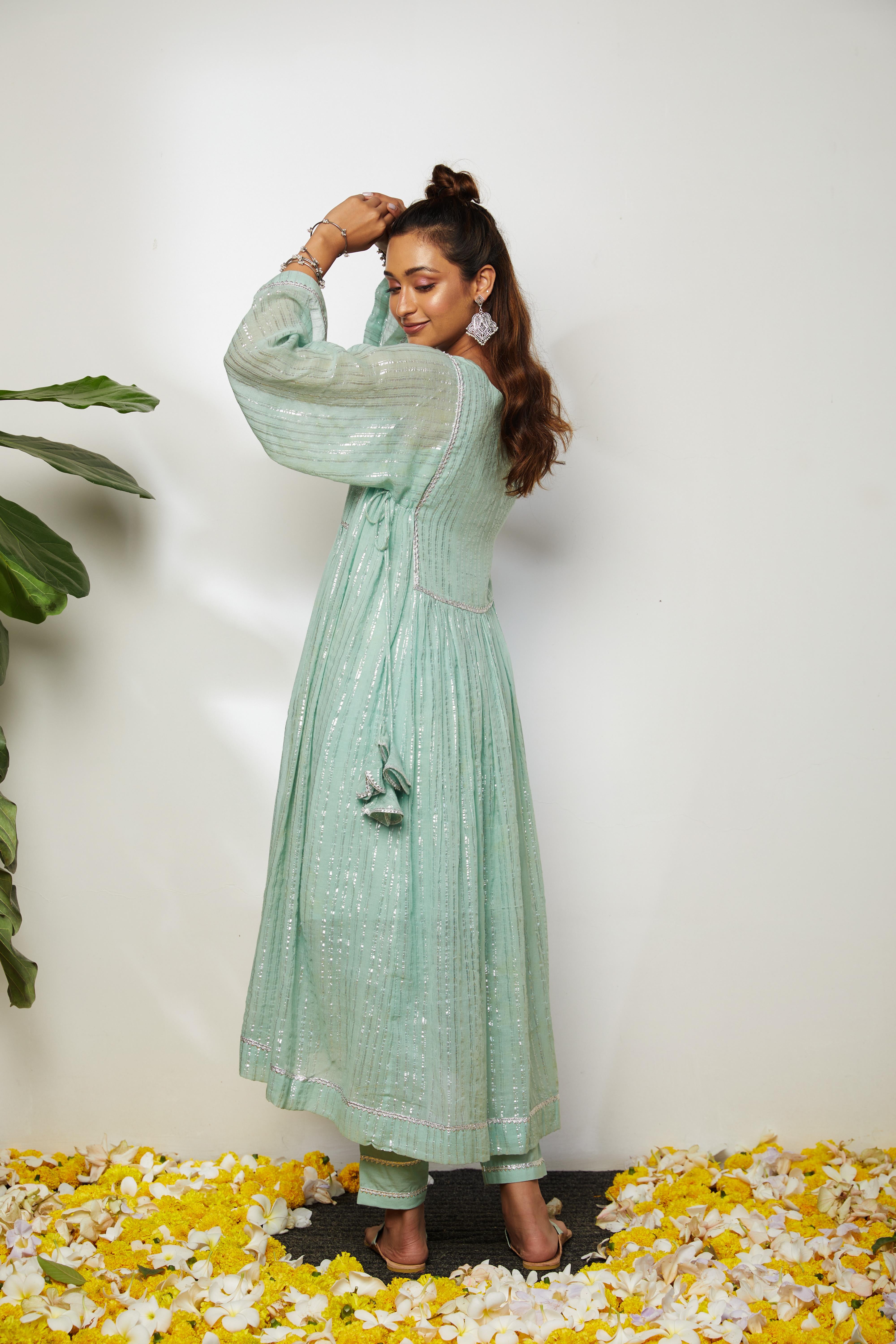 Elevate your style at housewarming parties or sangeet functions with a fantastic powder blue long kurta. The flowing silhouette of the dress, when paired with straight pants. The serene powder blue color with metallic stripes adds a refreshing and graceful touch