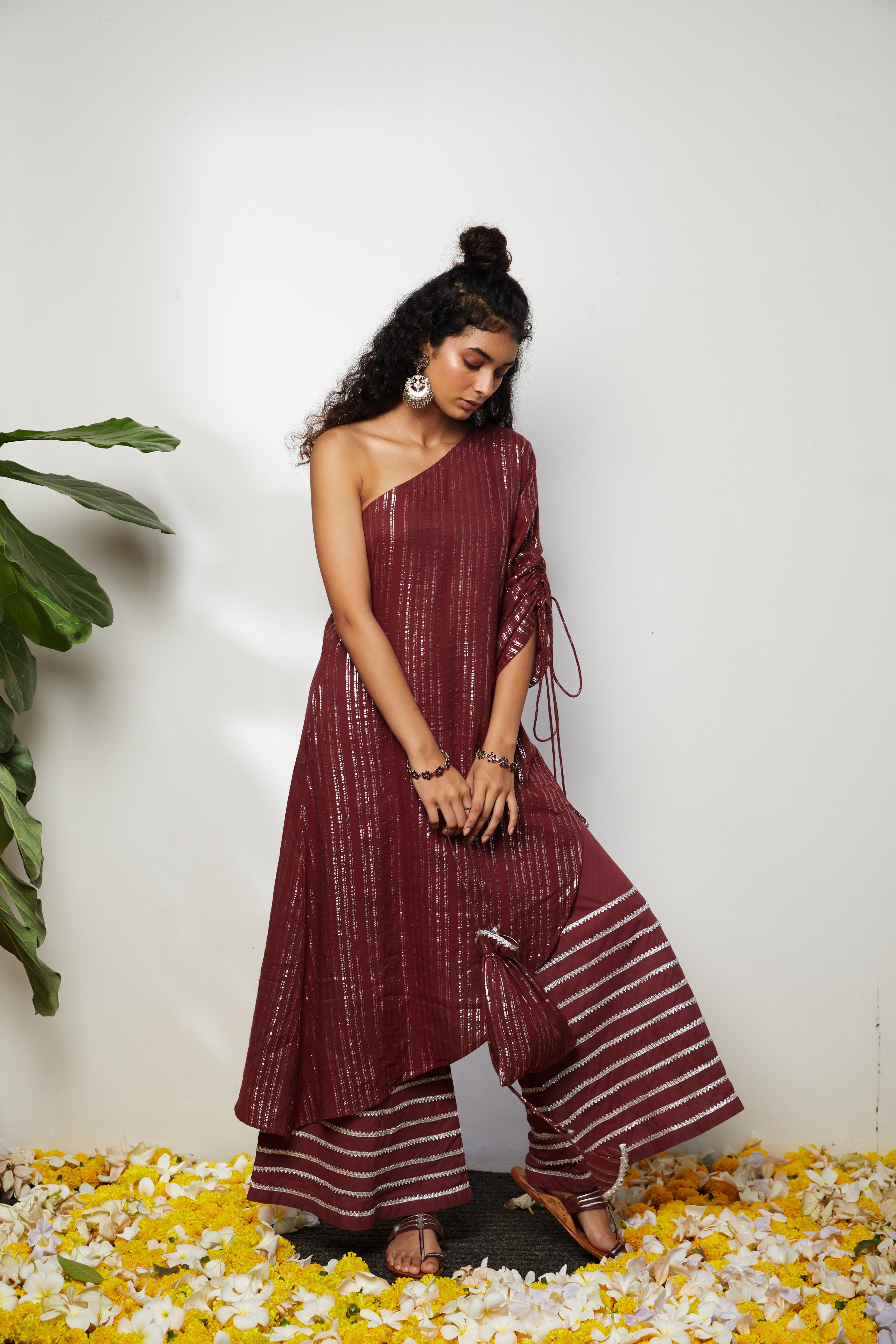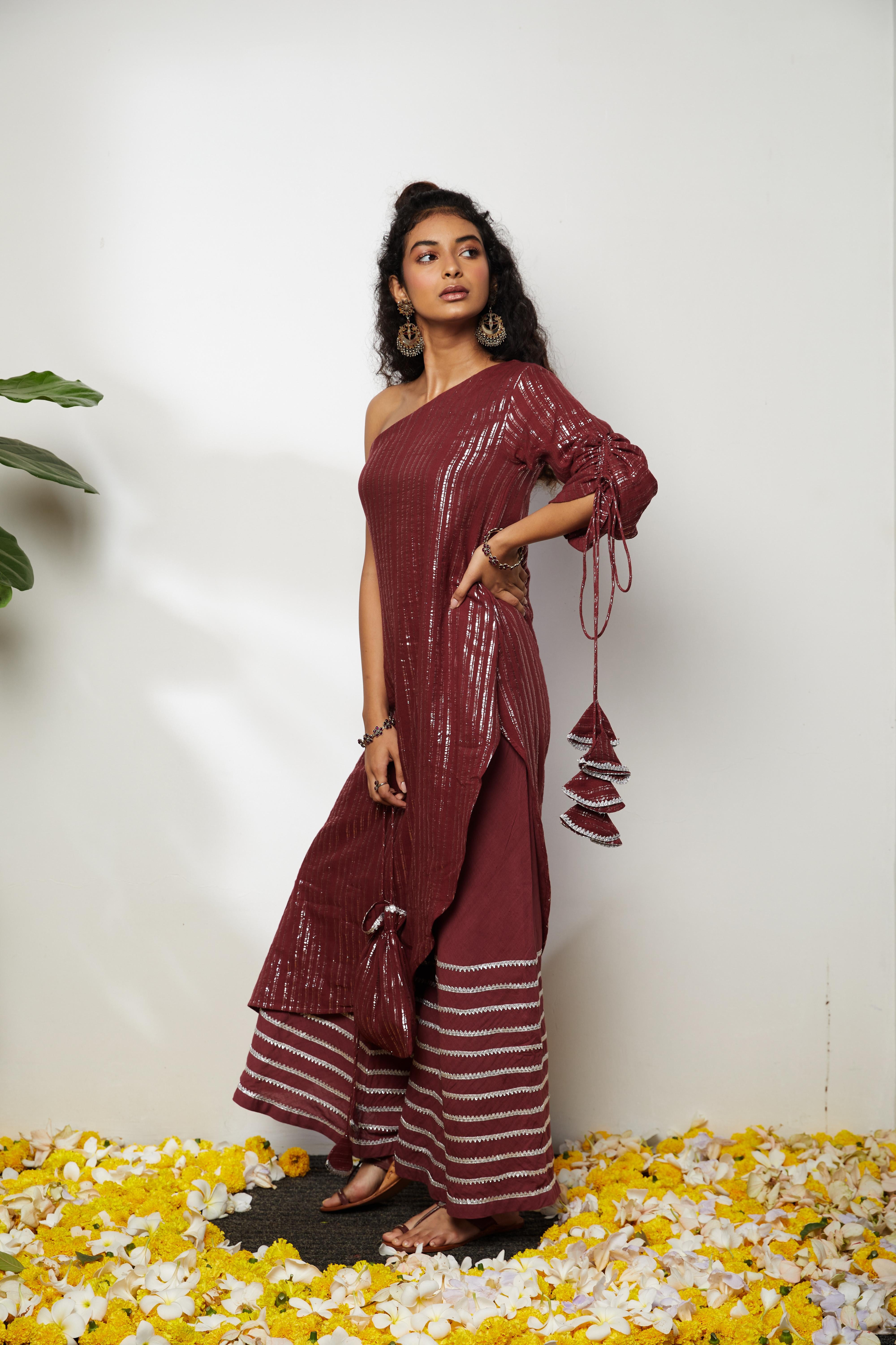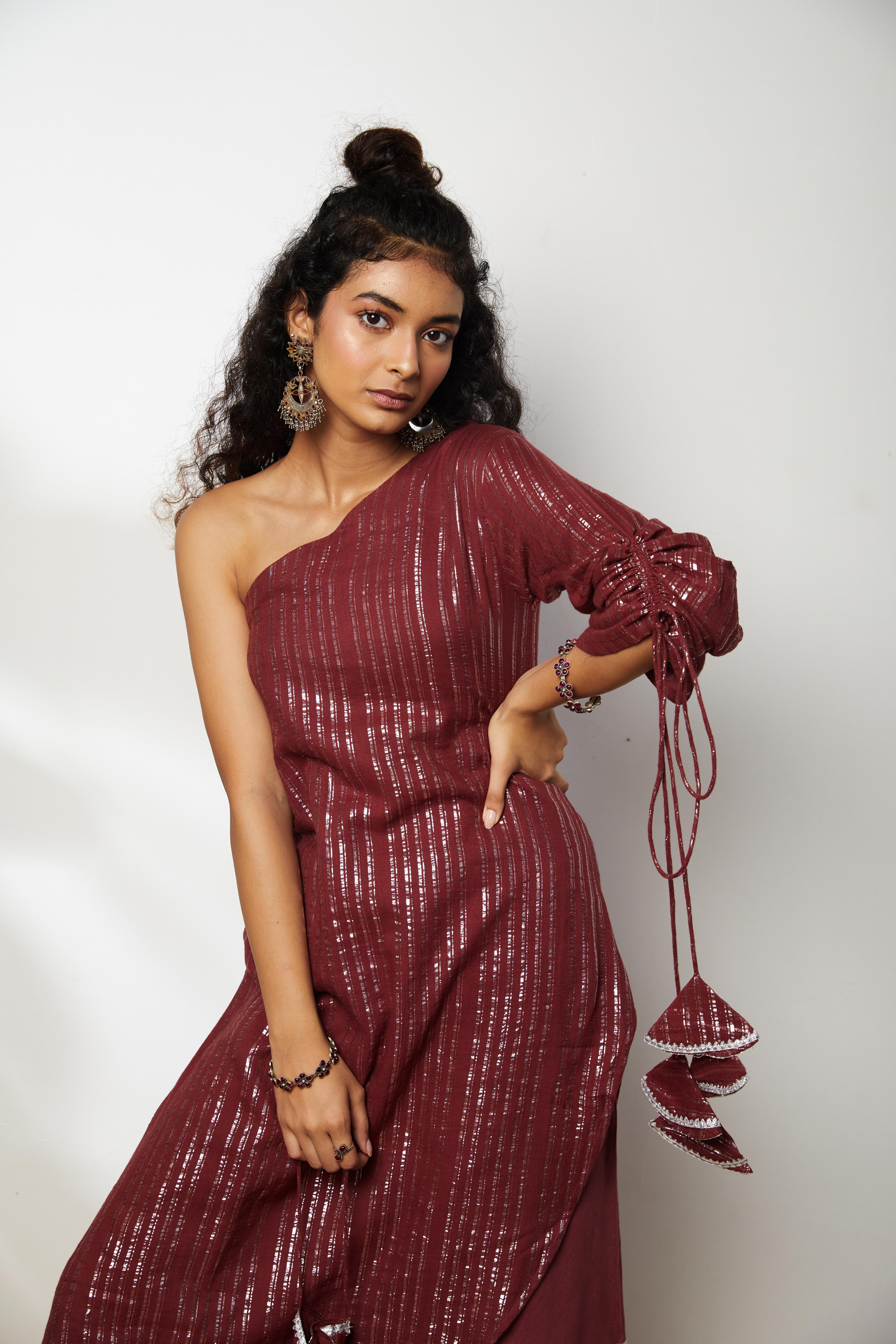 Get ready to make a statement with this gorgeous wine-colored one-shoulder kurta featuring an edgy asymmetric cut. Also featuring adjustable drawstring tassels on the sleeve. Paired with classy lace-detailed palazzo pants, this ensemble is versatile and perfect for any occasion. Not only is it stylish, but it also effortlessly commands attention and sets you apart from the crowd, ensuring you shine as the fashion star of every event.