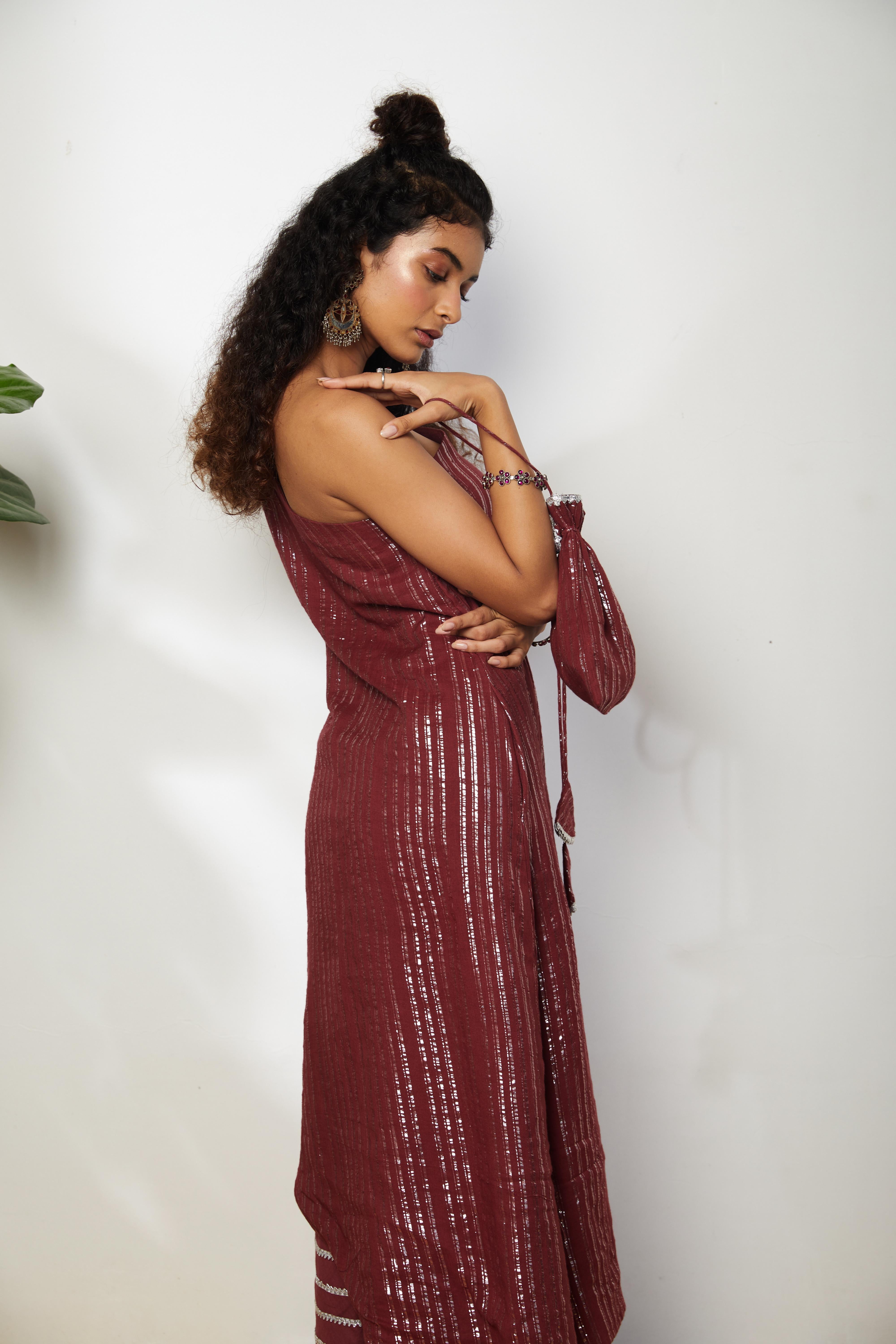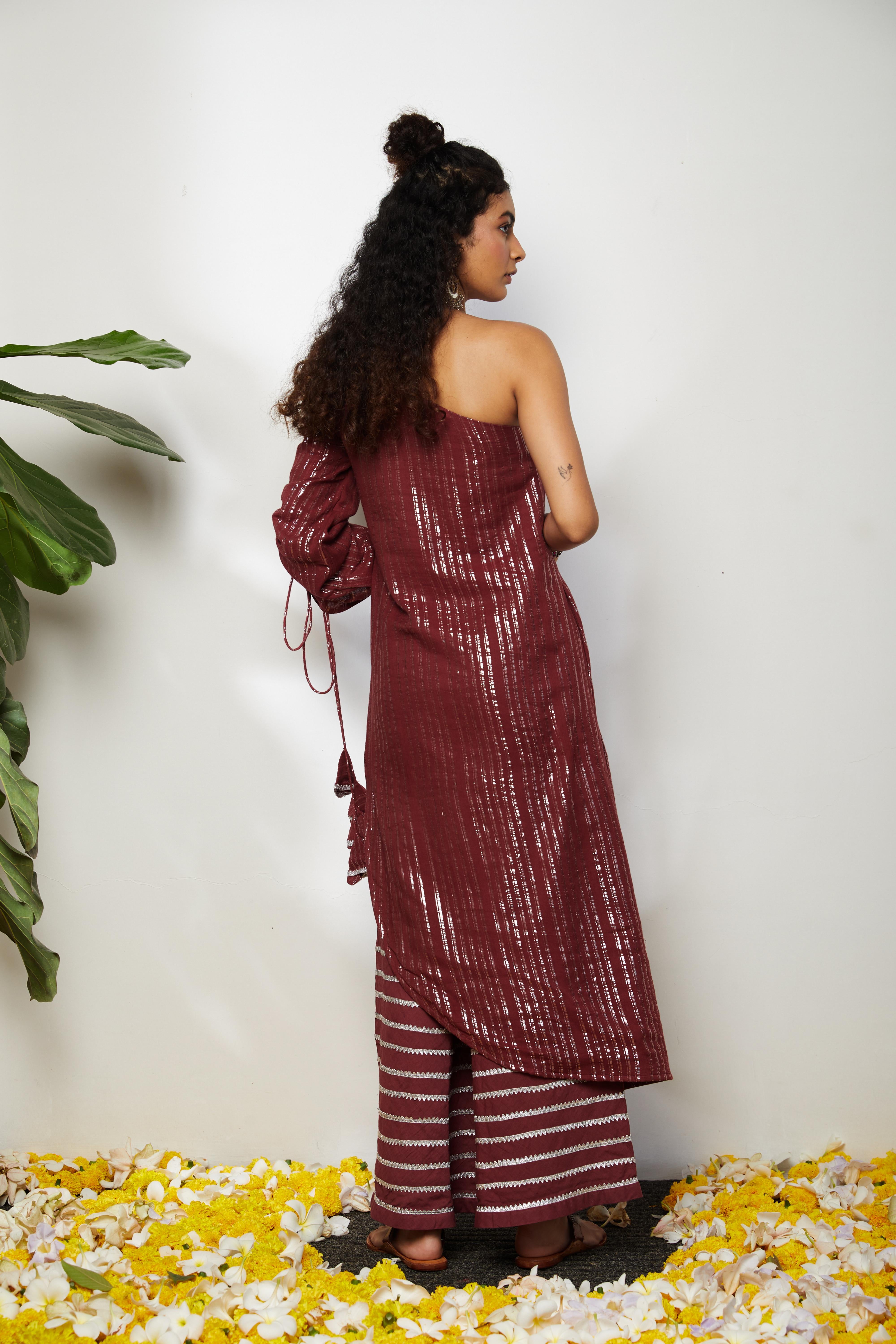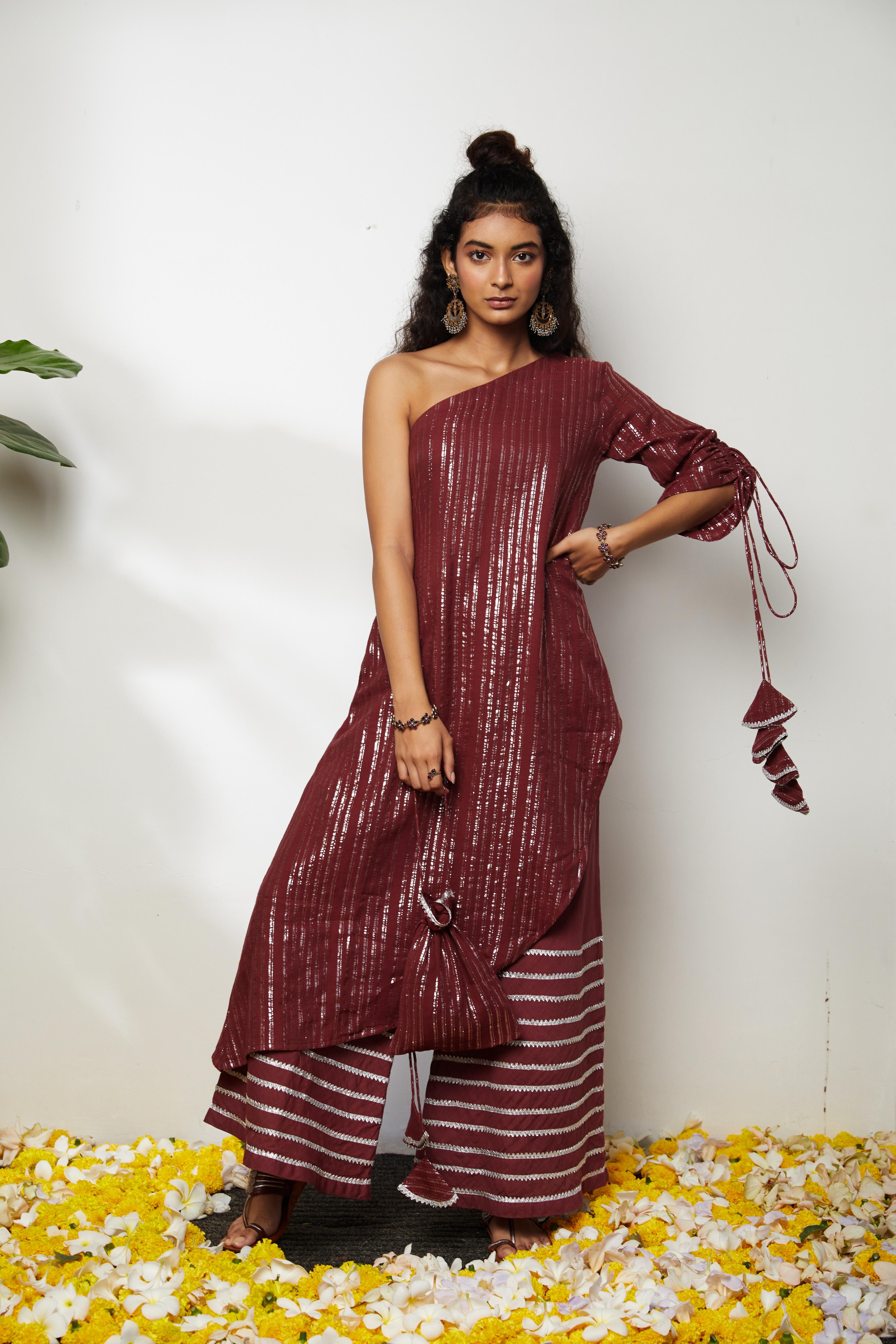 Get ready to make a statement with this gorgeous wine-colored one-shoulder kurta featuring an edgy asymmetric cut. Also featuring adjustable drawstring tassels on the sleeve. Paired with classy lace-detailed palazzo pants, this ensemble is versatile and perfect for any occasion. Not only is it stylish, but it also effortlessly commands attention and sets you apart from the crowd, ensuring you shine as the fashion star of every event.
