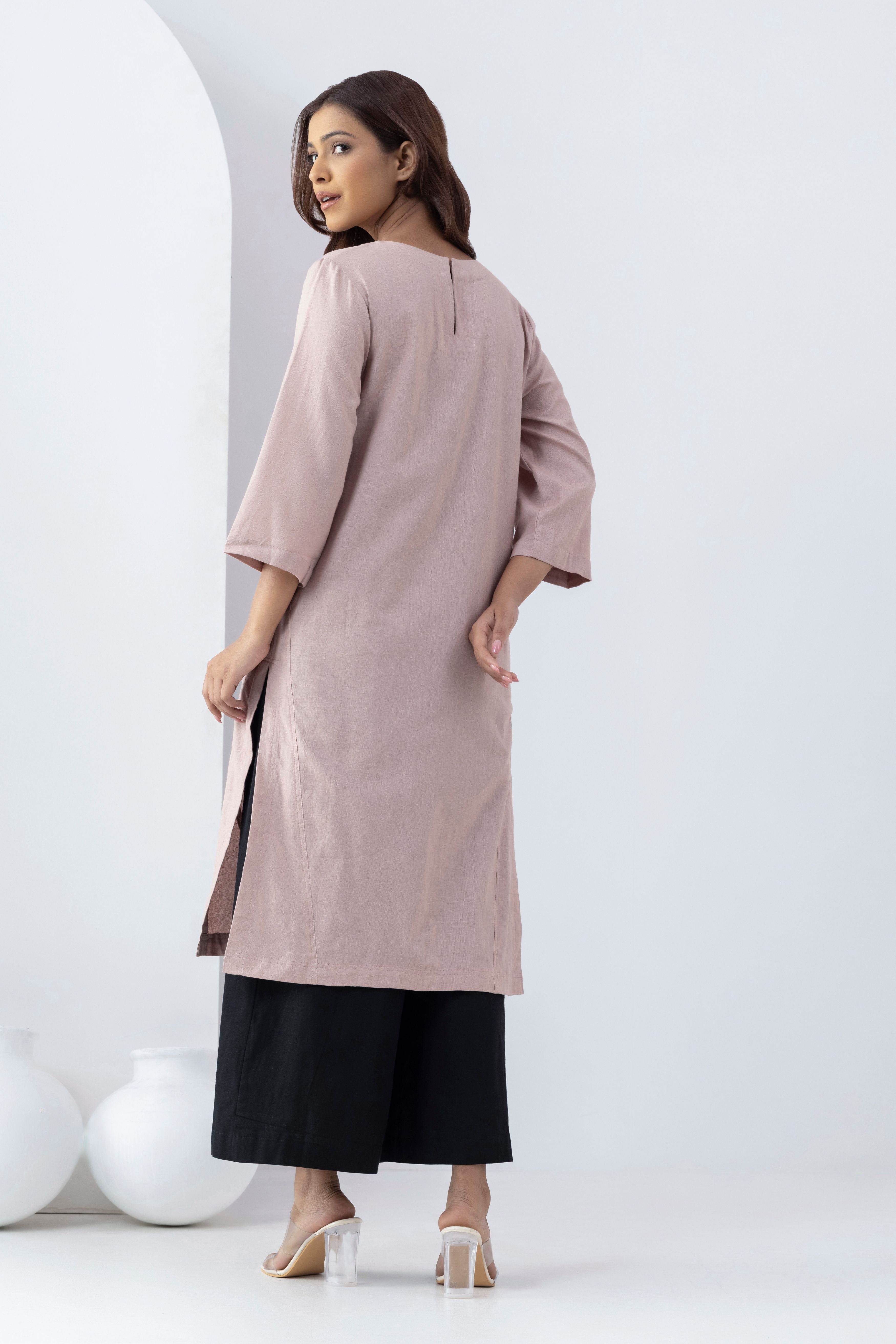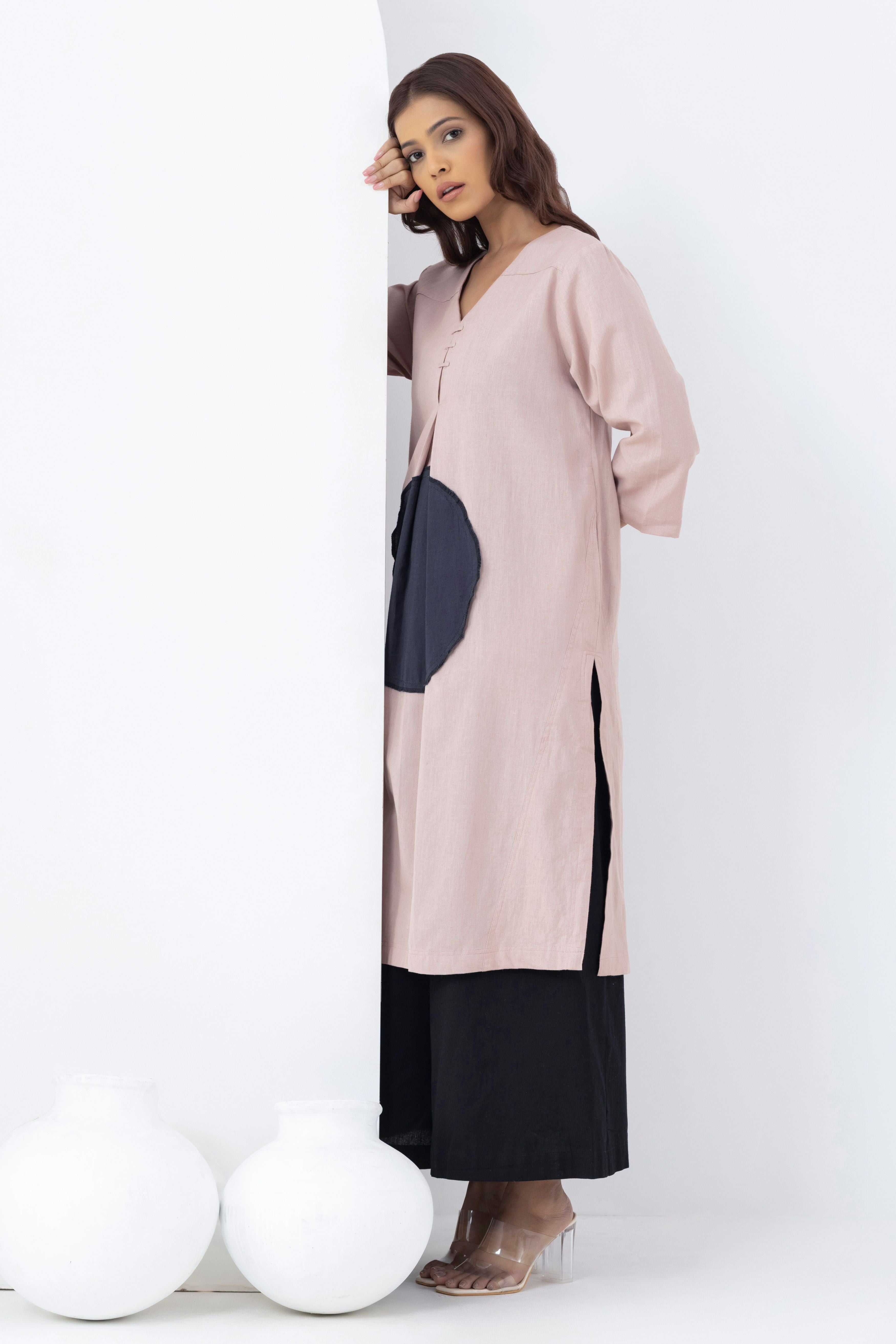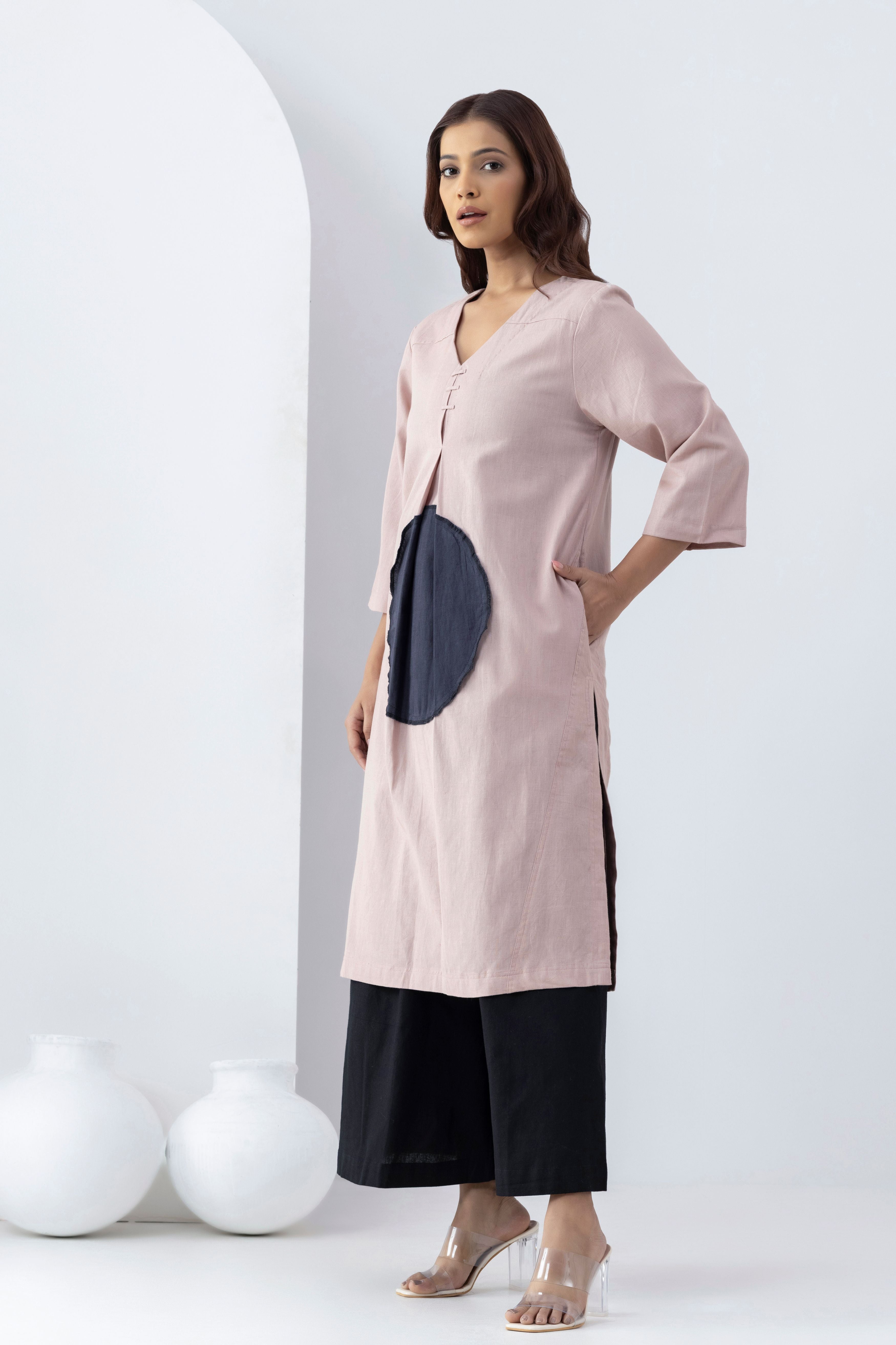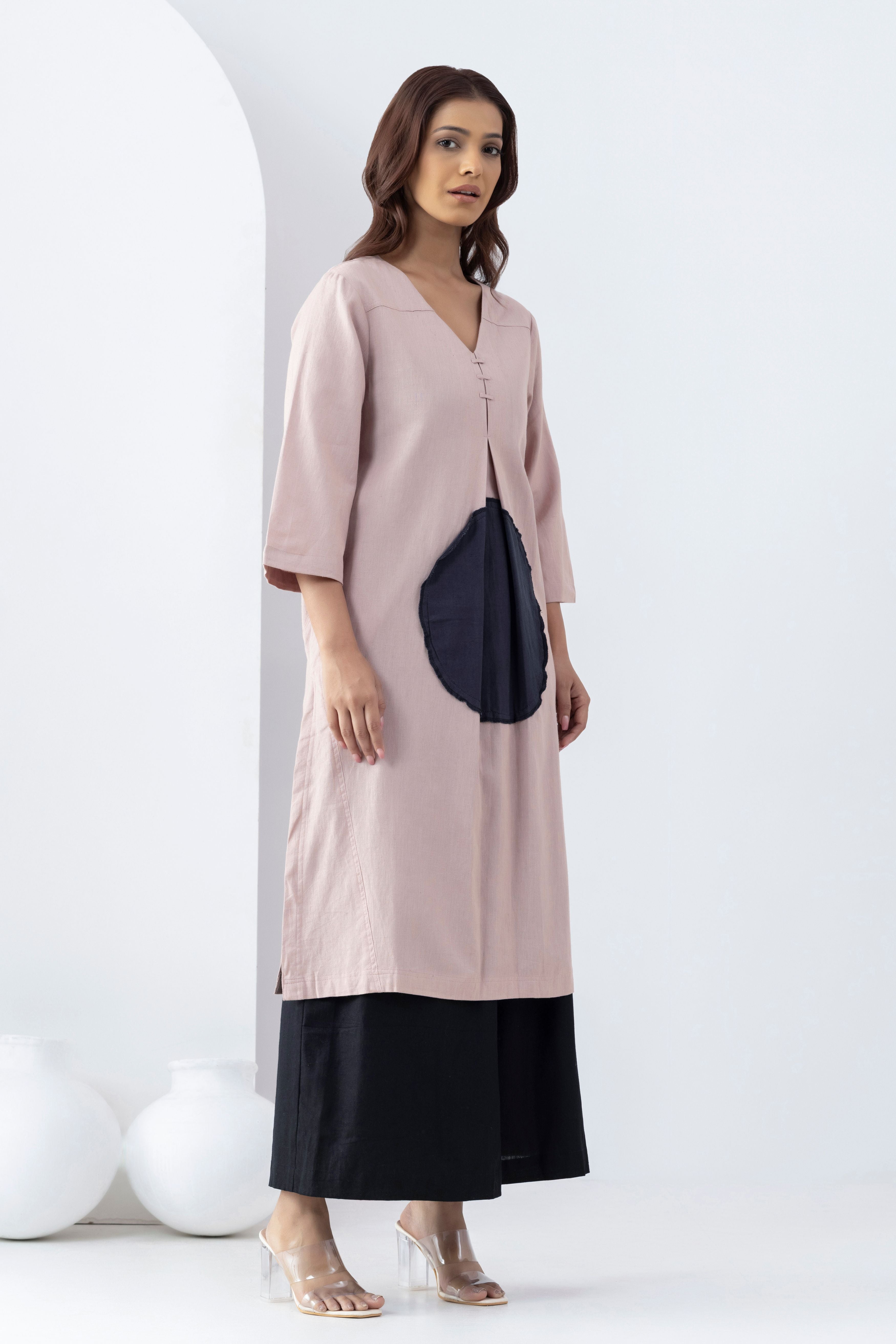 Aira Tunic Set set featuring 2 articles - Aira Tunic and All black Paper Pant, is crafted from 100% organic chambray cotton fabric, this set combines an elegant A-line tunic in blush pink colour capturing black applique patchwork detail and centre front pleat in the tunic. The relaxed silhouette, clean lines and subtle movement give Aira Set a sophisticated yet effortless appeal - perfect for days when you want to feel comfortable yet stylish.  cotton - Aira Tunic consists of A-line silhouette with centre front pleat and round applique patchwork. - Tunic also features side slit, side paneling with double stitch detailing and side pockets. Key hole in the centre back. - All black pants are wide legged with side zipper opening. - Model is wearing a size S - This is textile fabric, subtle imperfections in the weave, texture and colours are natural outcome of handcrafted textiles and not a defect.