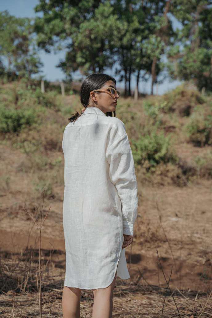 A refined choice, this white linen shirt dress features a half placket for a contemporary touch. The mock pocket detailing in the front adds a stylish flair, enhancing the dress's overall sophistication. Ideal for a polished yet relaxed look, this piece effortlessly combines modern design elements with classic comfort.
