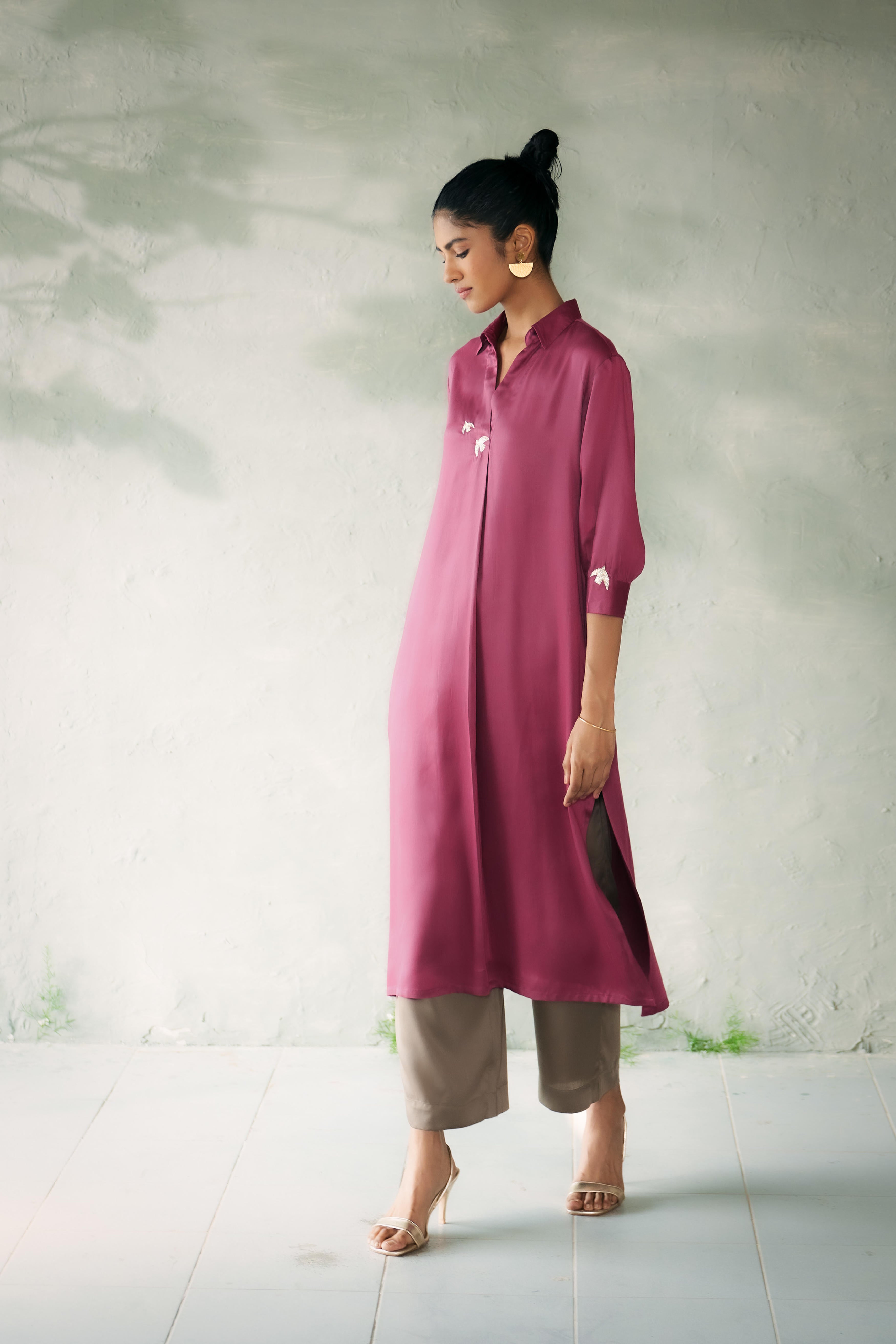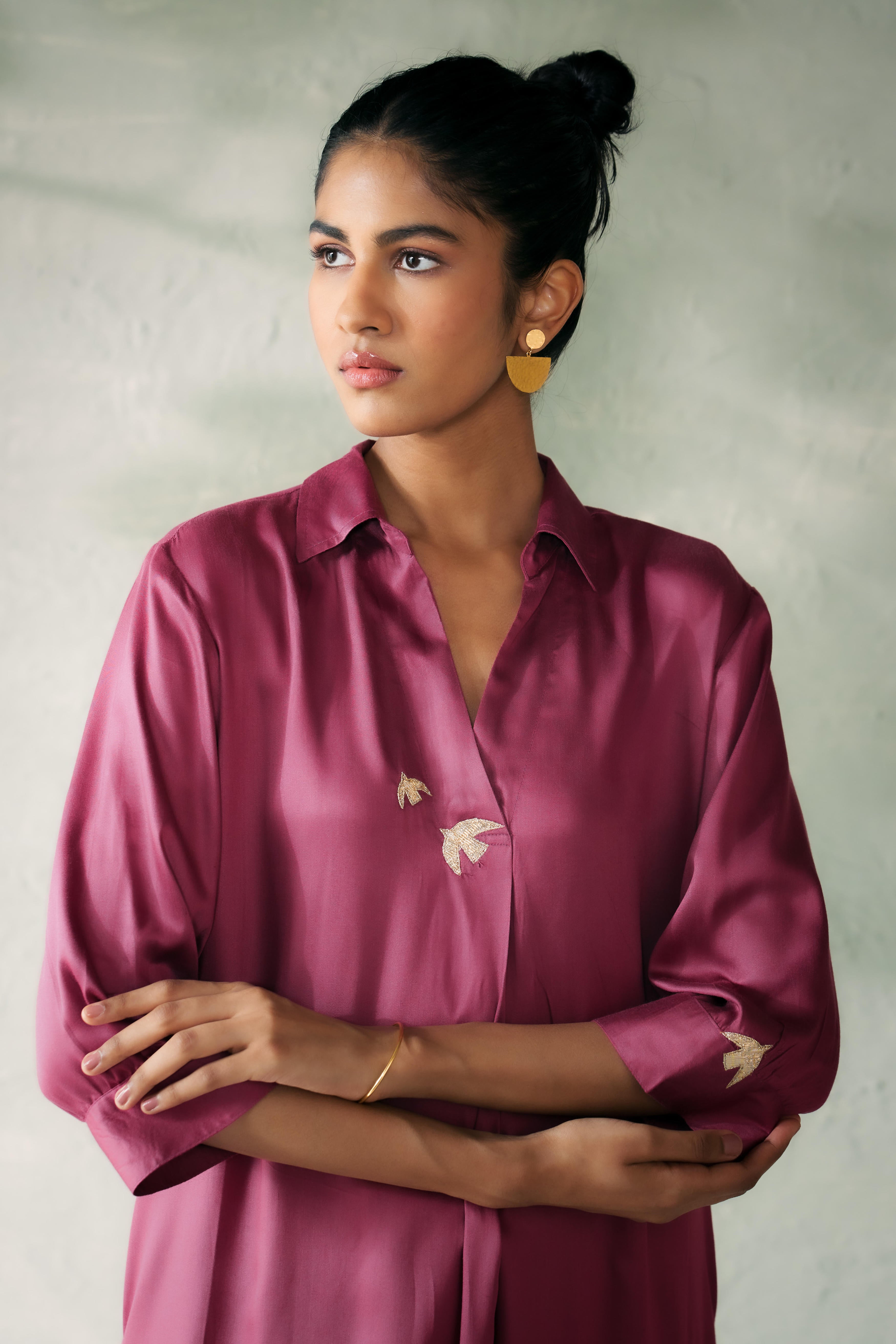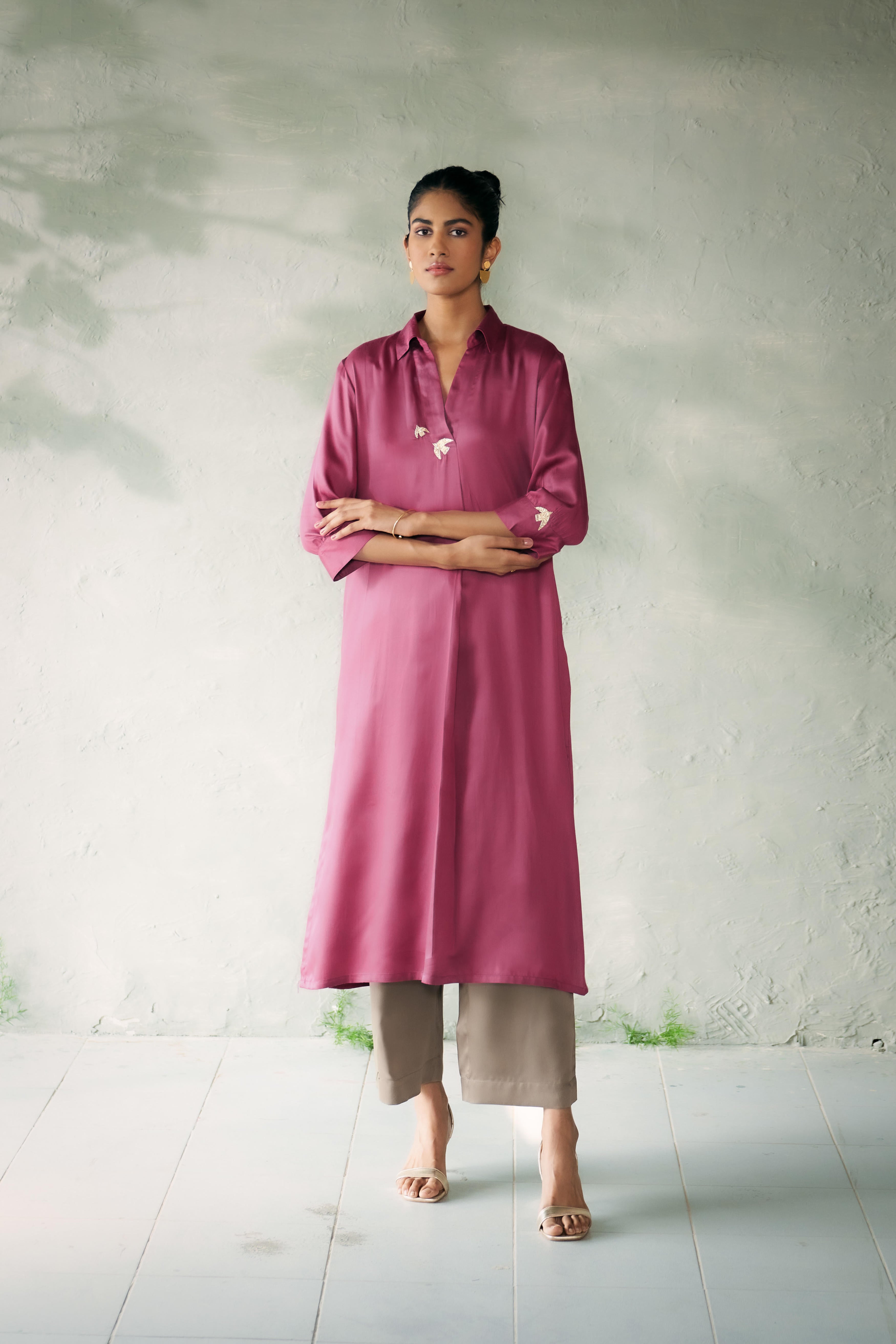 The Altaira Coord Set blends comfort with understated sophistication. Its shirt-style kurta is designed with a neat collared neckline, front pleat detail, and relaxed 3/4th sleeves for a polished yet relaxed silhouette. A subtle hand-embroidered bird motif lends a refined decorative touch. The contrast mousse-coloured straight-fit ankle-length pants are fully elasticated and finished with a drawstring, ensuring all-day comfort. Perfect for those who appreciate contemporary design with a touch of artistry. Model is 5'10" & wearing Size 'S'