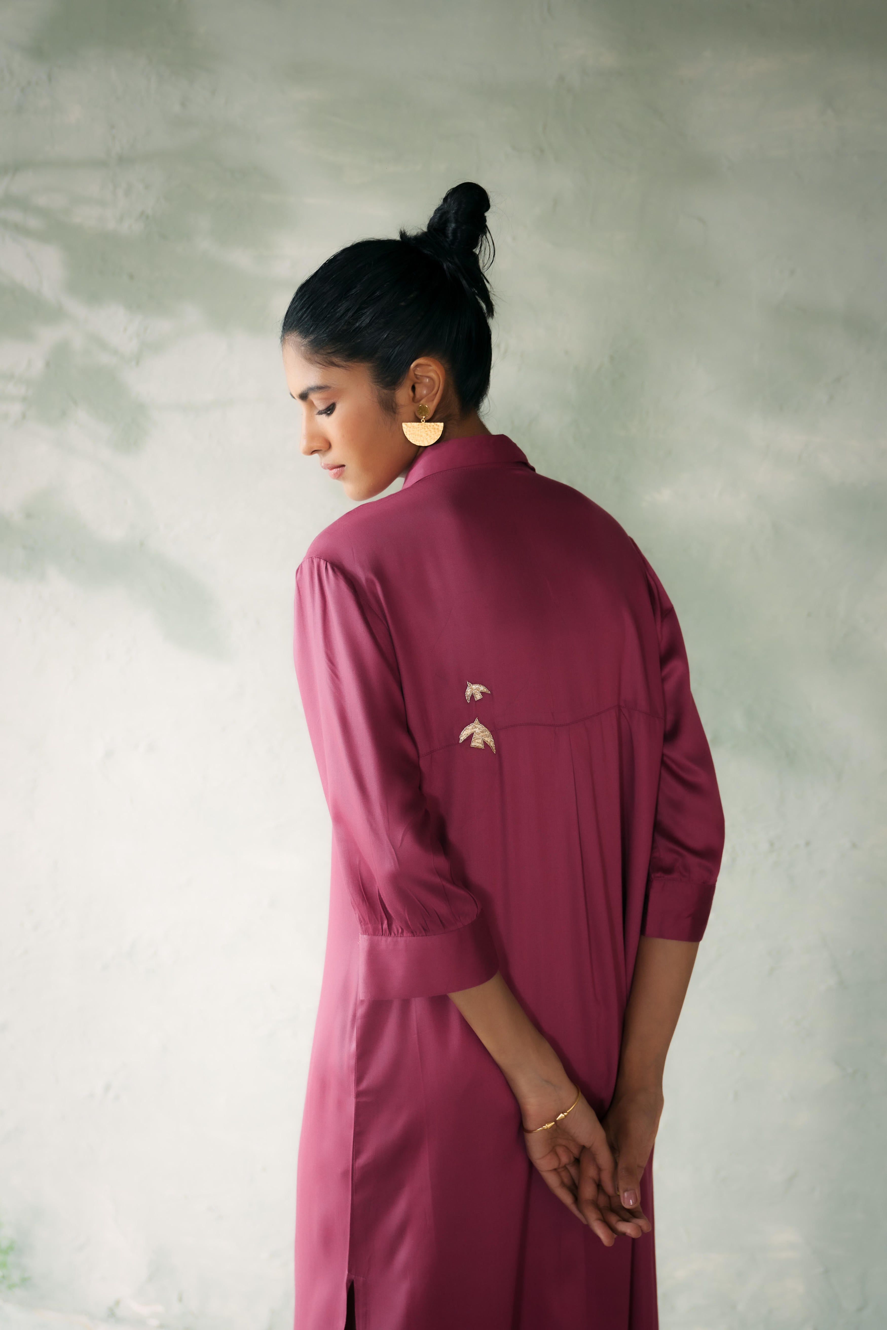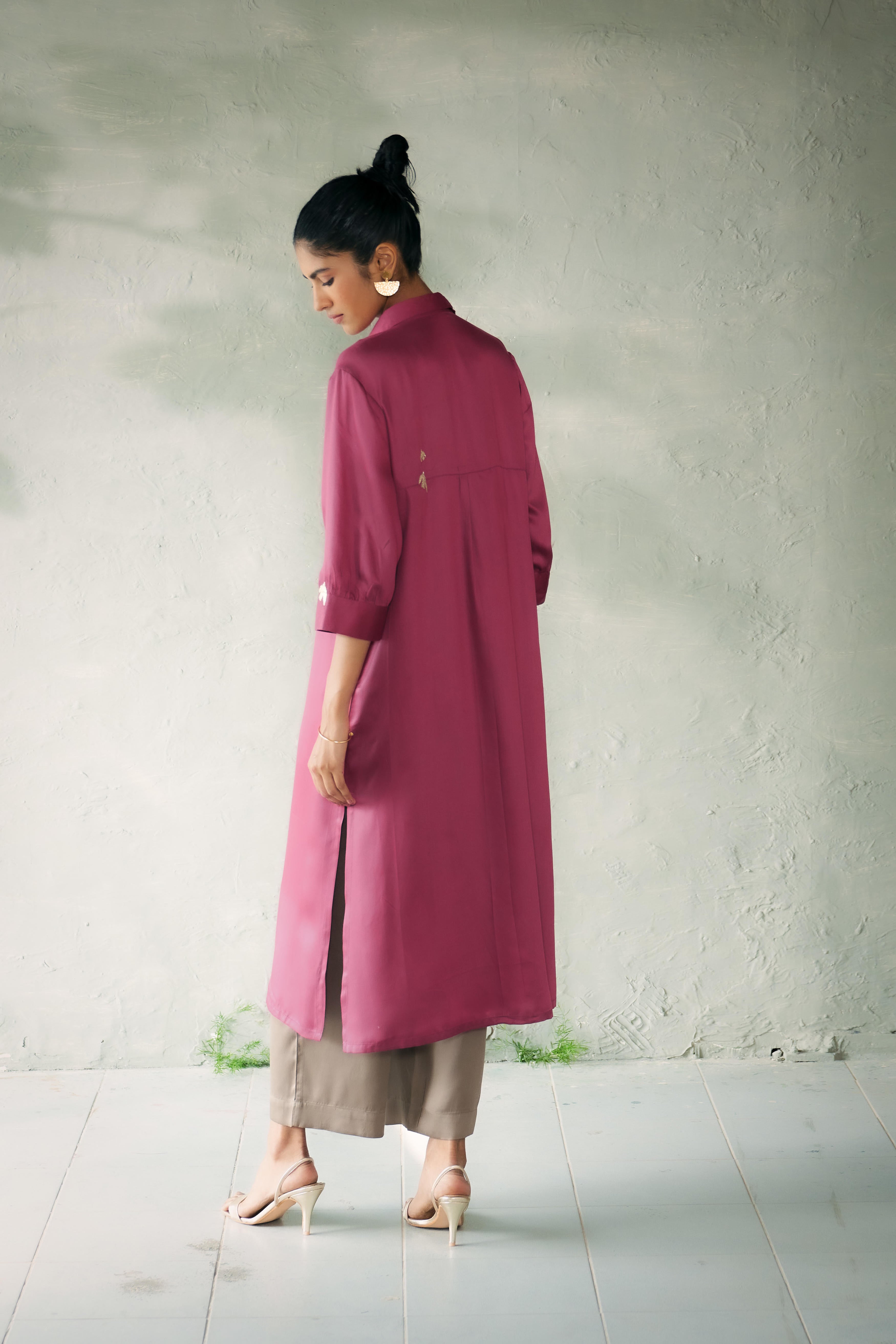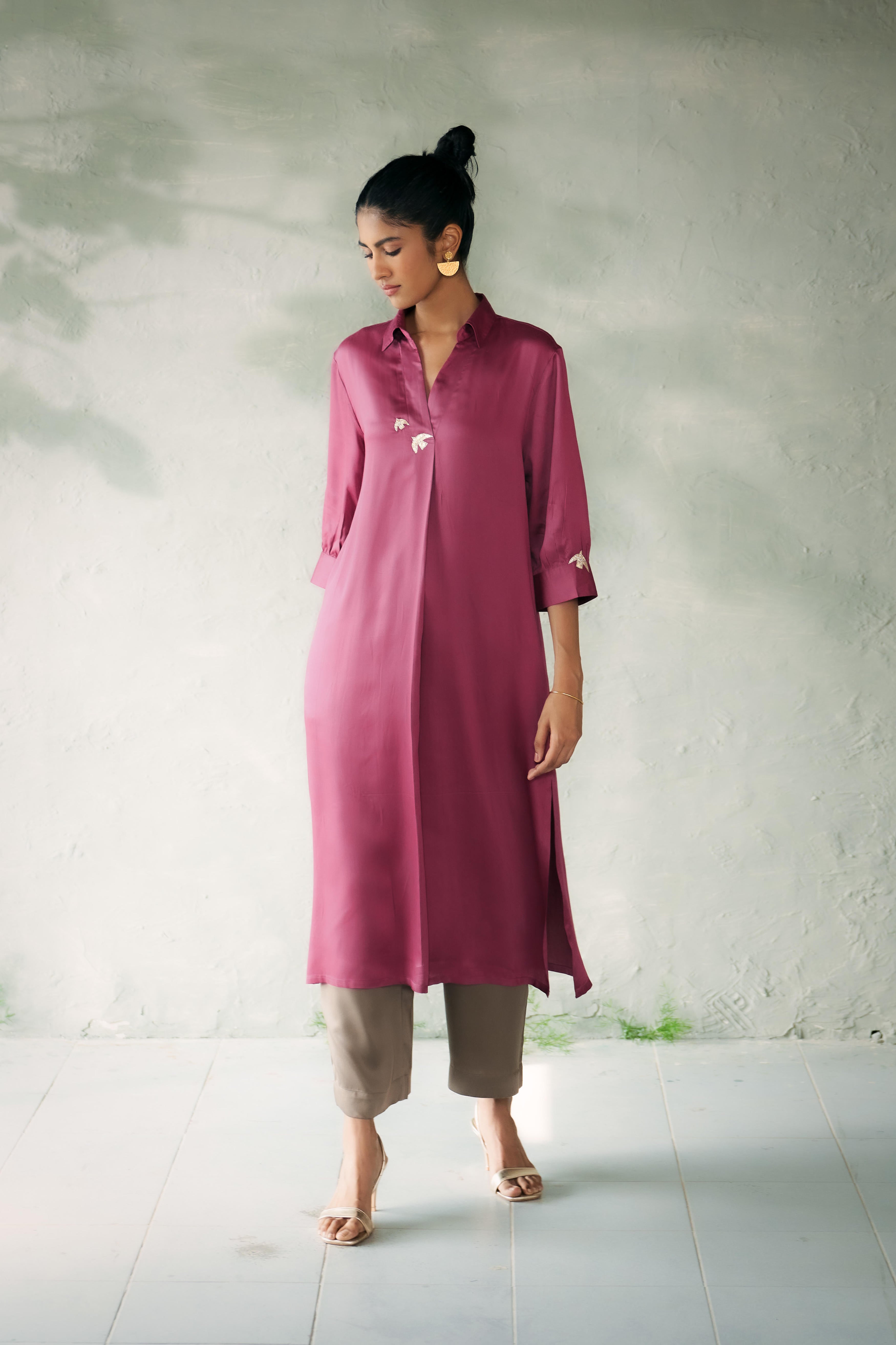 The Altaira Coord Set blends comfort with understated sophistication. Its shirt-style kurta is designed with a neat collared neckline, front pleat detail, and relaxed 3/4th sleeves for a polished yet relaxed silhouette. A subtle hand-embroidered bird motif lends a refined decorative touch. The contrast mousse-coloured straight-fit ankle-length pants are fully elasticated and finished with a drawstring, ensuring all-day comfort. Perfect for those who appreciate contemporary design with a touch of artistry. Model is 5'10" & wearing Size 'S'
