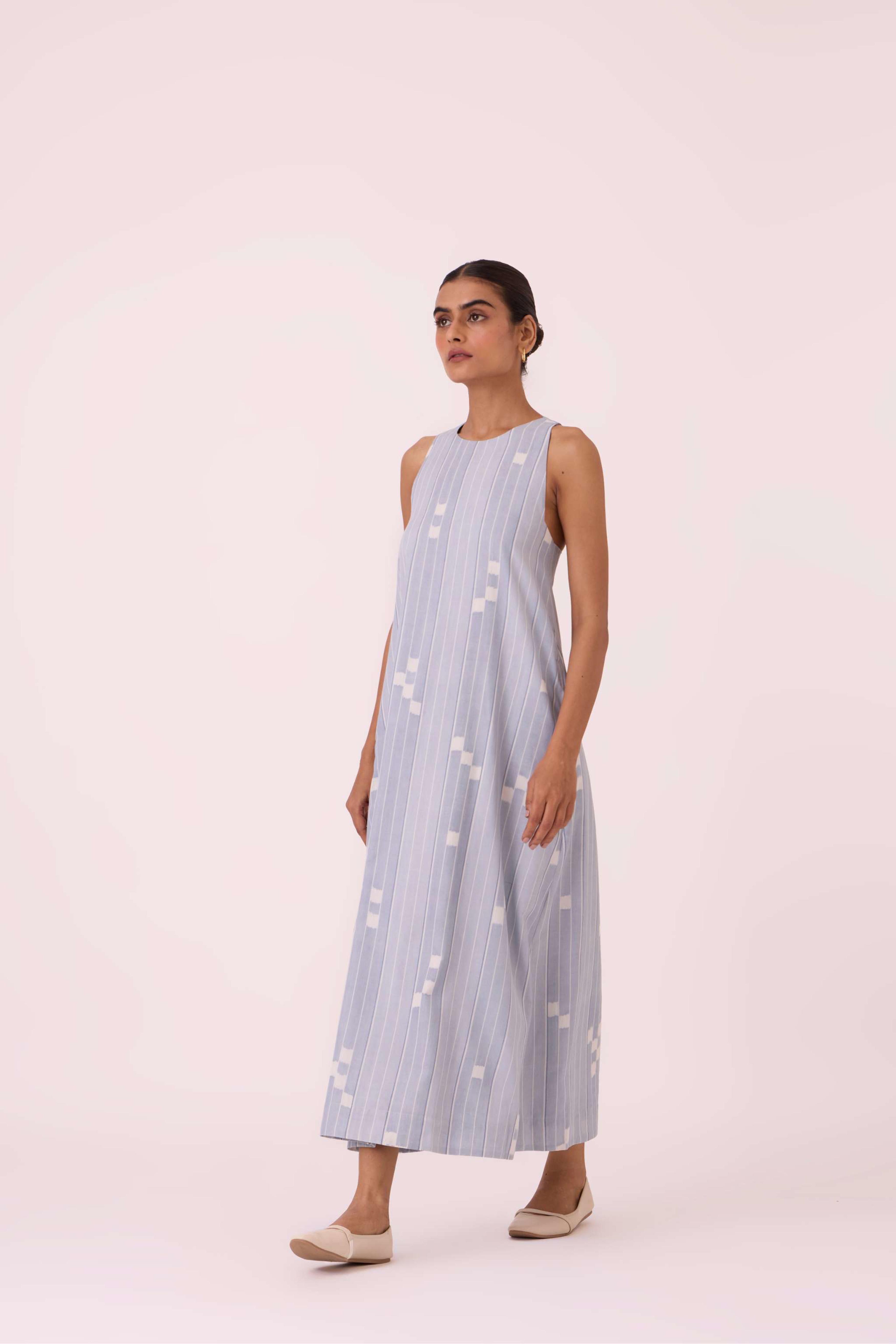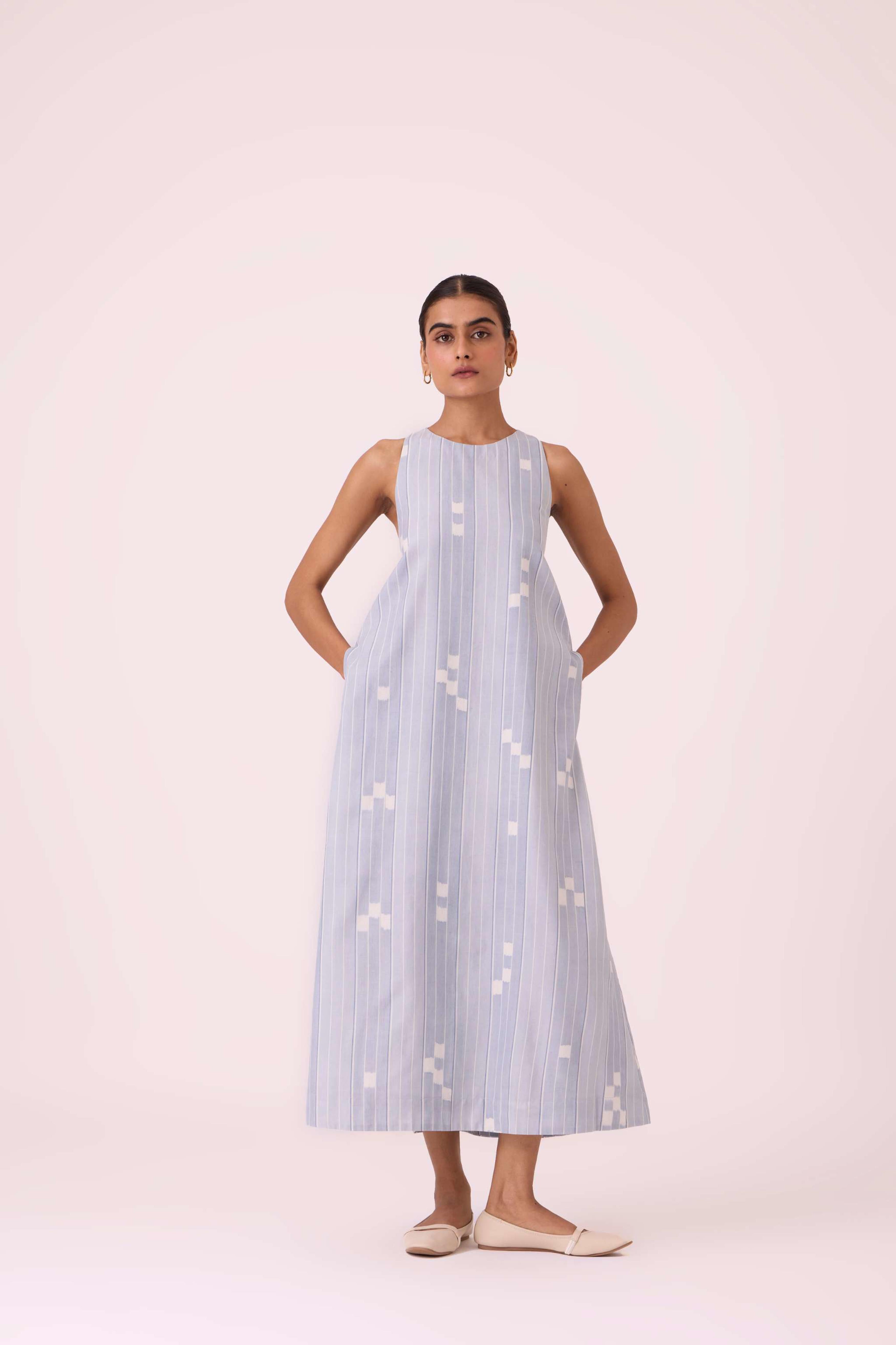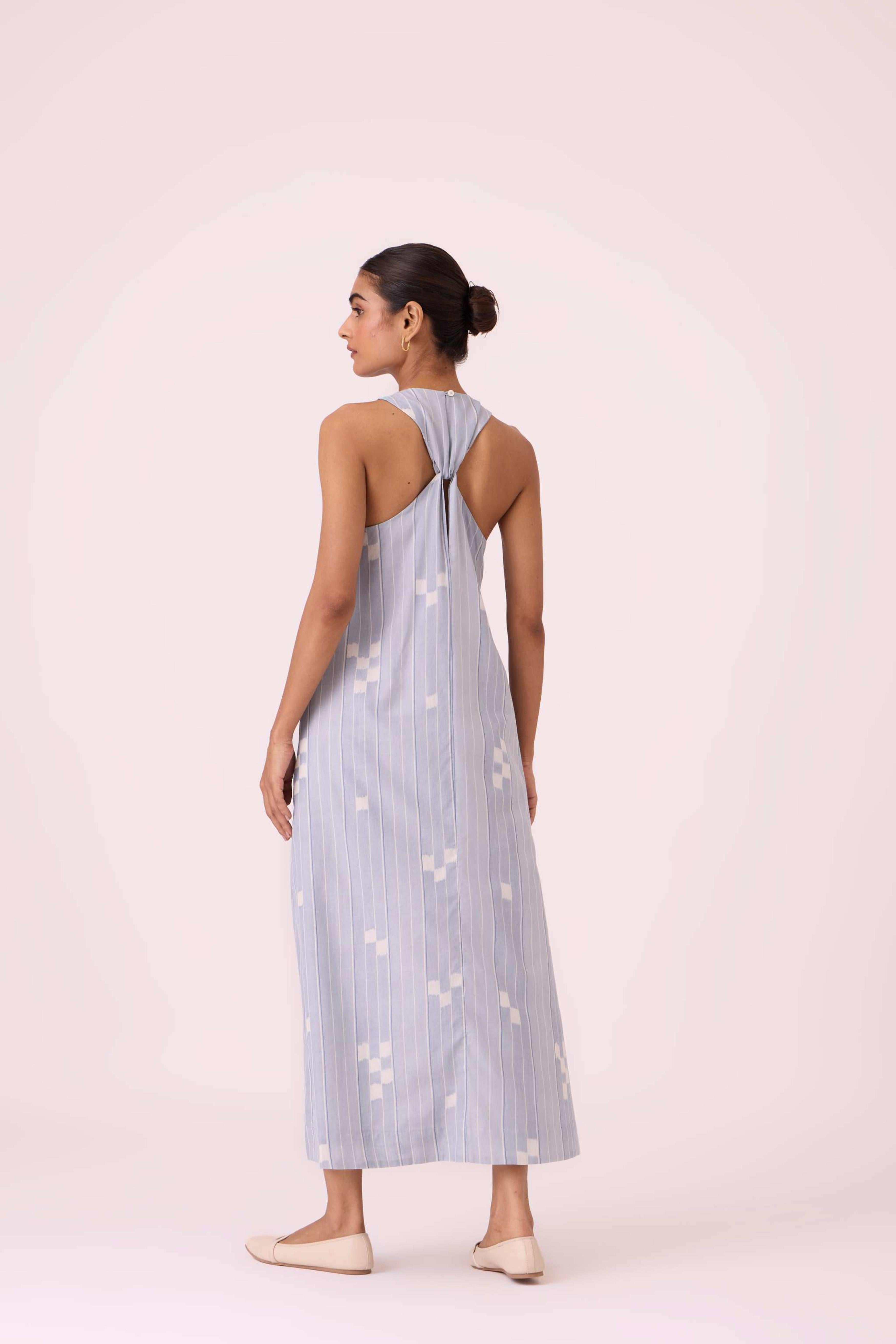 This is a *maxi-length, regular-fit dress* with a distinctive *twisted racerback* design. It includes practical *in-seam pockets* and is *fully lined*. The dress is made from a studio-developed *Ikat design* that is *handwoven by artisans in Telangana*, and any minor irregularities in the fabric are a natural result of the handmade process. The model, Chhavi, who is 5'6", is wearing a size XS.