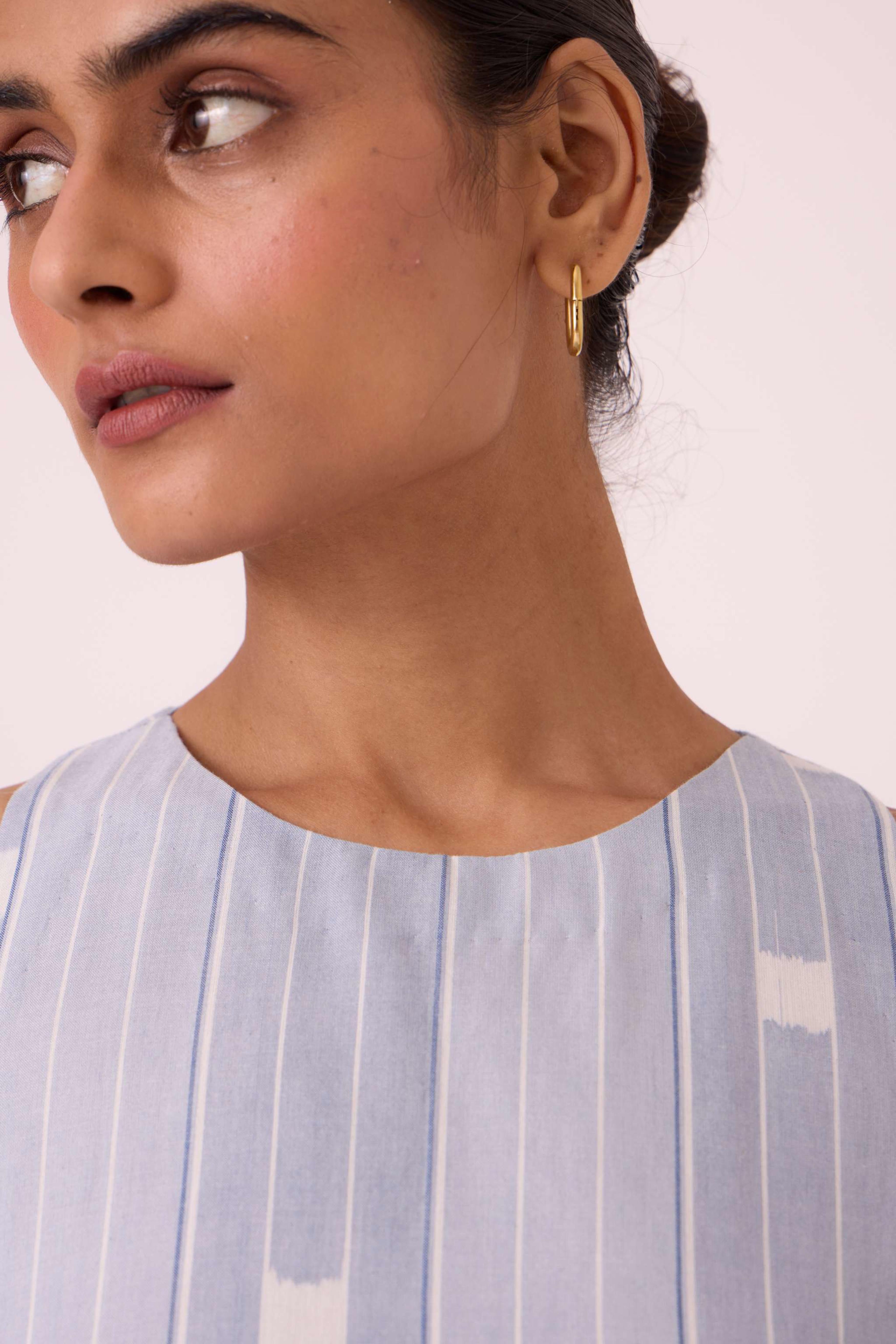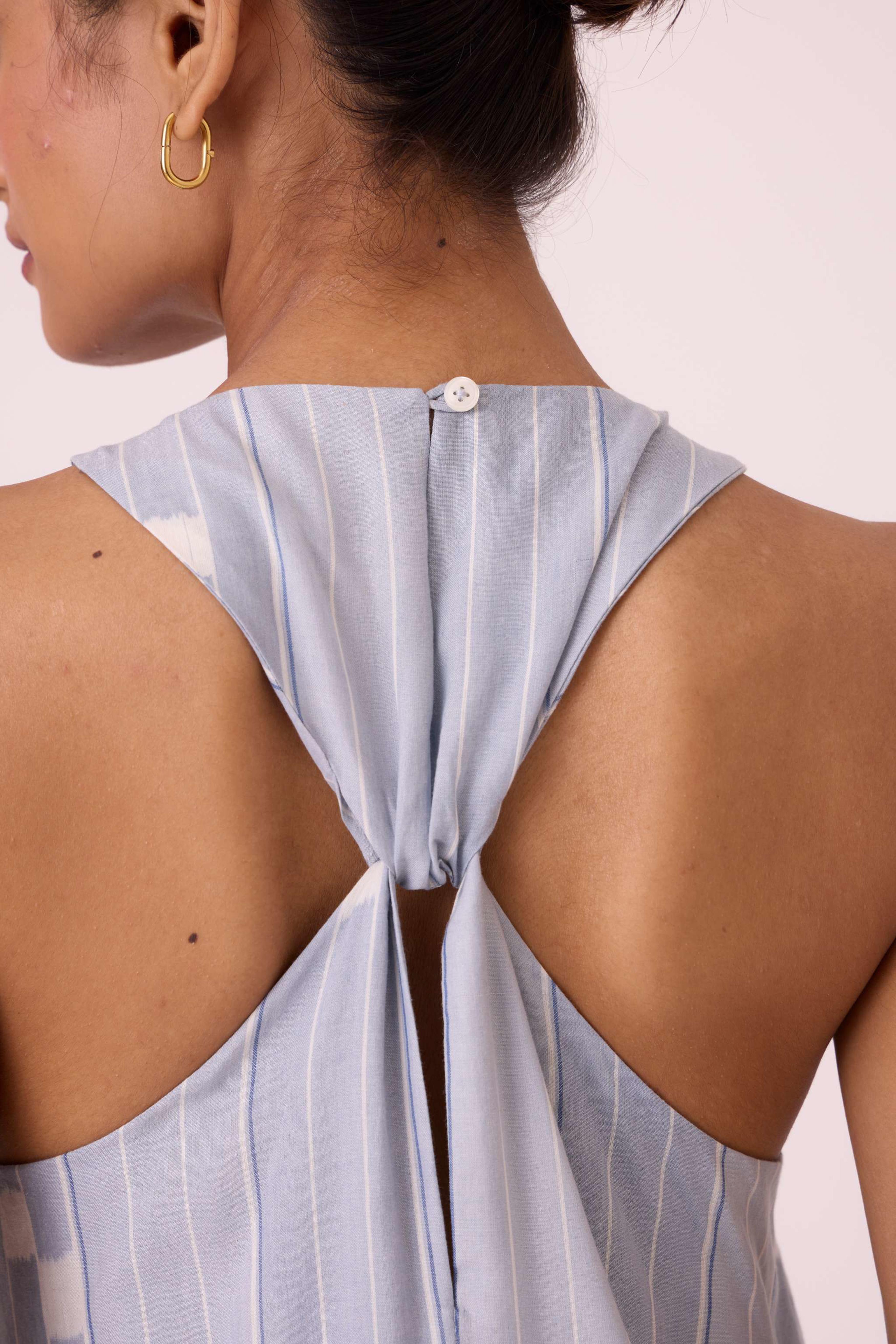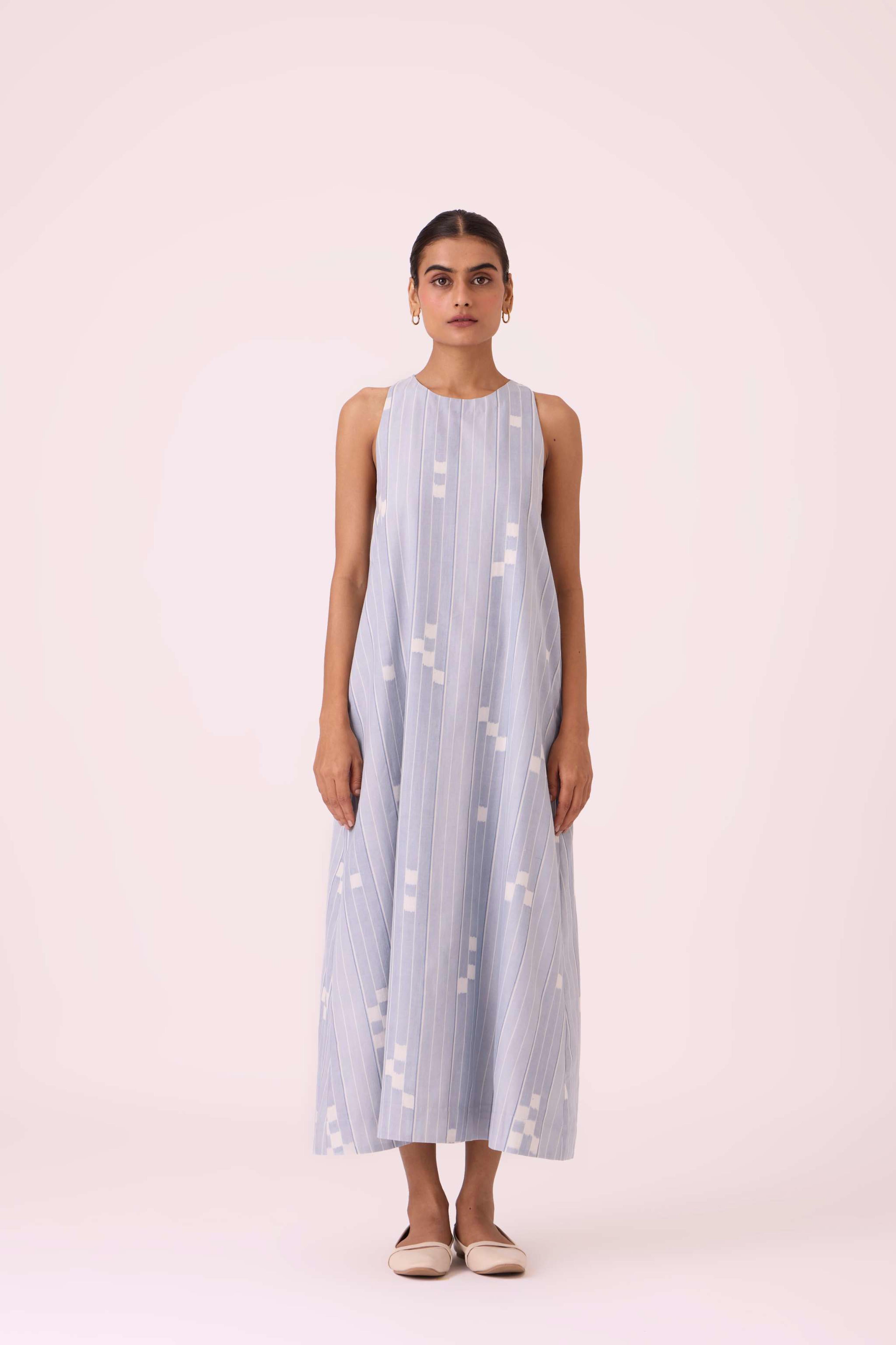 This is a *maxi-length, regular-fit dress* with a distinctive *twisted racerback* design. It includes practical *in-seam pockets* and is *fully lined*. The dress is made from a studio-developed *Ikat design* that is *handwoven by artisans in Telangana*, and any minor irregularities in the fabric are a natural result of the handmade process. The model, Chhavi, who is 5'6", is wearing a size XS.