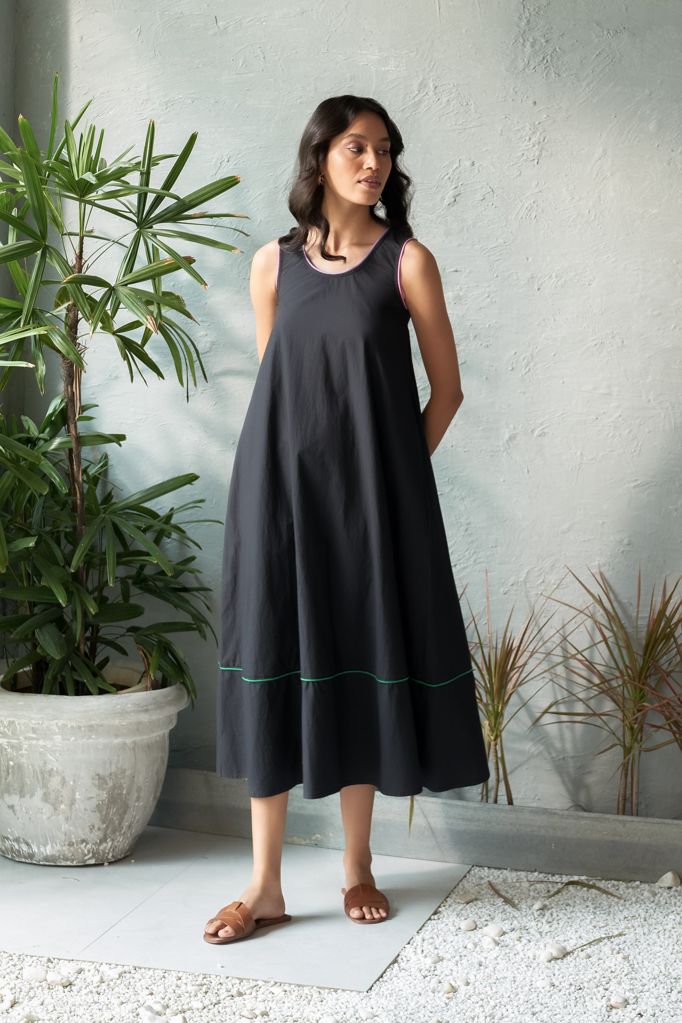 Step into style with our striking black midi dress, featuring a scoop neck, sleeveless design, and a modern U hem. The dress is adorned with vibrant, colorful piping detail that contrasts beautifully against the classic black fabric, adding a dynamic touch to the timeless silhouette. Made from high-quality, comfortable fabric, this dress offers a flattering fit that gracefully drapes over the body. Ideal for both casual and semi-formal occasions, this versatile midi dress can be dressed up with heels or kept chic with flats for a sophisticated yet playful look.