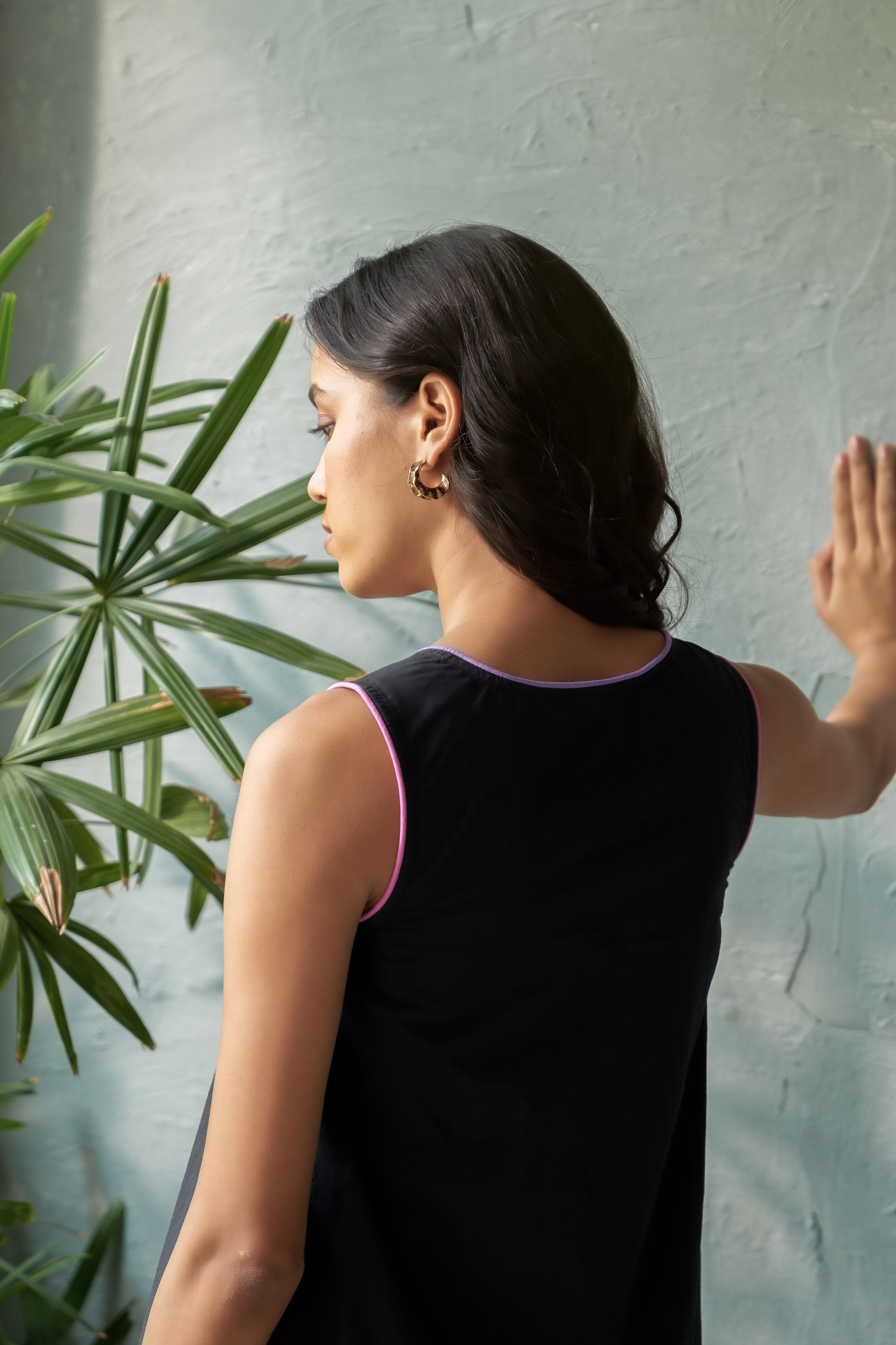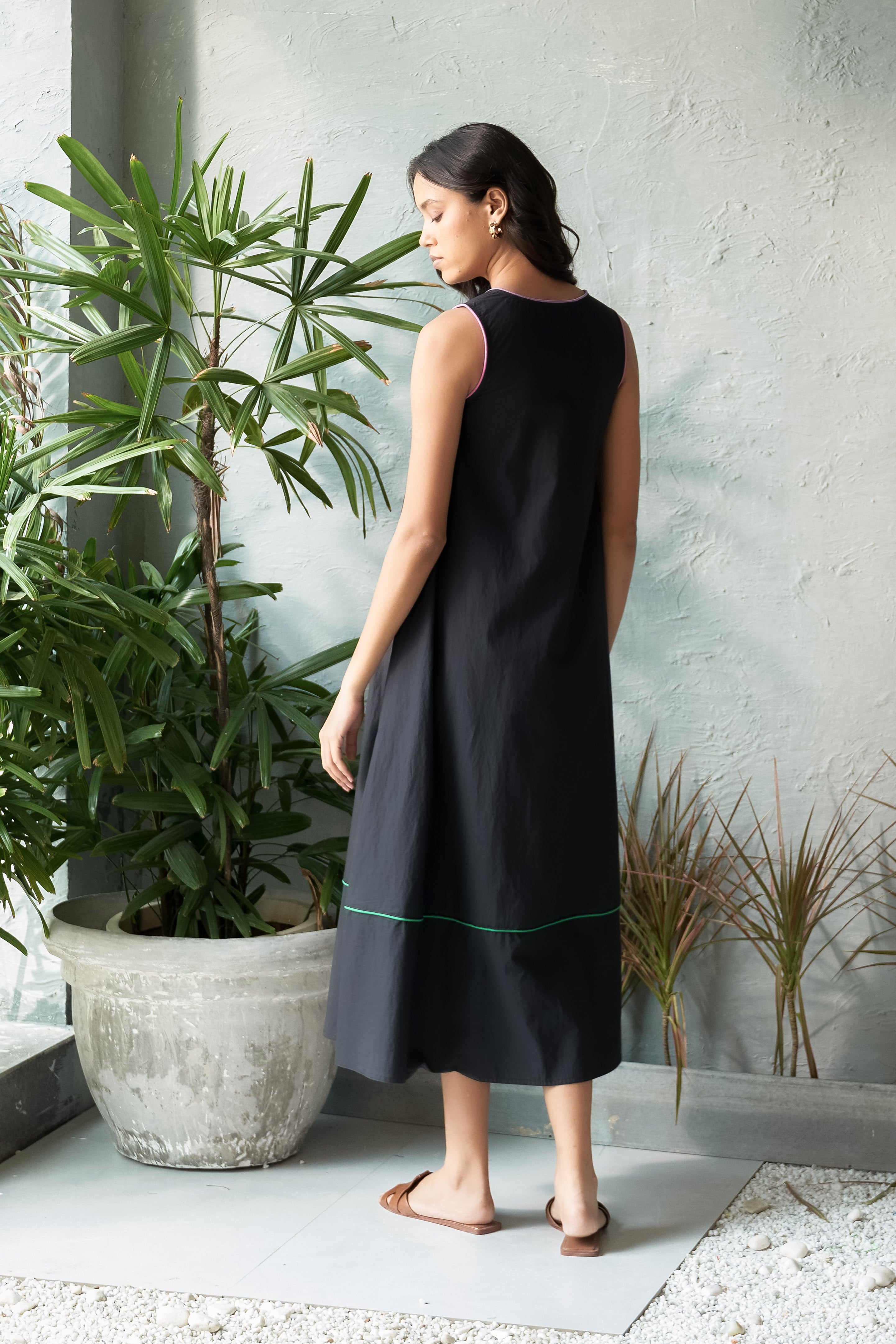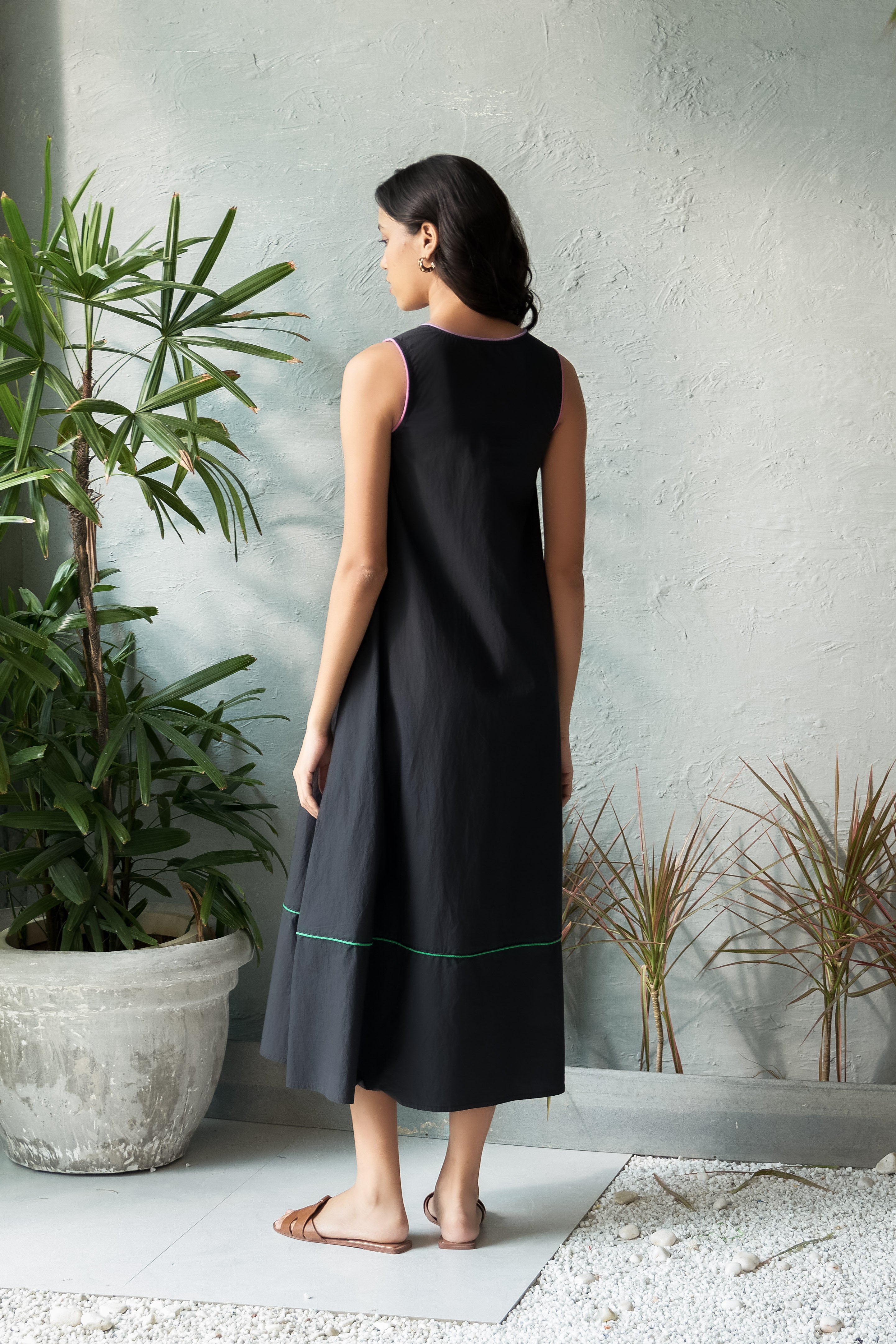 Step into style with our striking black midi dress, featuring a scoop neck, sleeveless design, and a modern U hem. The dress is adorned with vibrant, colorful piping detail that contrasts beautifully against the classic black fabric, adding a dynamic touch to the timeless silhouette. Made from high-quality, comfortable fabric, this dress offers a flattering fit that gracefully drapes over the body. Ideal for both casual and semi-formal occasions, this versatile midi dress can be dressed up with heels or kept chic with flats for a sophisticated yet playful look.