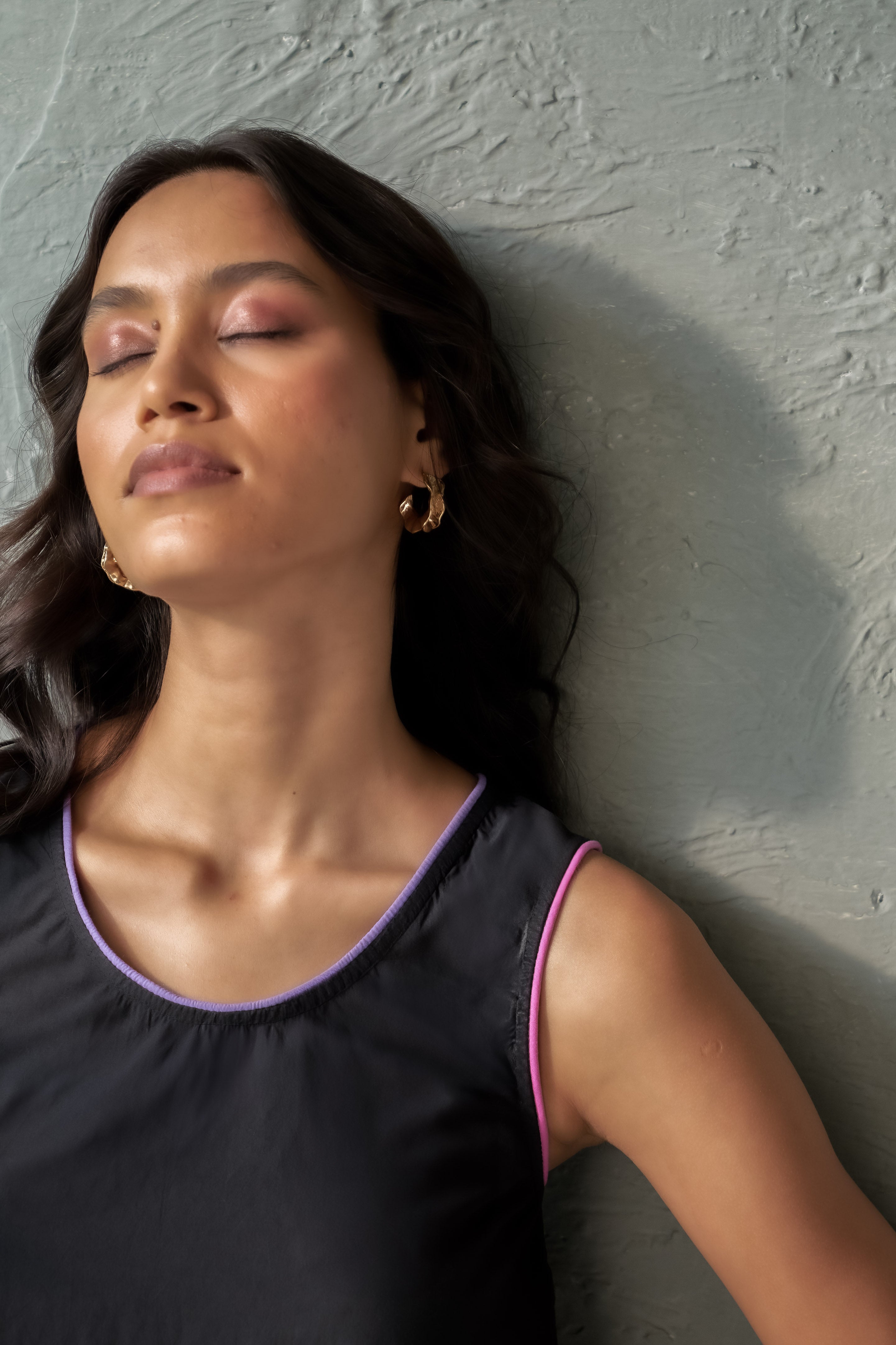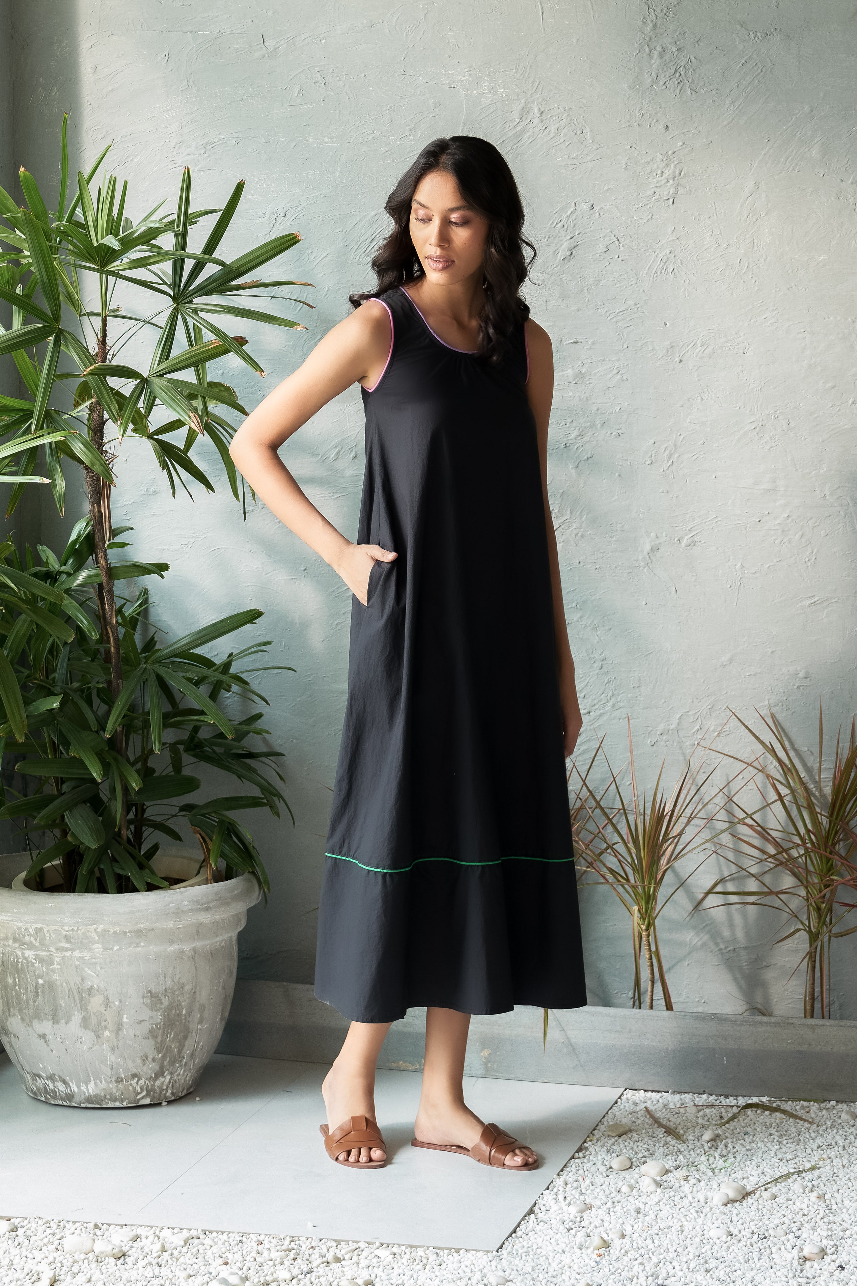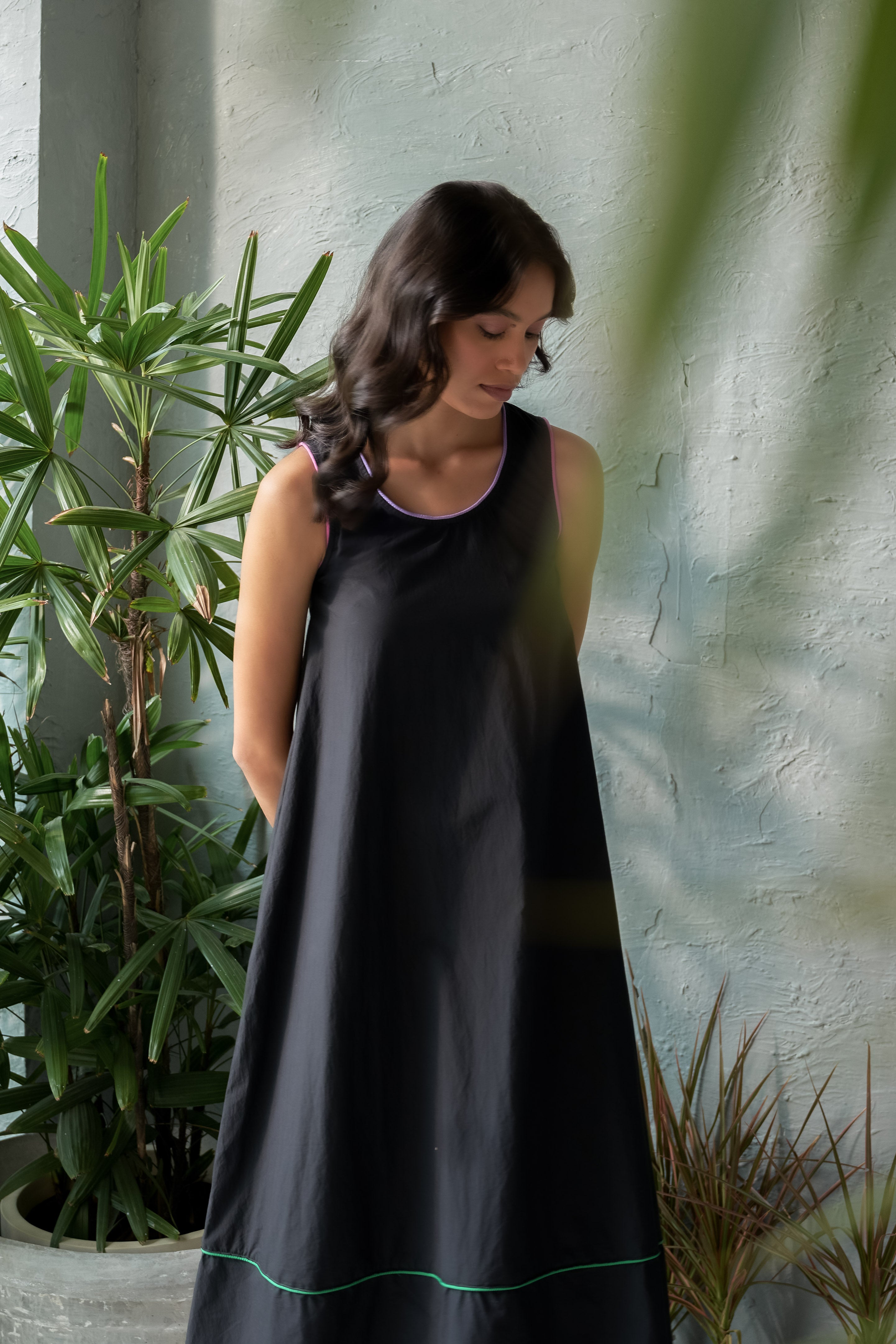 Step into style with our striking black midi dress, featuring a scoop neck, sleeveless design, and a modern U hem. The dress is adorned with vibrant, colorful piping detail that contrasts beautifully against the classic black fabric, adding a dynamic touch to the timeless silhouette. Made from high-quality, comfortable fabric, this dress offers a flattering fit that gracefully drapes over the body. Ideal for both casual and semi-formal occasions, this versatile midi dress can be dressed up with heels or kept chic with flats for a sophisticated yet playful look.