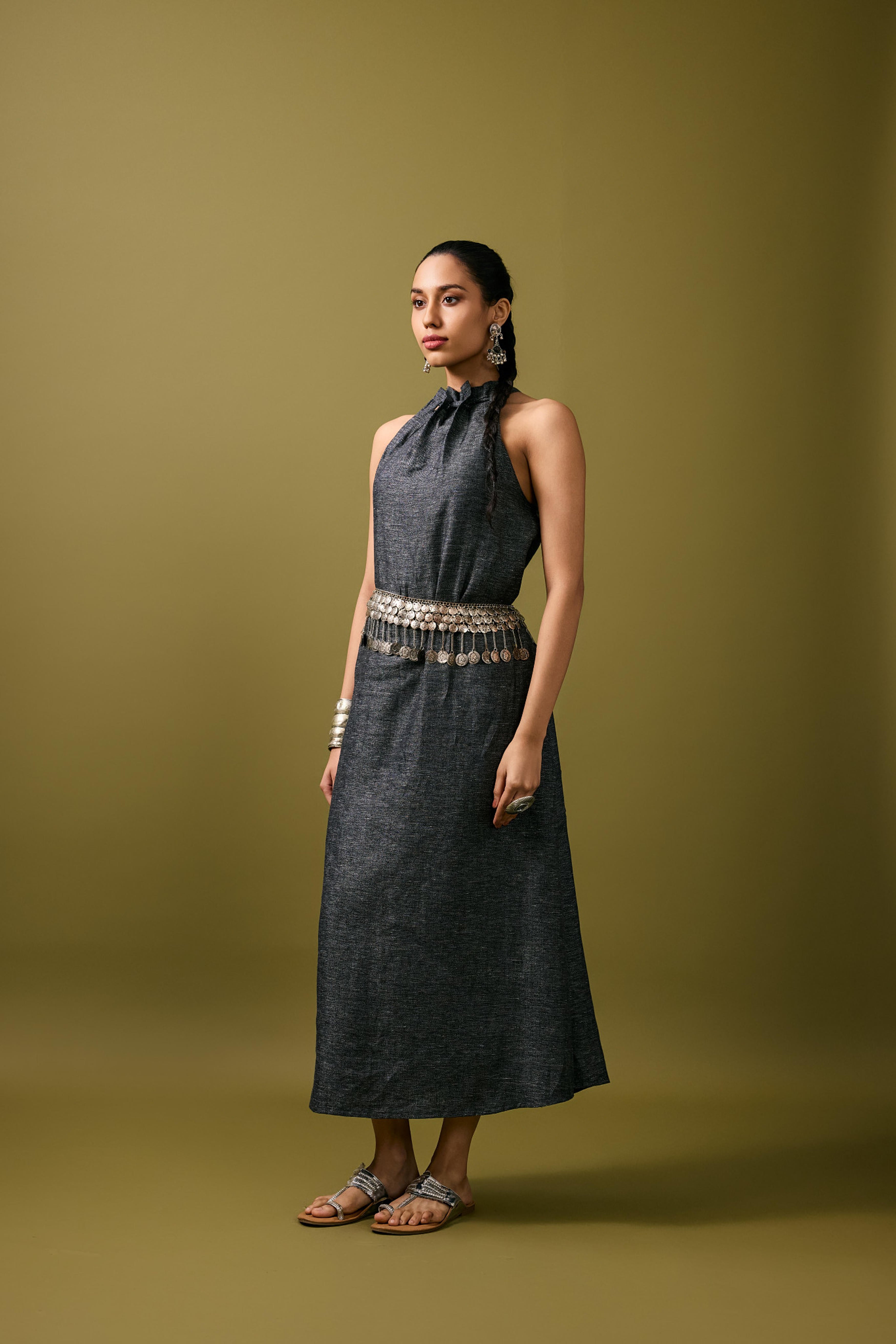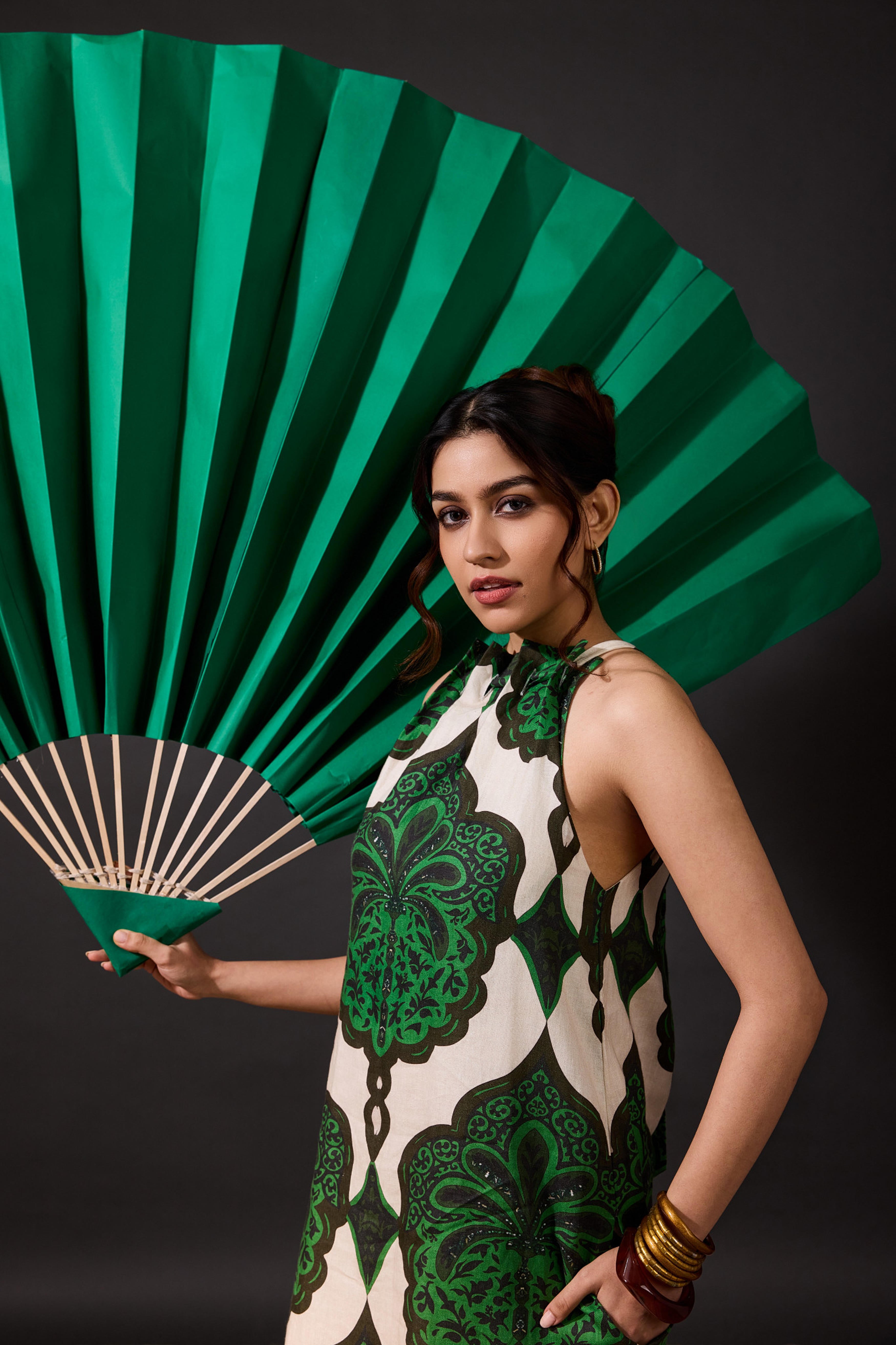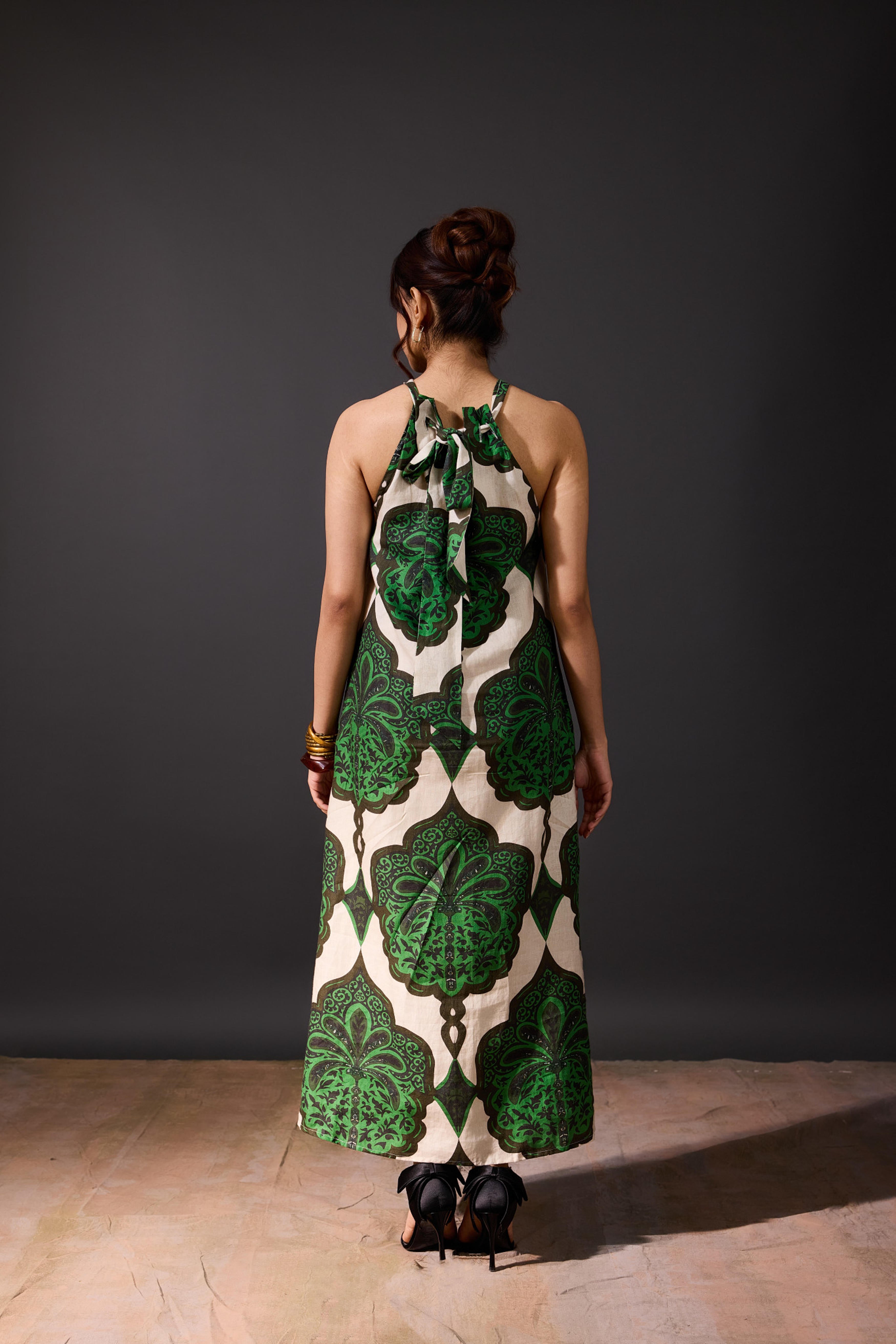 The Ananda Dress in Sage is a striking expression of bold print and refined ease. Crafted from 100% linen, this ankle-grazing dress features an A-line silhouette with a halter neckline and tie-up back. Its oversized sage-green motifs on an ivory canvas create a harmonious balance between statement and subtlety. Perfect for festive celebrations like Diwali, mehendi events, or even intimate evening gatherings, the Ananda Dress embodies effortless sophistication with an artisanal touch.