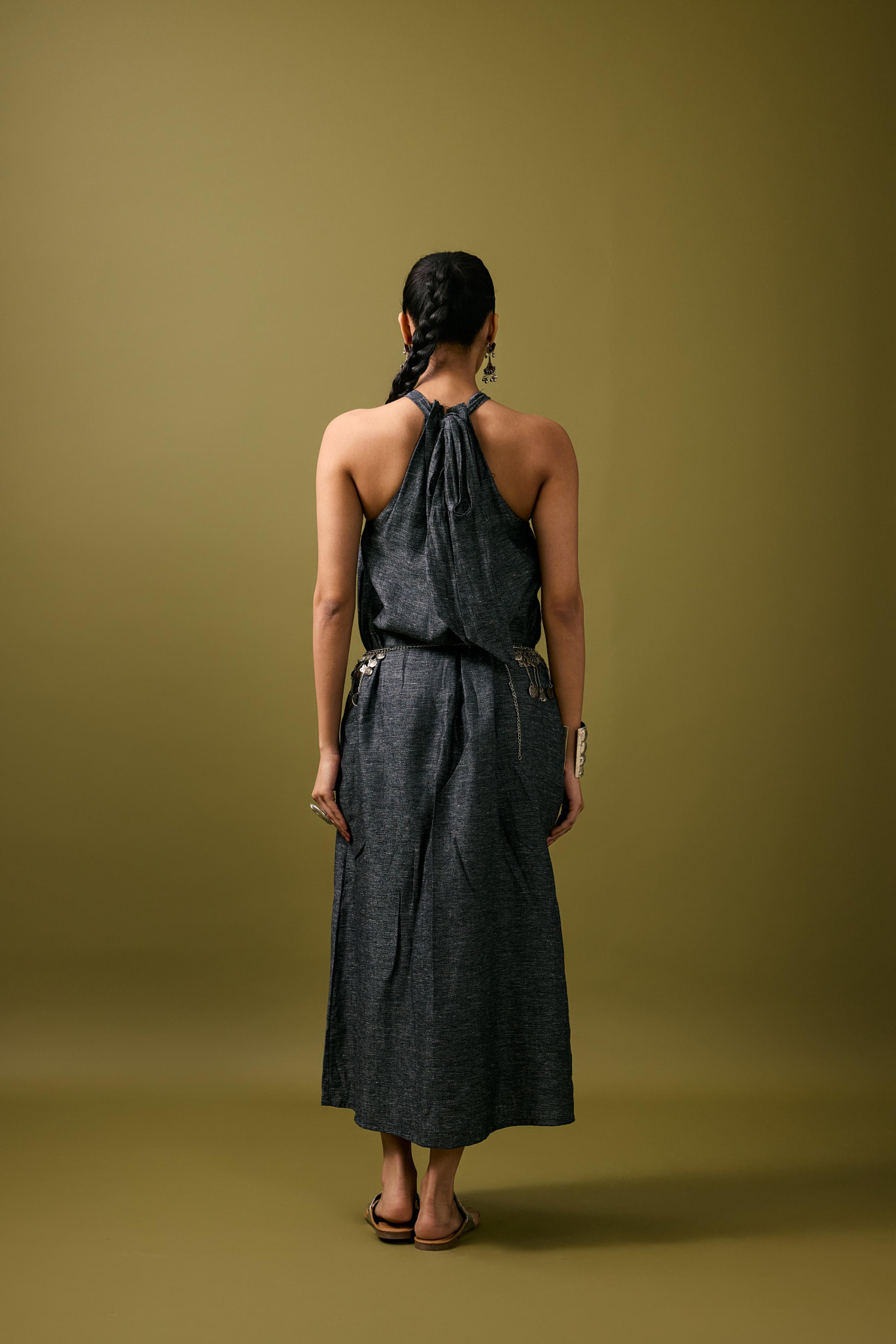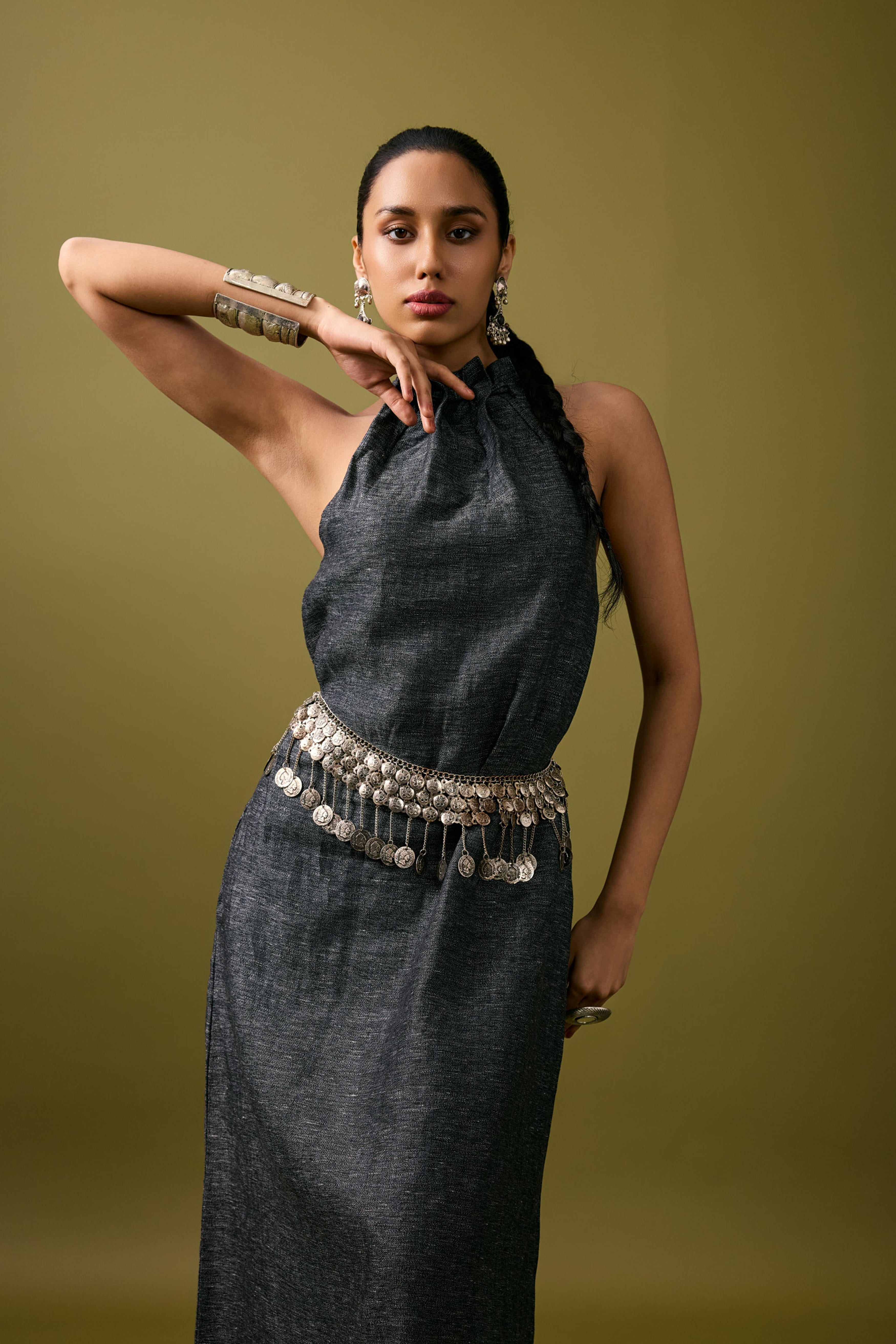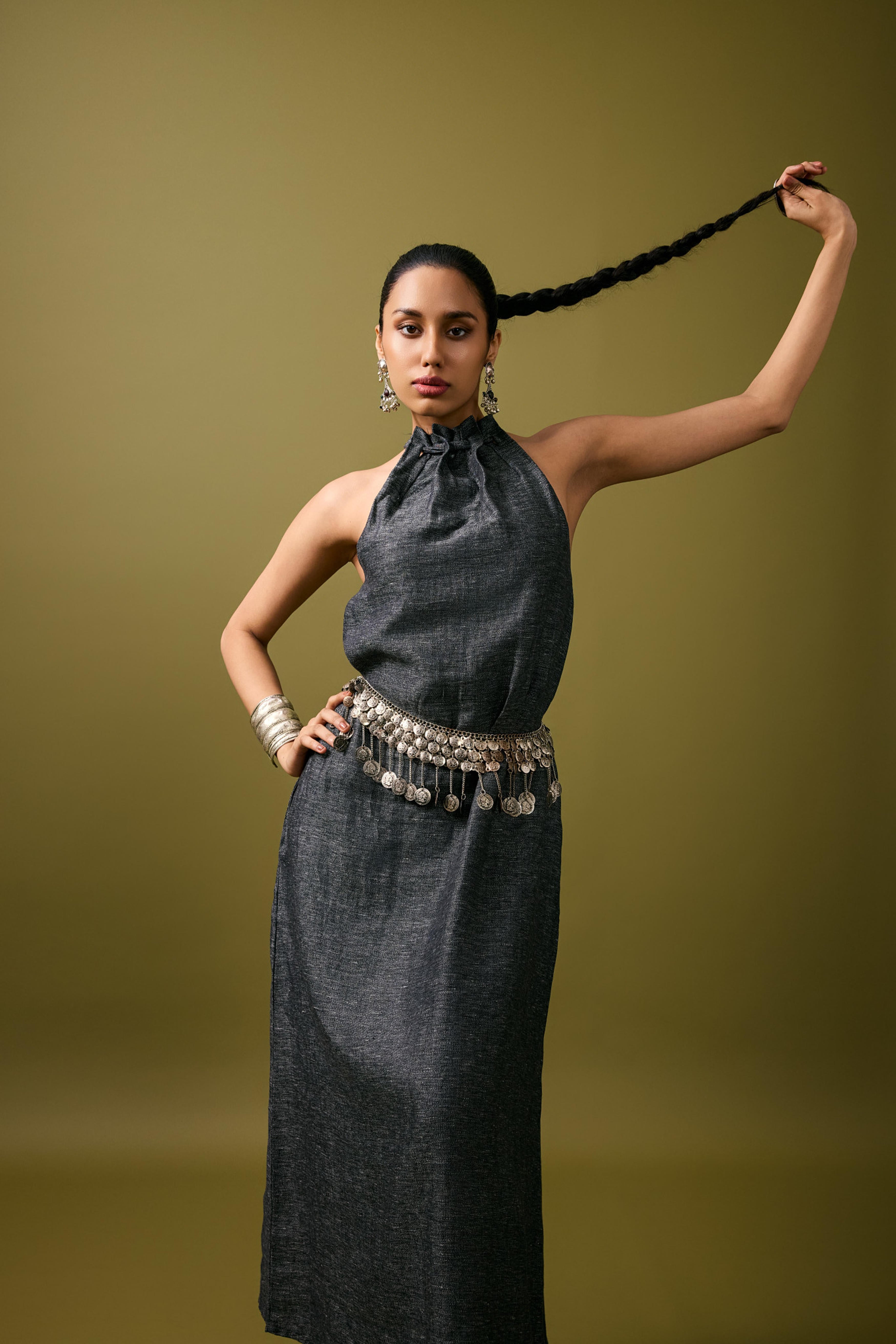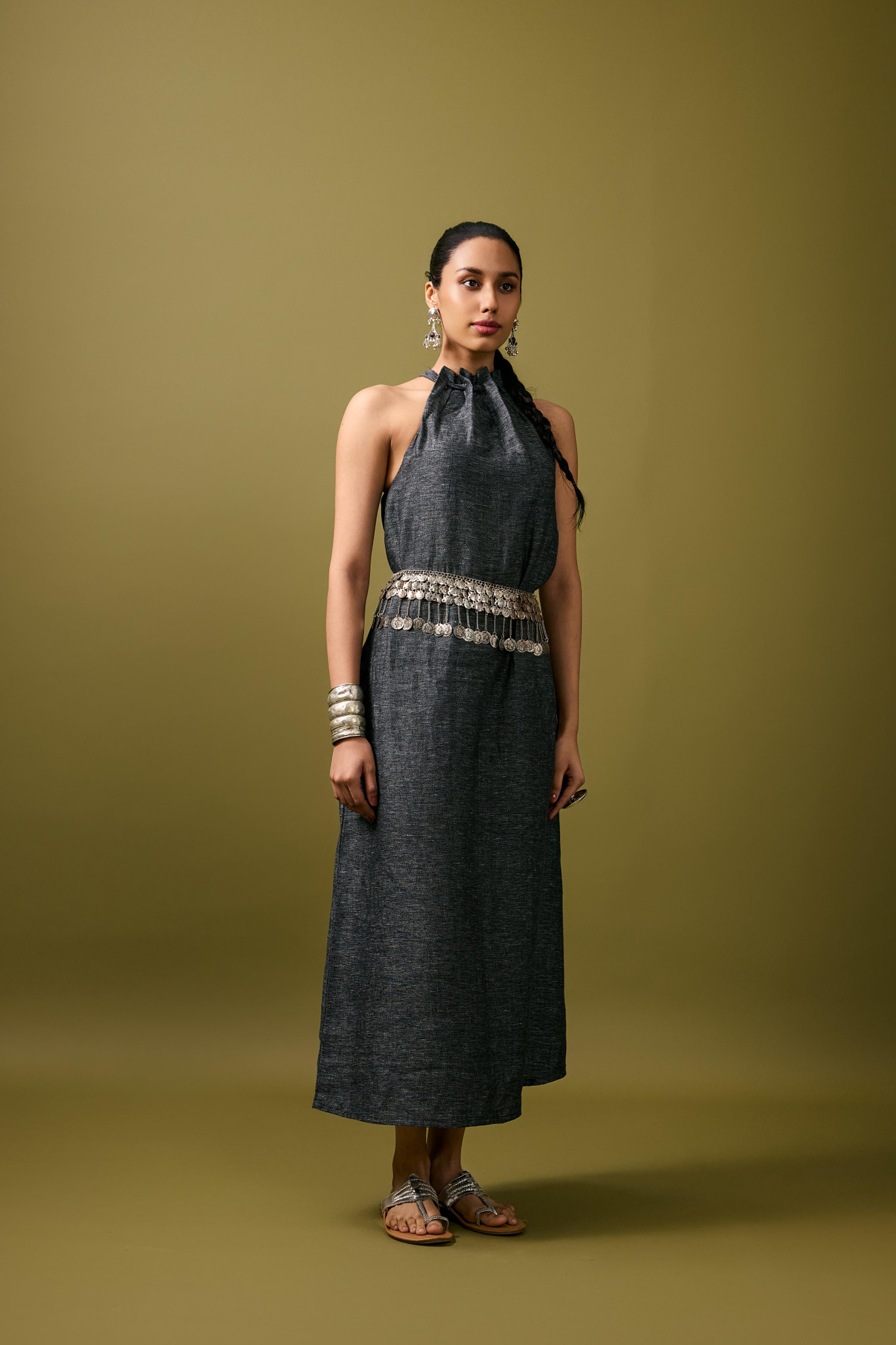 The Ananda Dress in Sage is a striking expression of bold print and refined ease. Crafted from 100% linen, this ankle-grazing dress features an A-line silhouette with a halter neckline and tie-up back. Its oversized sage-green motifs on an ivory canvas create a harmonious balance between statement and subtlety. Perfect for festive celebrations like Diwali, mehendi events, or even intimate evening gatherings, the Ananda Dress embodies effortless sophistication with an artisanal touch.
