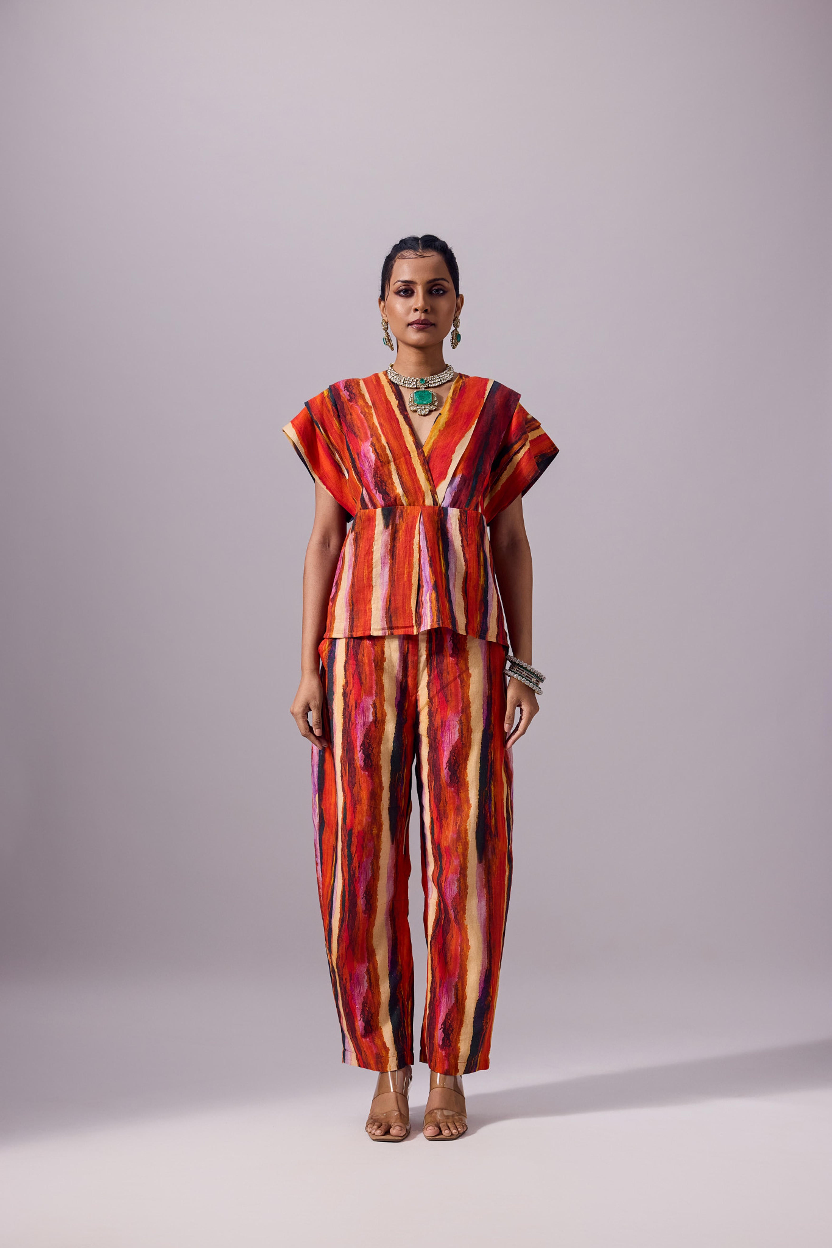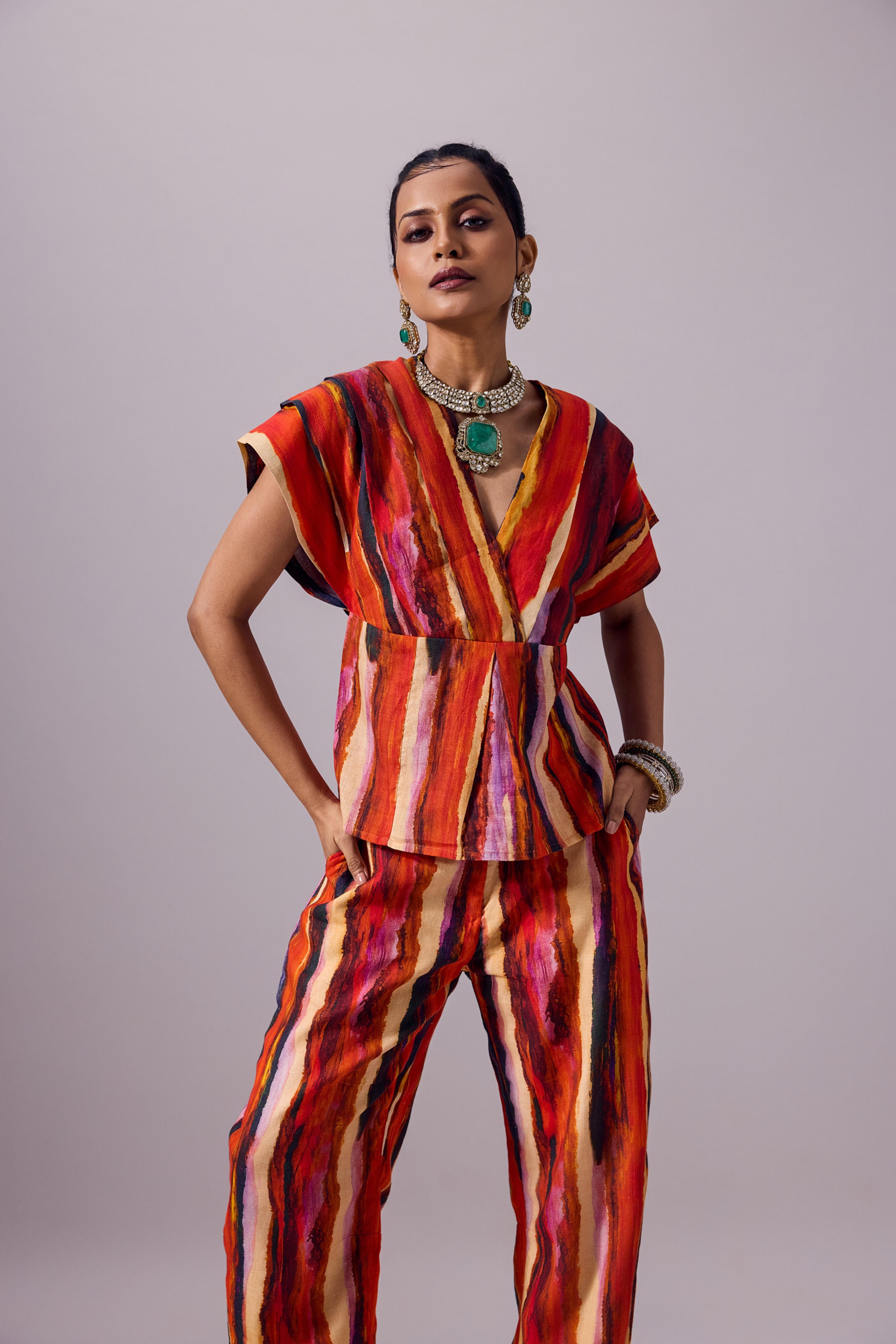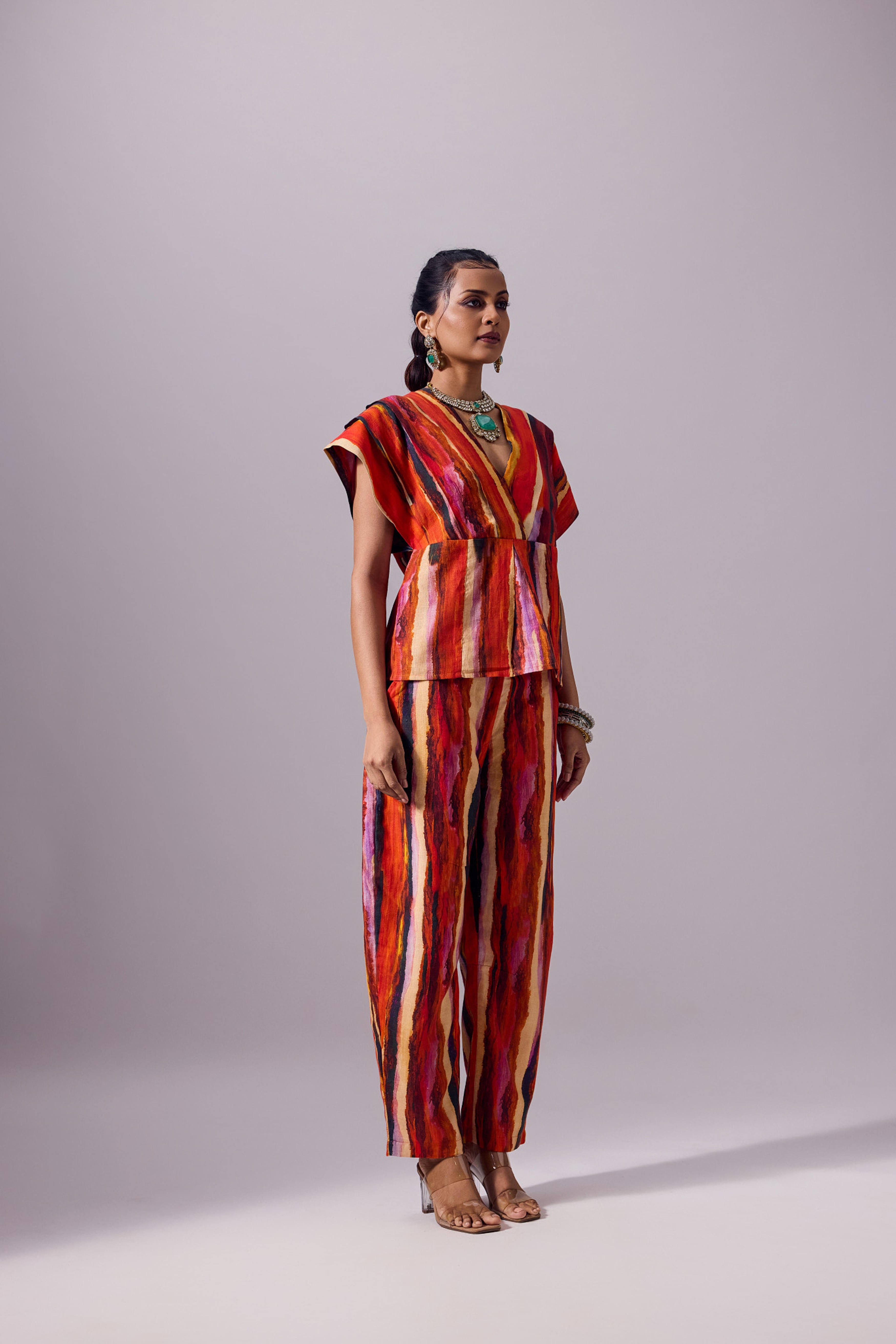 The Anchi Set in Ember is a vibrant two-piece ensemble designed to make a bold statement while remaining easy to wear. Crafted from 100% linen, the set features a boxy V-neck top with structured cap sleeves and a cinched back tie detail for adjustable shaping. Paired with relaxed, barrel-cut trousers, it offers both comfort and elevated style. The Ember palette brings together fiery reds, glowing oranges, and deep purples in hand-painted stripes that exude festive warmth and modern artistry. Perfect for festive gatherings, destination weddings, or chic evening occasions, the Anchi Set seamlessly balances tradition with contemporary edge.