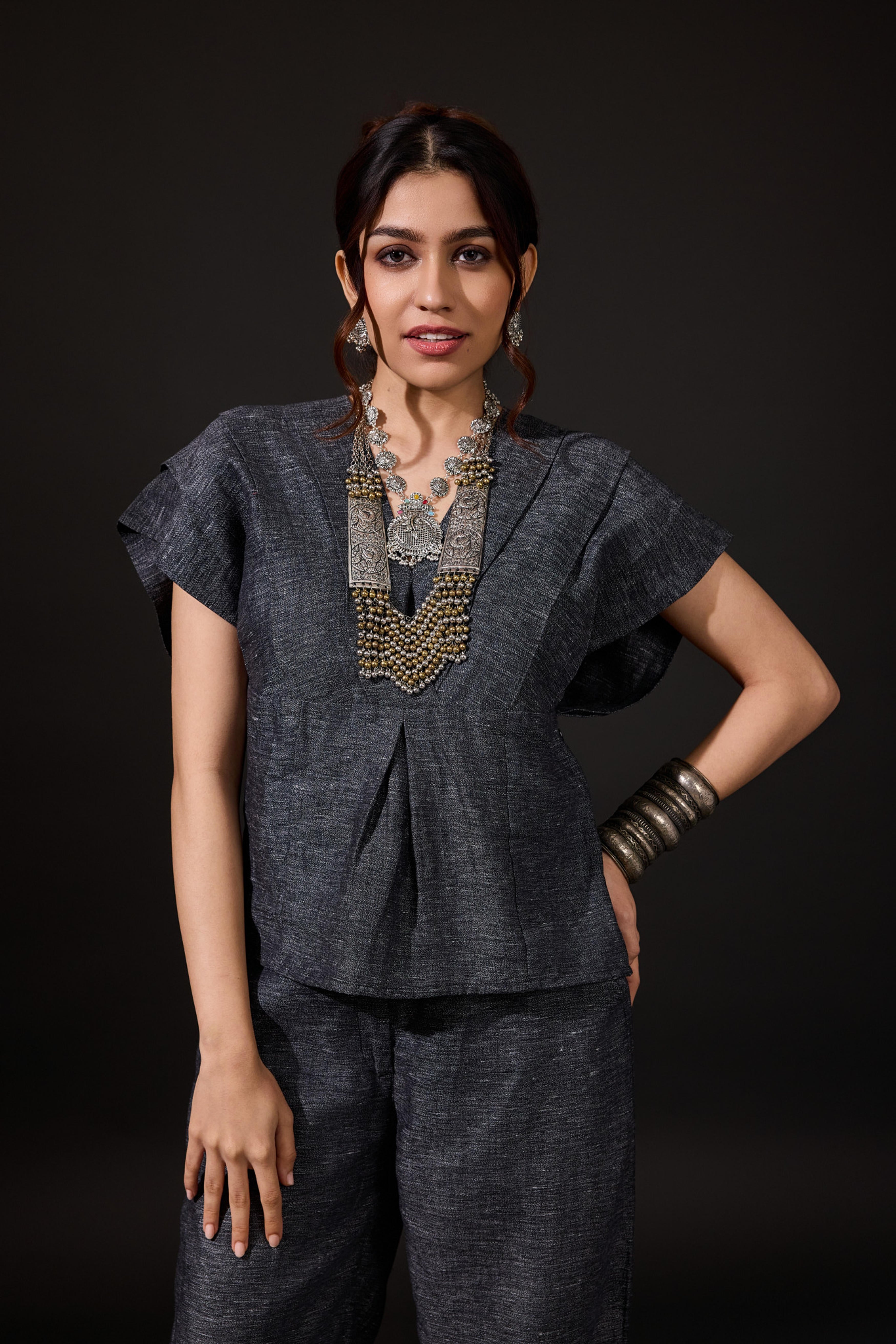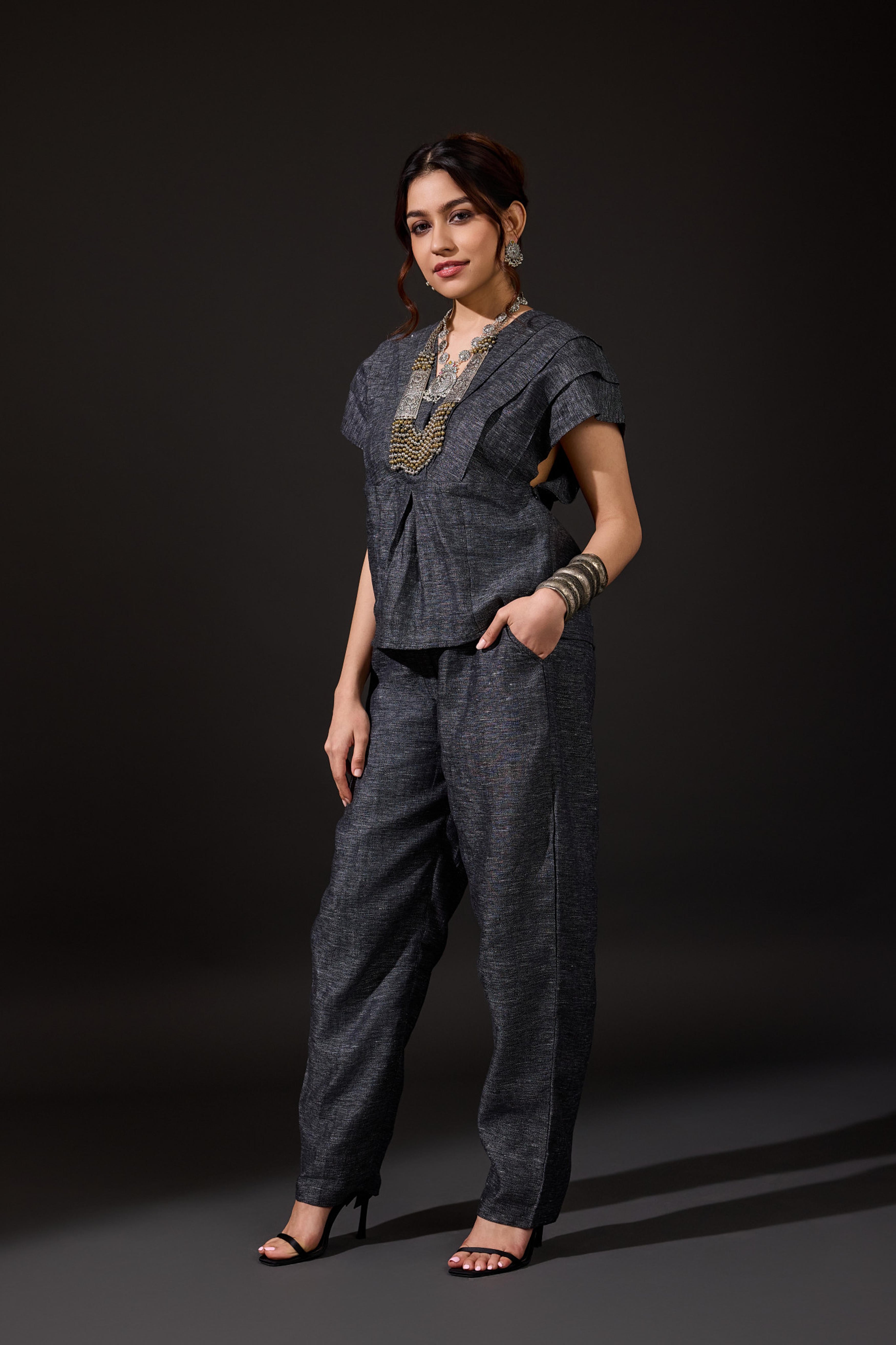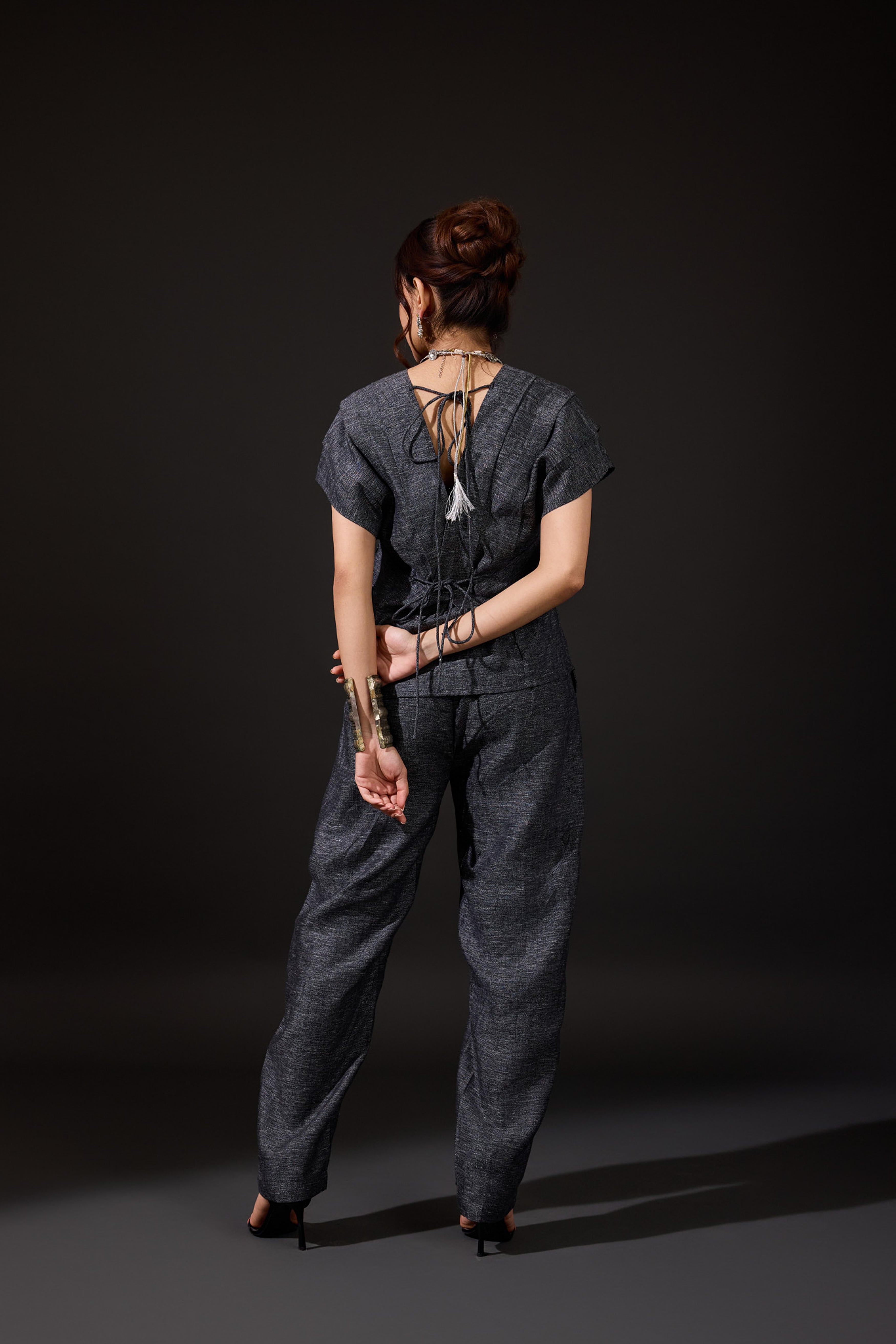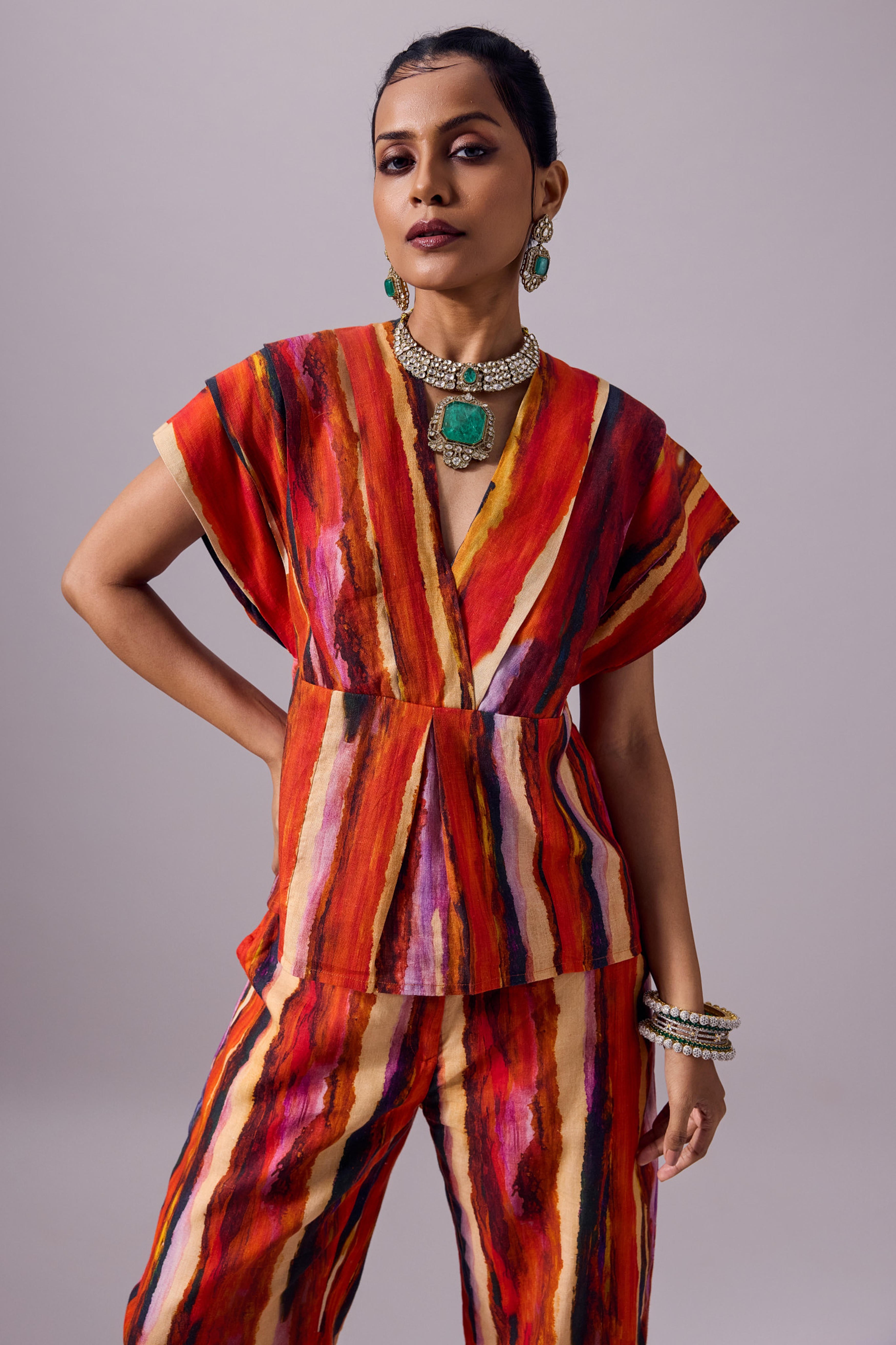 The Anchi Set in Ember is a vibrant two-piece ensemble designed to make a bold statement while remaining easy to wear. Crafted from 100% linen, the set features a boxy V-neck top with structured cap sleeves and a cinched back tie detail for adjustable shaping. Paired with relaxed, barrel-cut trousers, it offers both comfort and elevated style. The Ember palette brings together fiery reds, glowing oranges, and deep purples in hand-painted stripes that exude festive warmth and modern artistry. Perfect for festive gatherings, destination weddings, or chic evening occasions, the Anchi Set seamlessly balances tradition with contemporary edge.