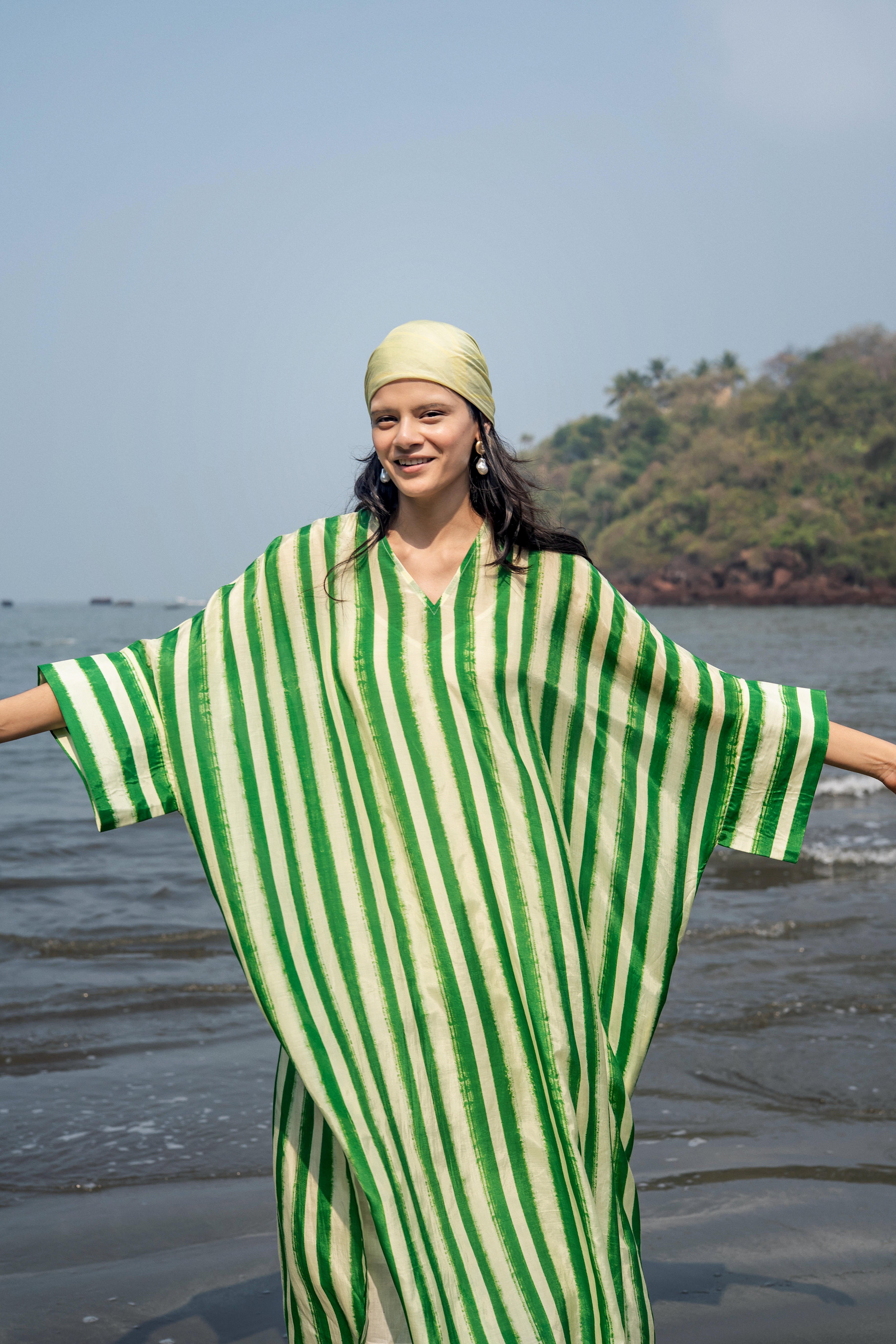 The Angela kaftan is made from our softest of cotton silk fabrication with hand painted stripe print. It is a free size kaftan with slits & pockets.