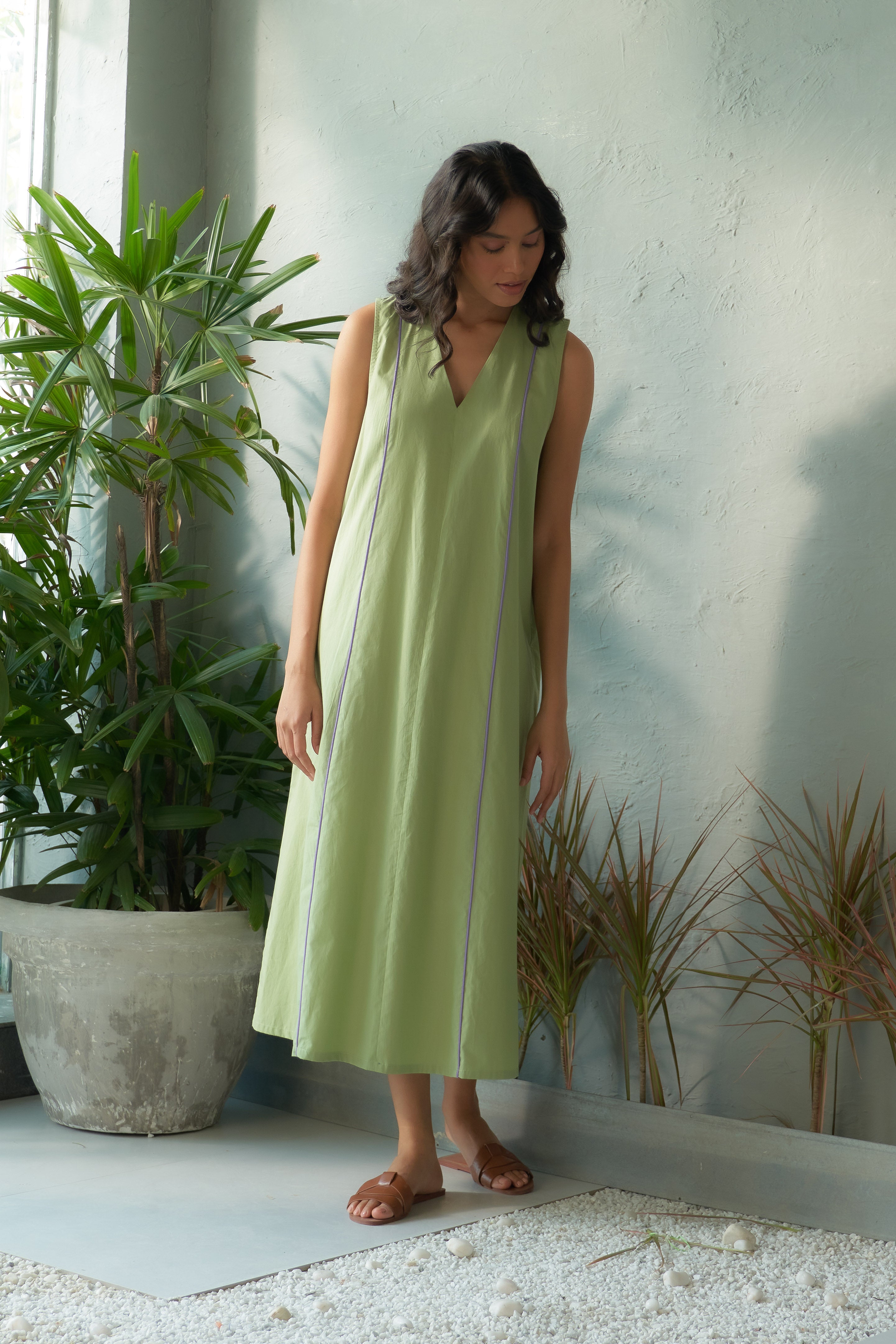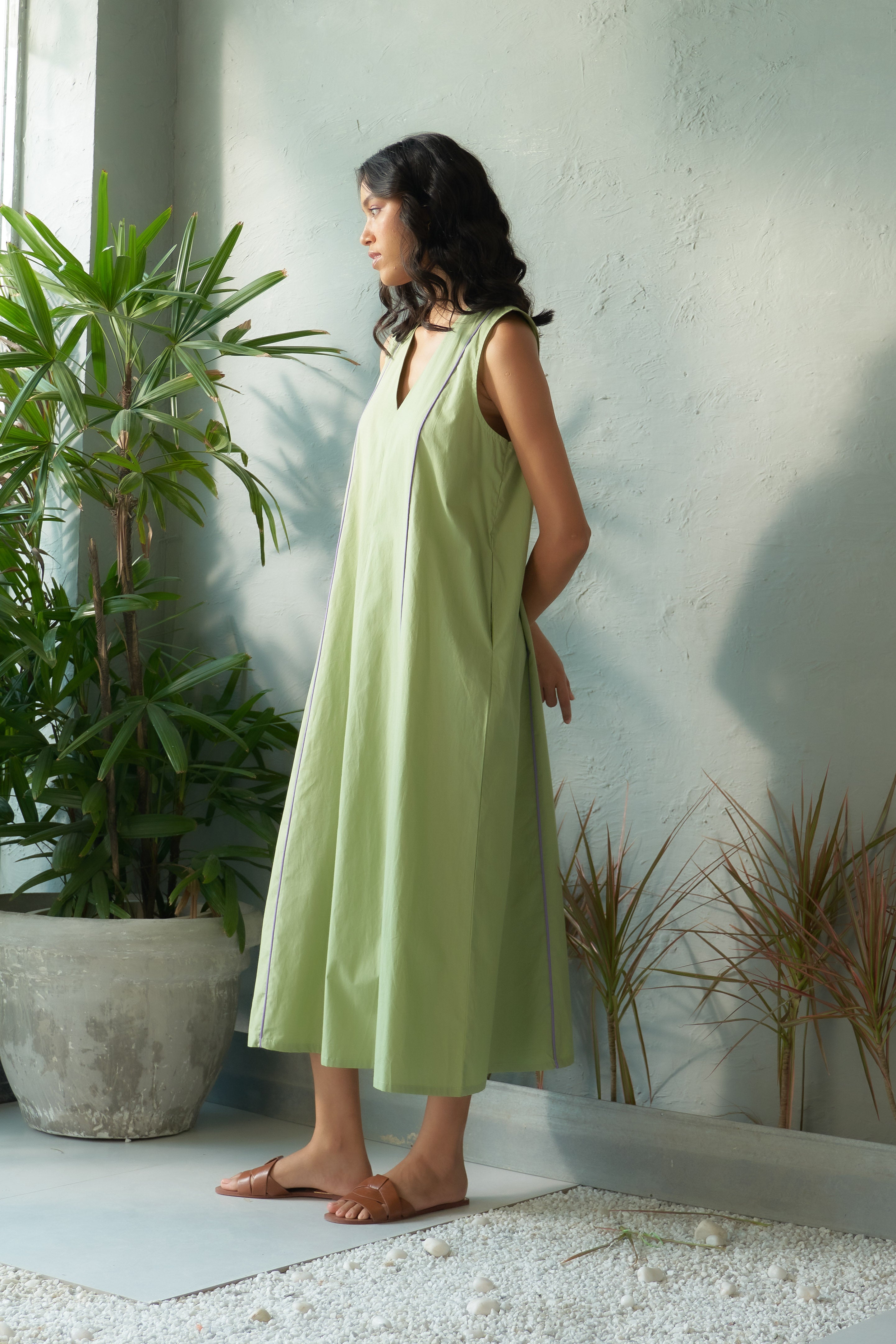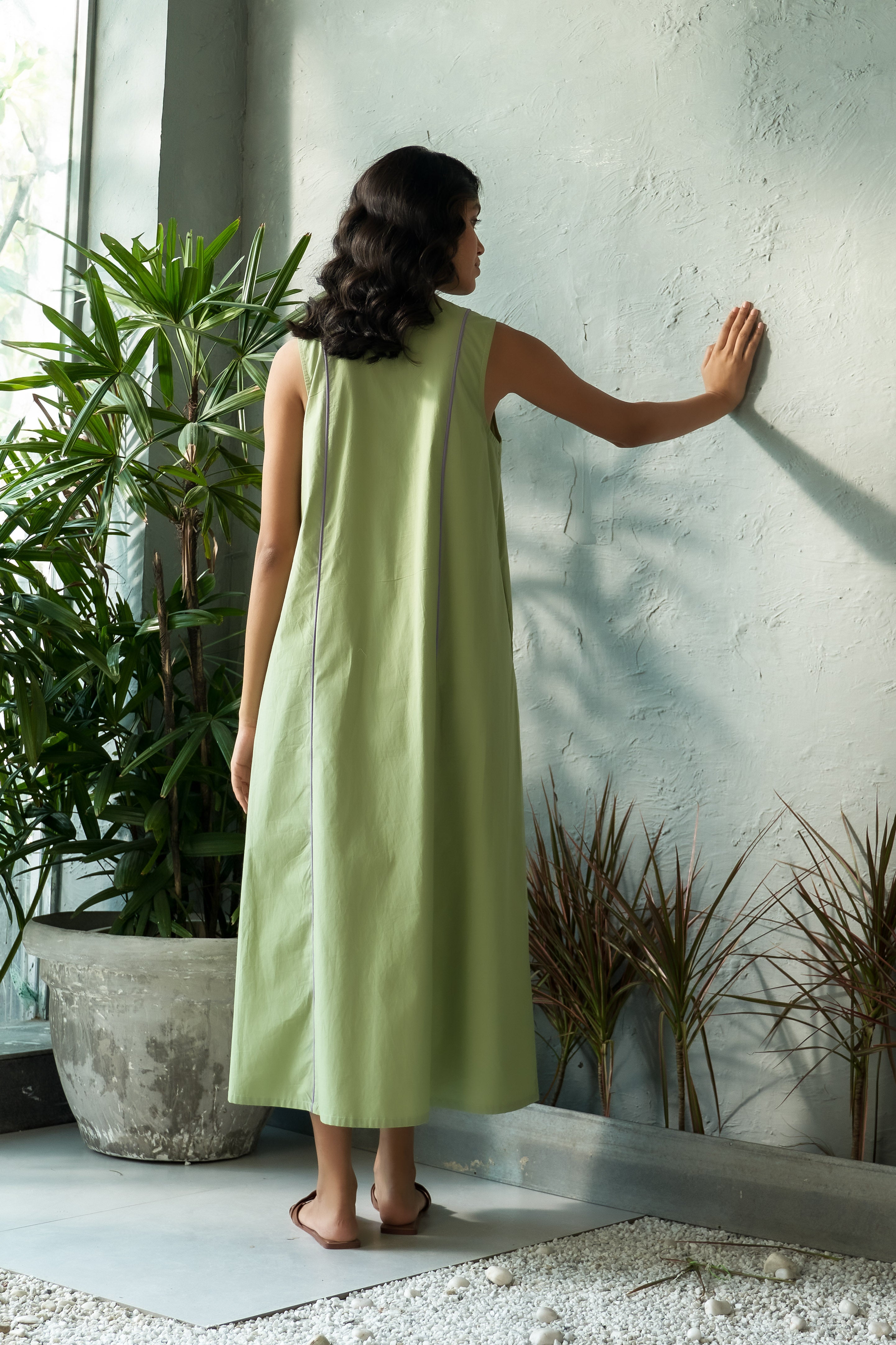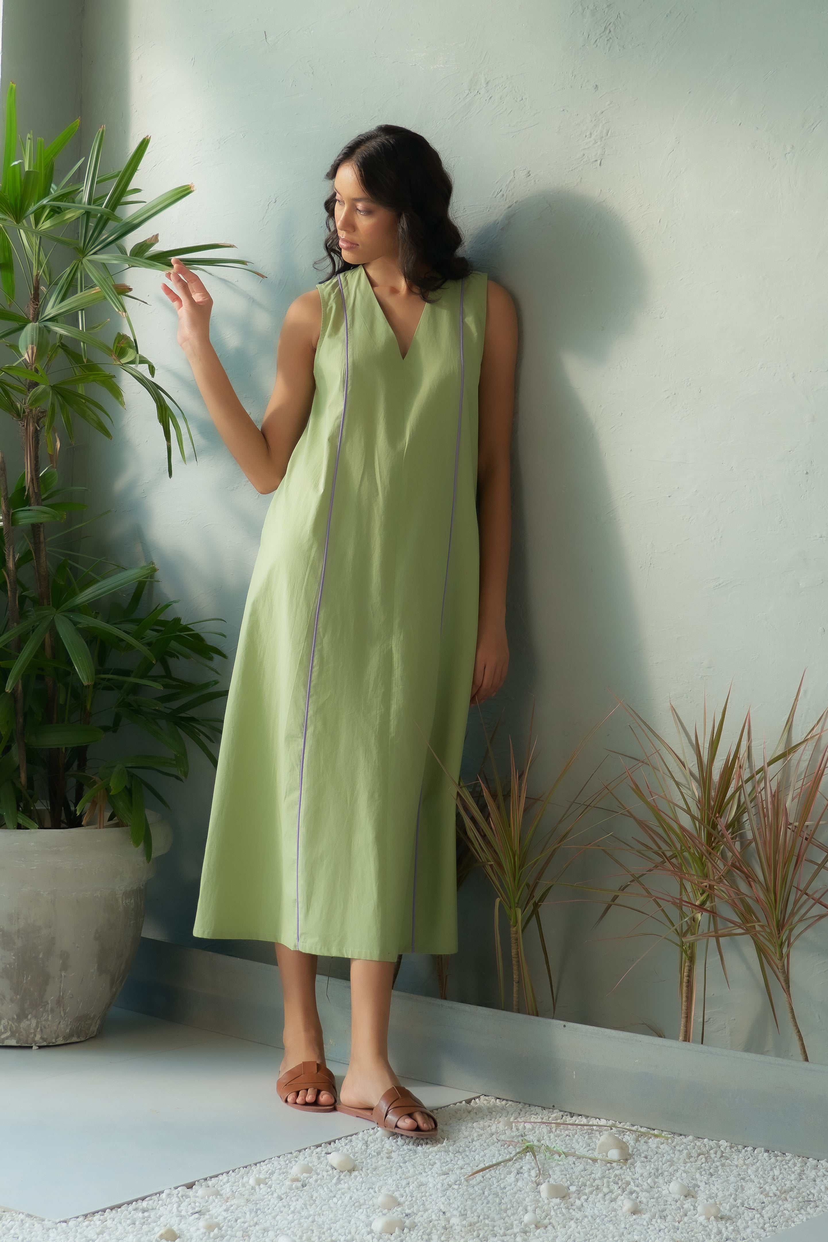 This mint green V-neck sleeveless midi dress is the perfect blend of minimalism and elegance. Crafted from premium poplin fabric, the sleek design features delicate contrast piping details along the front panel, adding a refined touch to its clean silhouette. The midi length offers a flattering, versatile fit, making it an ideal choice for casual outings, brunches, or semi-formal events. Effortlessly chic, this dress brings both comfort and style to your wardrobe, ensuring you look polished and put-together for any occasion.
