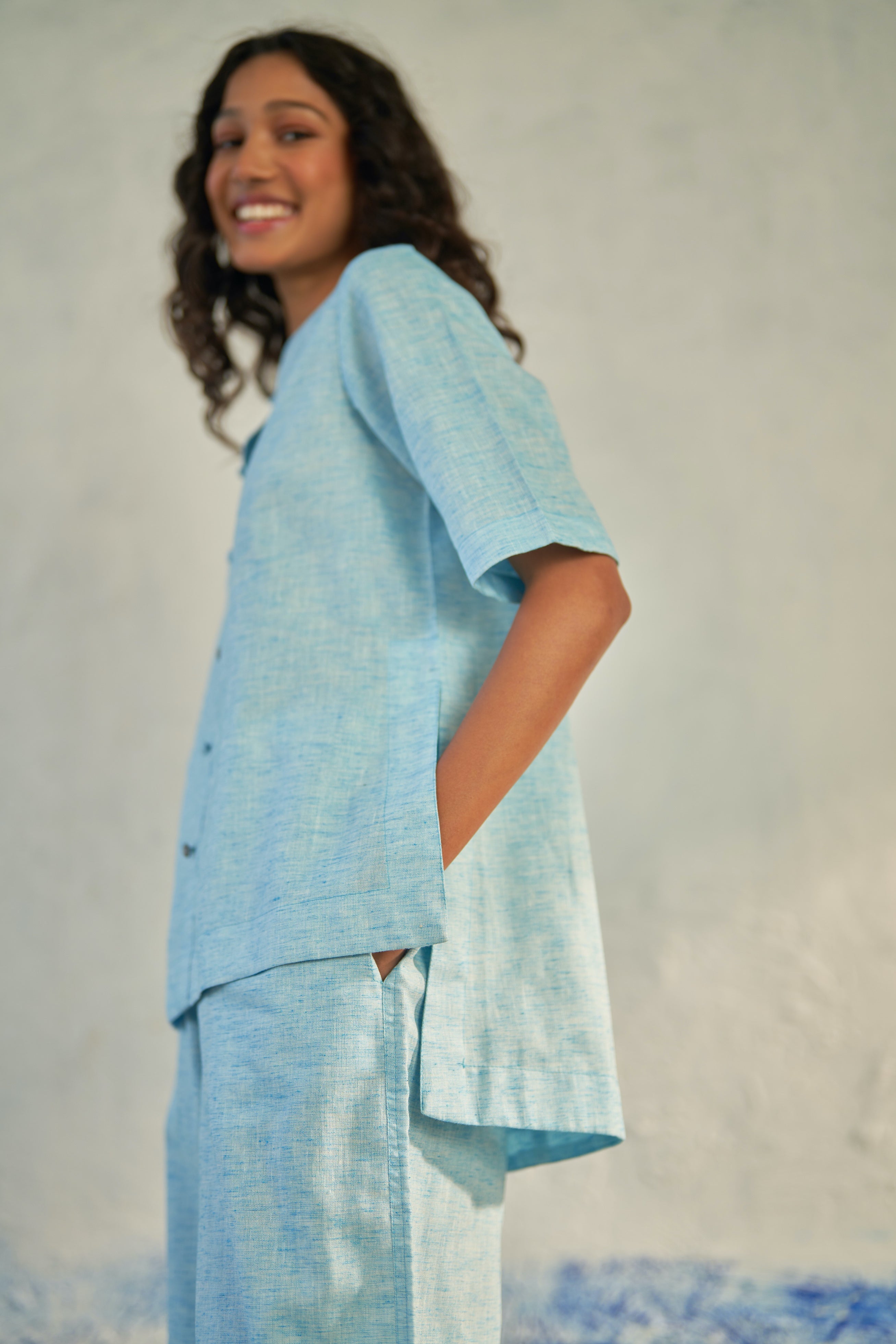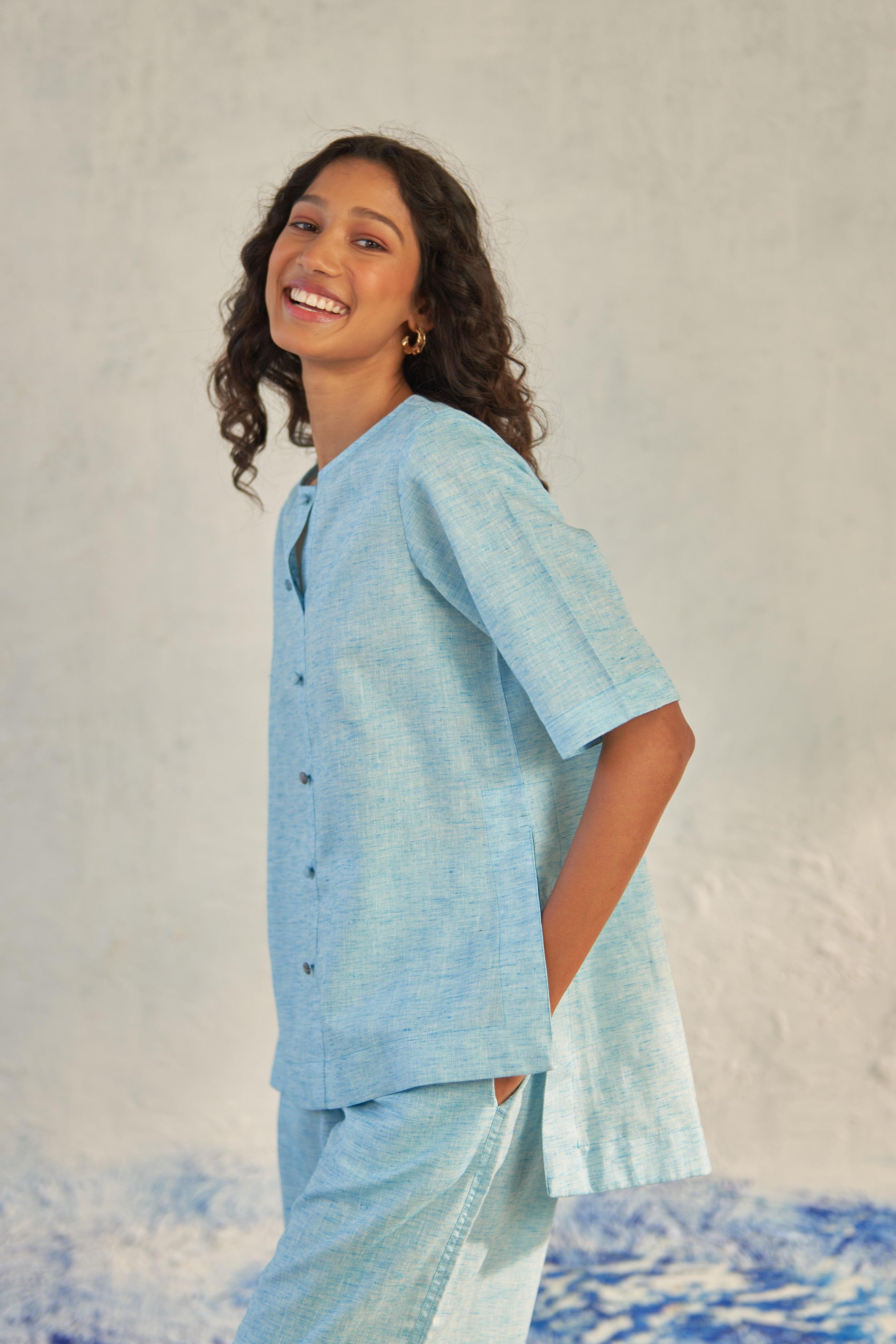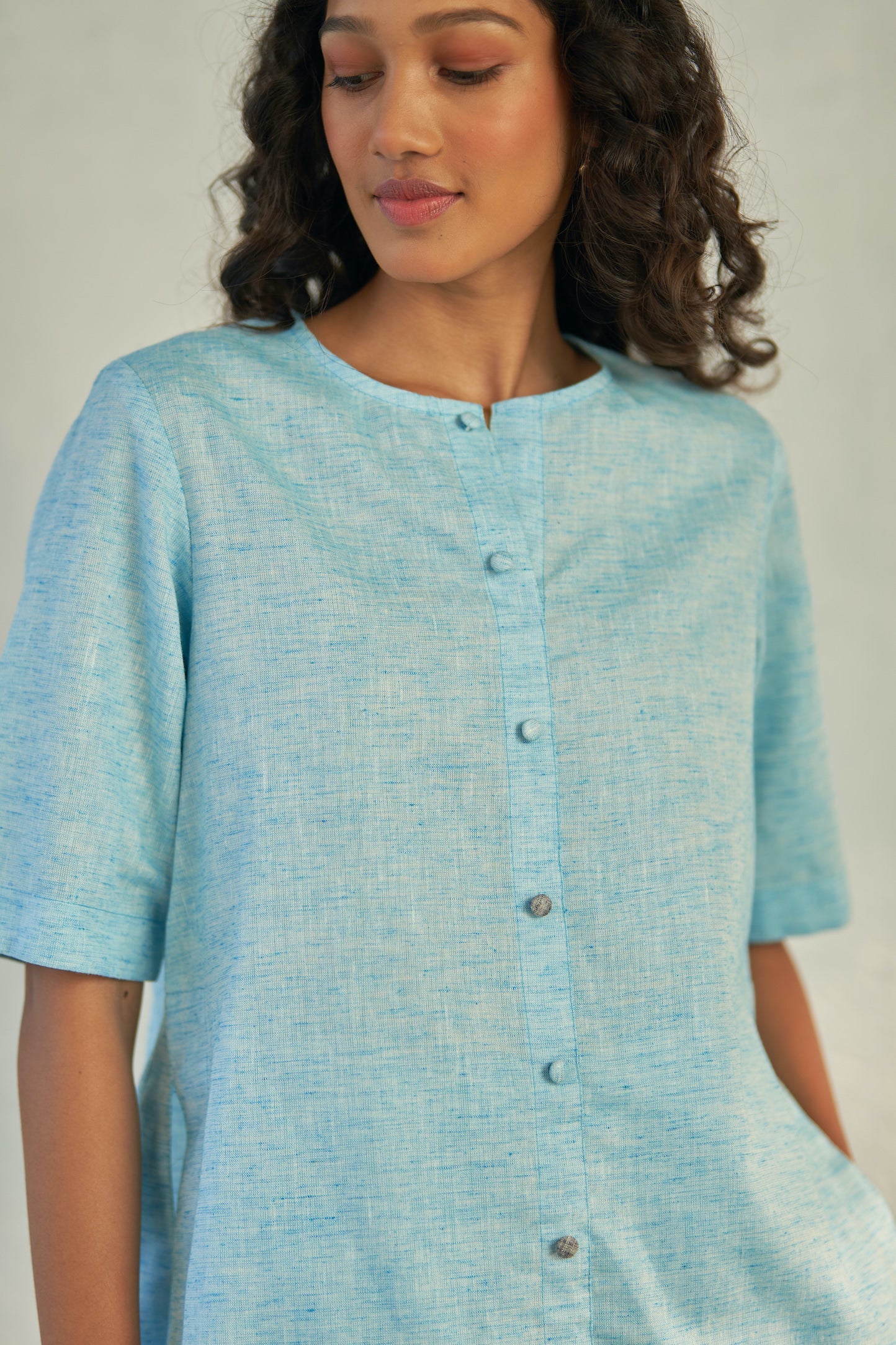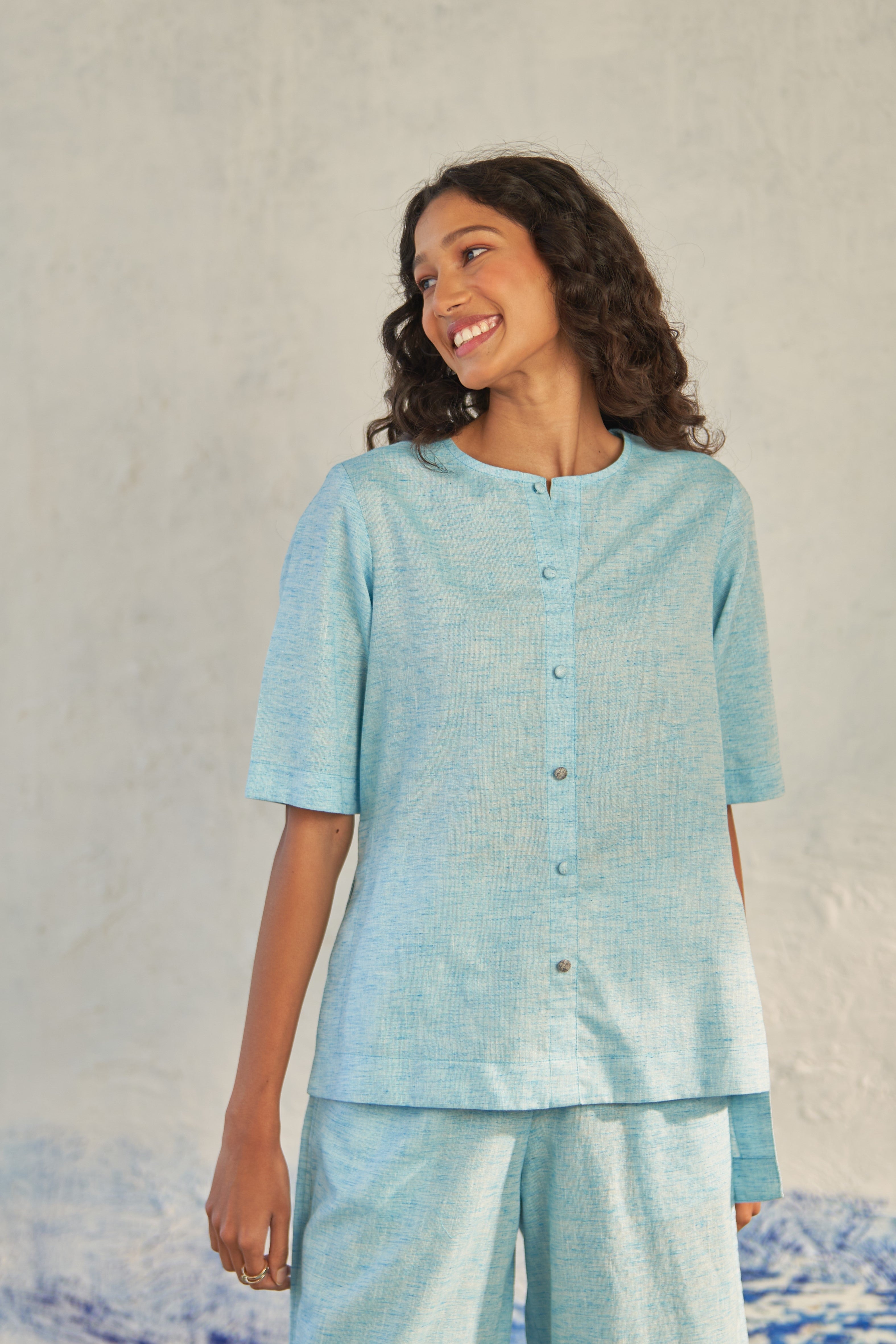 Versatility of our hydrating top, meticulously crafted from textured cotton. Perfect for sunny days and effortlessly transitioning into enchanting evenings, this piece boasts a round neckline and dome fabric buttons that lend an intriguing dimension to the silhouette. The addition of contrasting buttons brings a vibrant touch to the garment.