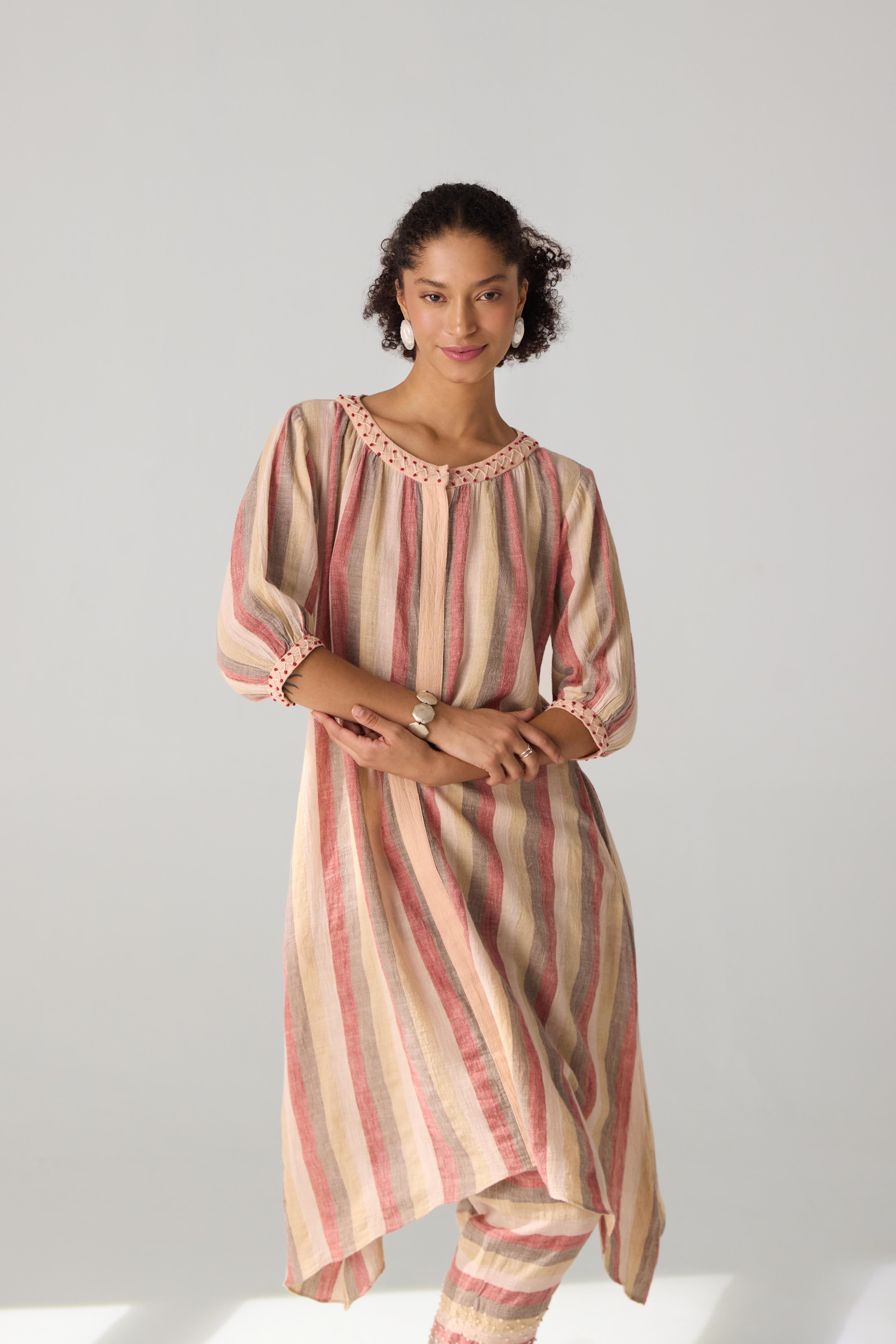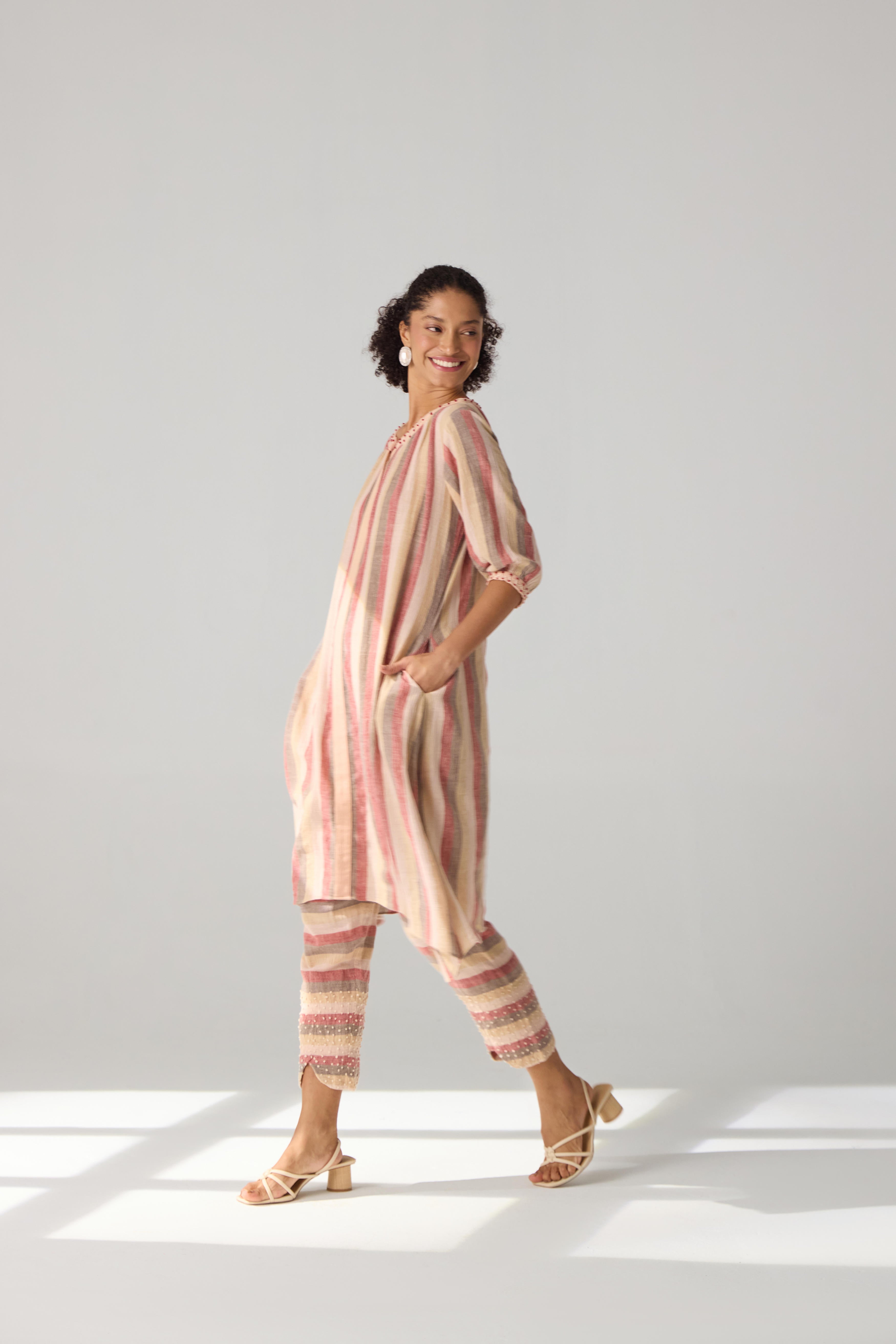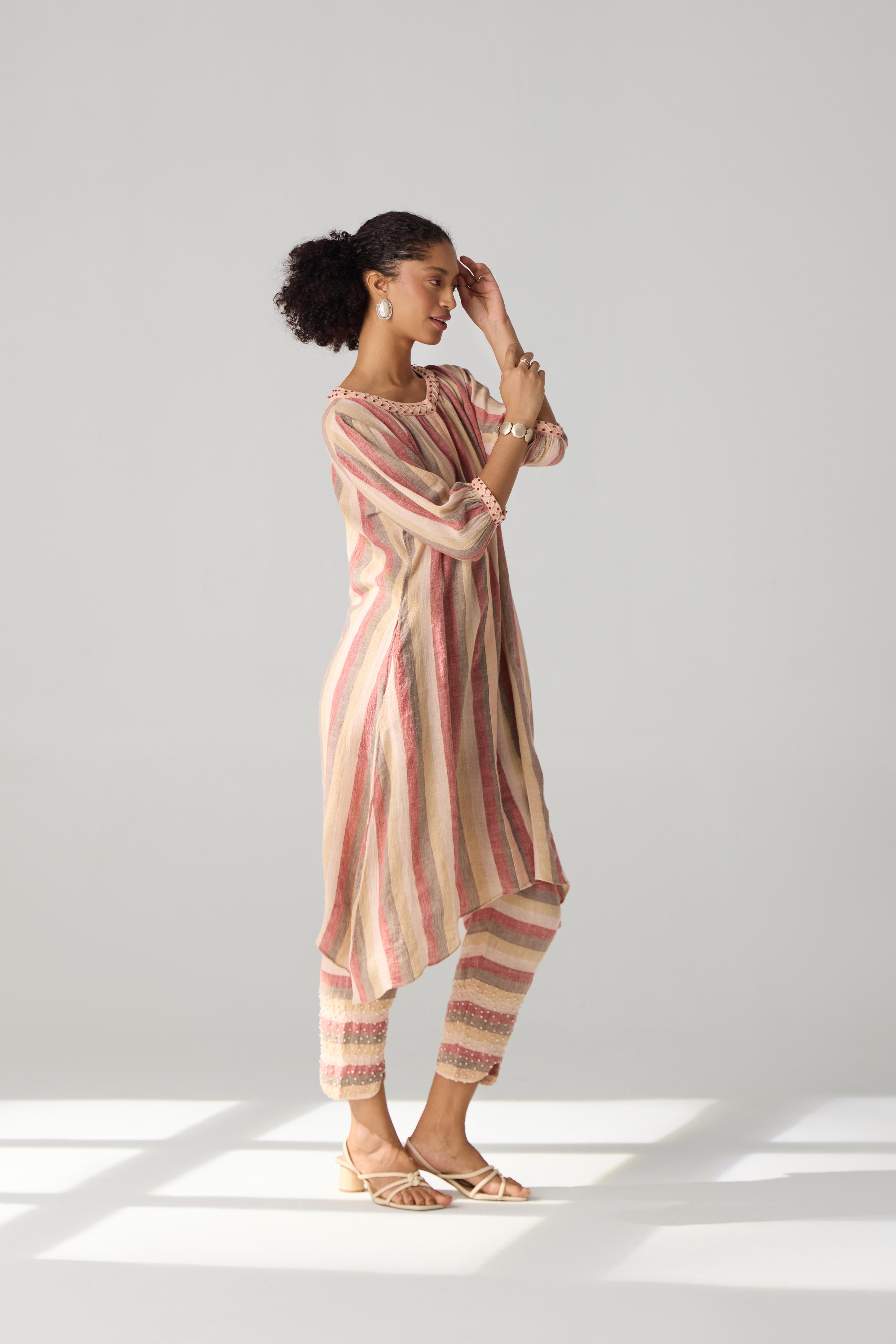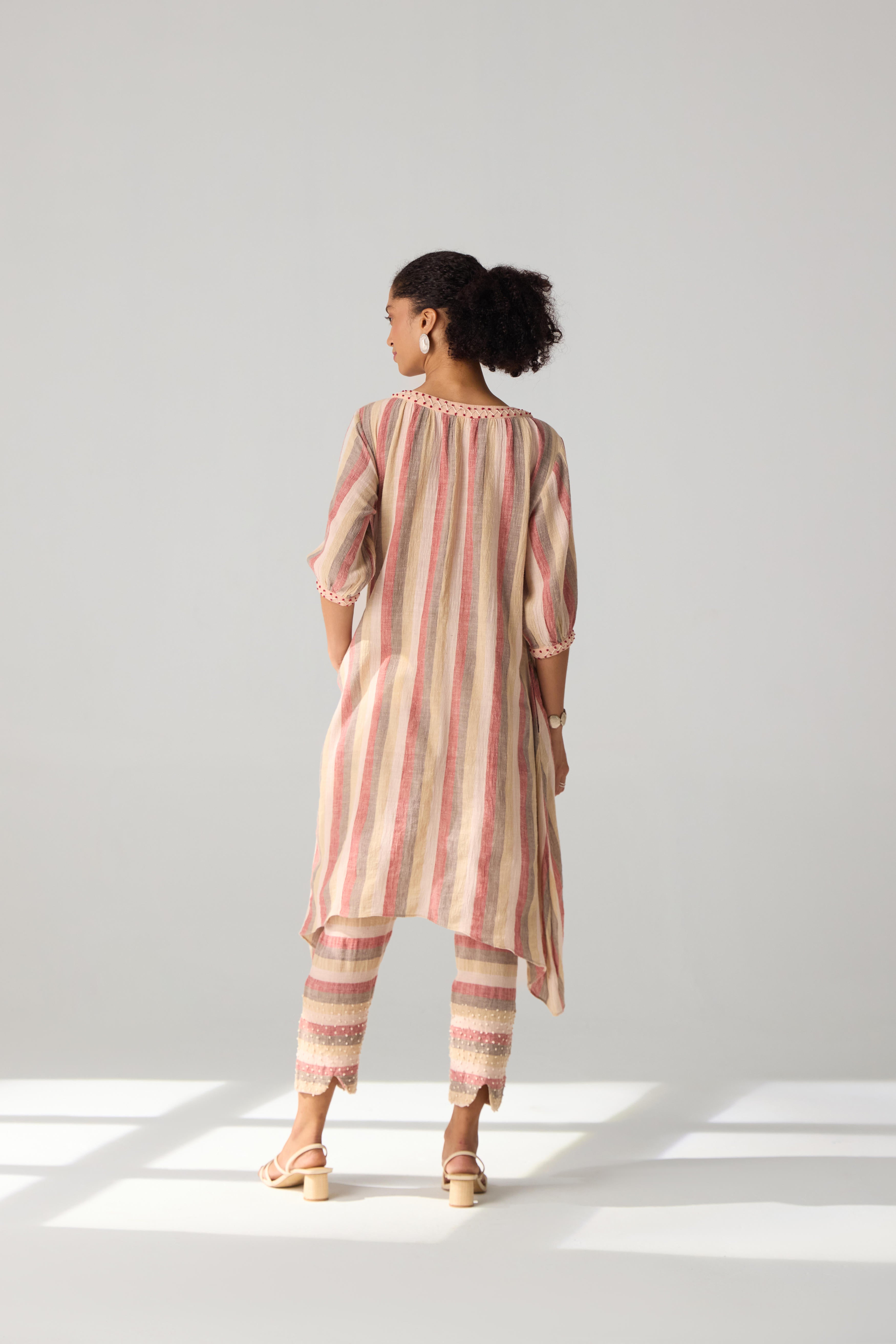 A two piece set featuring asymmetric tunic with curved hem pants. The tunic features embriodered round neckline and sleeves and front fasterning. Bottom part of the pants is accentuated with hand embriodery detailing and side inseam pockets. This product will be exclusively handcrafted for you, making the pattern/texture/color slightly vary from the image shown, due to multiple artisan led techniques and processes involved. Color may also slightly vary due to photographic lighting sources. Tunic Length - Pant Length - 36"
