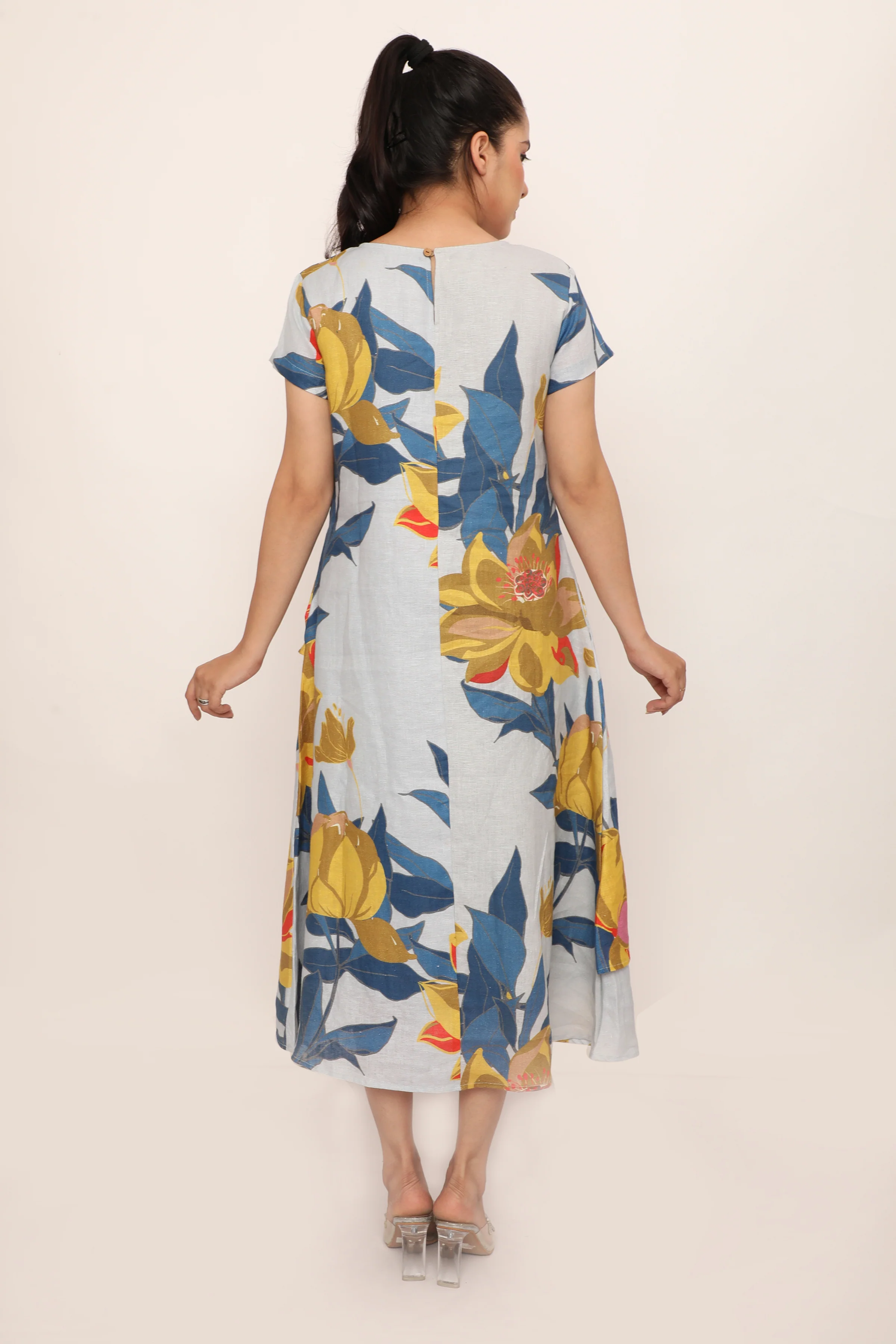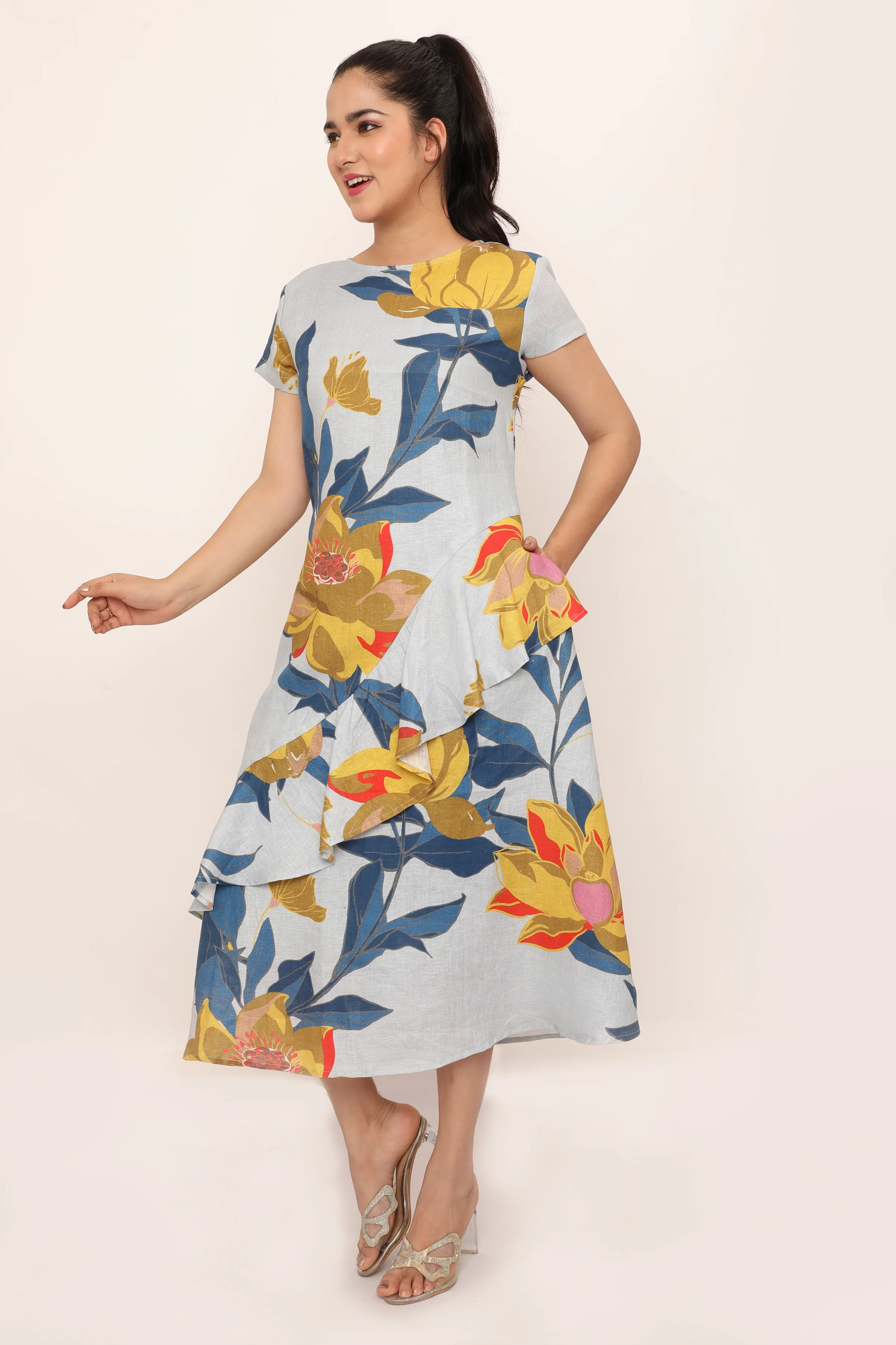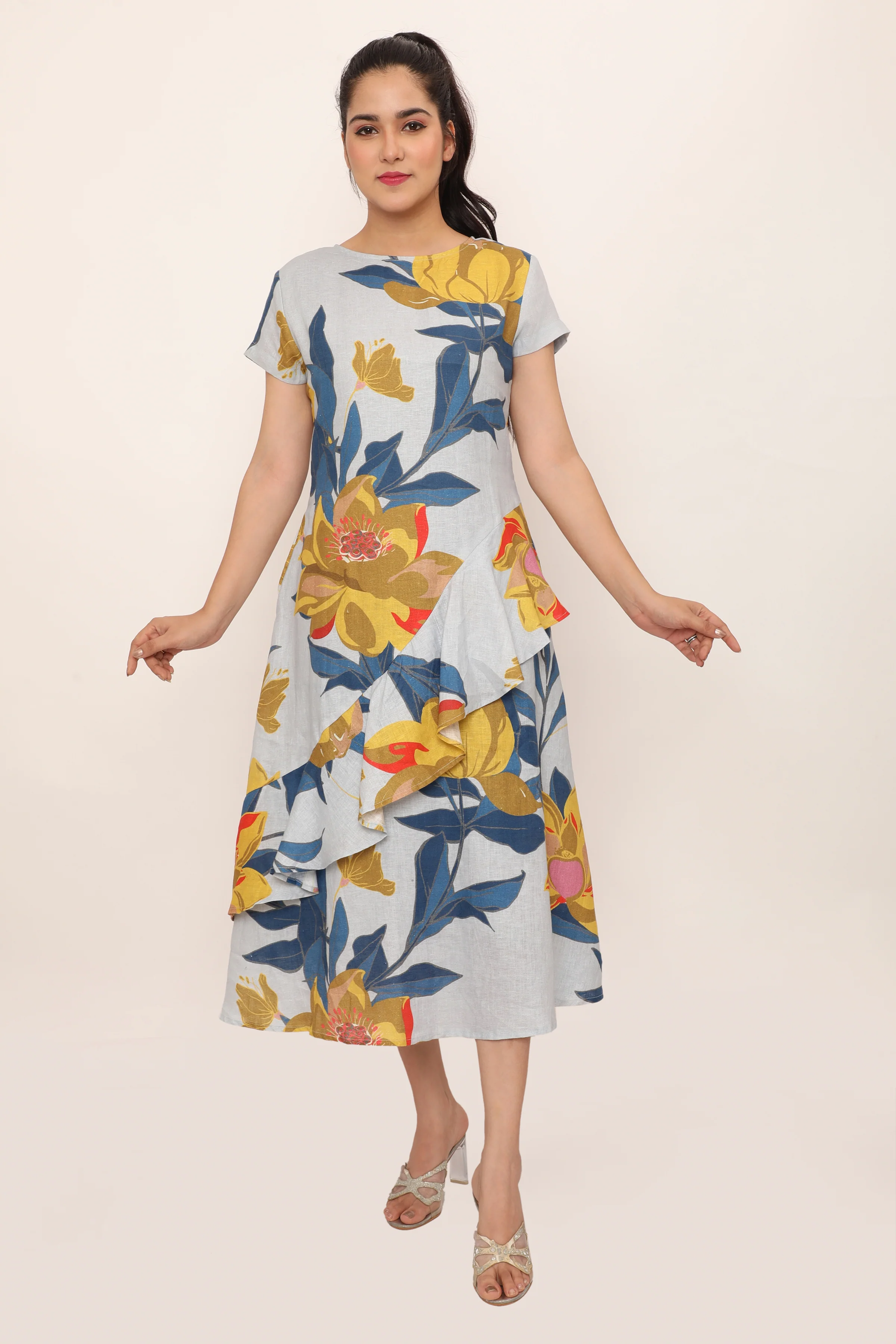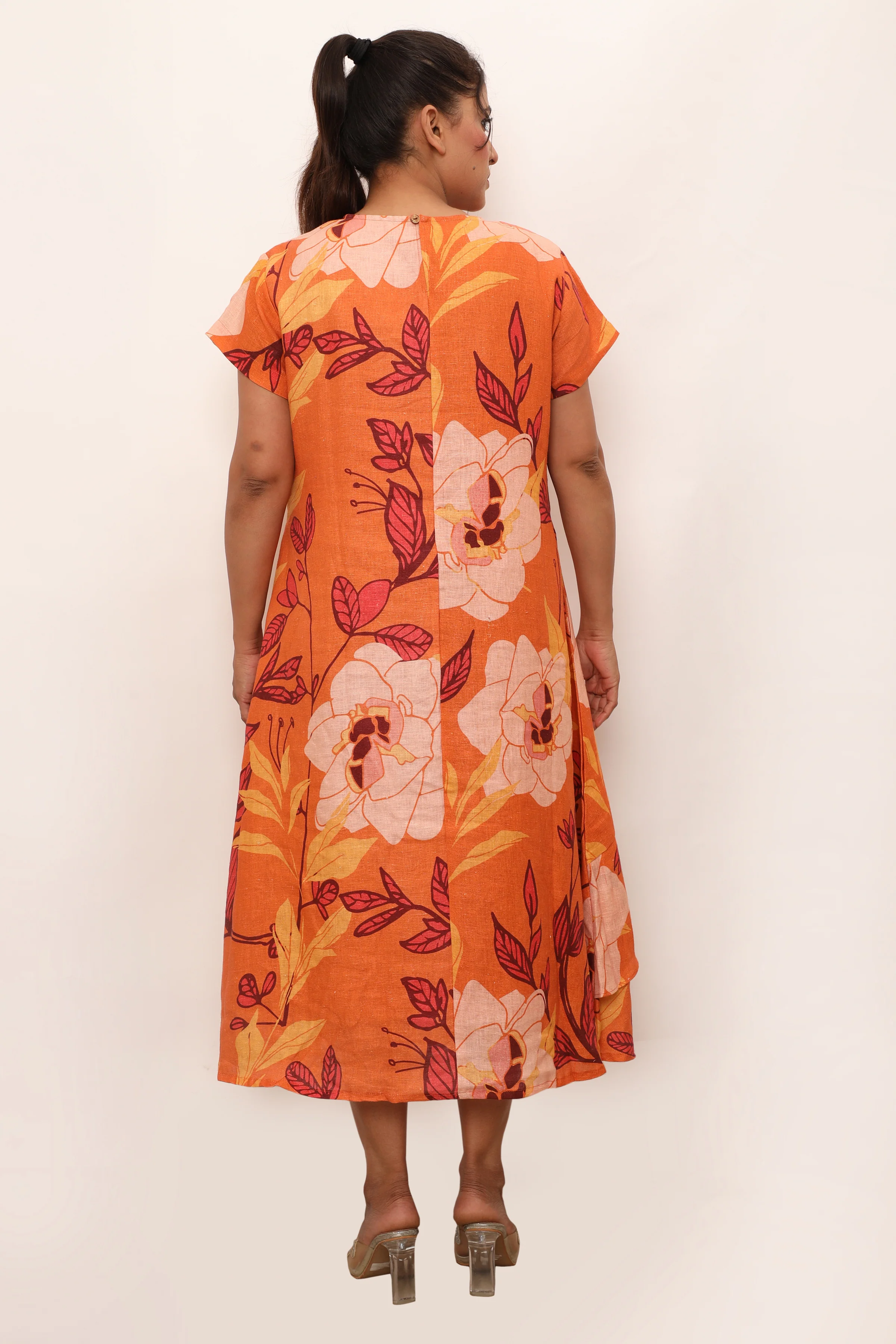 The Athena Dress - a vibrant and elegant addition to your wardrobe. This midi dress features a striking orange floral print that exudes warmth and charm. Designed with short sleeves and a stylish ruffle detail cascading down the front, it adds a touch of sophistication and movement to your silhouette. Pair the dress with strappy sandals and delicate jewellery for a refined daytime look. For an evening event, elevate the ensemble with heels and a statement clutch.