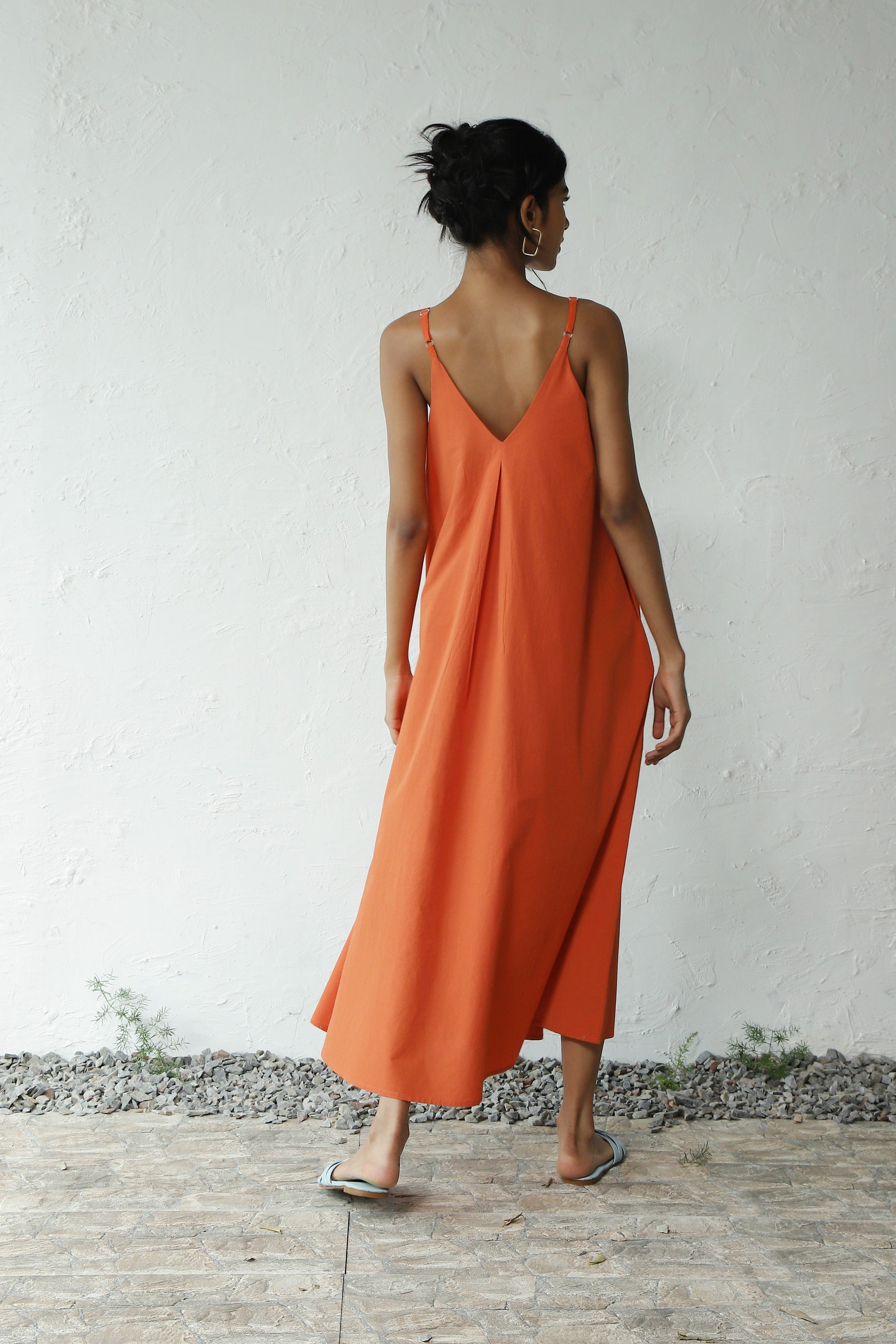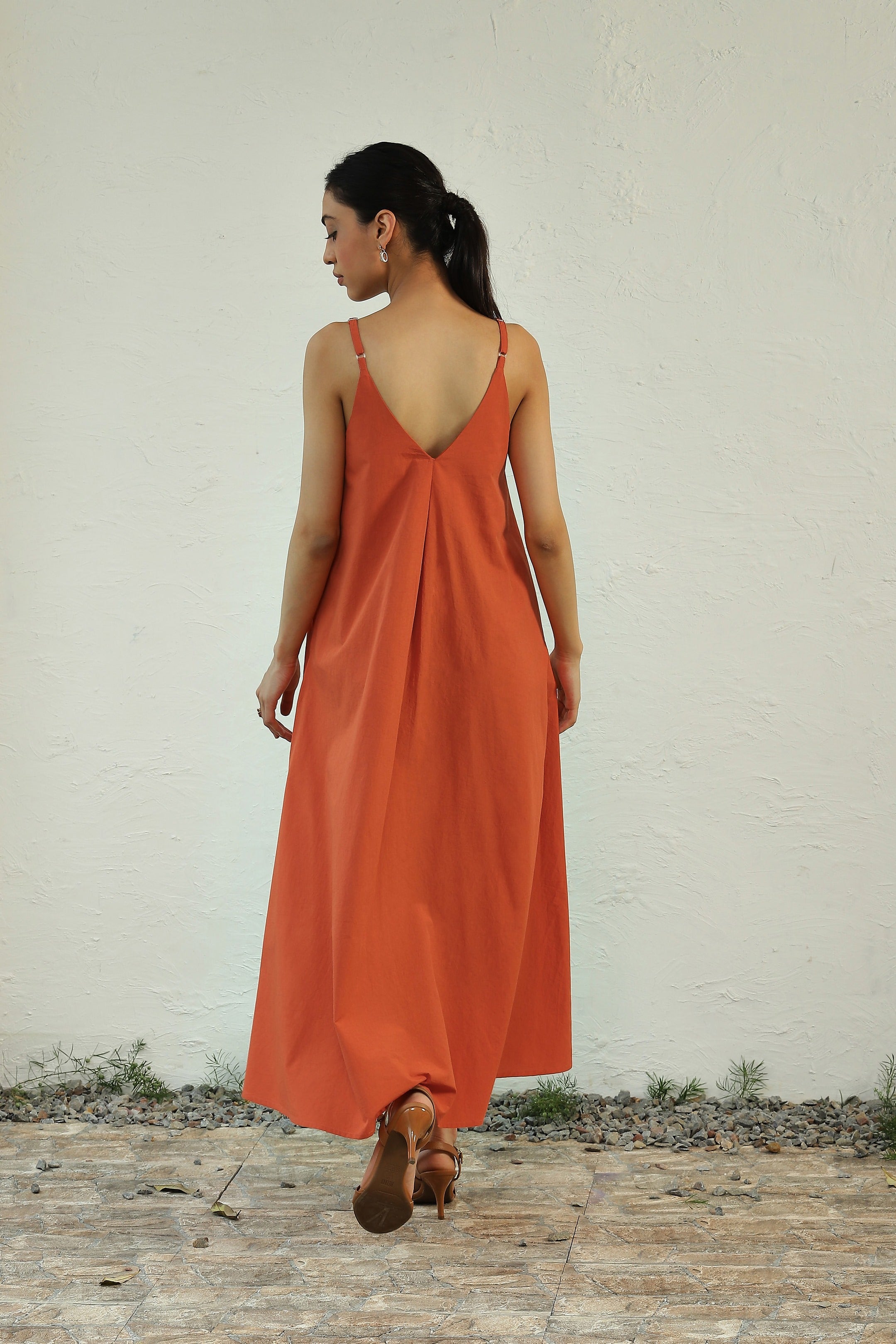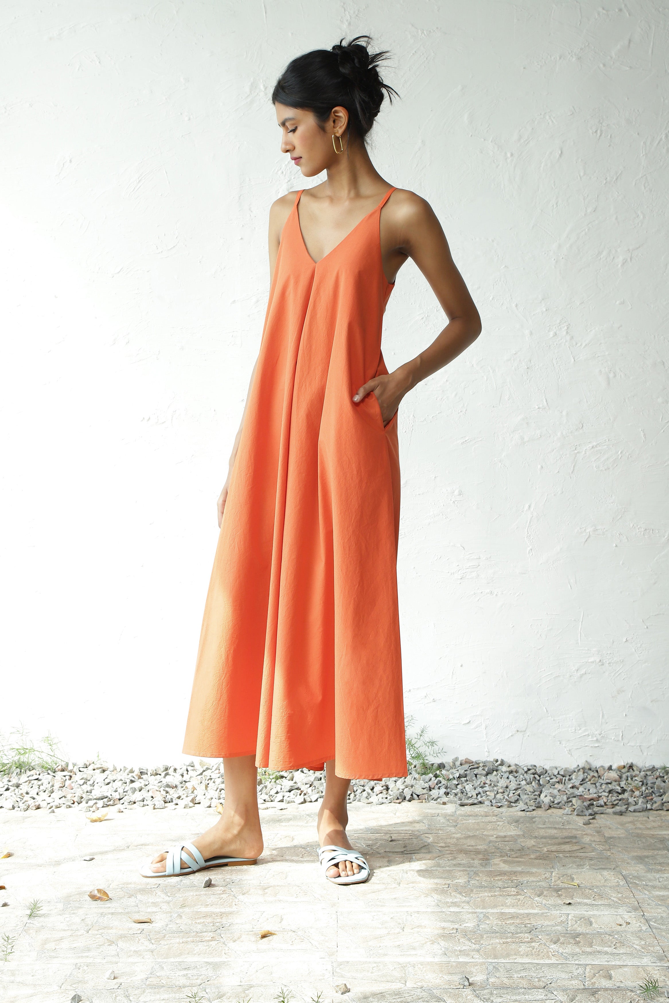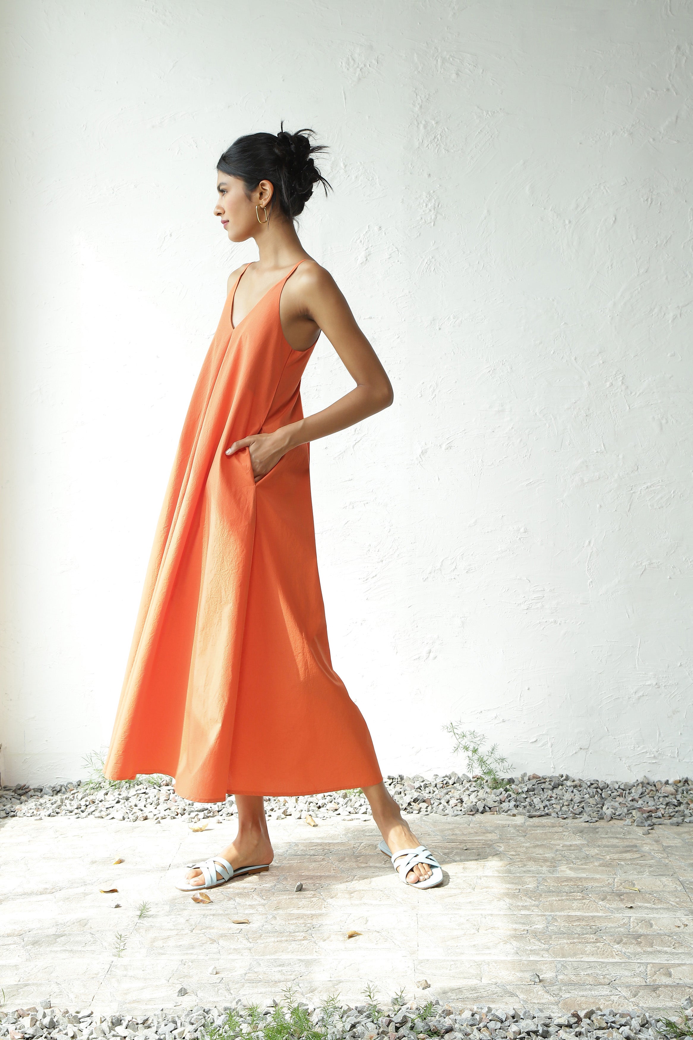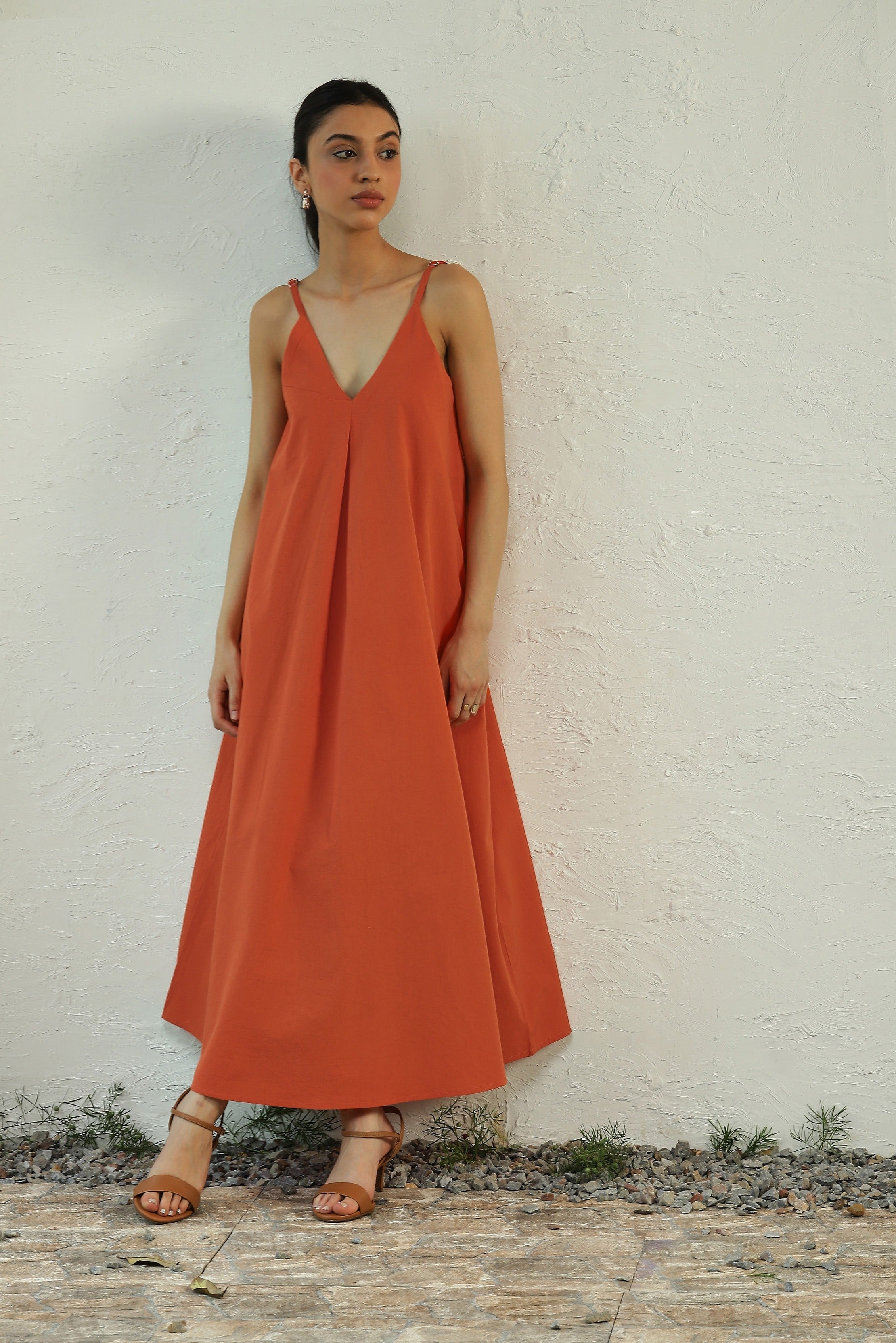 Classic and chic, this orange maxi dress is a piece you'll find yourself reaching for time and time again. Crafted in premium cotton fabric, its designed with slender shoulder straps, a V-neckline and has deep pleats that create a sense of volume and movement. Style with gold tone neckchain and earrings to flaunt a statement look.