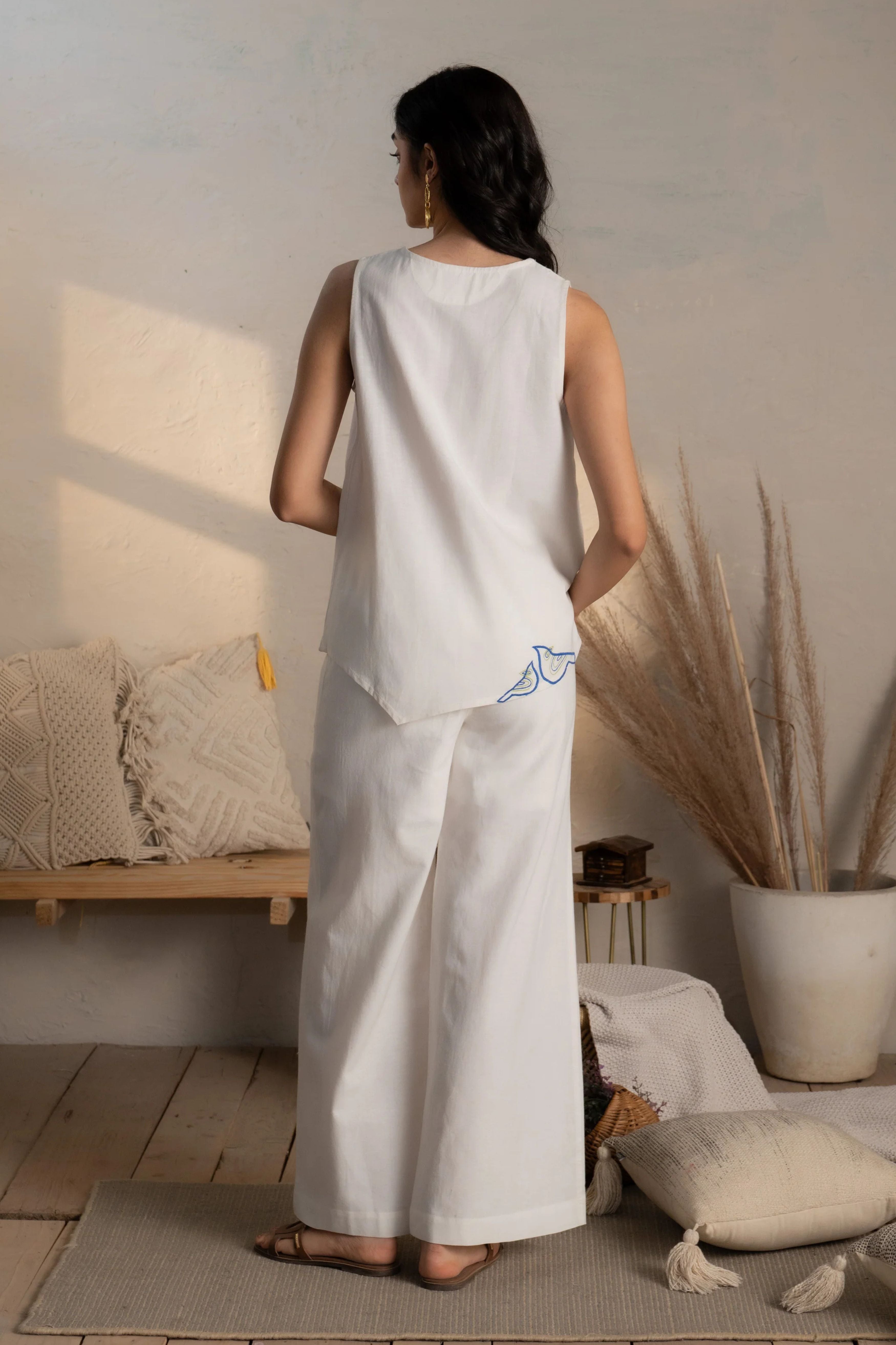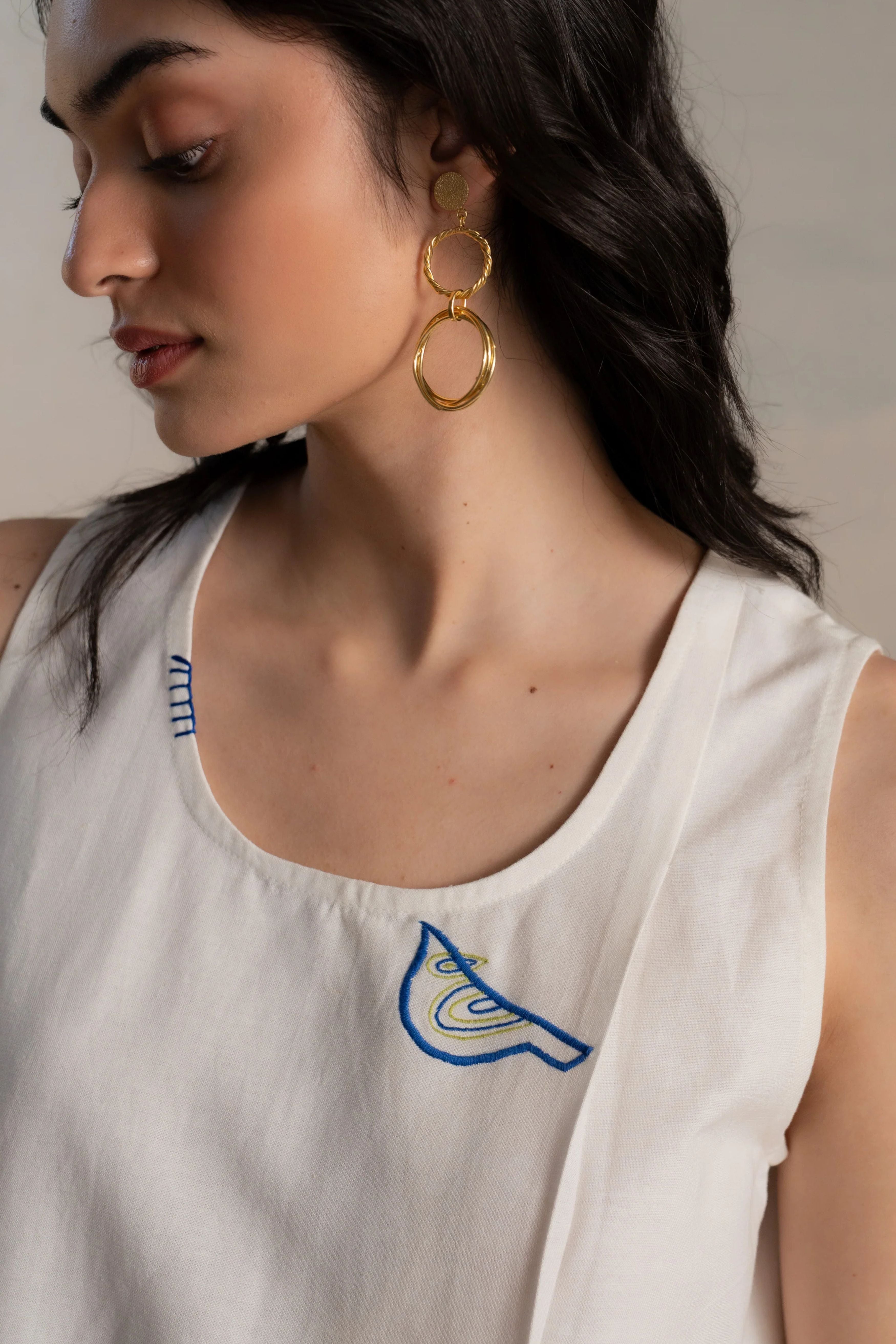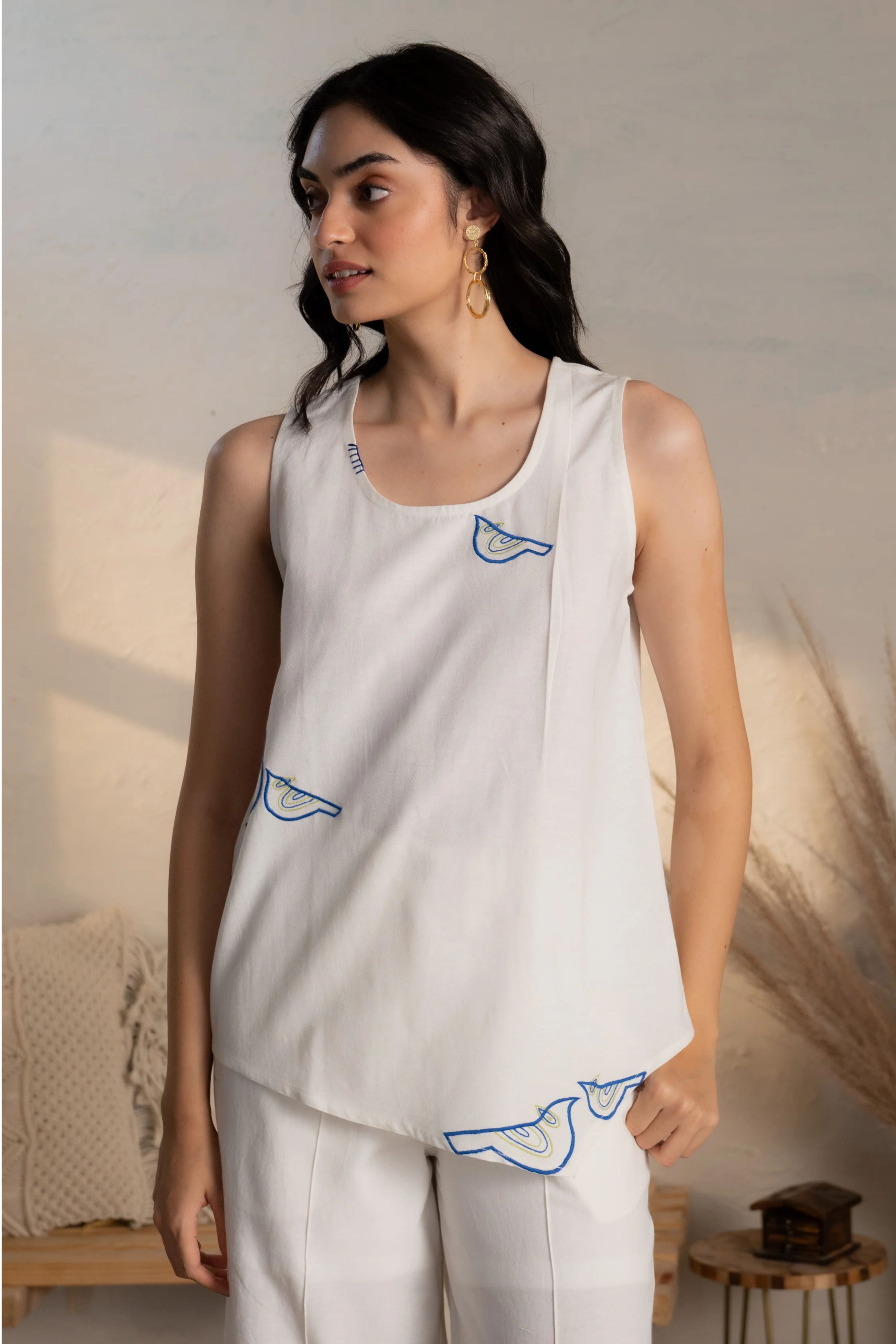 Reimagine your wardrobe with this tank top, where artistry meets contemporary design. Featuring diagonal pleat details, a chic asymmetrical hemline, and a hand-embroidered bird motif, this top is a modern take on natural elegance. Pair it with sleek trousers or a flowing skirt for a stylish statement.