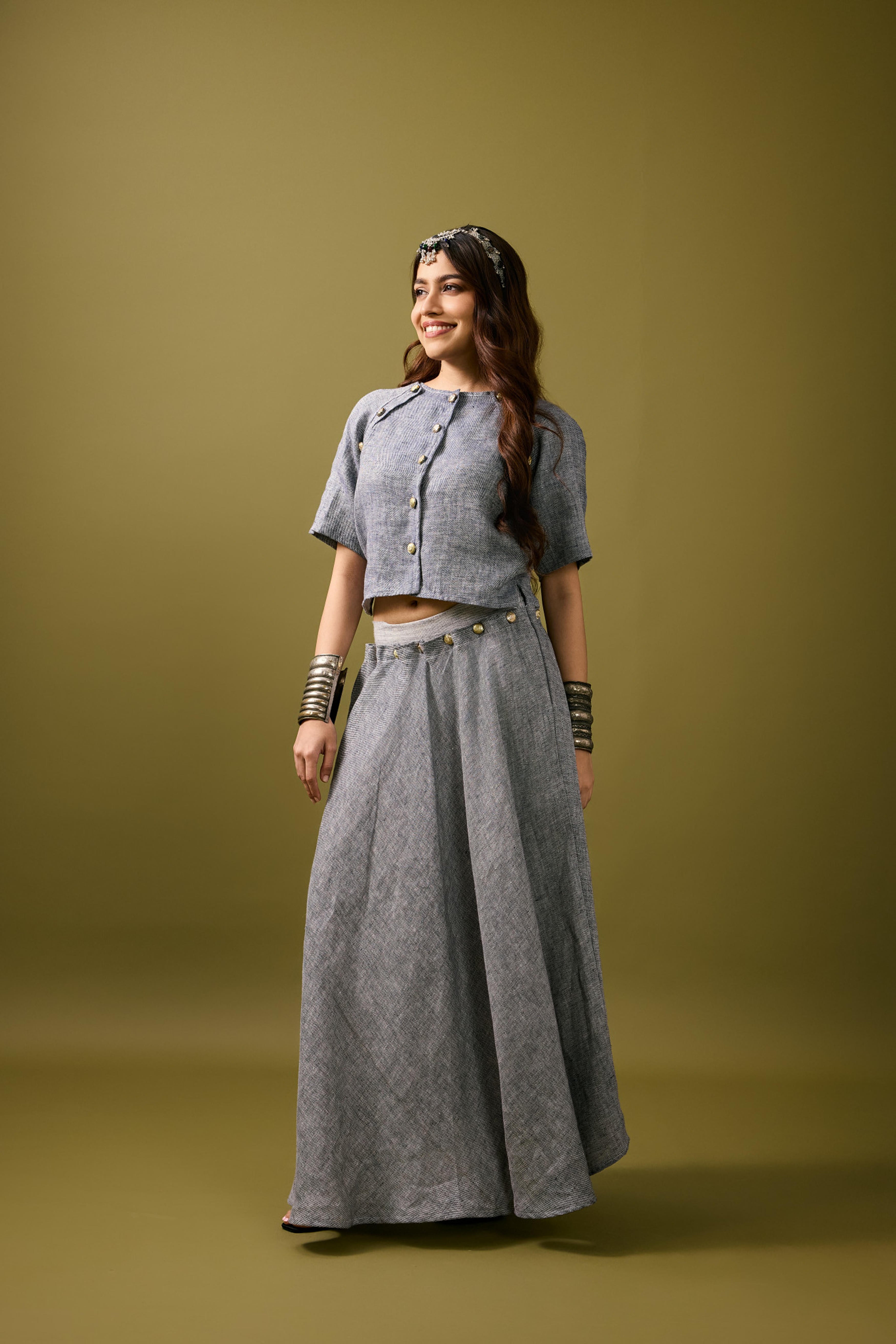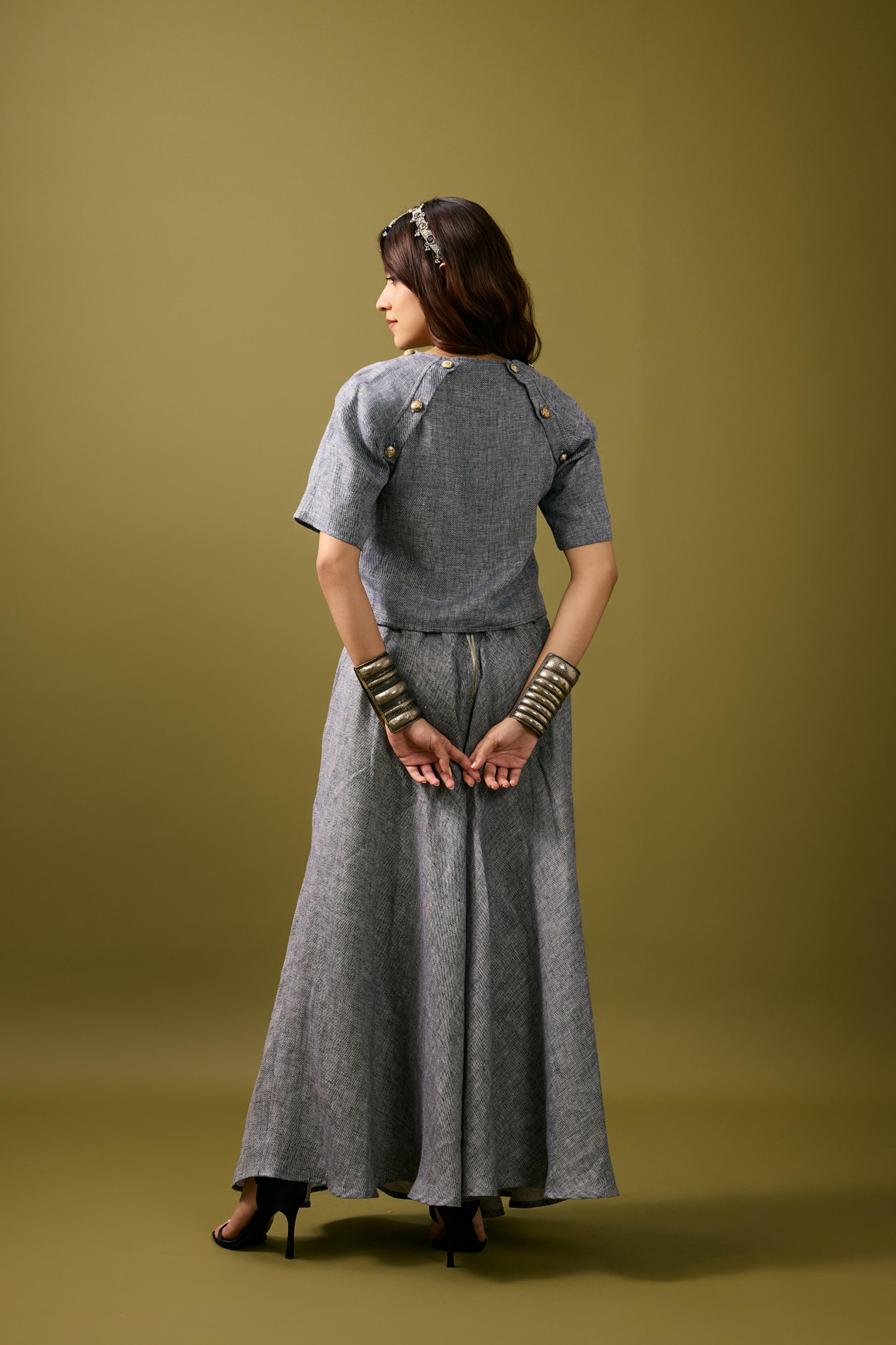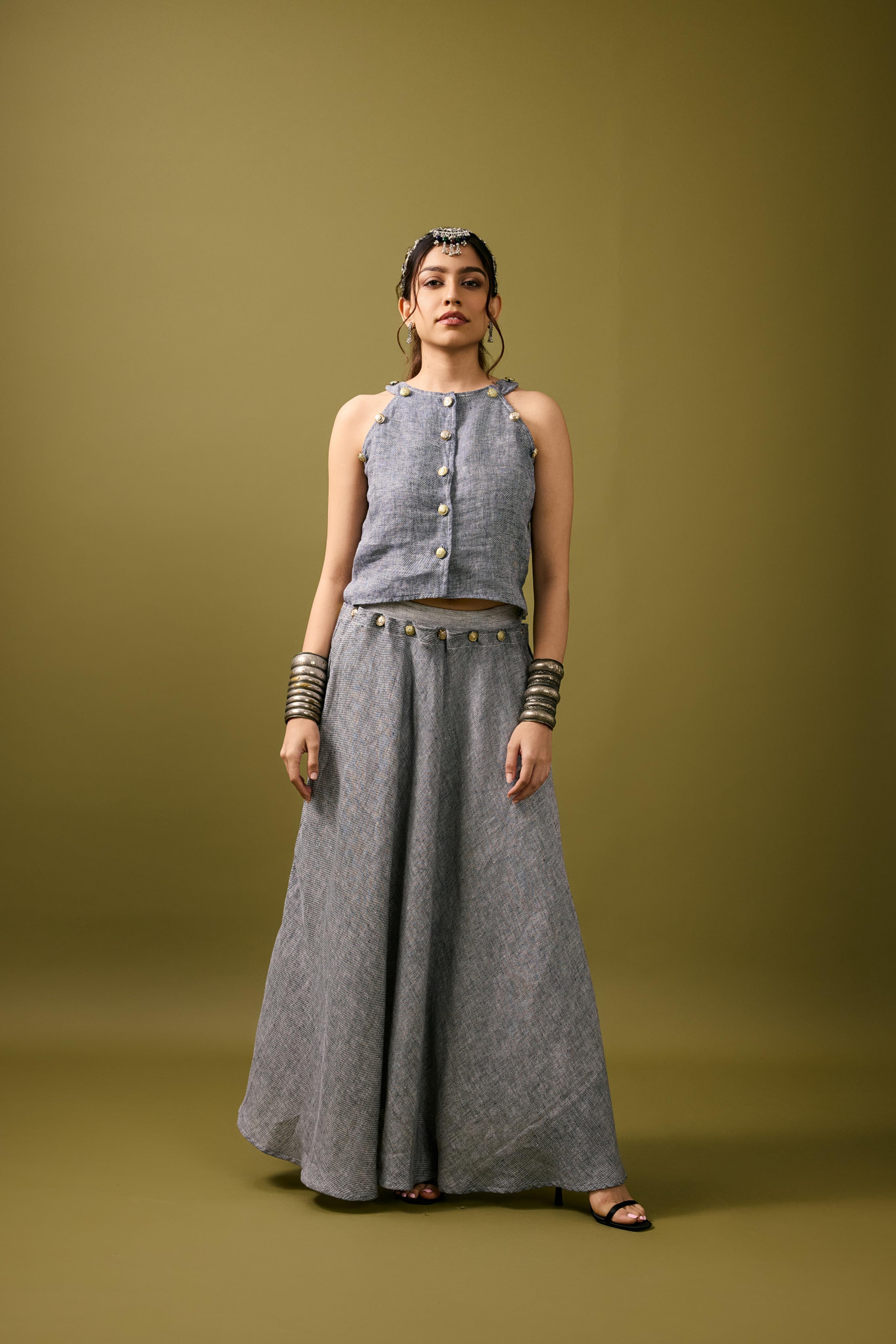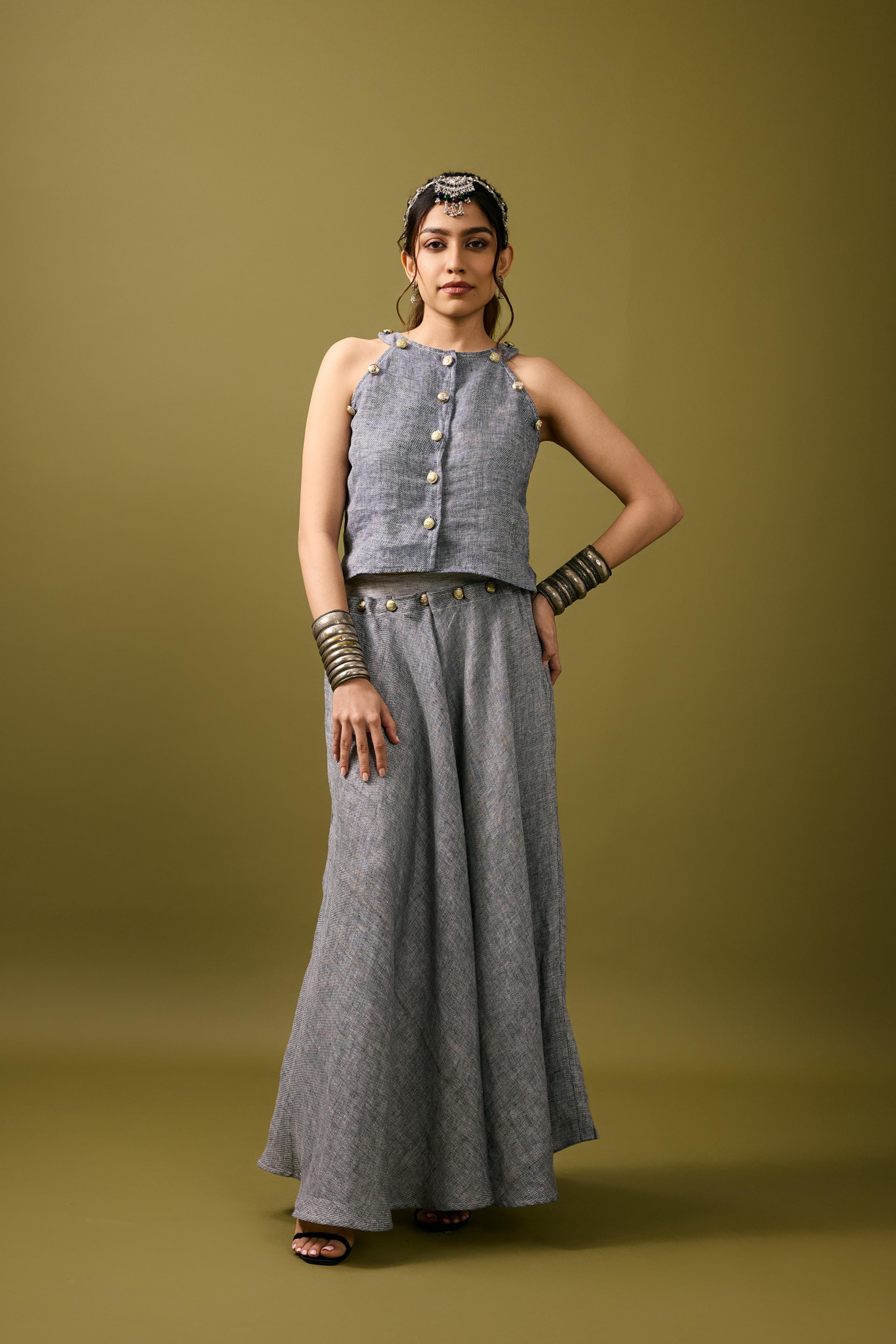 The Avni Set in Chambray is a versatile two-piece ensemble crafted in 100% pure linen with a chambray weave that creates a soft denim-like texture. Designed with functionality and elegance in mind, this set features a convertible top with detachable sleeves, allowing you to effortlessly switch between a sleeveless and short-sleeved look. The accompanying skirt is a full, bias-cut silhouette that drapes beautifully, offering both ease and sophistication. This set seamlessly blends contemporary tailoring with traditional detailing, making it adaptable for festive gatherings, weddings, or even modern everyday wear.