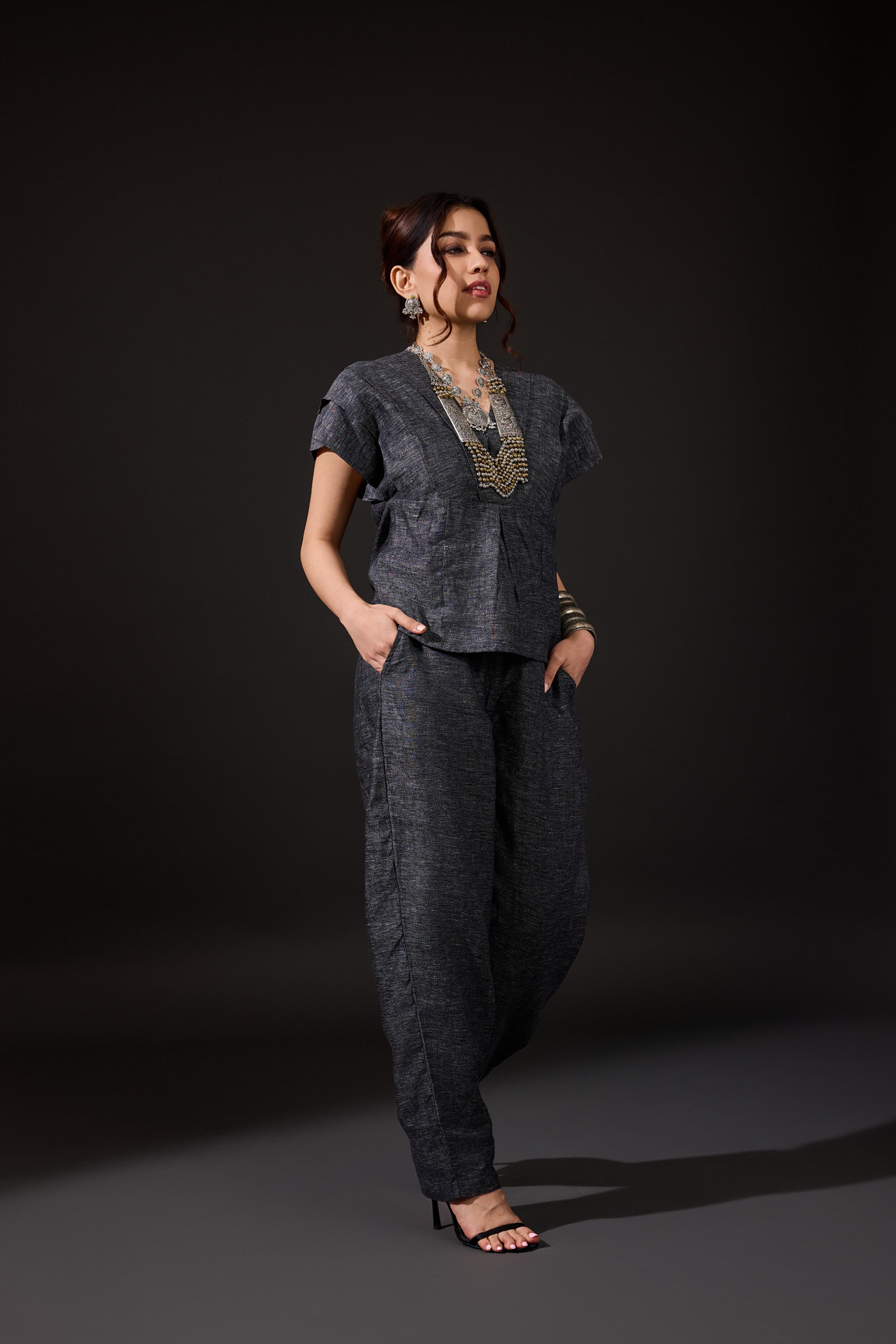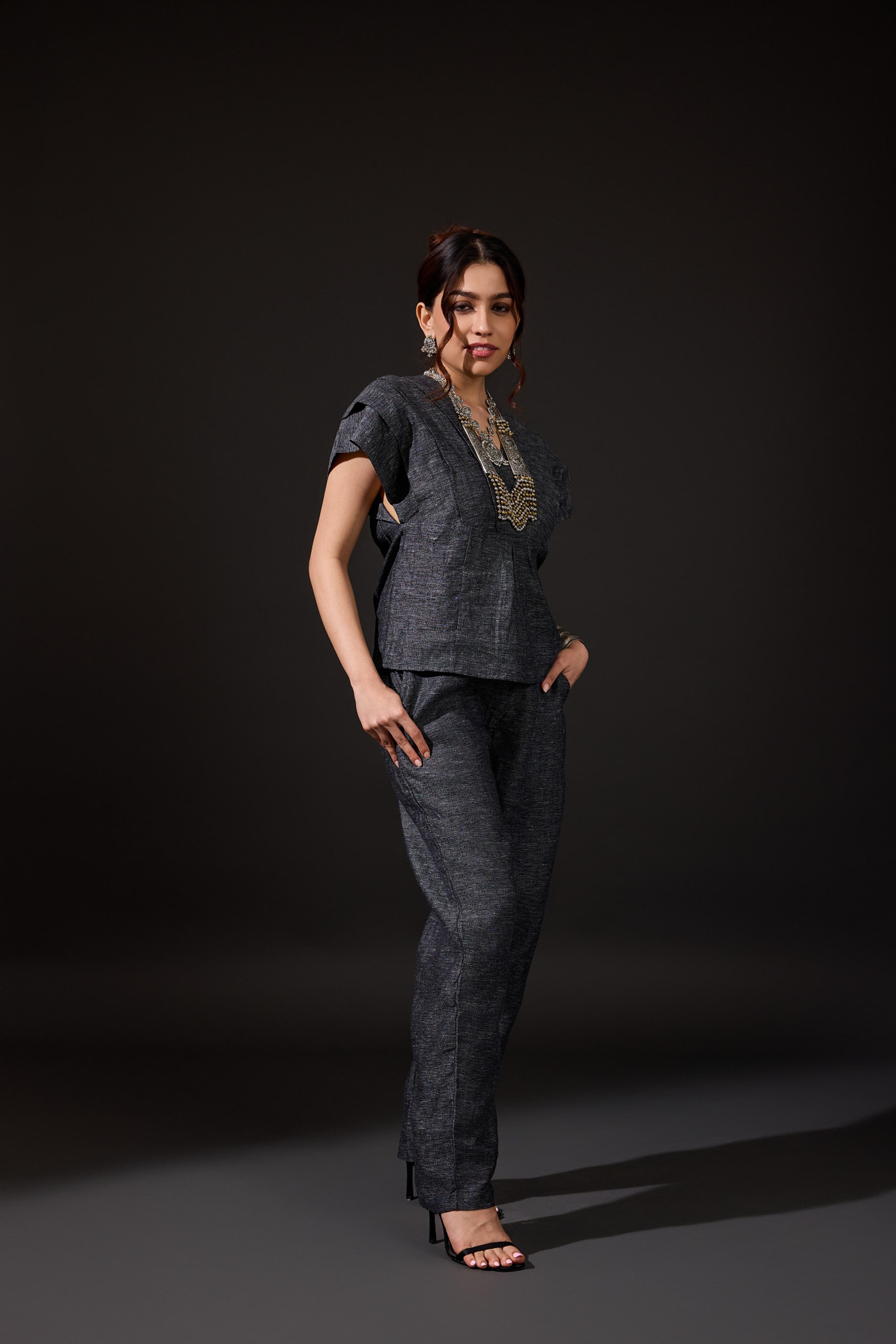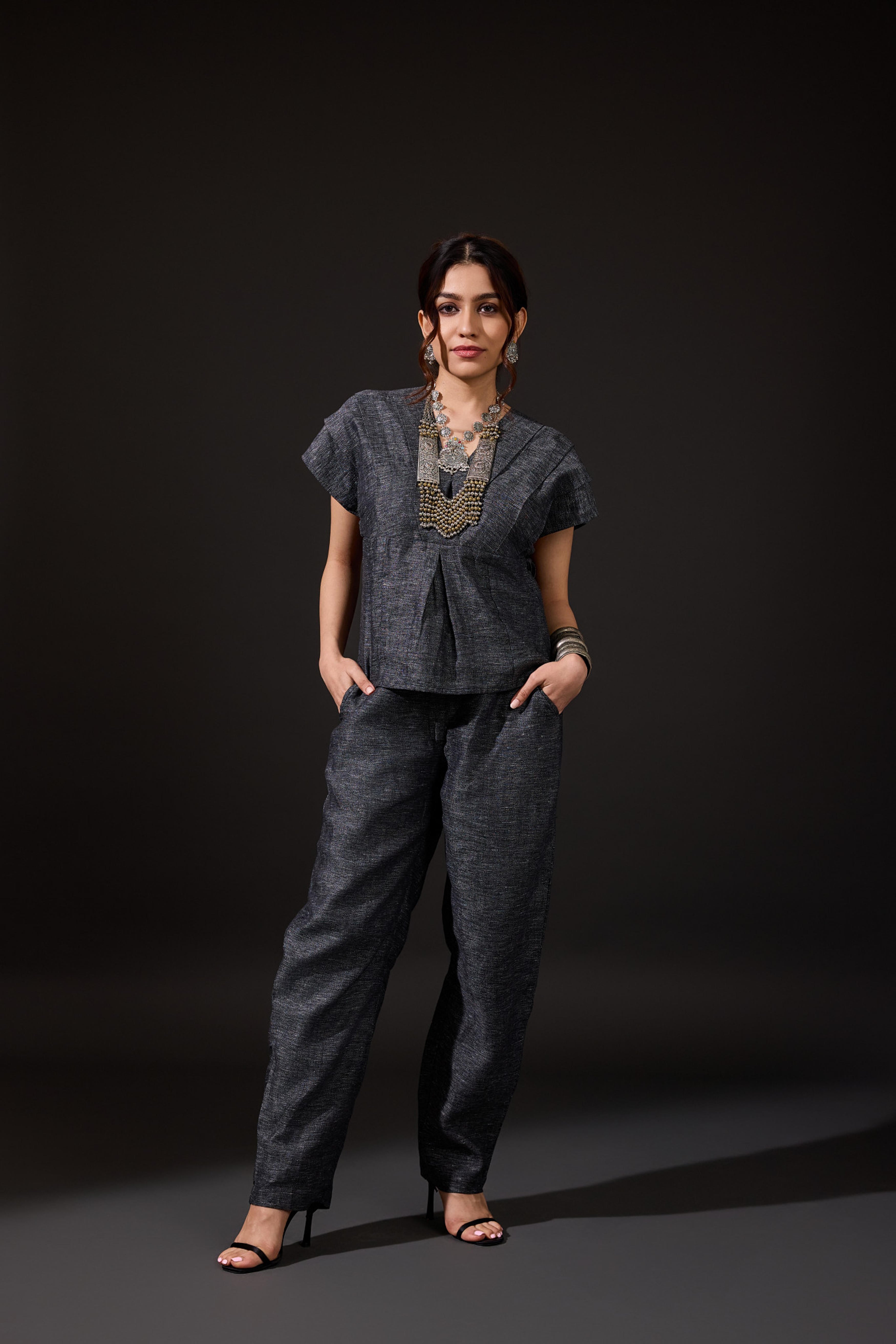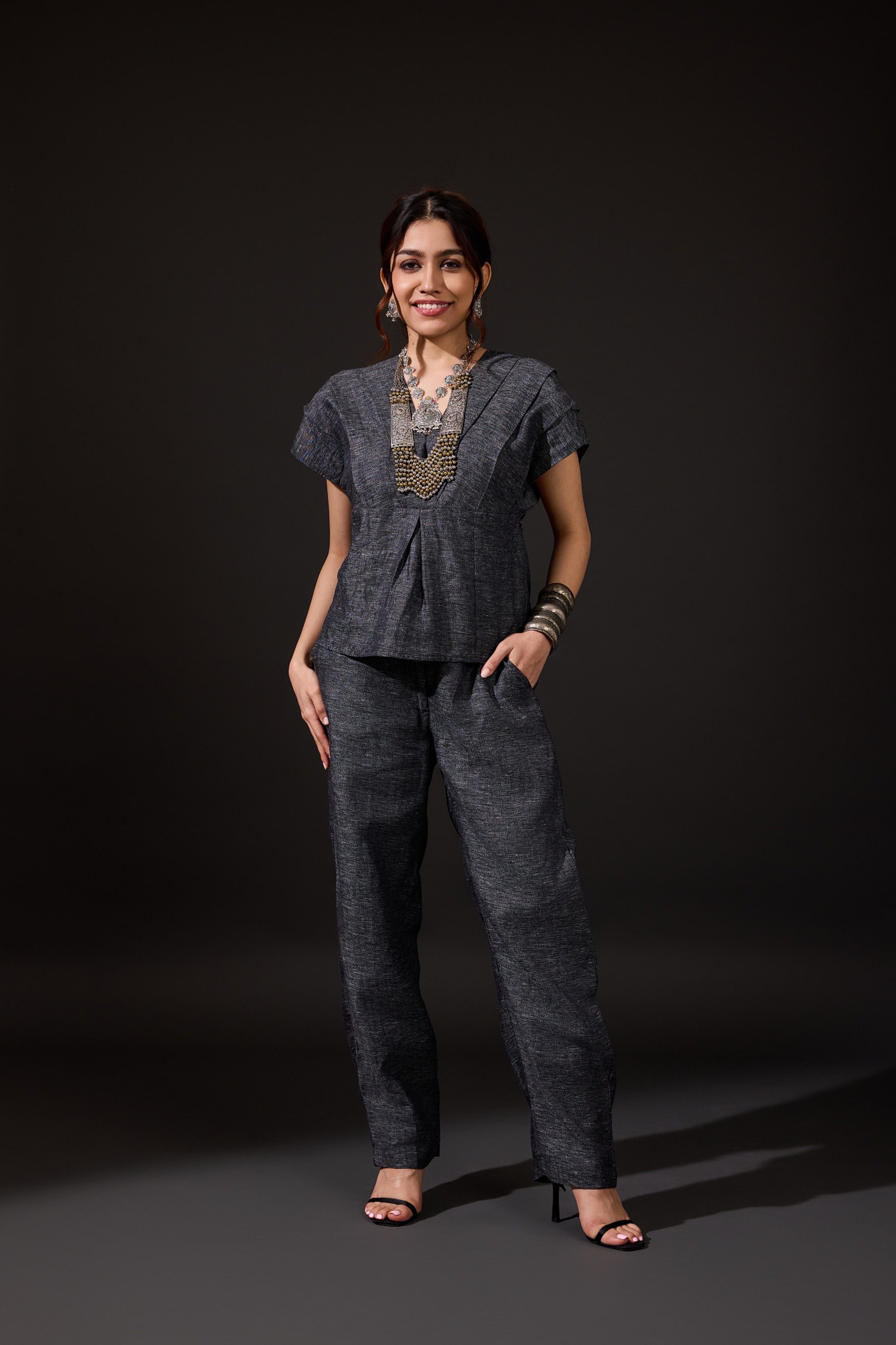 The Avni Set in Chambray is a versatile two-piece ensemble crafted in 100% pure linen with a chambray weave that creates a soft denim-like texture. Designed with functionality and elegance in mind, this set features a convertible top with detachable sleeves, allowing you to effortlessly switch between a sleeveless and short-sleeved look. The accompanying skirt is a full, bias-cut silhouette that drapes beautifully, offering both ease and sophistication. This set seamlessly blends contemporary tailoring with traditional detailing, making it adaptable for festive gatherings, weddings, or even modern everyday wear.