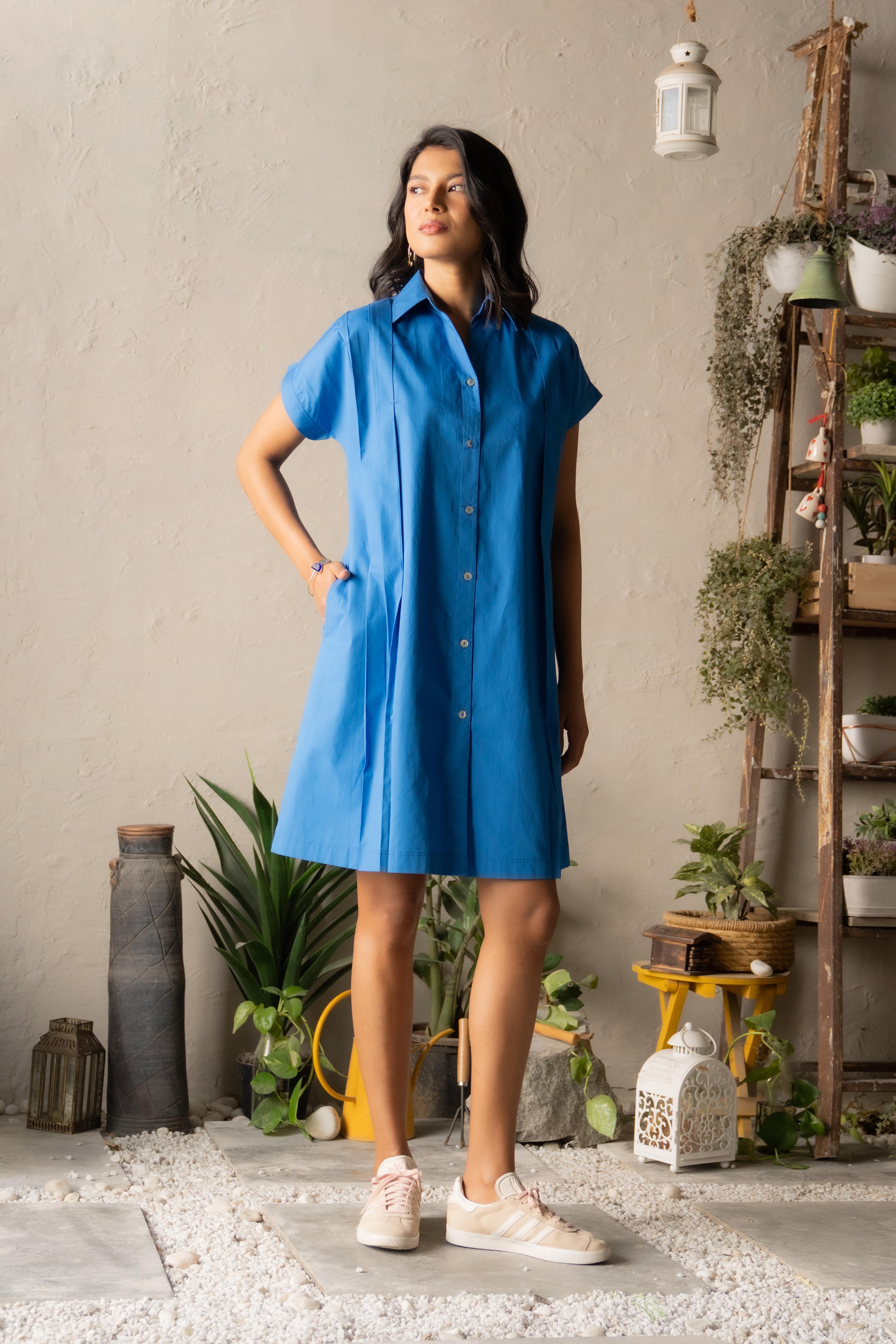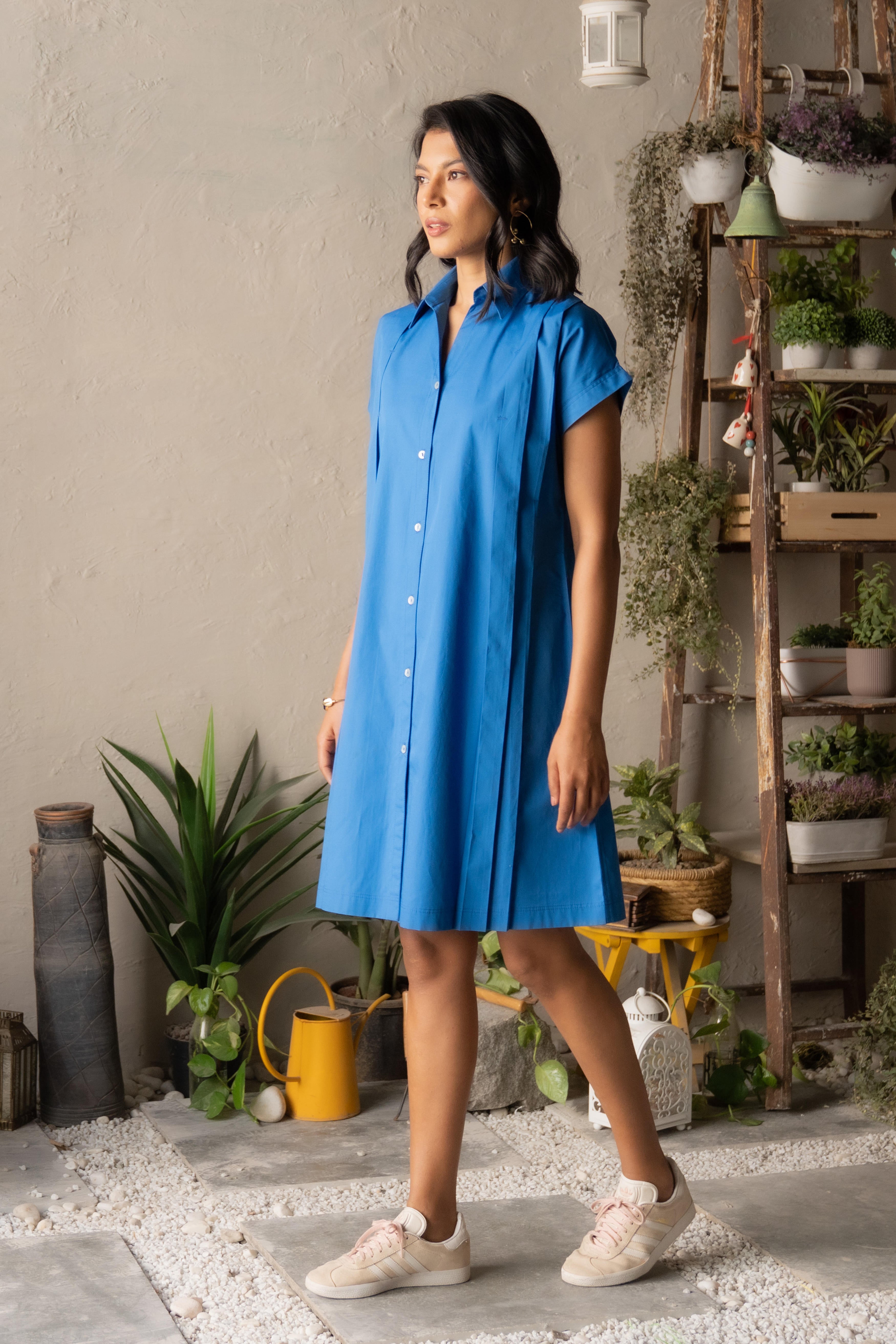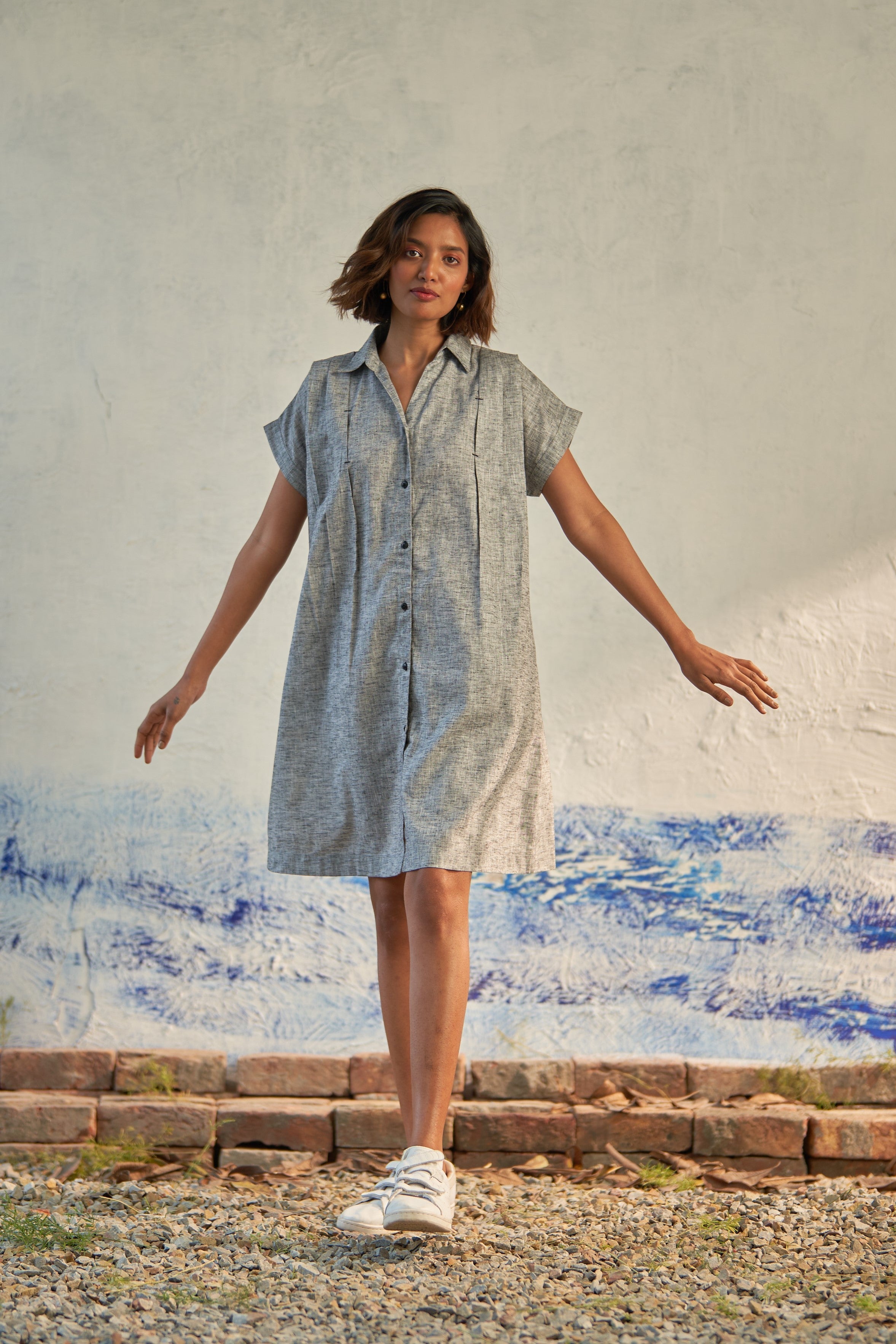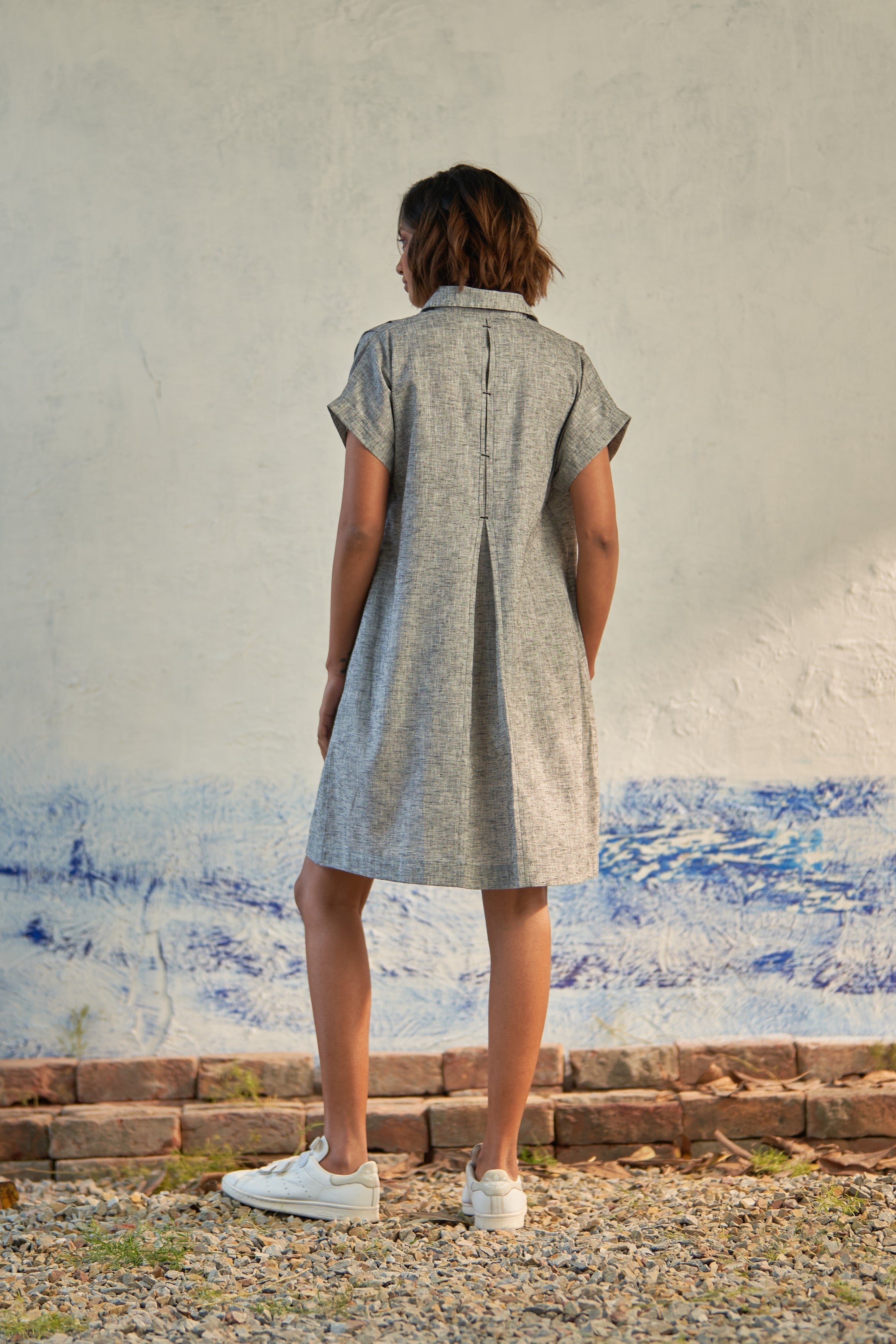 Fashioned from textured cotton, this front-button mini dress exudes understated elegance. Featuring a collared neckline and relaxed half sleeves, it's designed with an A-line hem and enhanced with deep box pleats in the front and back for added movement and flair. Take note of the black darts, which contribute to a graceful silhouette while holding the pleats in place.