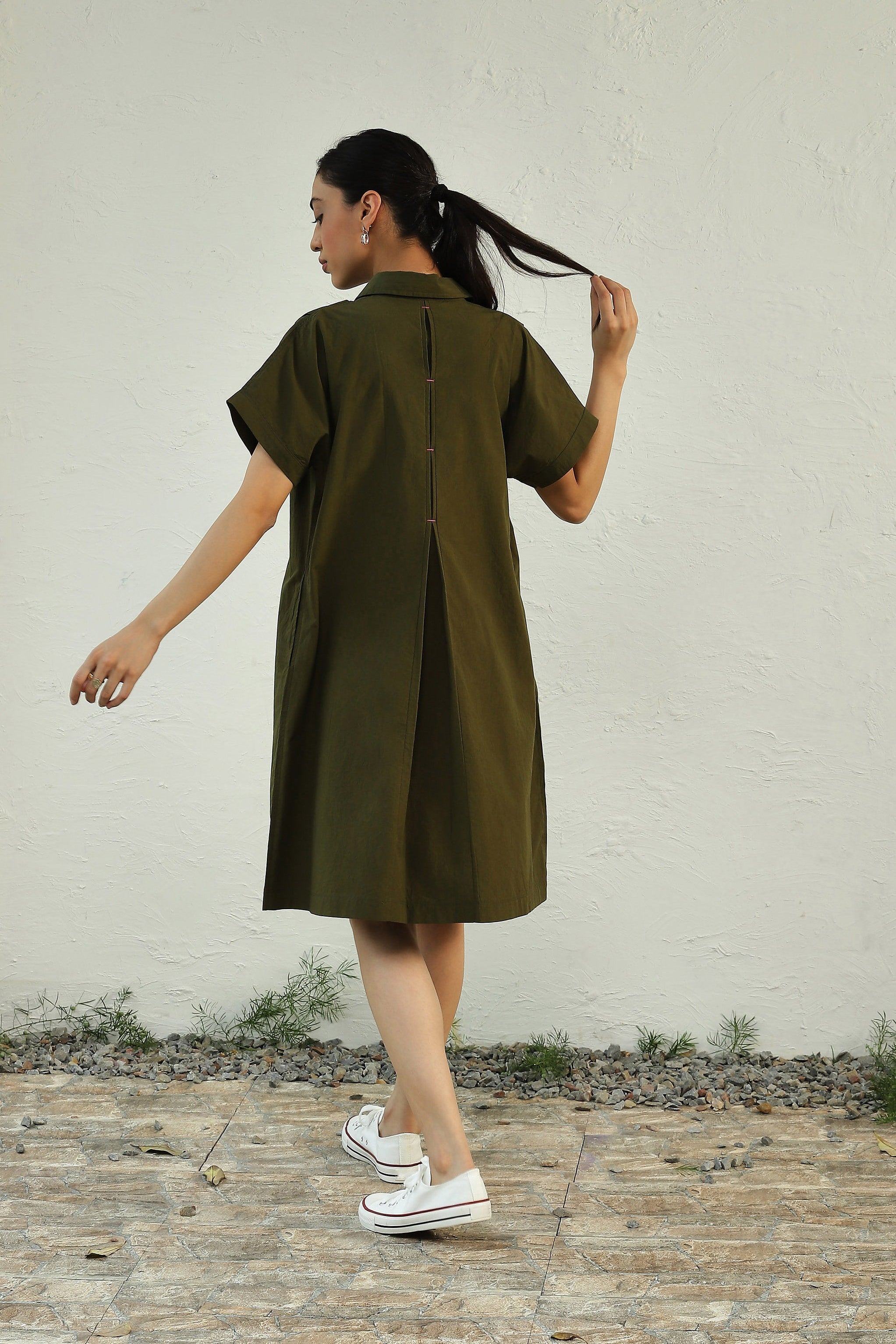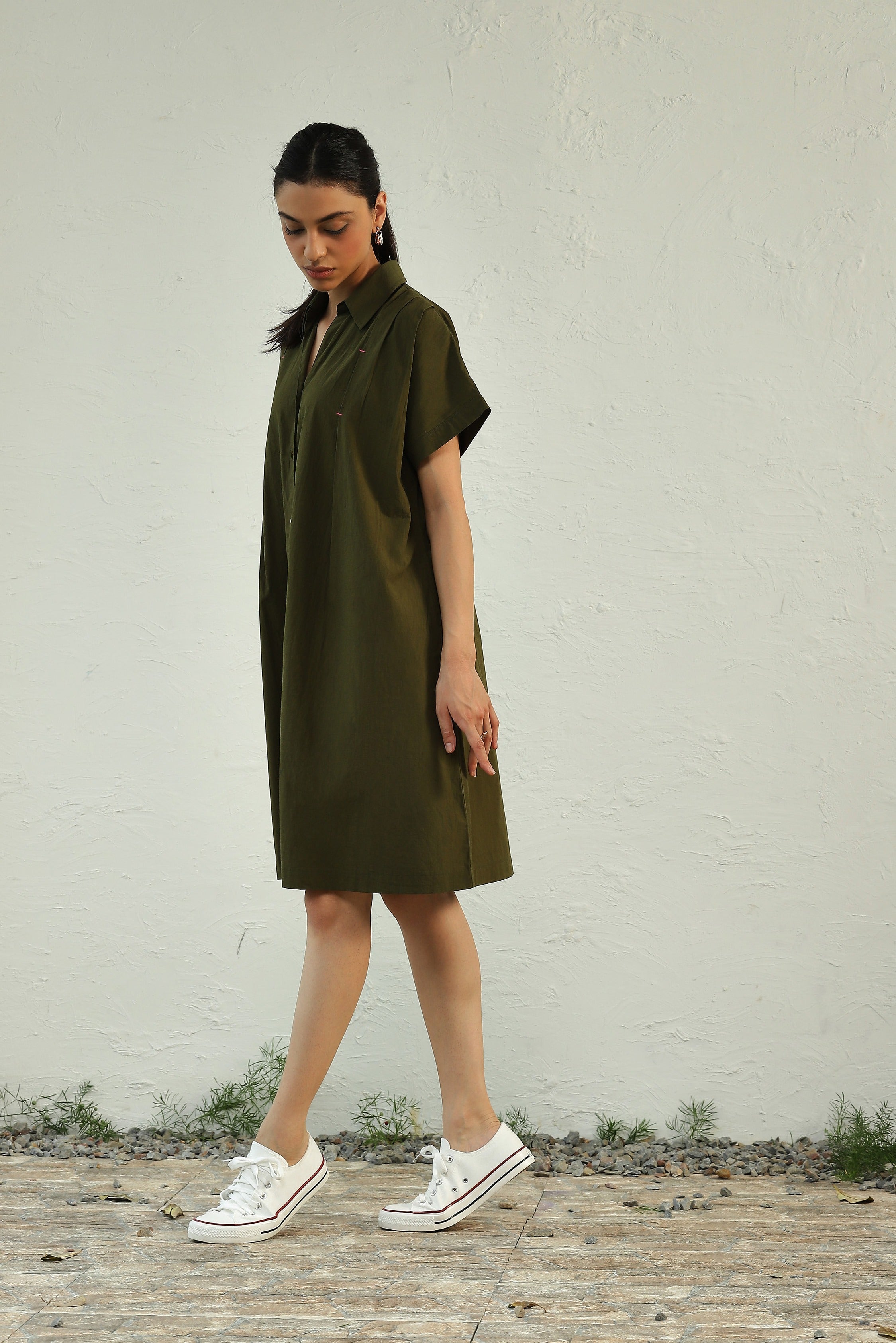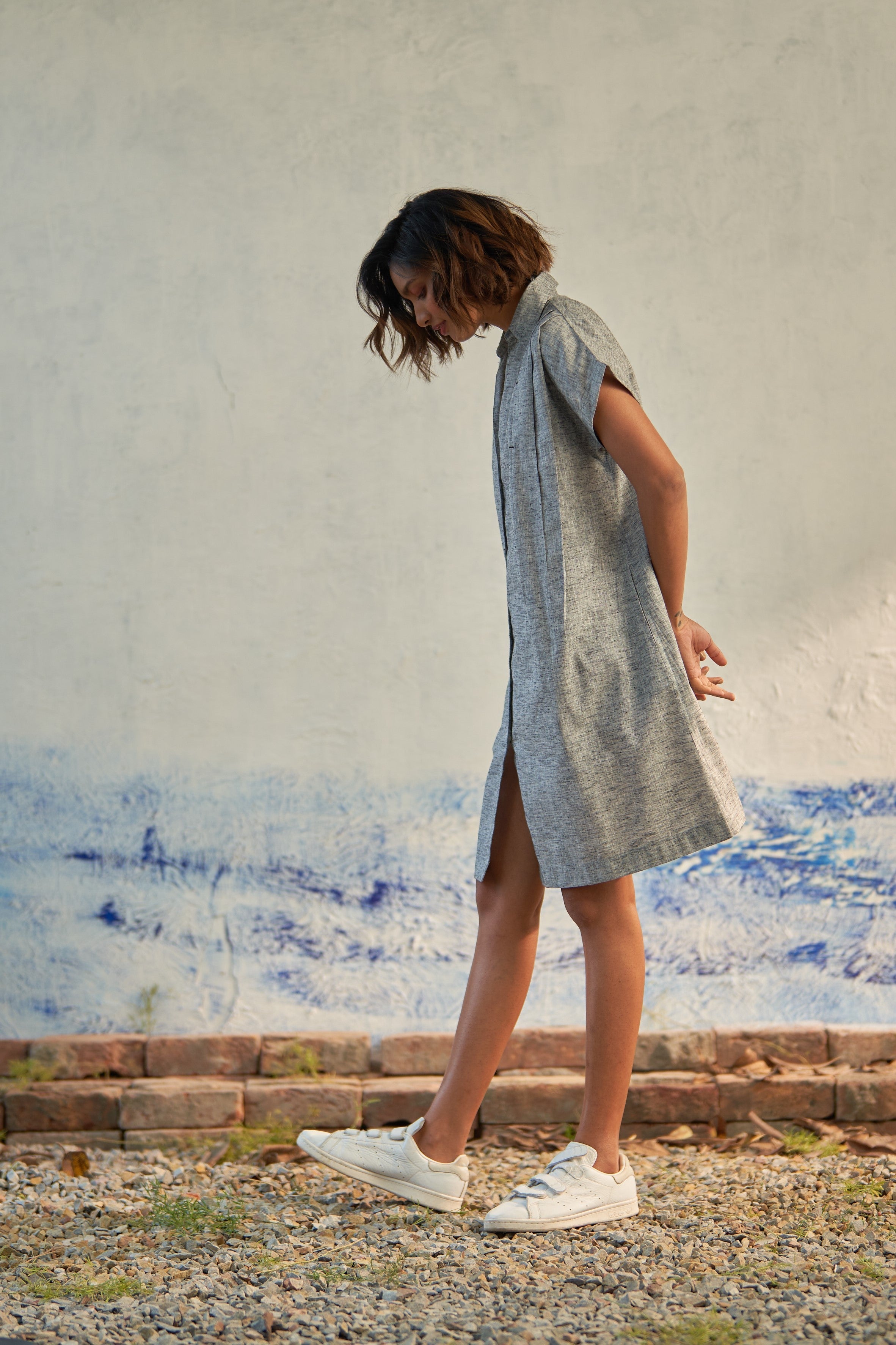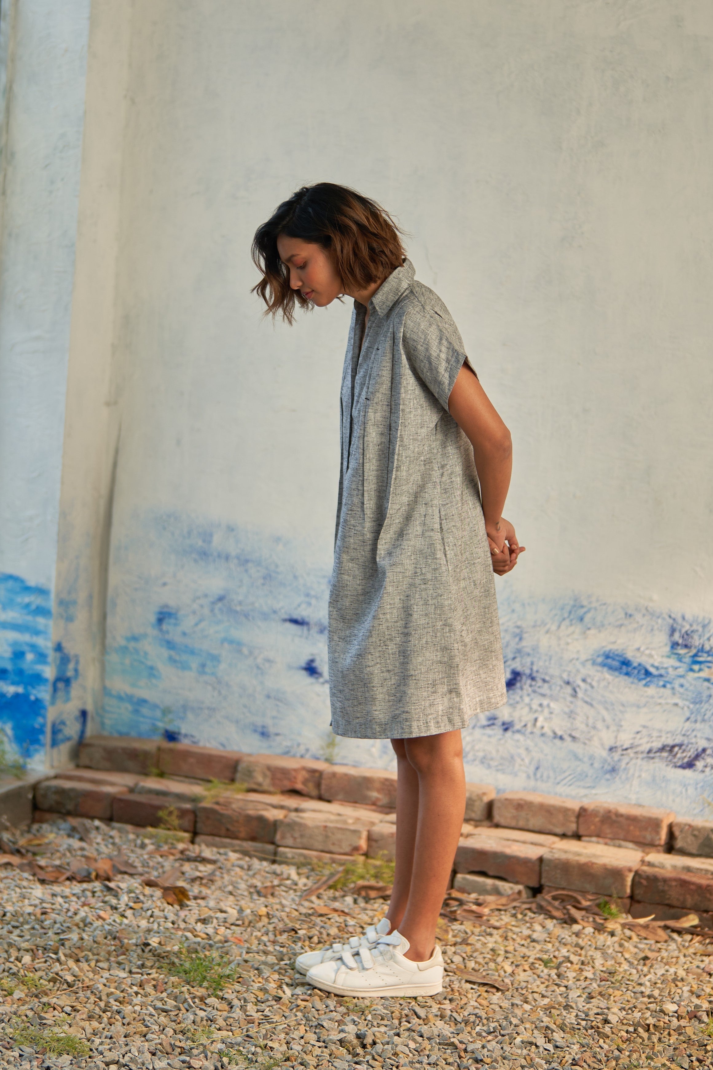 Fashioned from textured cotton, this front-button mini dress exudes understated elegance. Featuring a collared neckline and relaxed half sleeves, it's designed with an A-line hem and enhanced with deep box pleats in the front and back for added movement and flair. Take note of the black darts, which contribute to a graceful silhouette while holding the pleats in place.