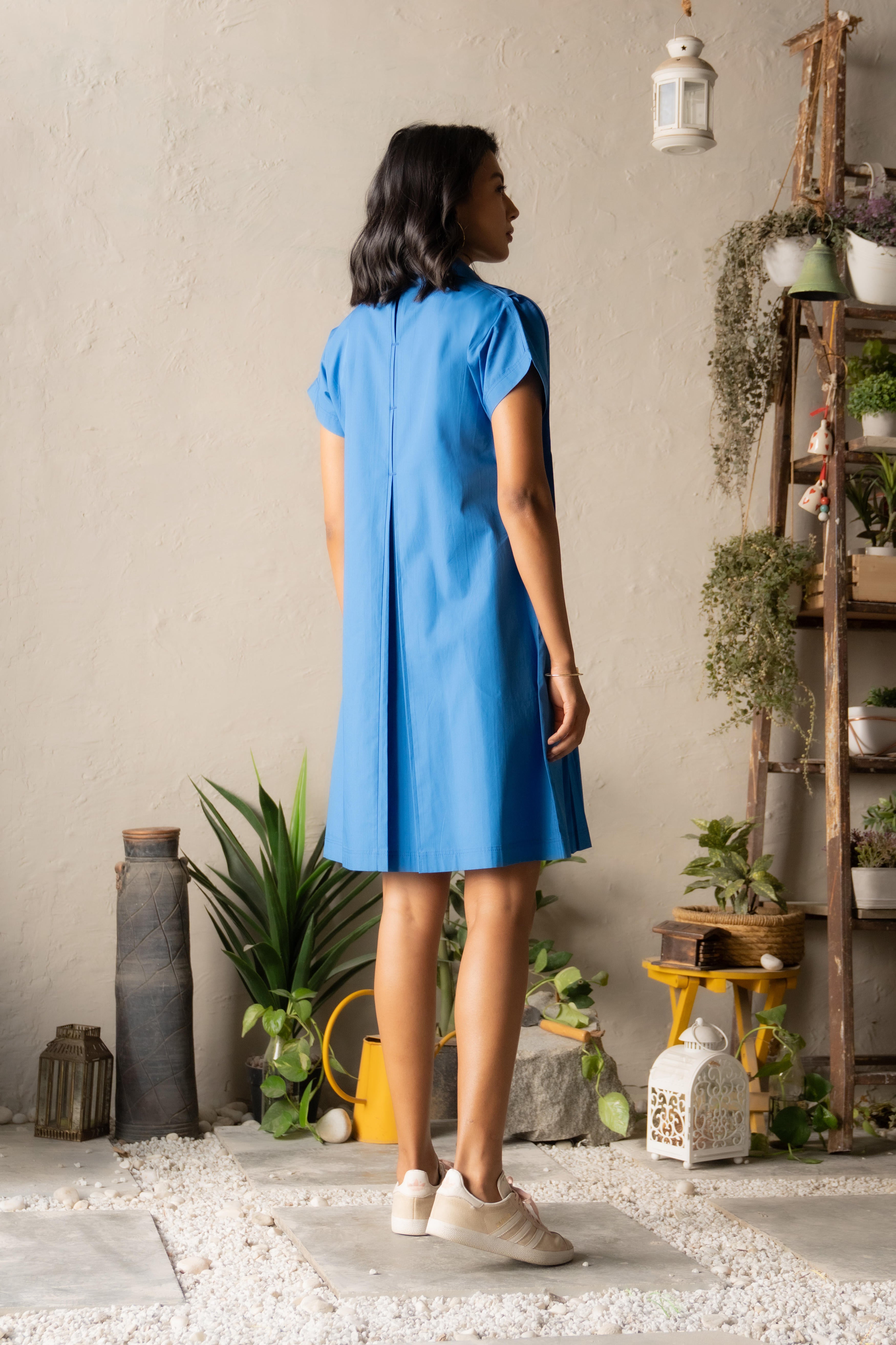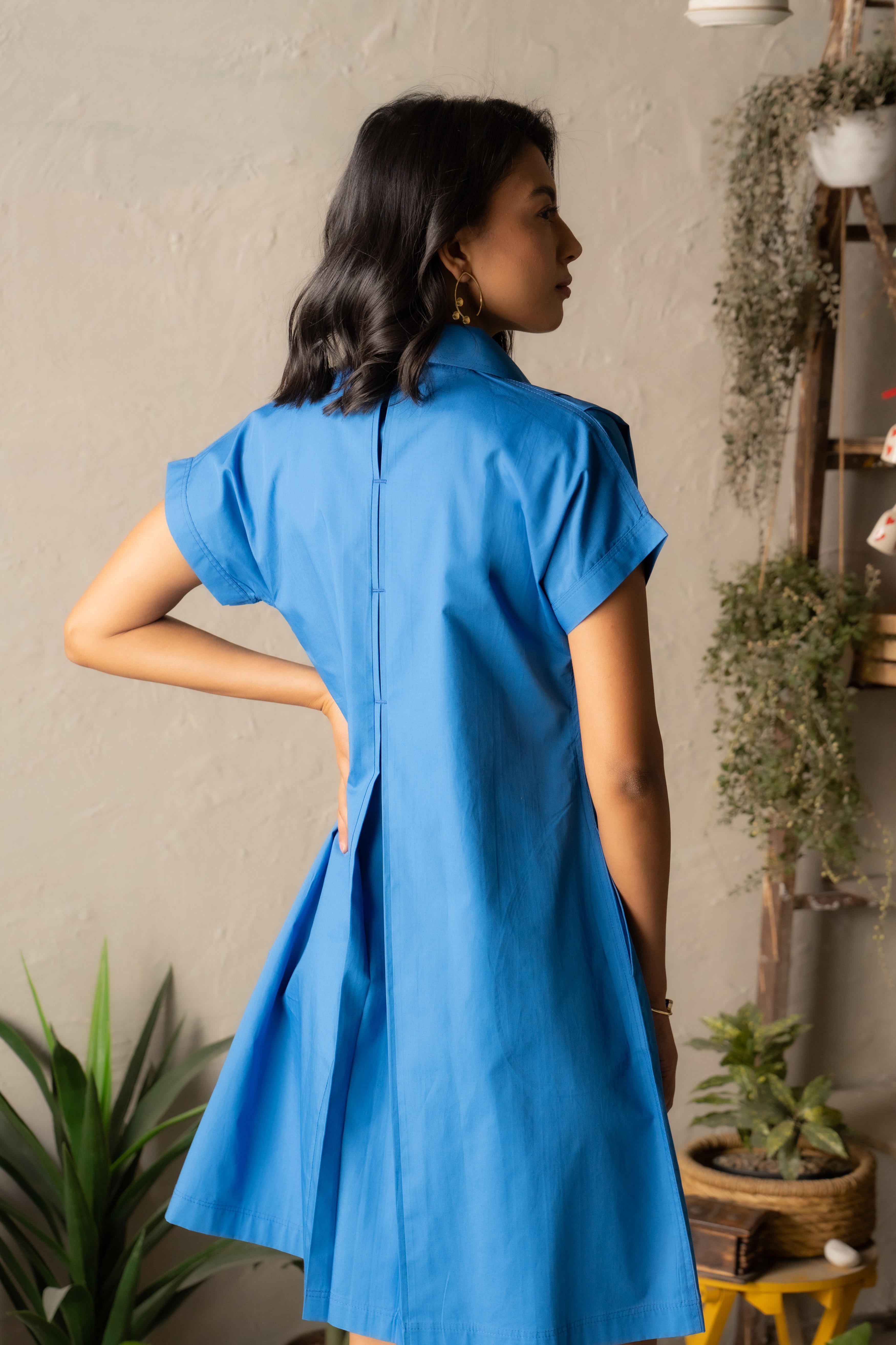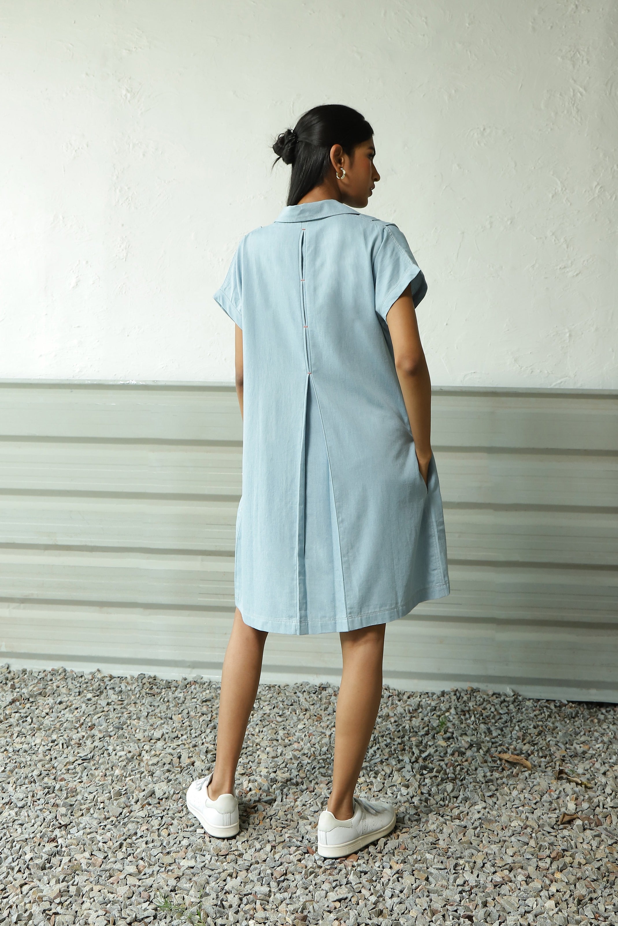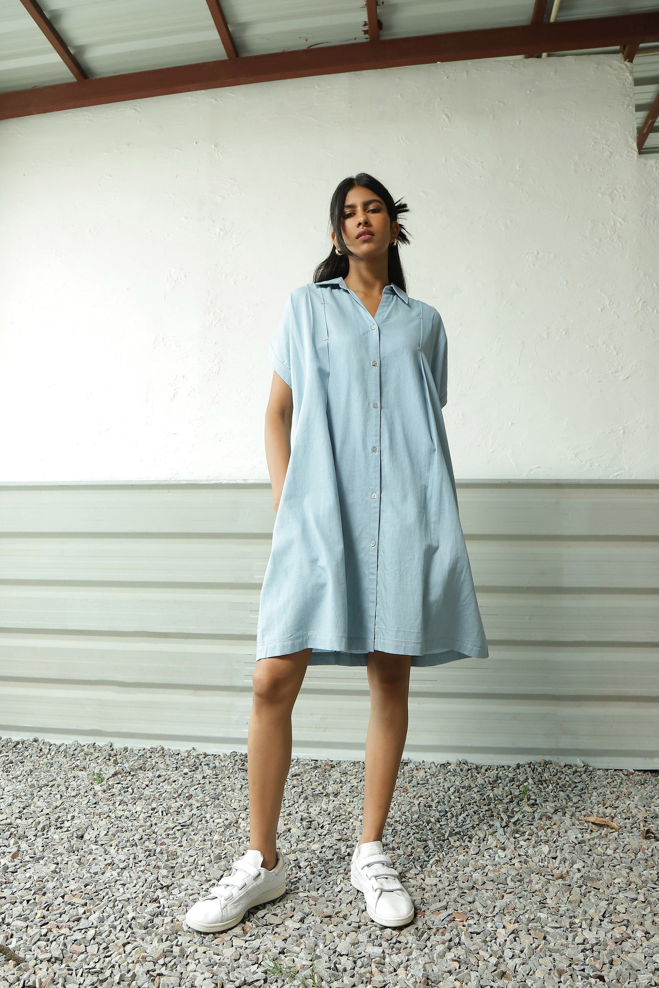 Fashioned from textured cotton, this front-button mini dress exudes understated elegance. Featuring a collared neckline and relaxed half sleeves, it's designed with an A-line hem and enhanced with deep box pleats in the front and back for added movement and flair. Take note of the black darts, which contribute to a graceful silhouette while holding the pleats in place.