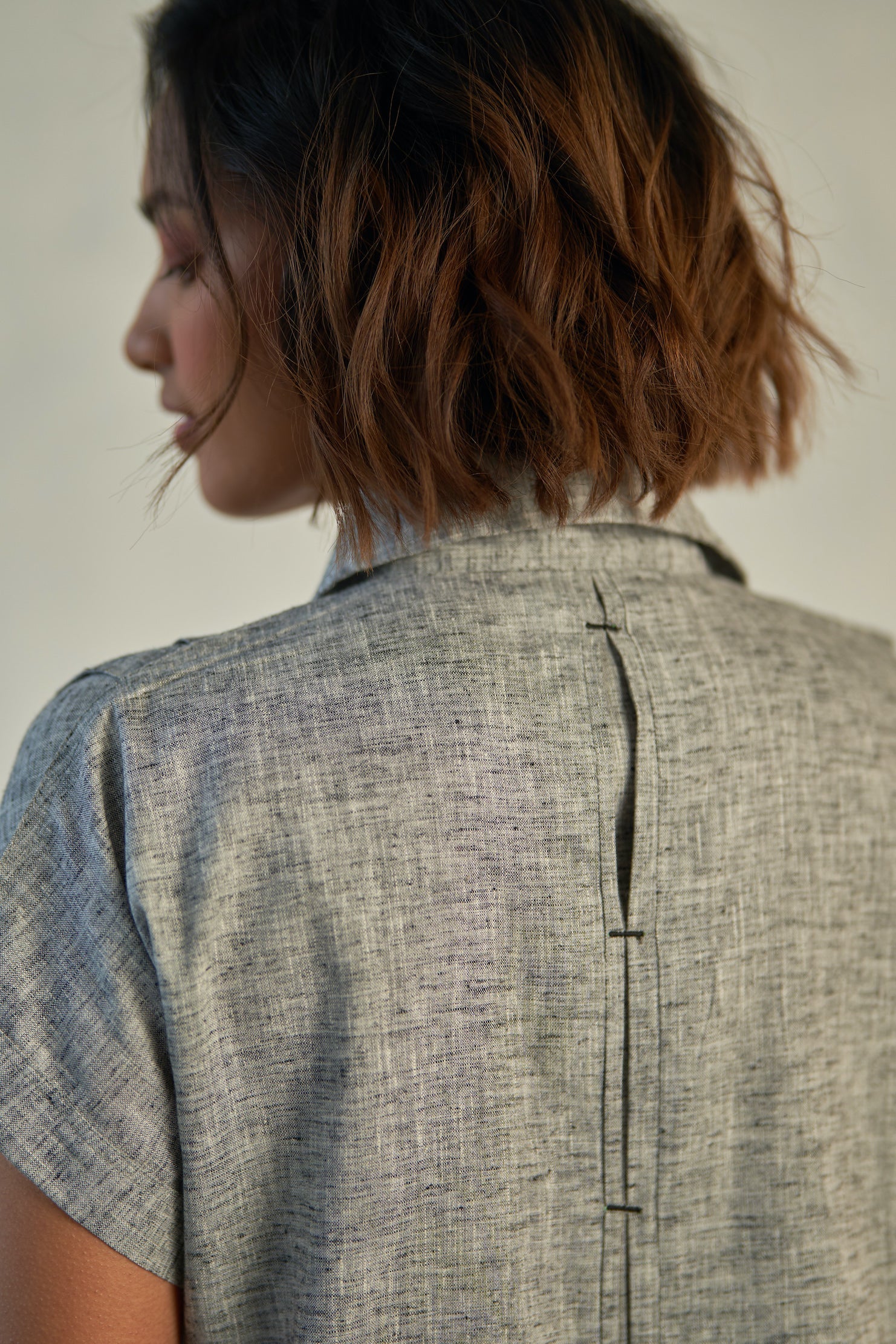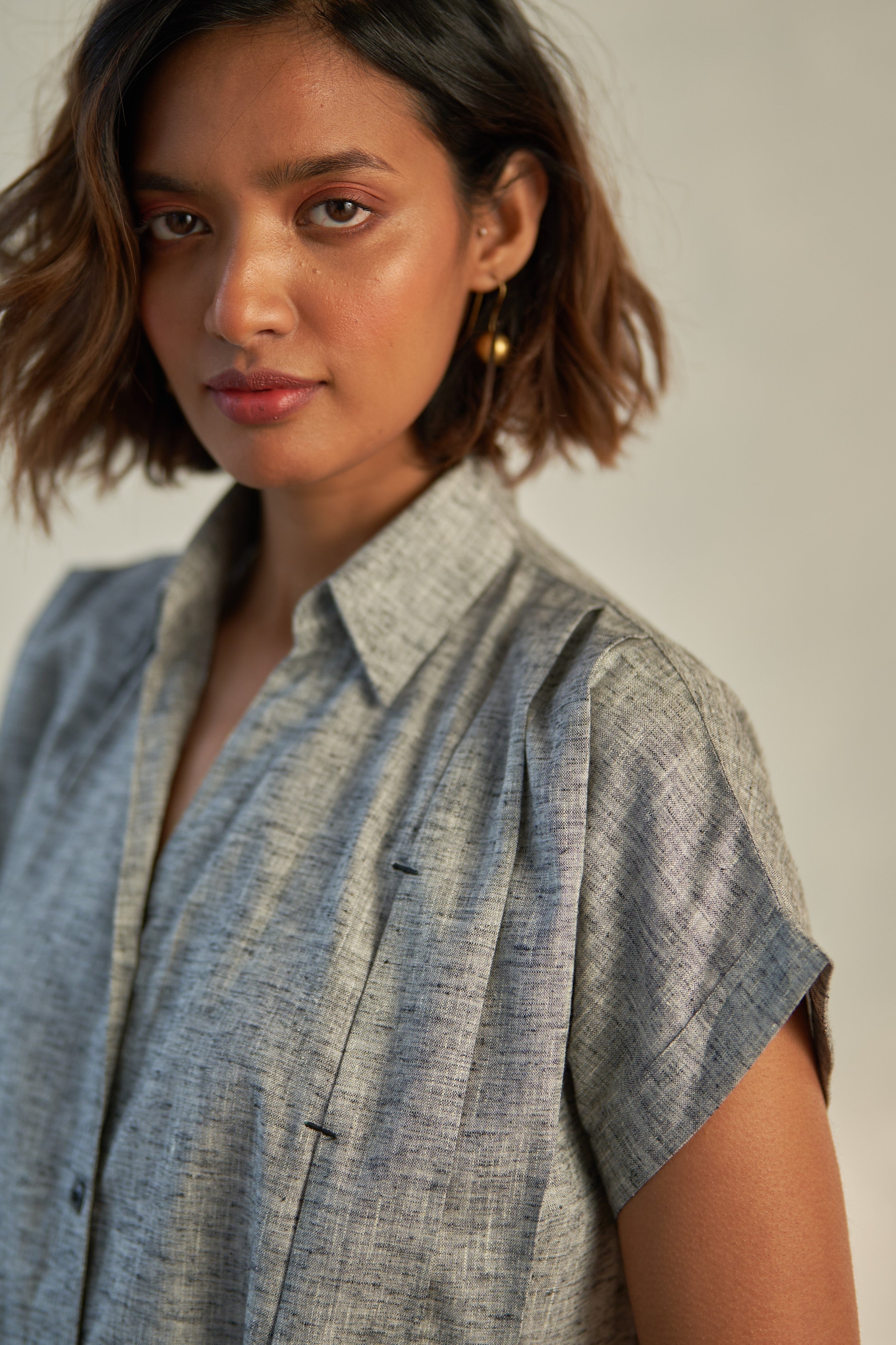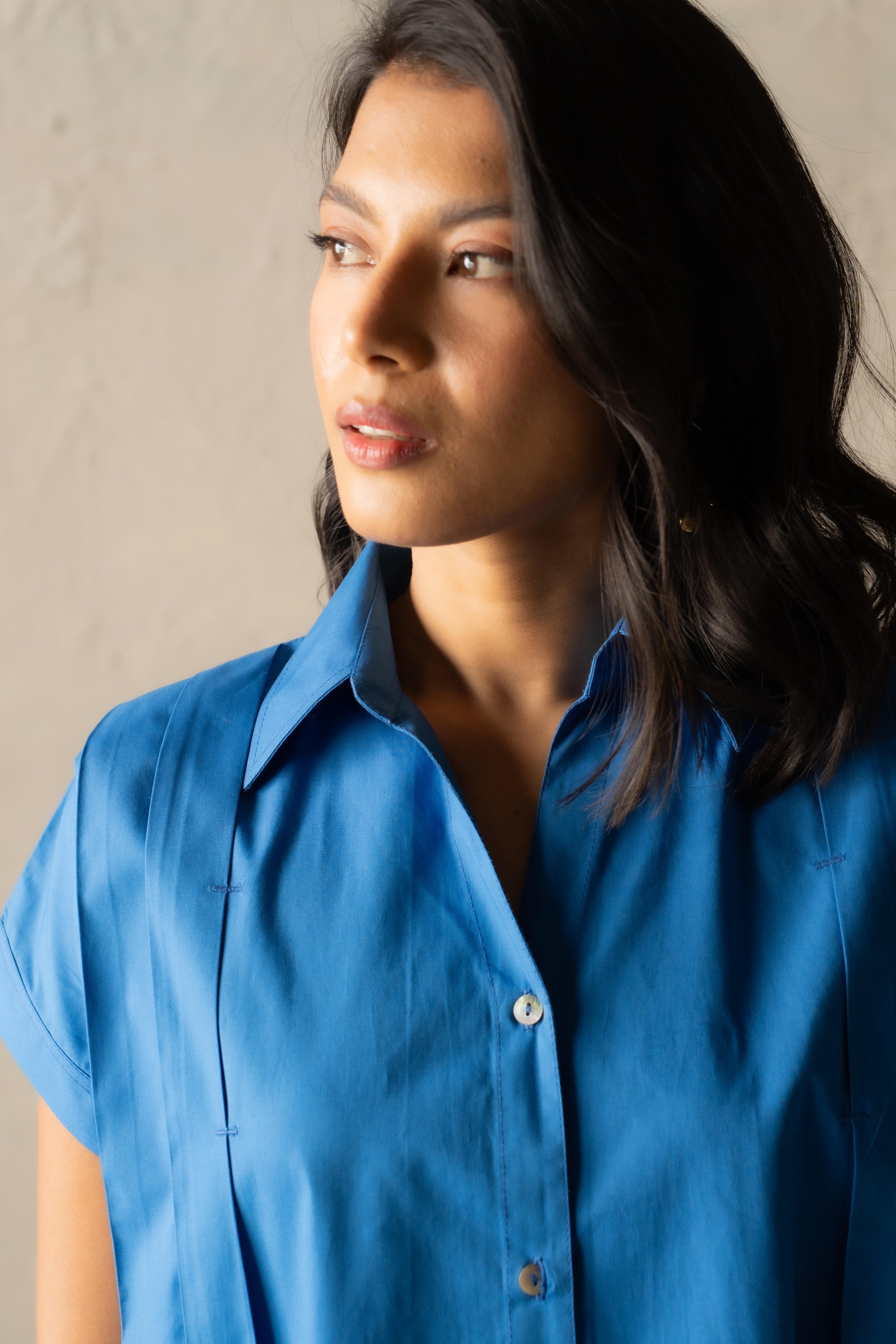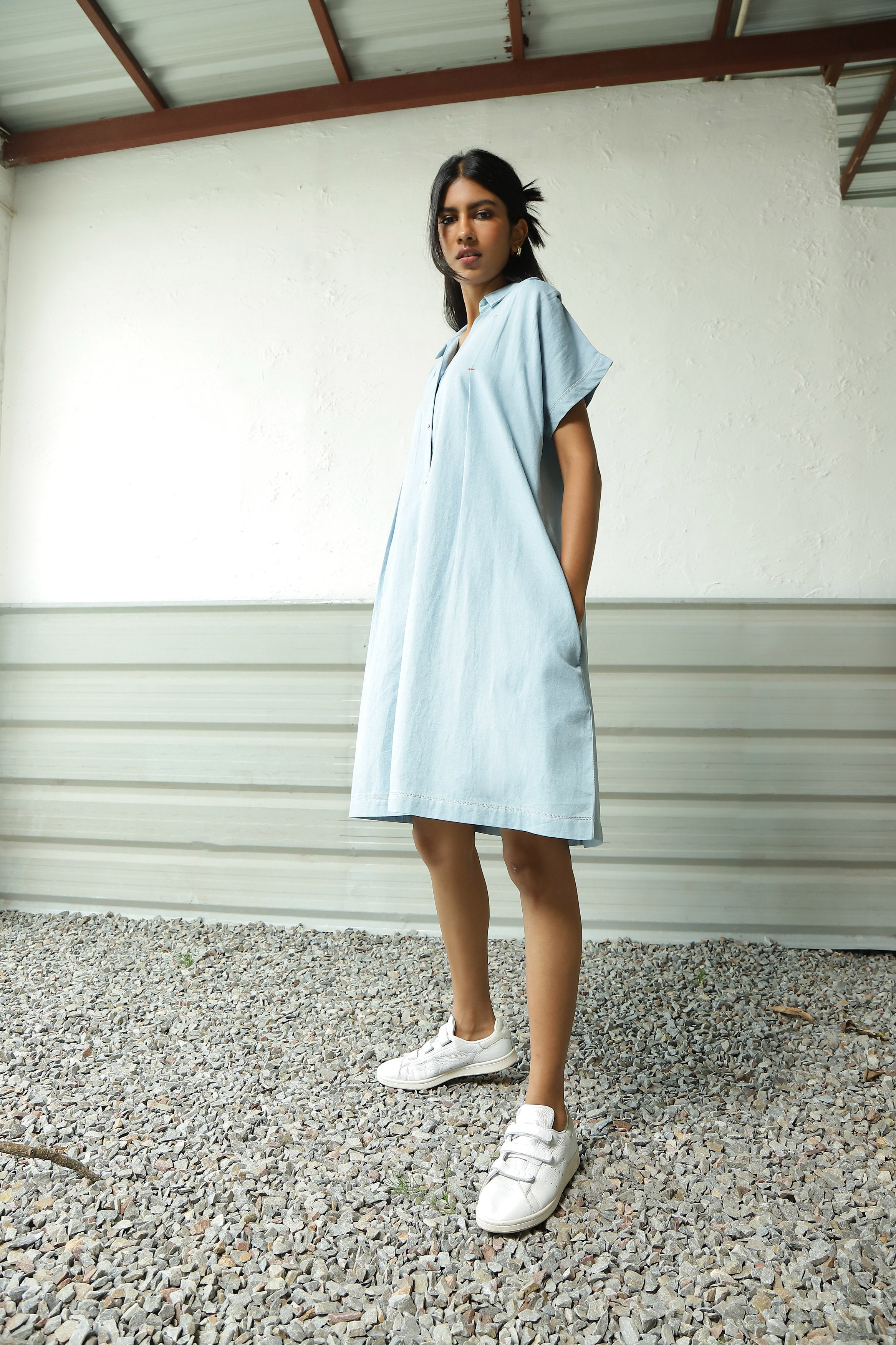 Fashioned from textured cotton, this front-button mini dress exudes understated elegance. Featuring a collared neckline and relaxed half sleeves, it's designed with an A-line hem and enhanced with deep box pleats in the front and back for added movement and flair. Take note of the black darts, which contribute to a graceful silhouette while holding the pleats in place.