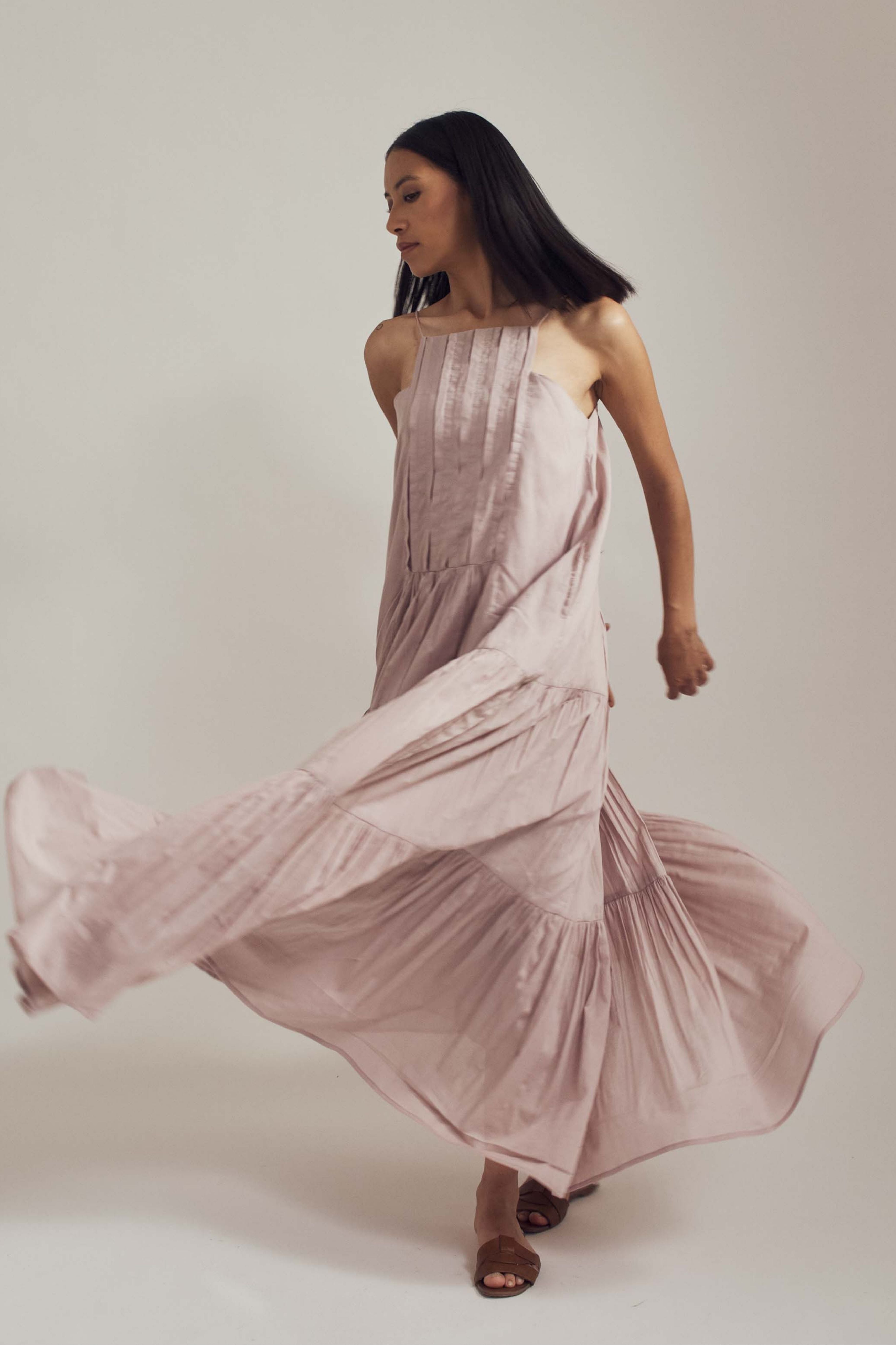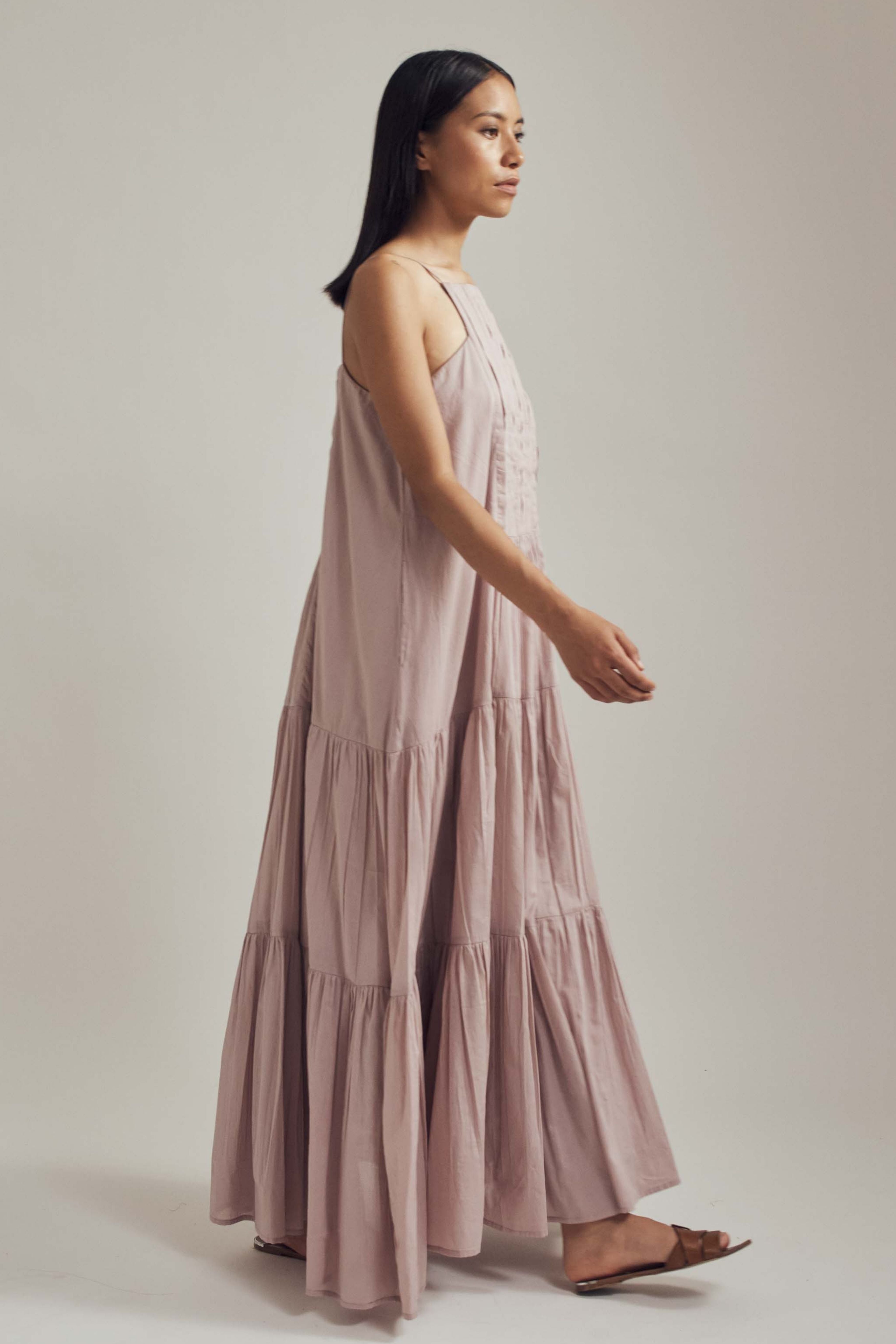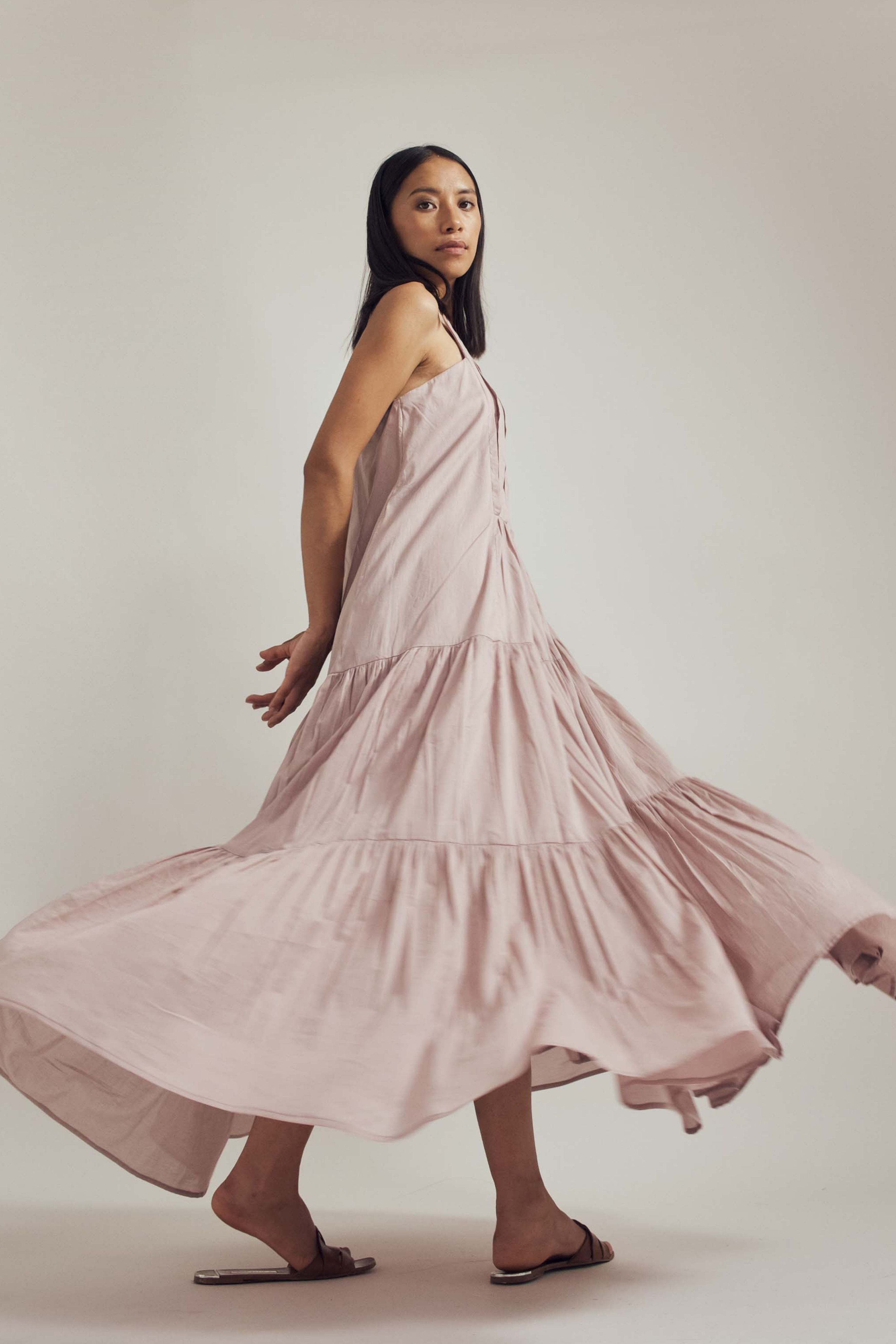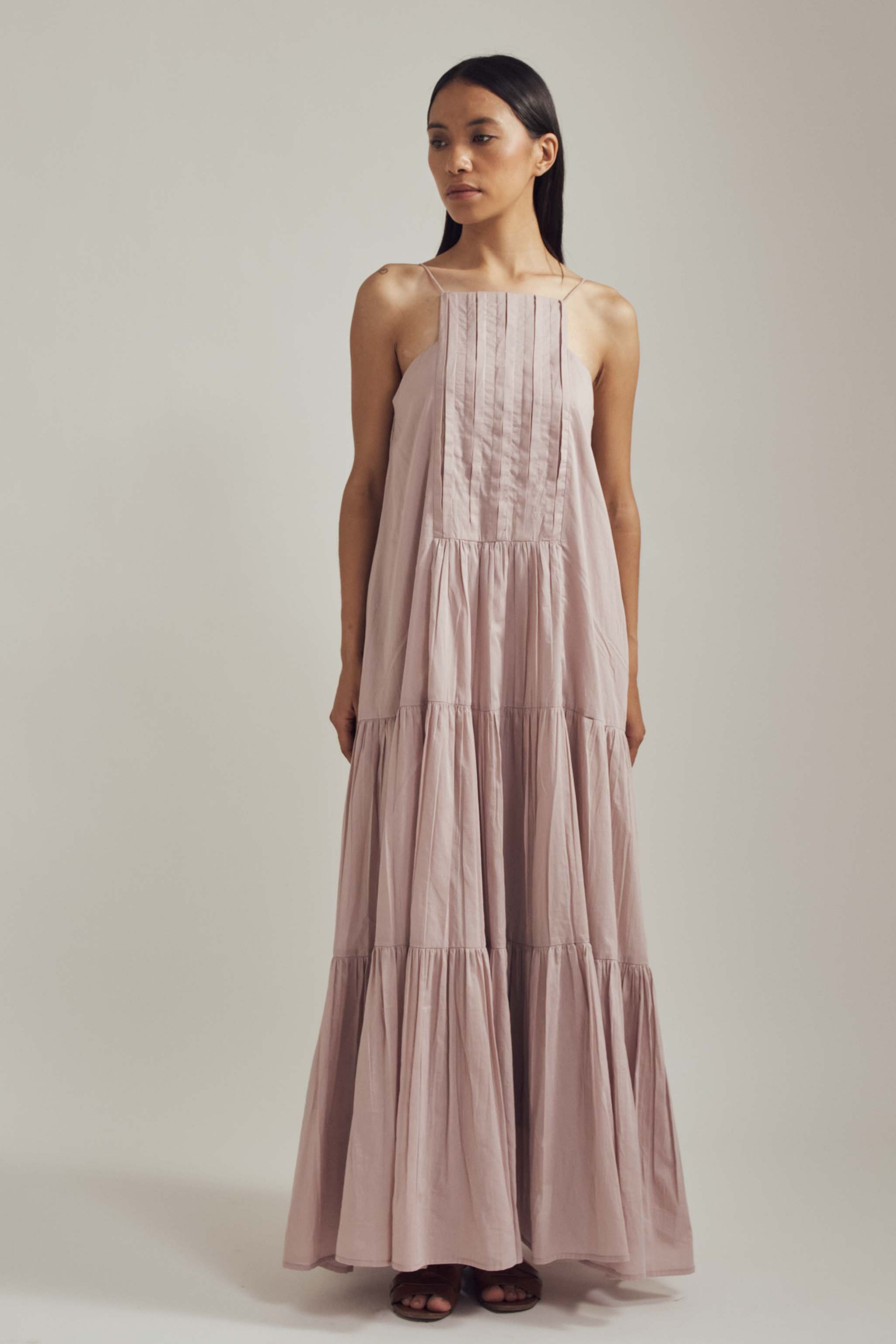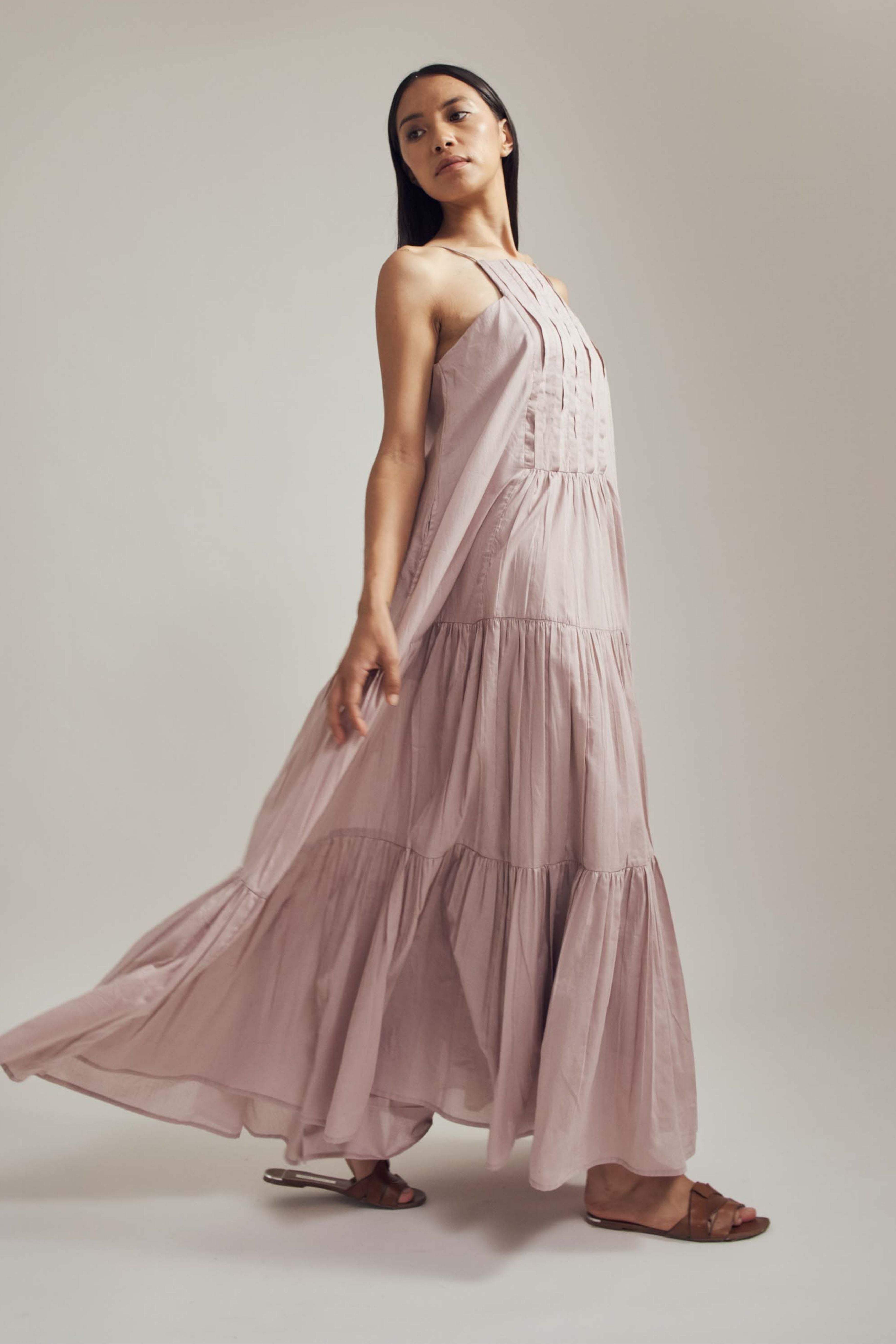 Handcrafted from mul, this dress is comfortable, stylish and versatile. Lots of detailing with pin-tucks, gathers, a structured neckline and spaghetti straps, this is a must have. Team it up with sneakers or dress it up with your heels and you're good to go. The model is 5 feet 6 inches tall wearing size XS.