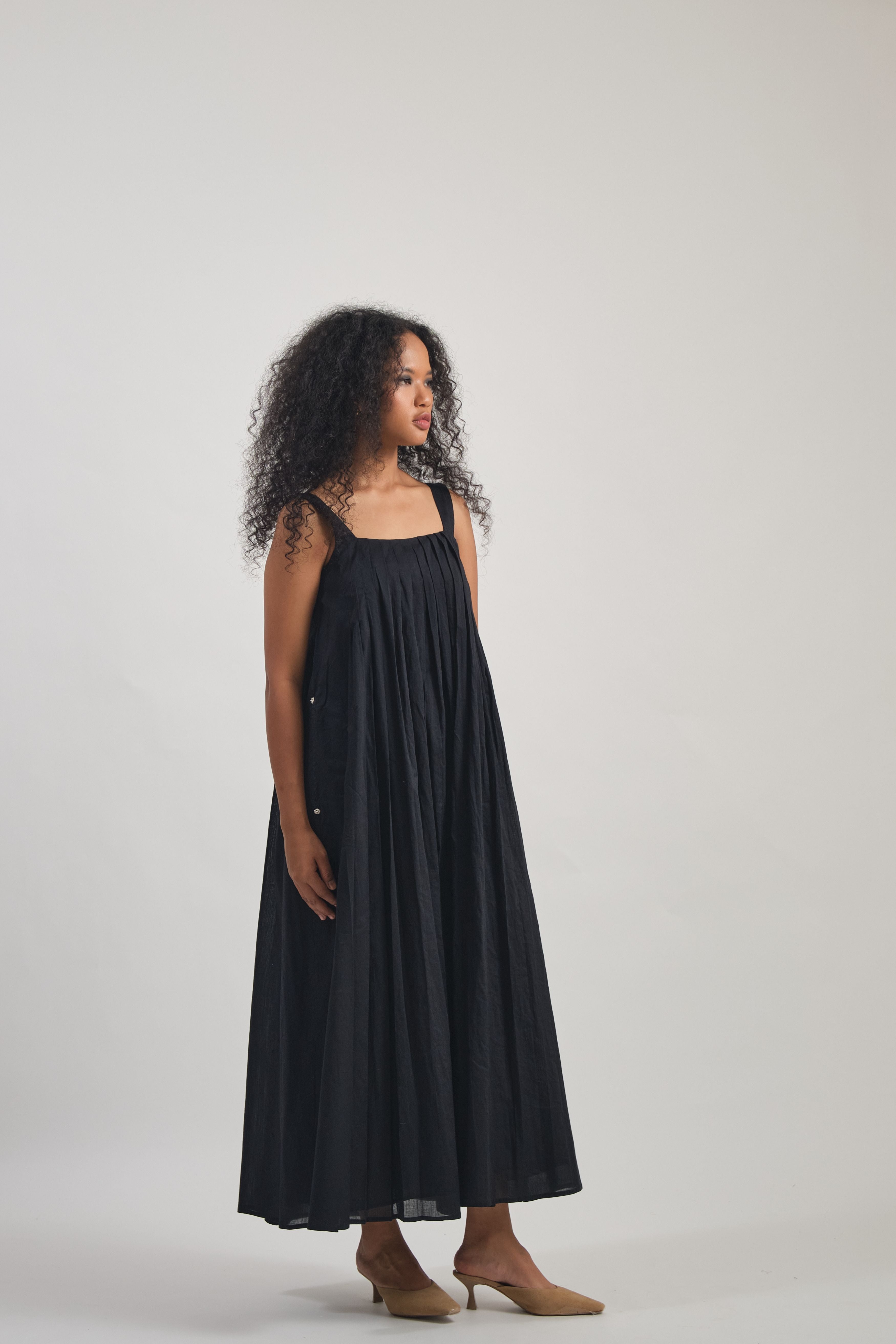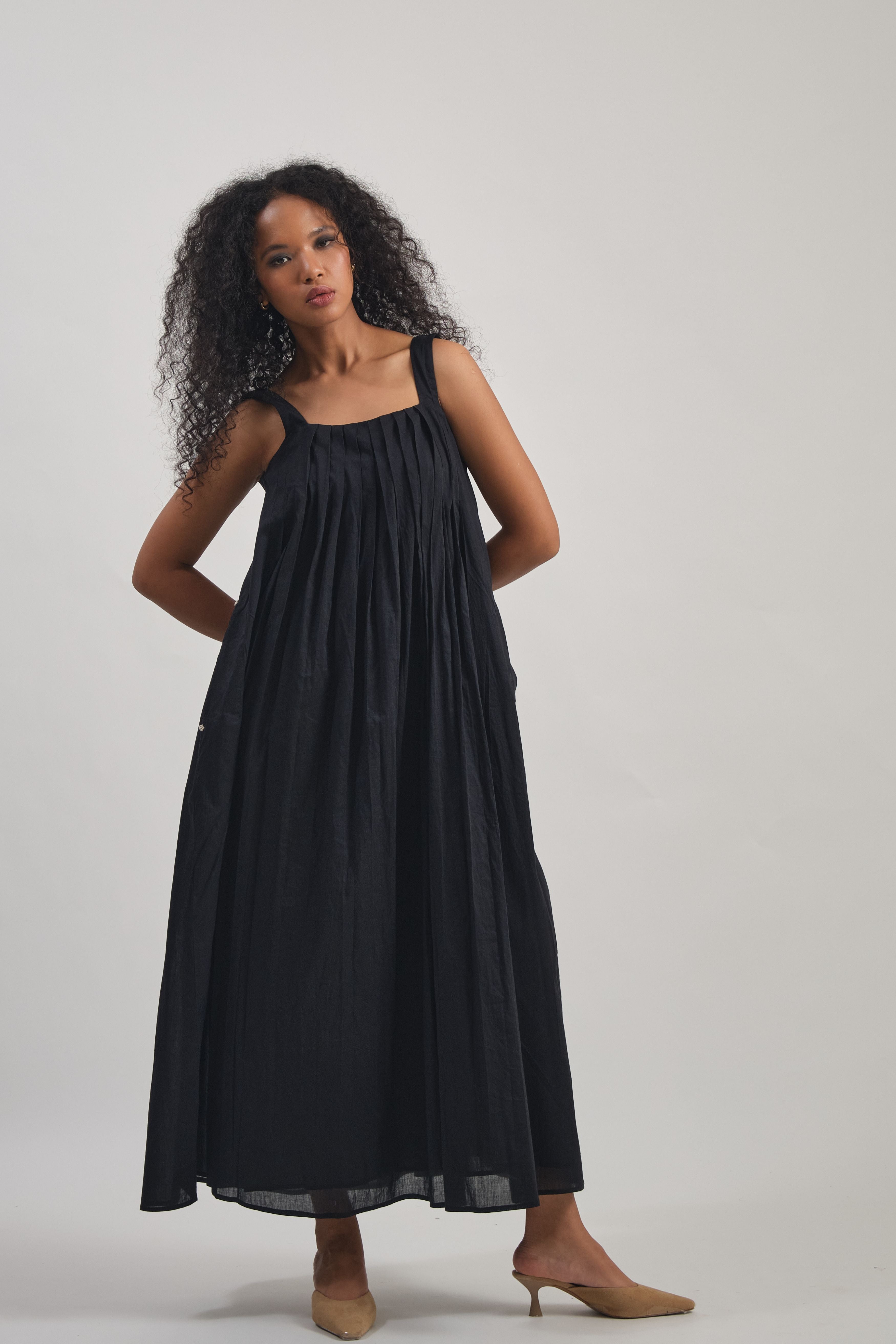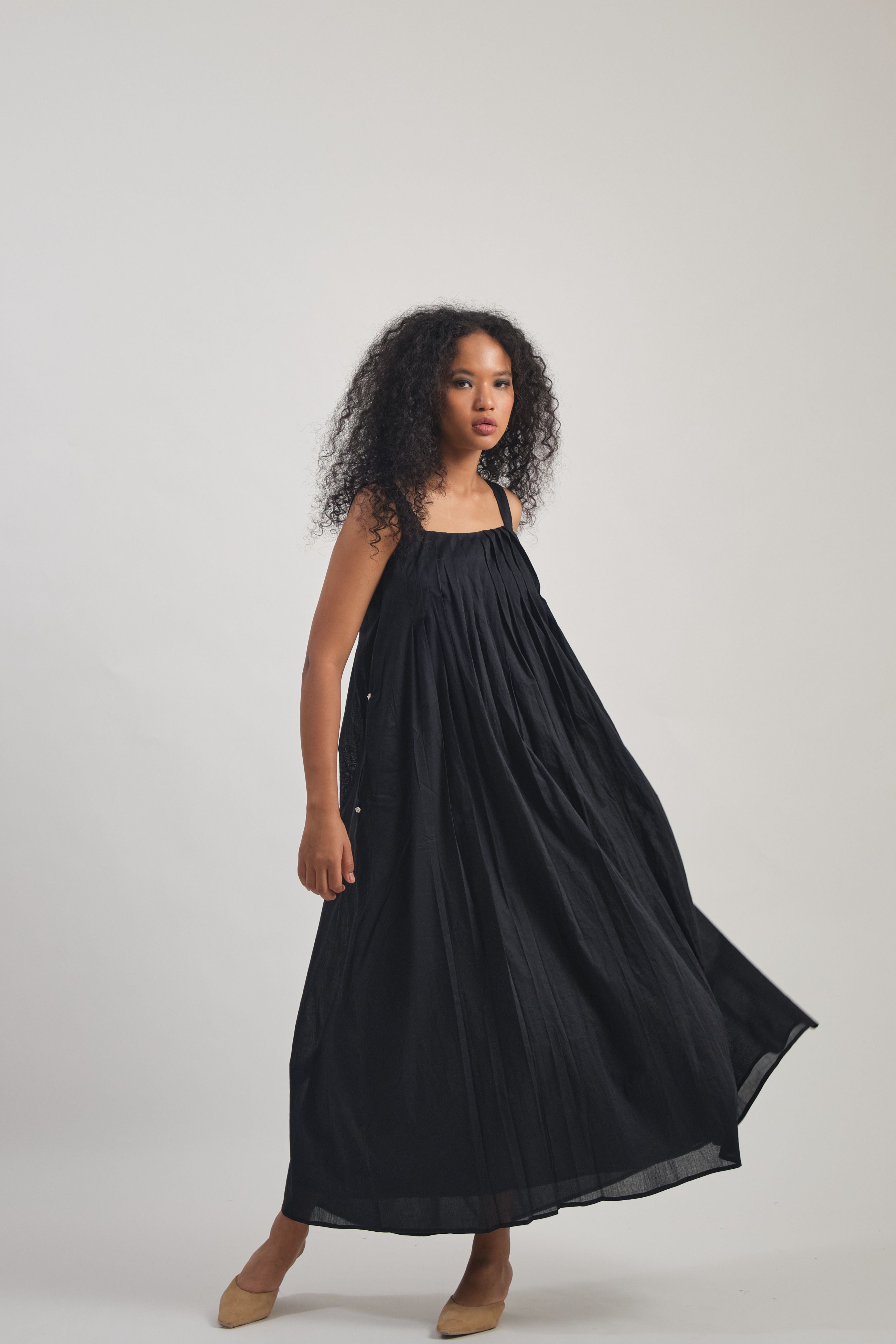Handcrafted from mul, this green dress is comfortable, stylish and versatile. It has box pleat detail, a square neck line, pretty detail on the pockets and made with extremely soft fabric. The dress has narrow straps and completely lined. This is the perfect holiday dress. The model is 5 feet 6 inches tall wearing size XS.