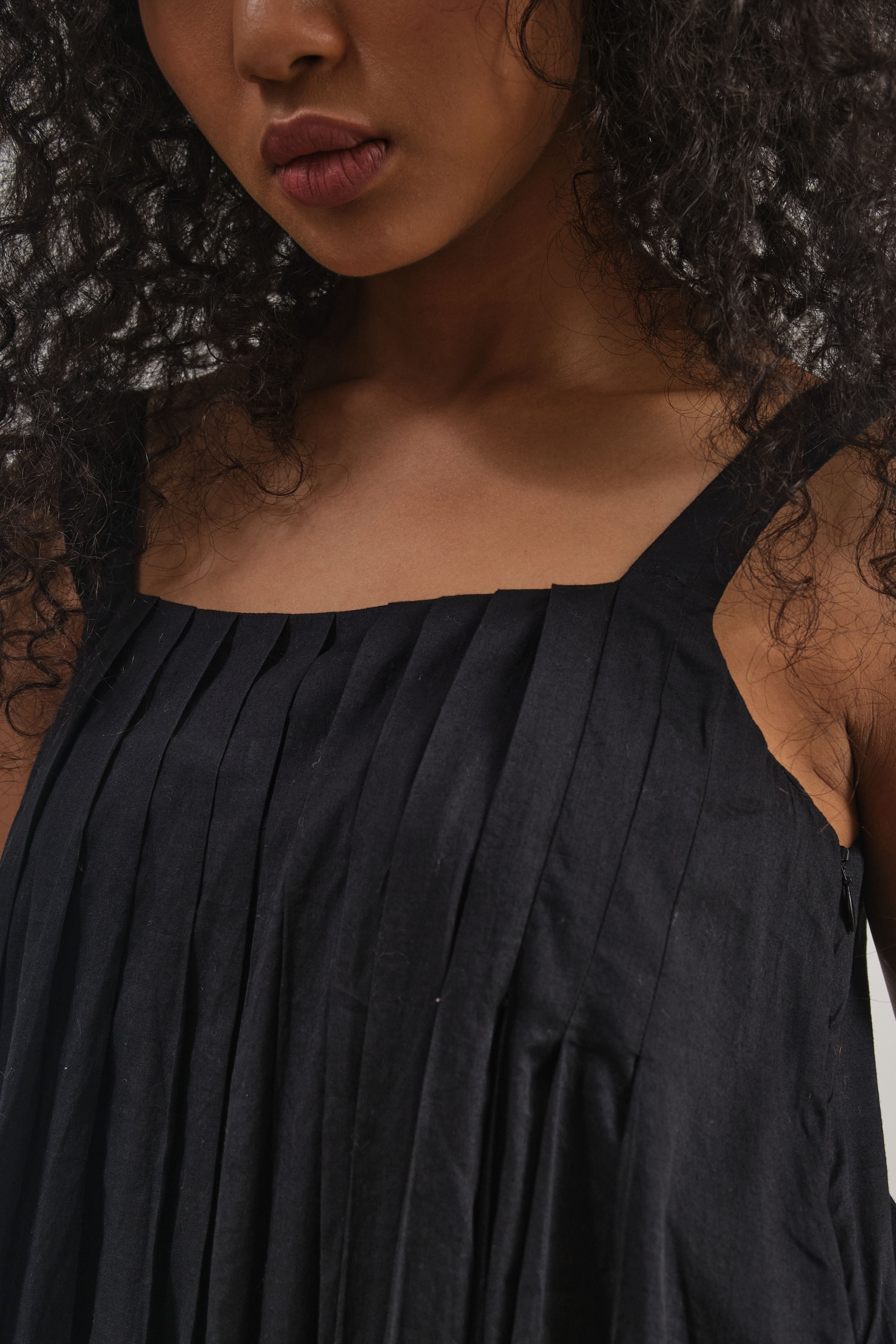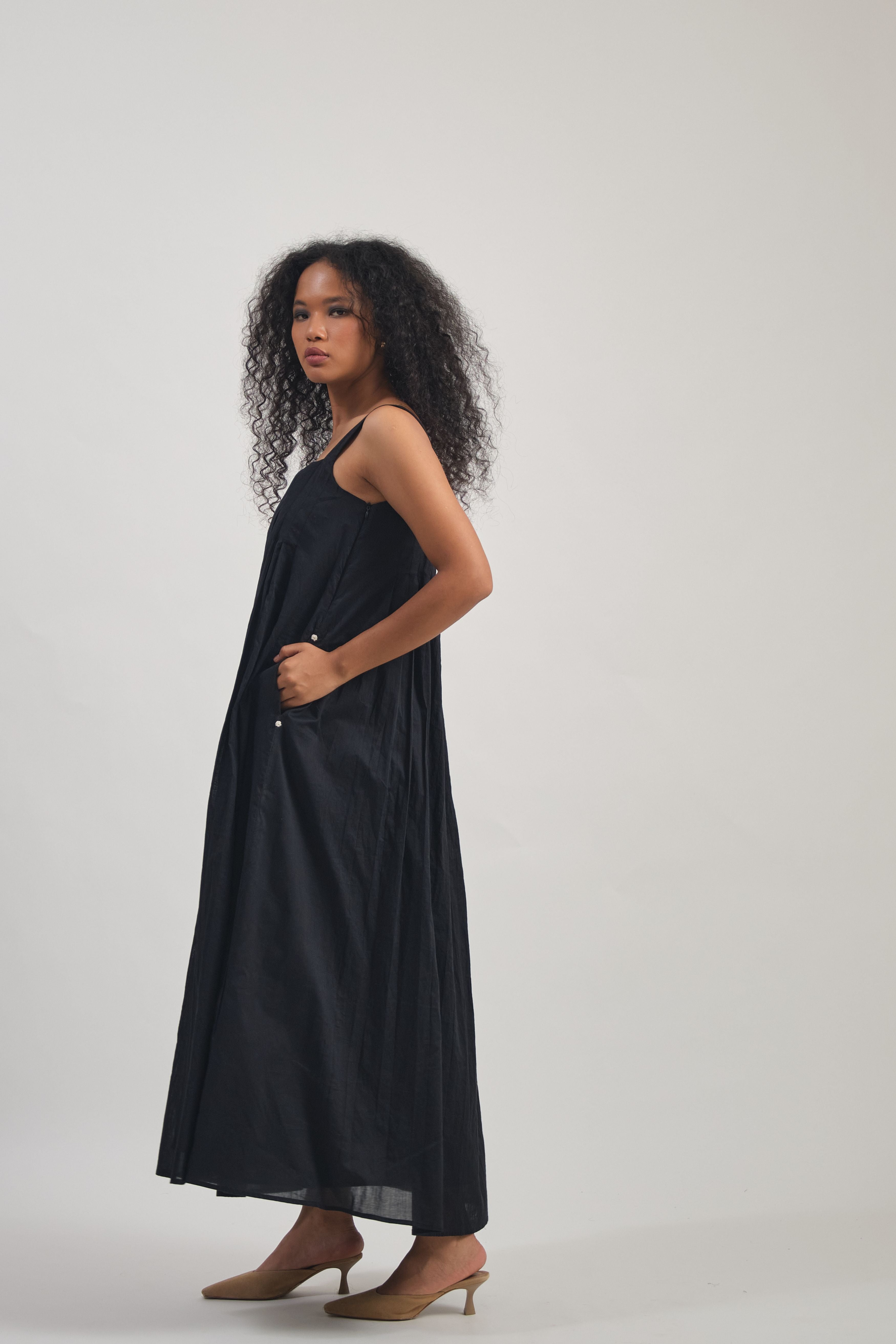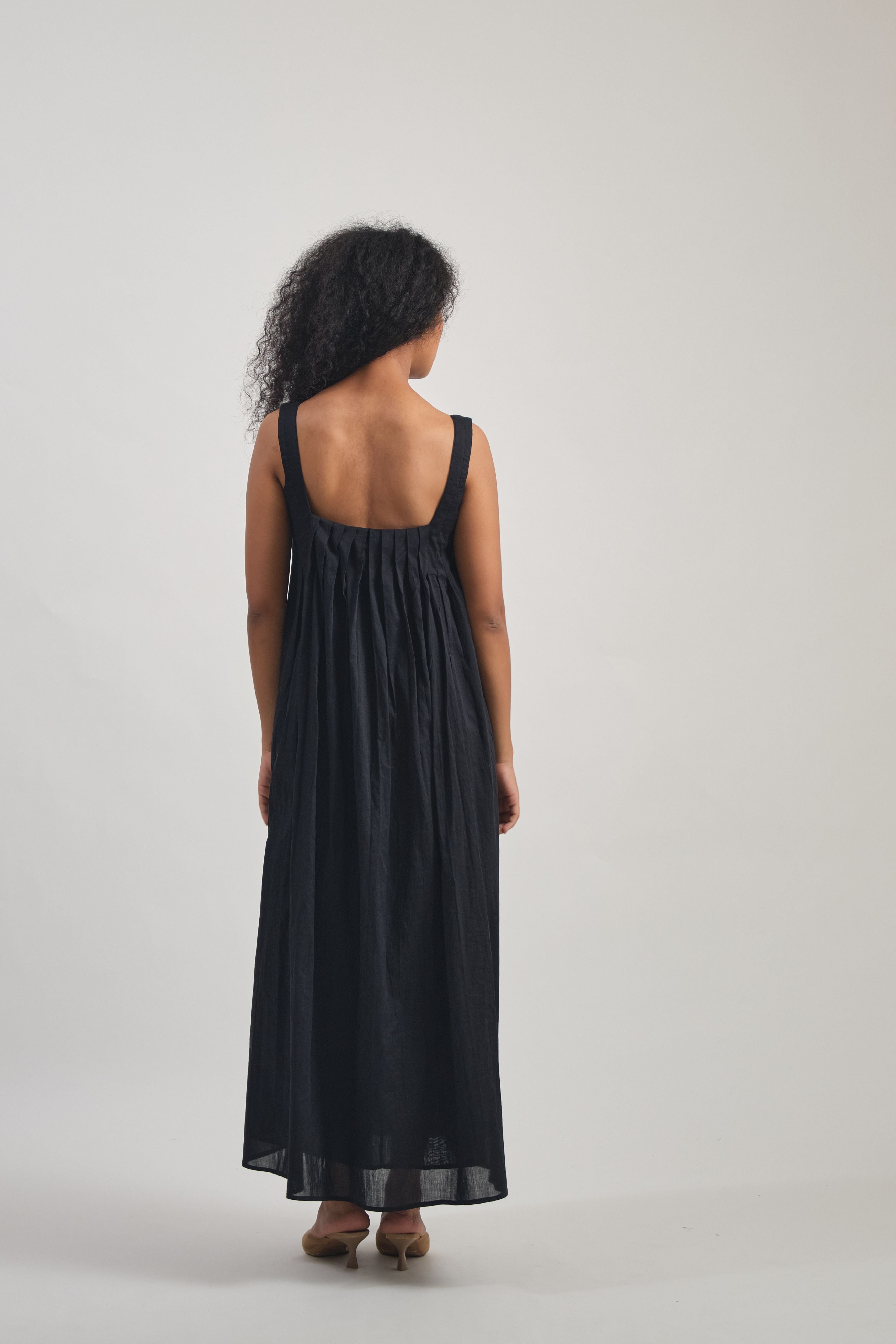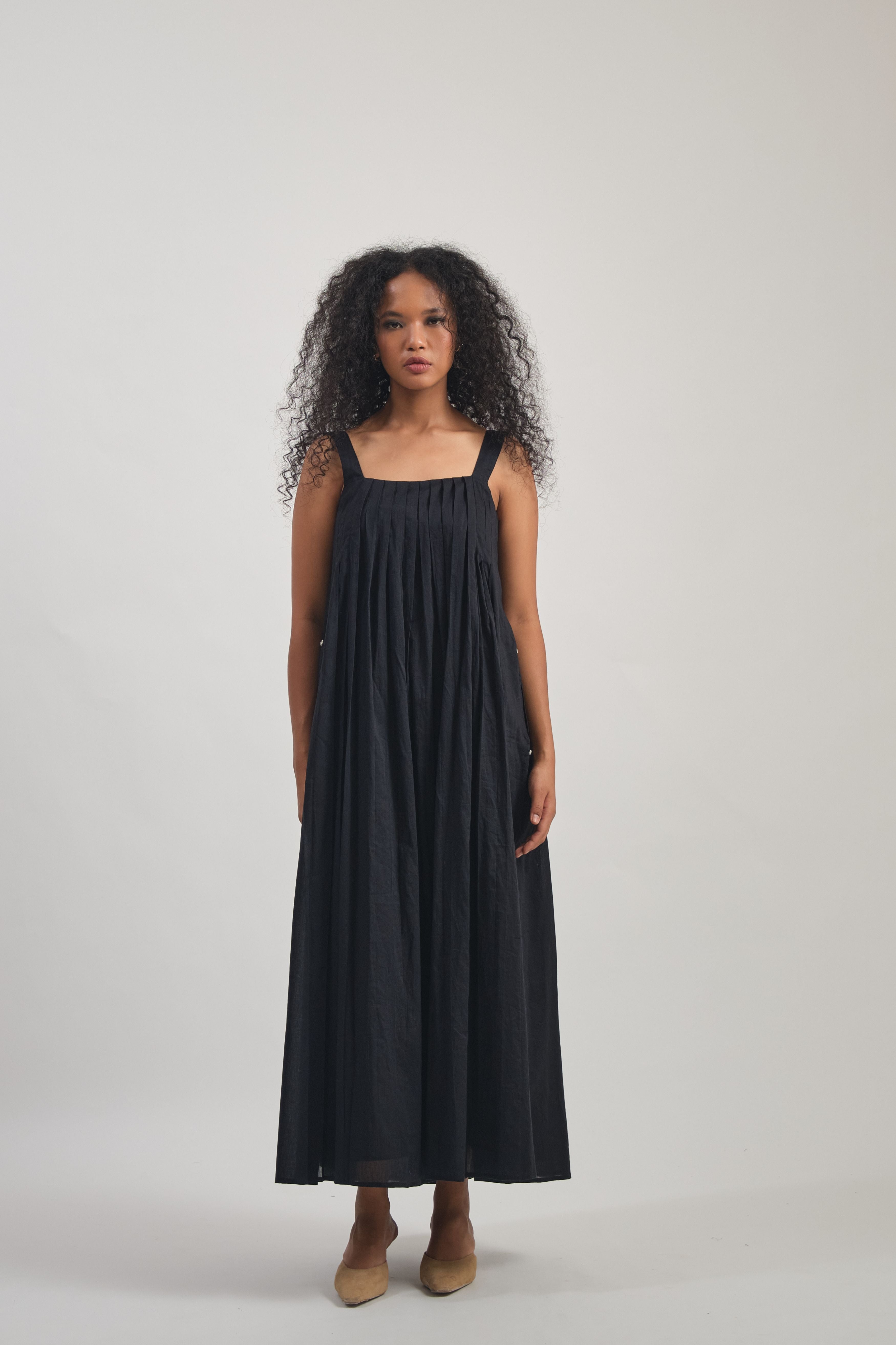 Handcrafted from mul, this green dress is comfortable, stylish and versatile. It has box pleat detail, a square neck line, pretty detail on the pockets and made with extremely soft fabric. The dress has narrow straps and completely lined. This is the perfect holiday dress. The model is 5 feet 6 inches tall wearing size XS.