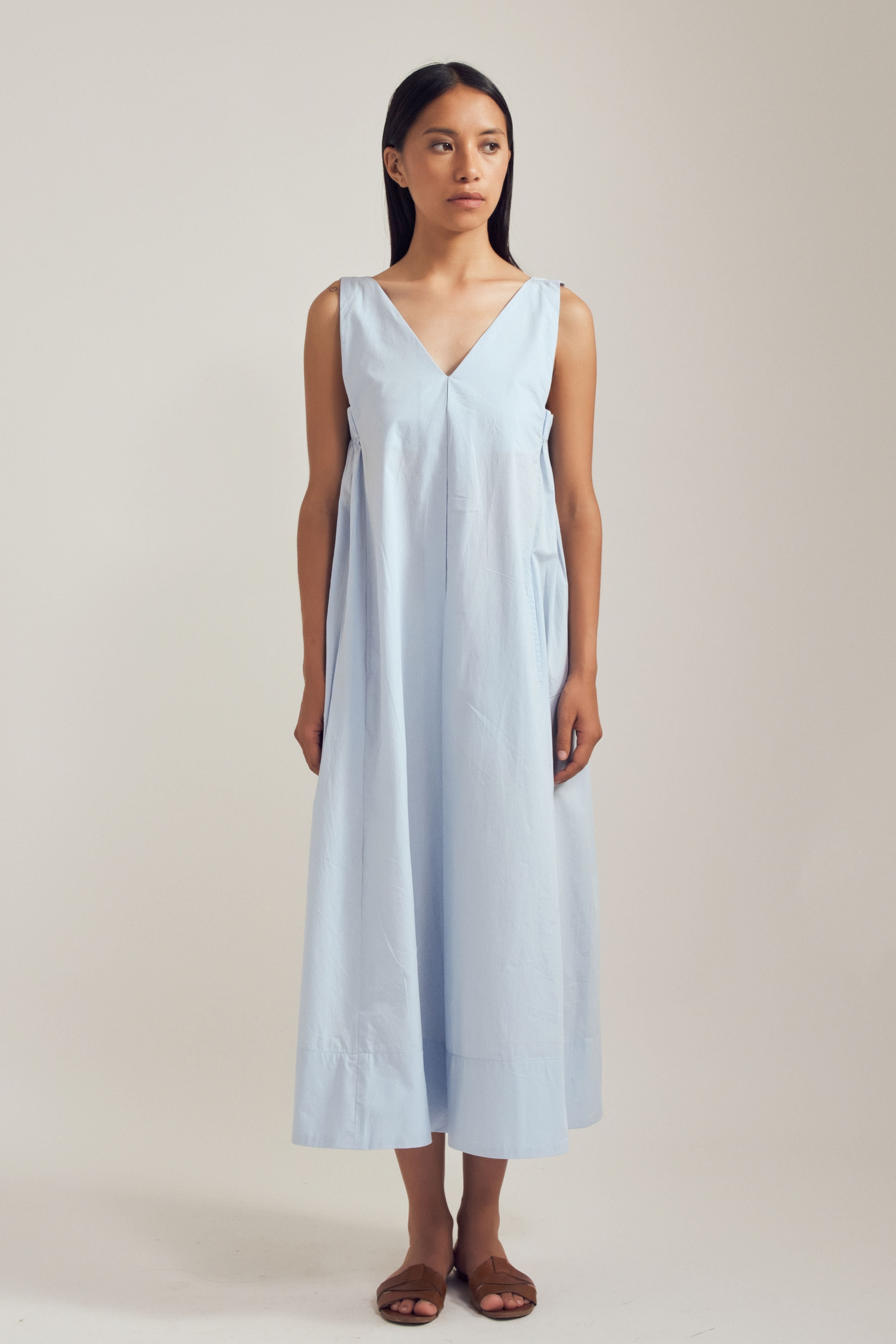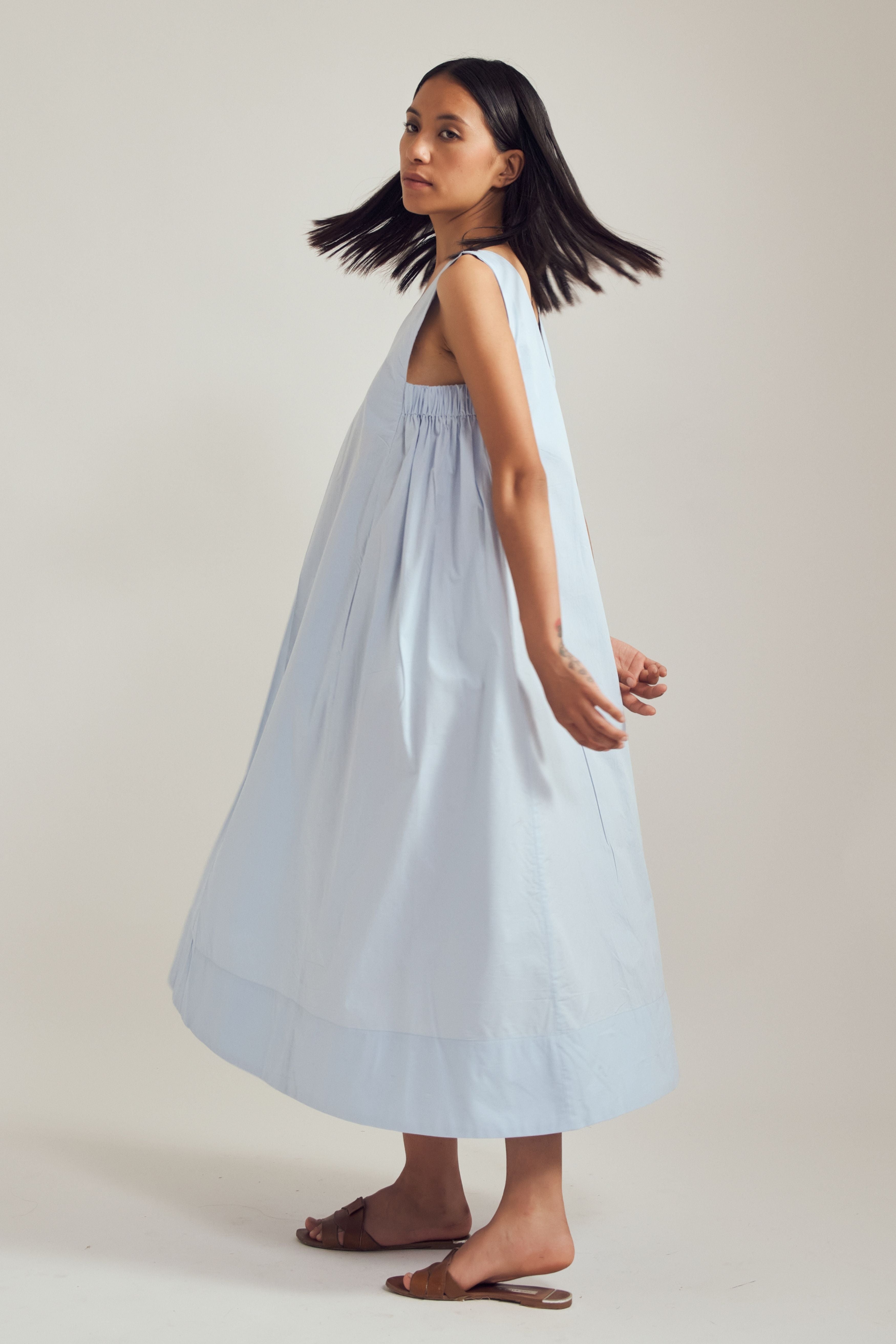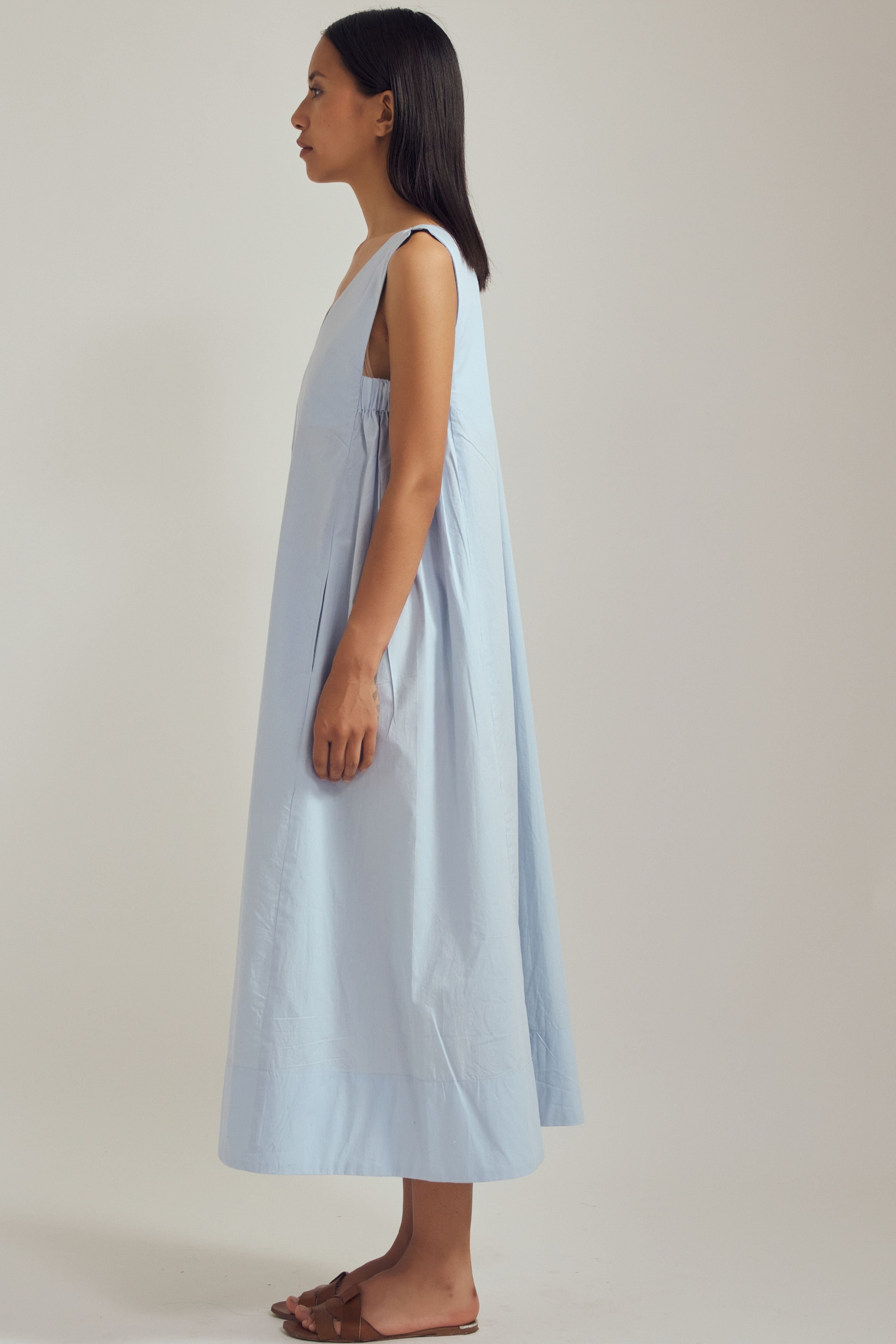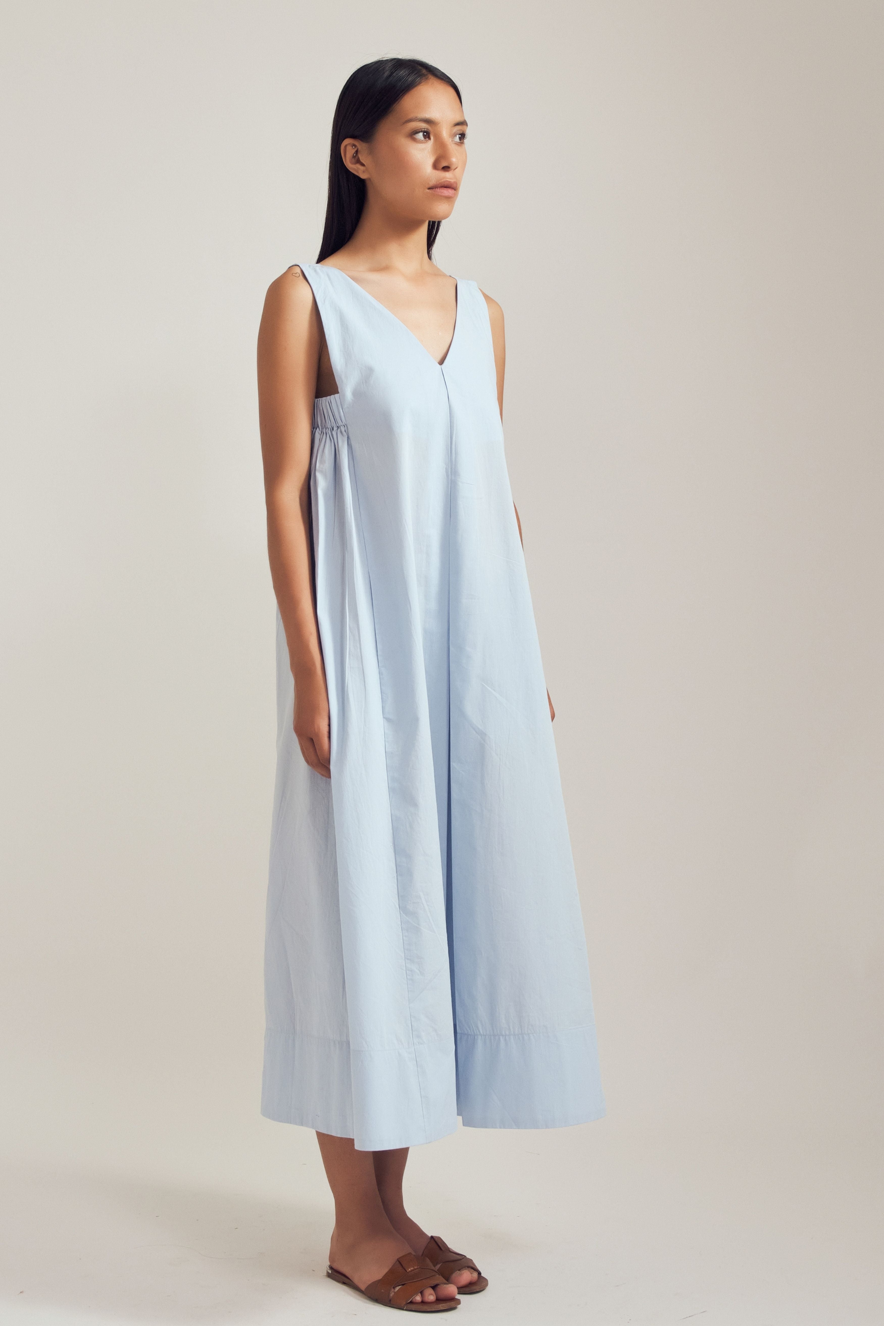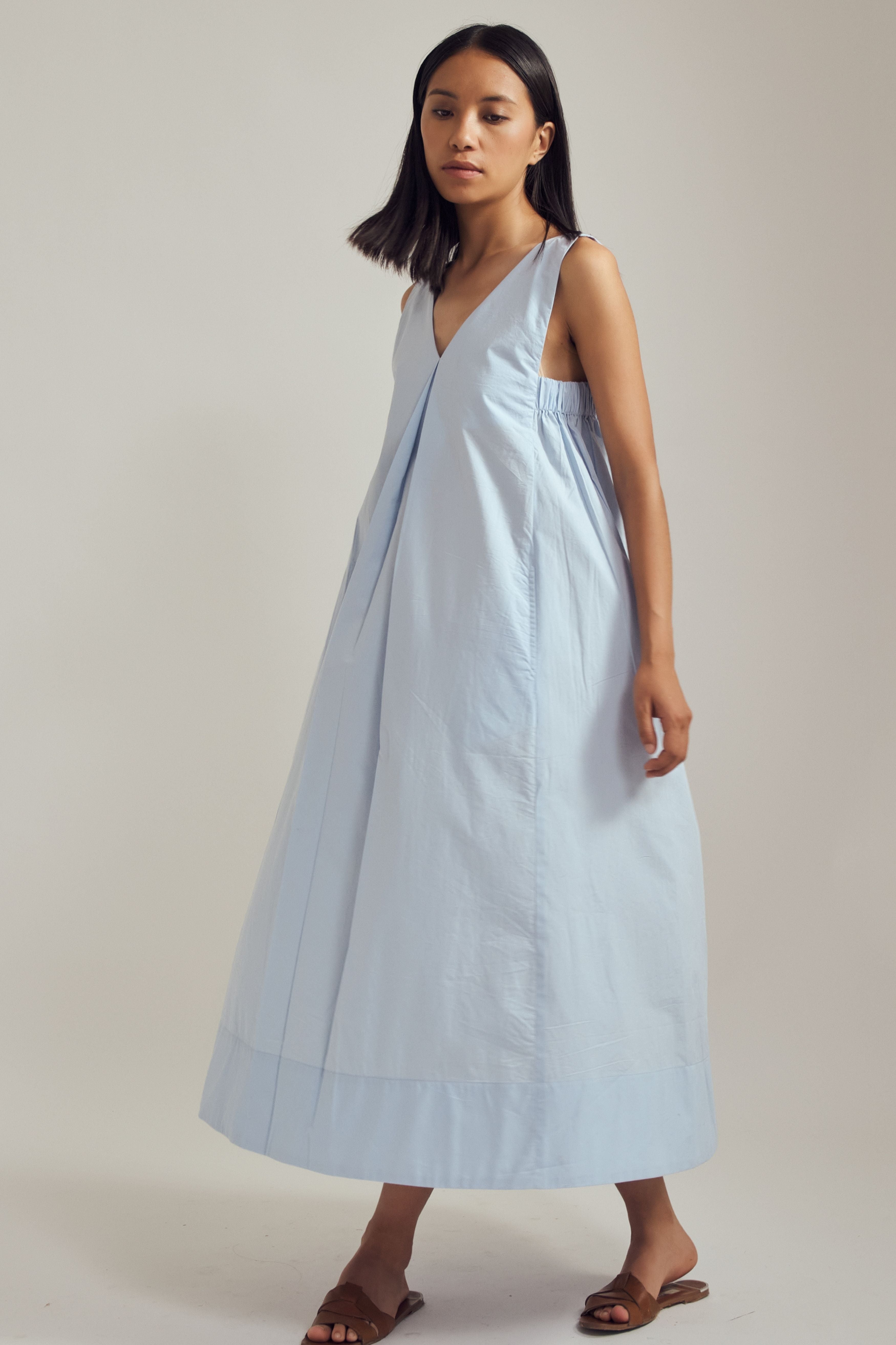 Handcrafted from poplin, this dress is comfortable, stylish and versatile. With a structured V neckline, pleated front detail, A line fit and pockets, this is a must have this summer. Elastic along the armhole helps in giving a better fit. Team it up with sneakers or dress it up with your heels and you're good to go. The model is 5 feet 6 inches tall wearing size XS.