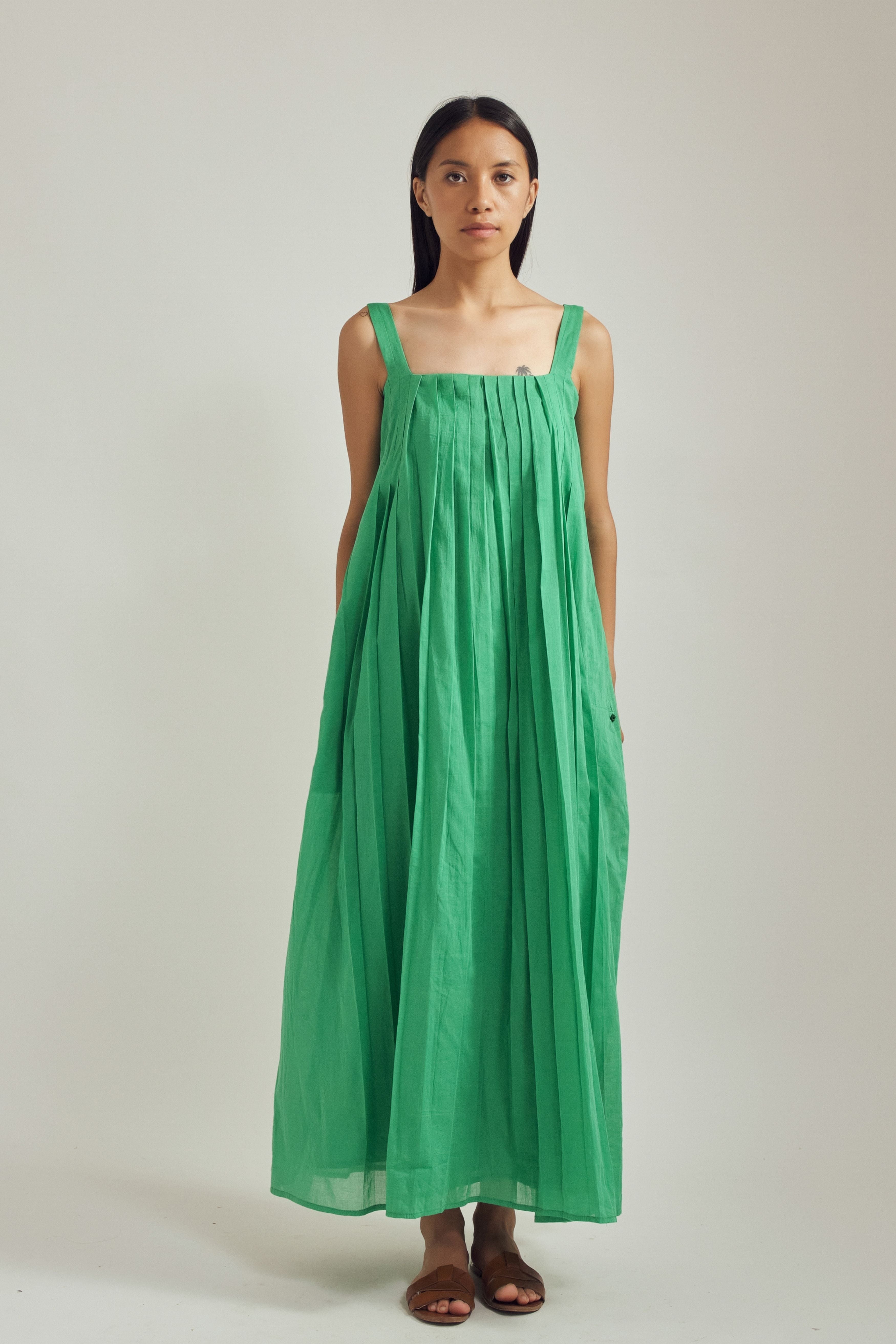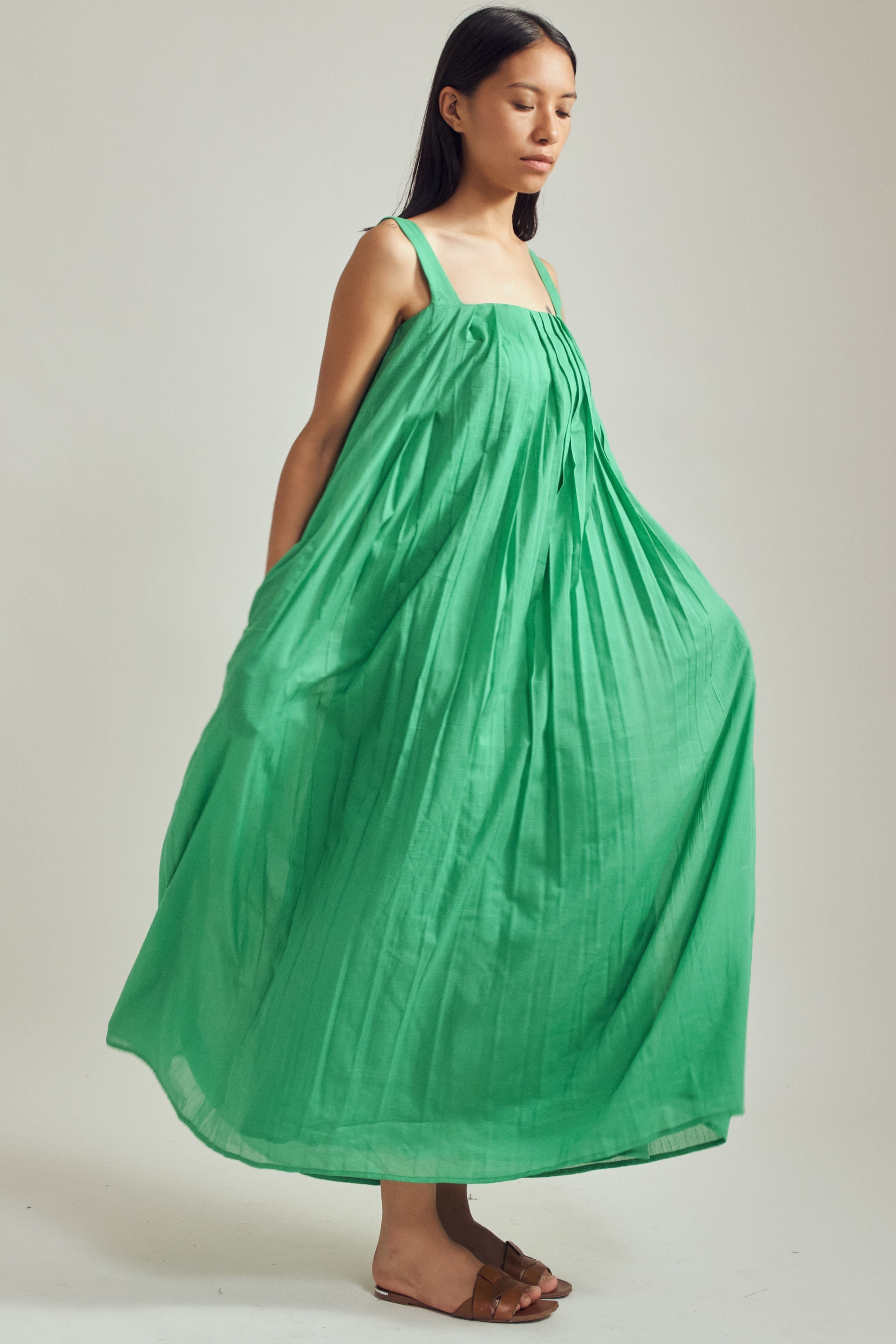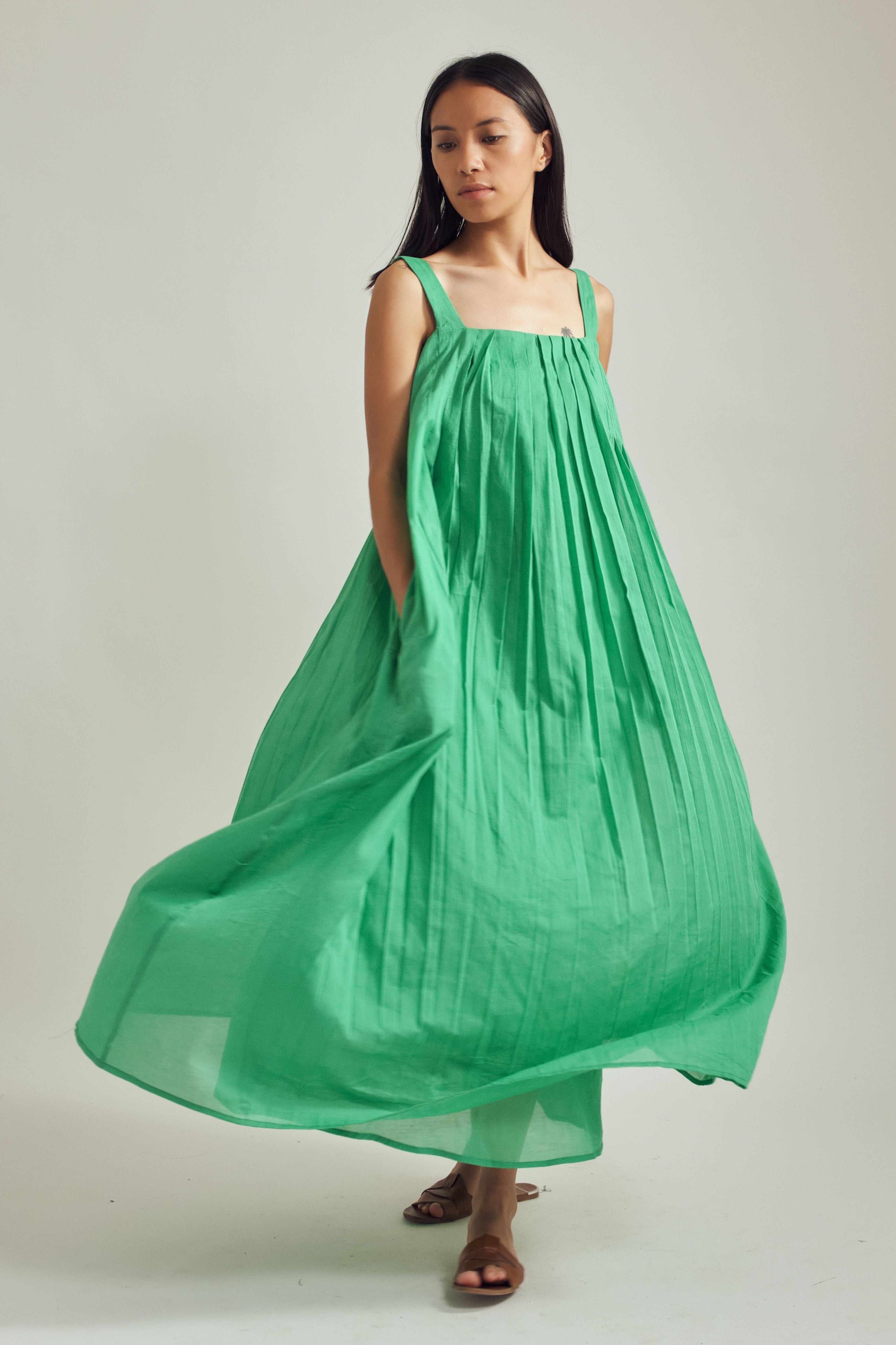 Handcrafted from mul, this green dress is comfortable, stylish and versatile. It has box pleat detail, a square neck line, pretty detail on the pockets and made with extremely soft fabric. The dress has narrow straps and completely lined. This is the perfect holiday dress. The model is 5 feet 6 inches tall wearing size XS.