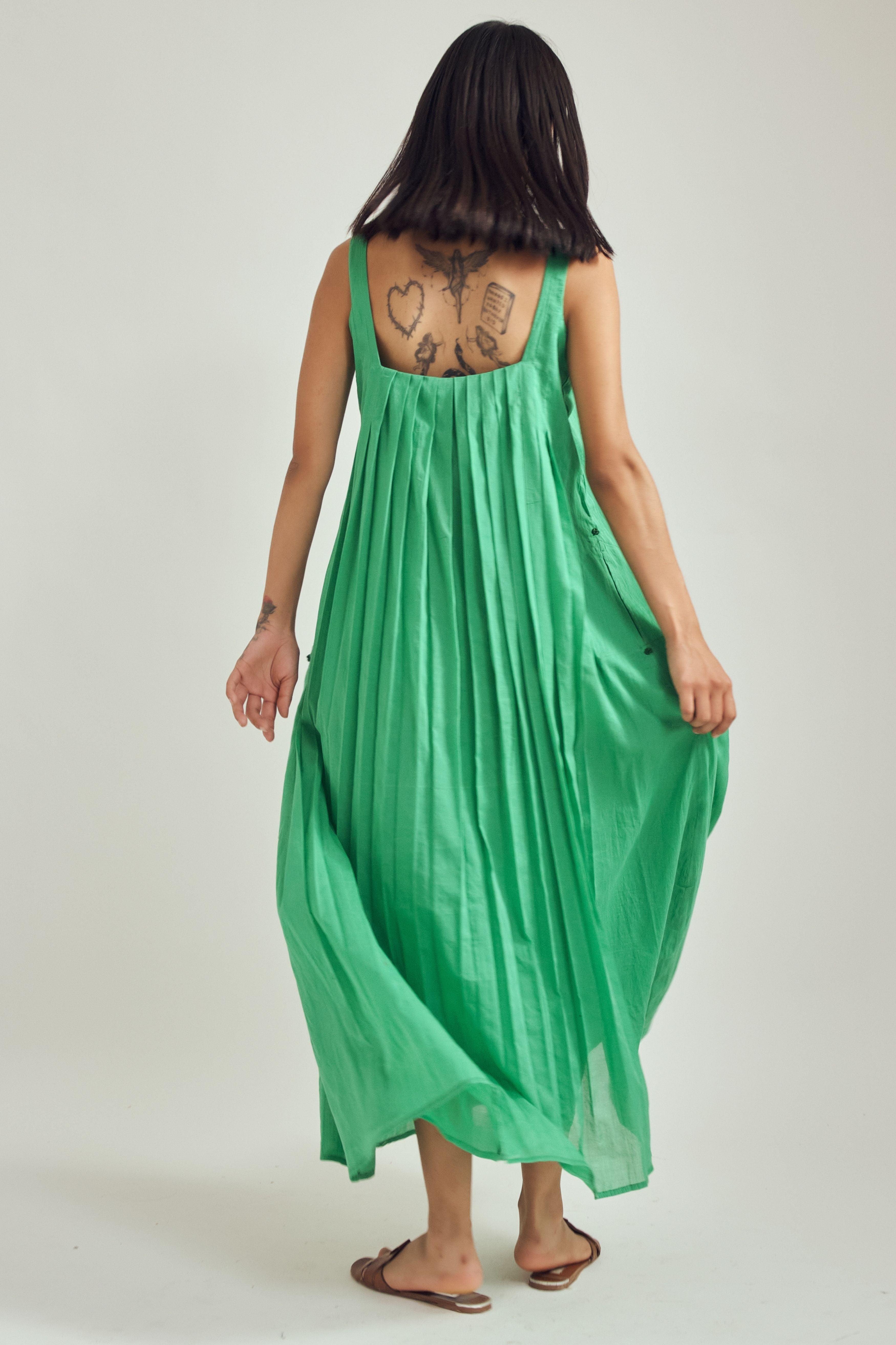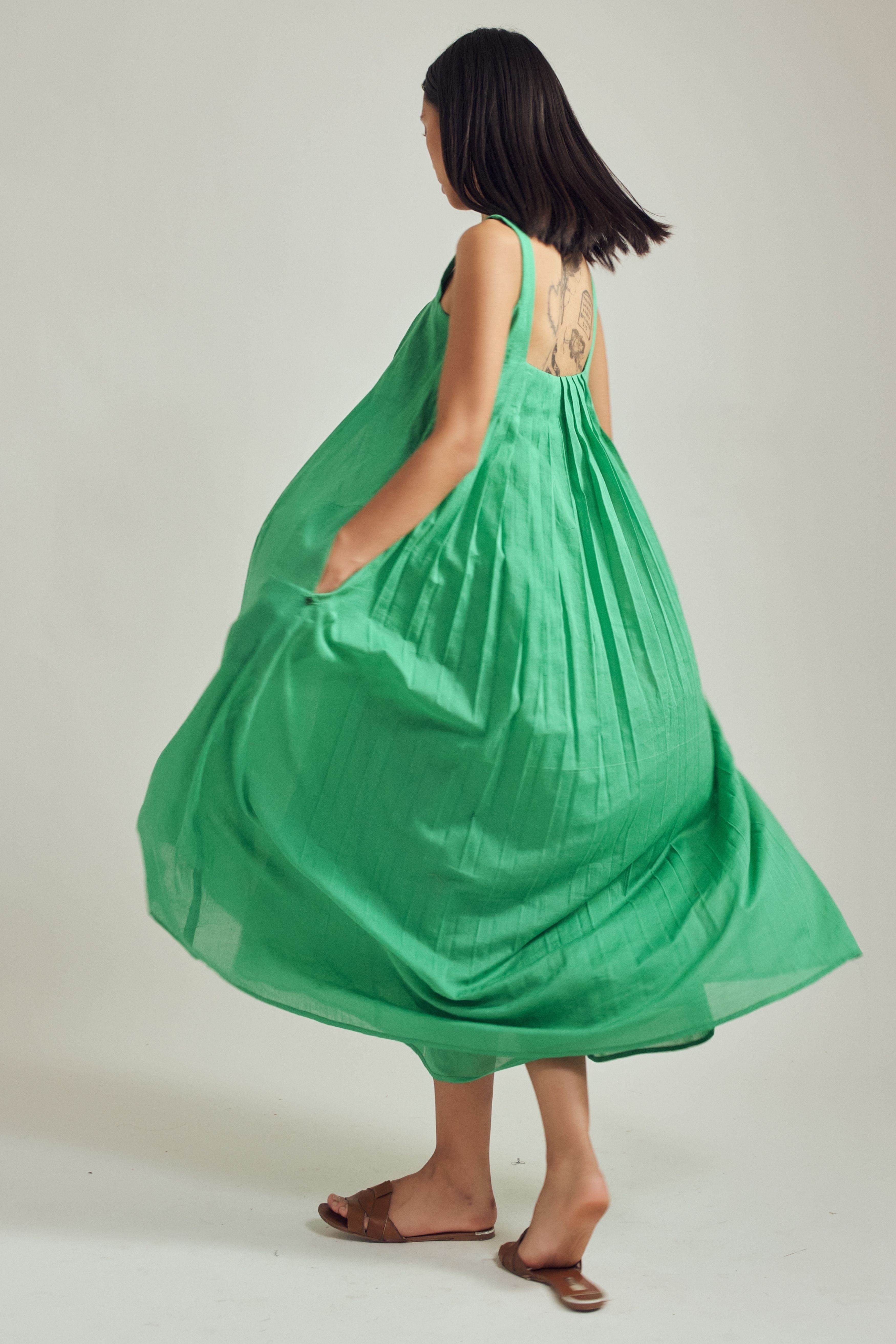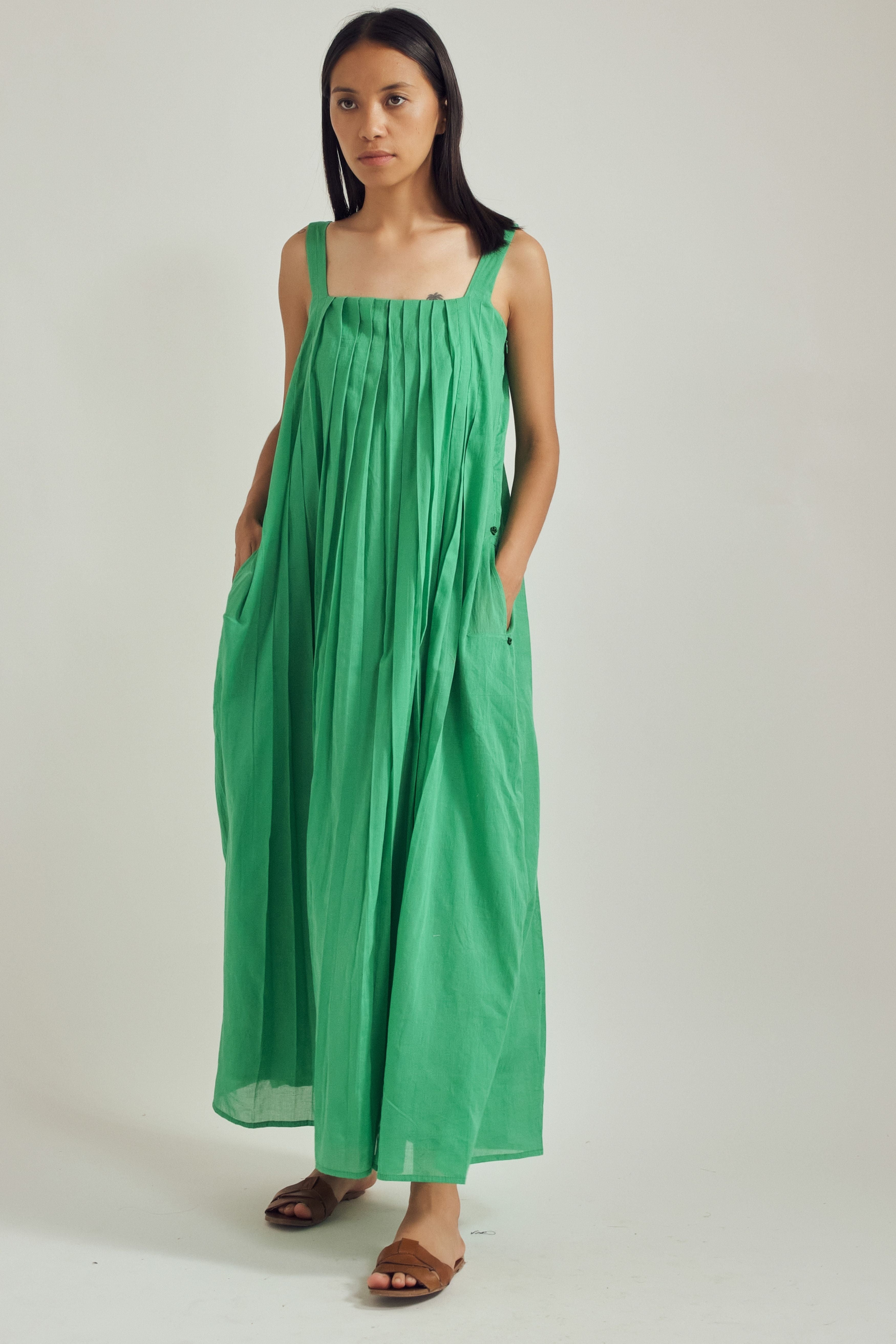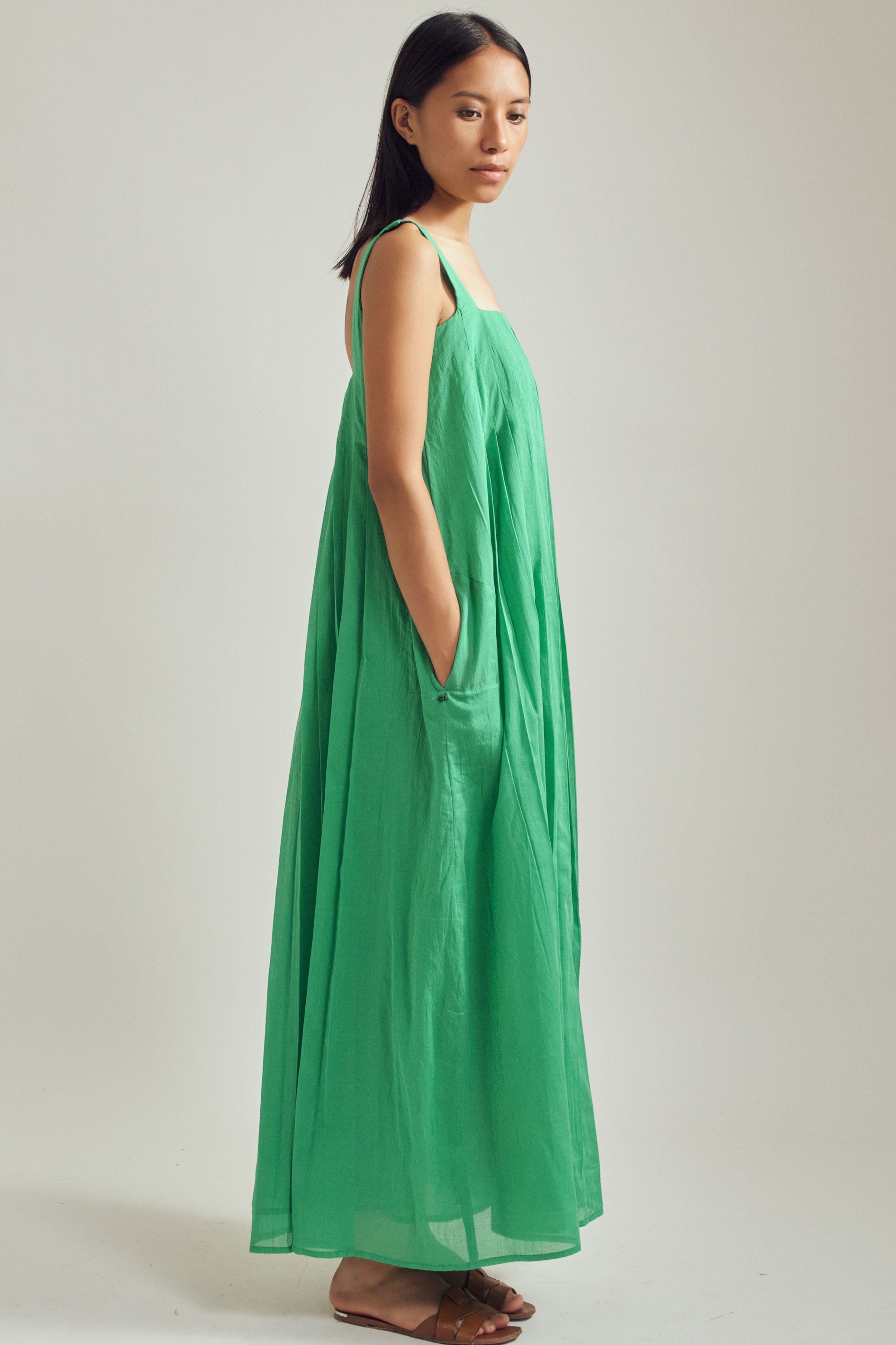 Handcrafted from mul, this green dress is comfortable, stylish and versatile. It has box pleat detail, a square neck line, pretty detail on the pockets and made with extremely soft fabric. The dress has narrow straps and completely lined. This is the perfect holiday dress. The model is 5 feet 6 inches tall wearing size XS.