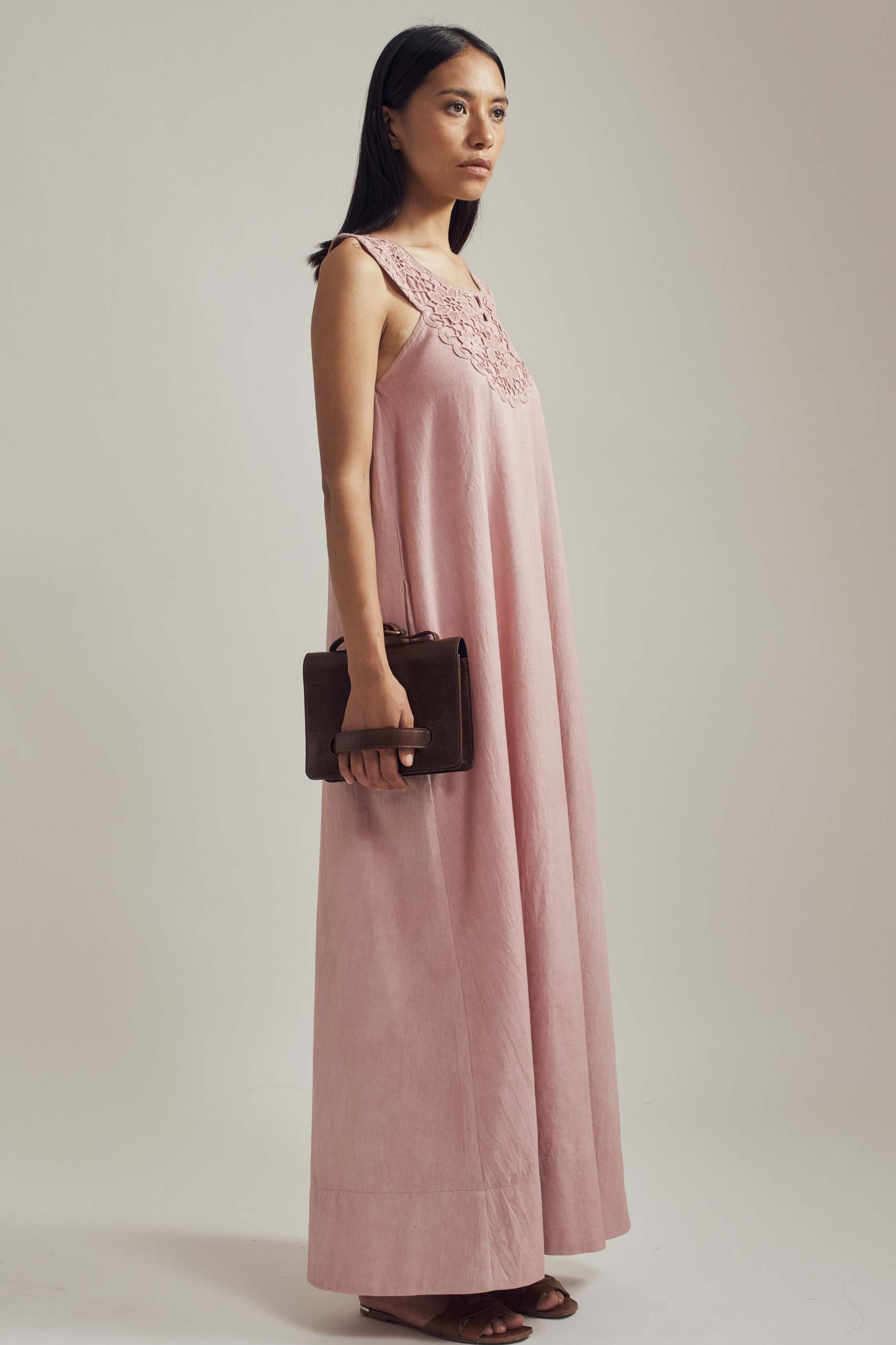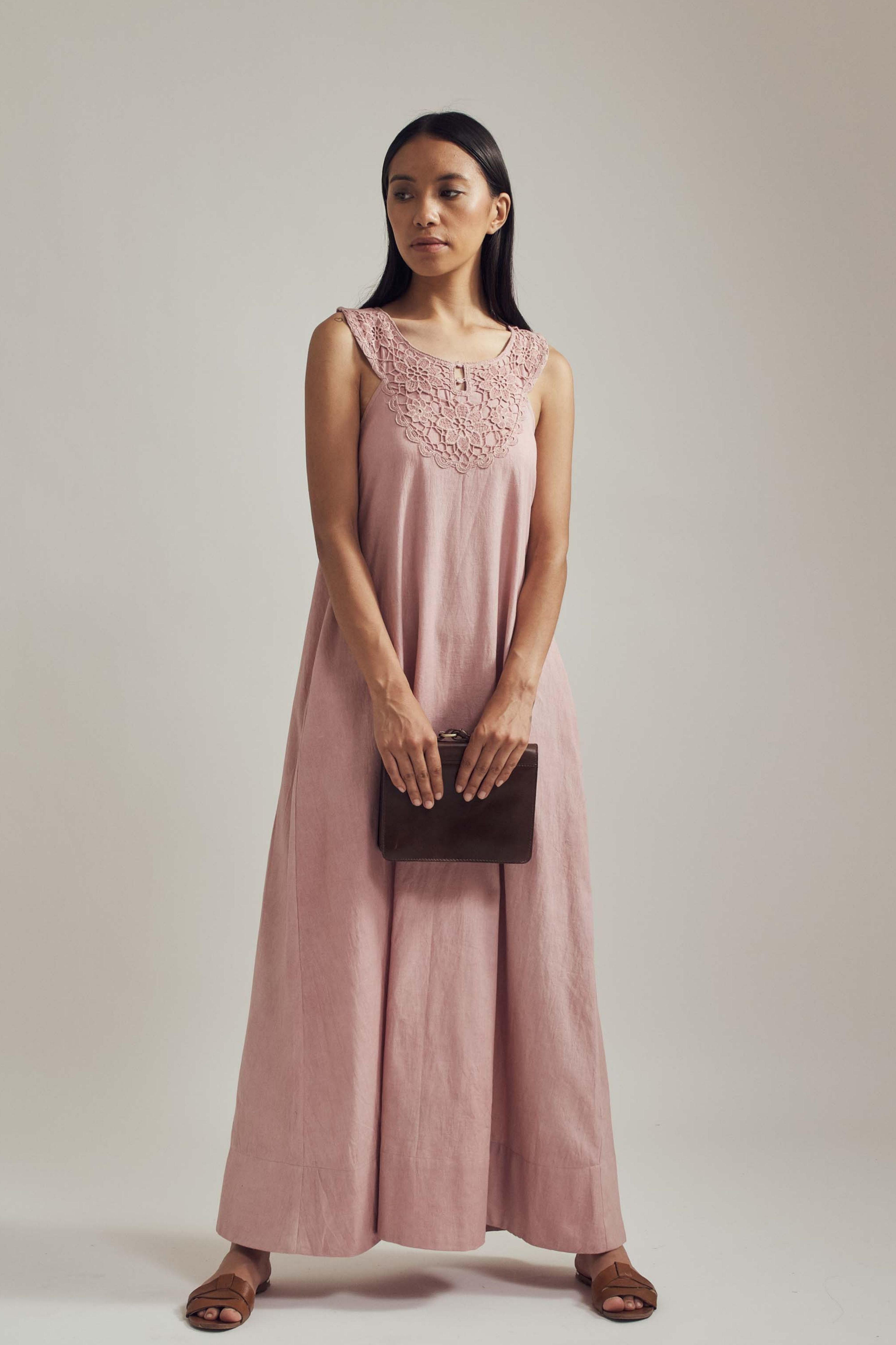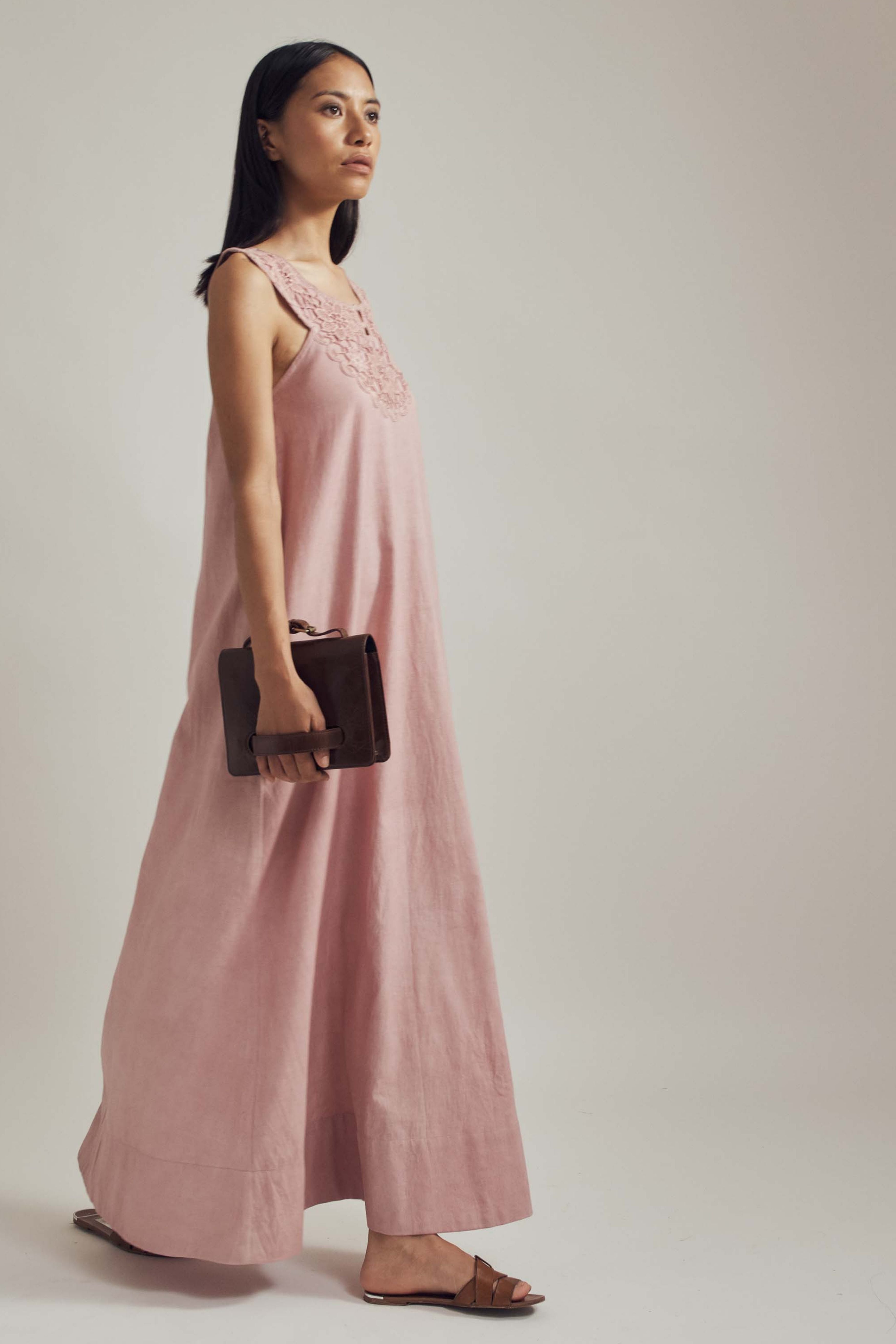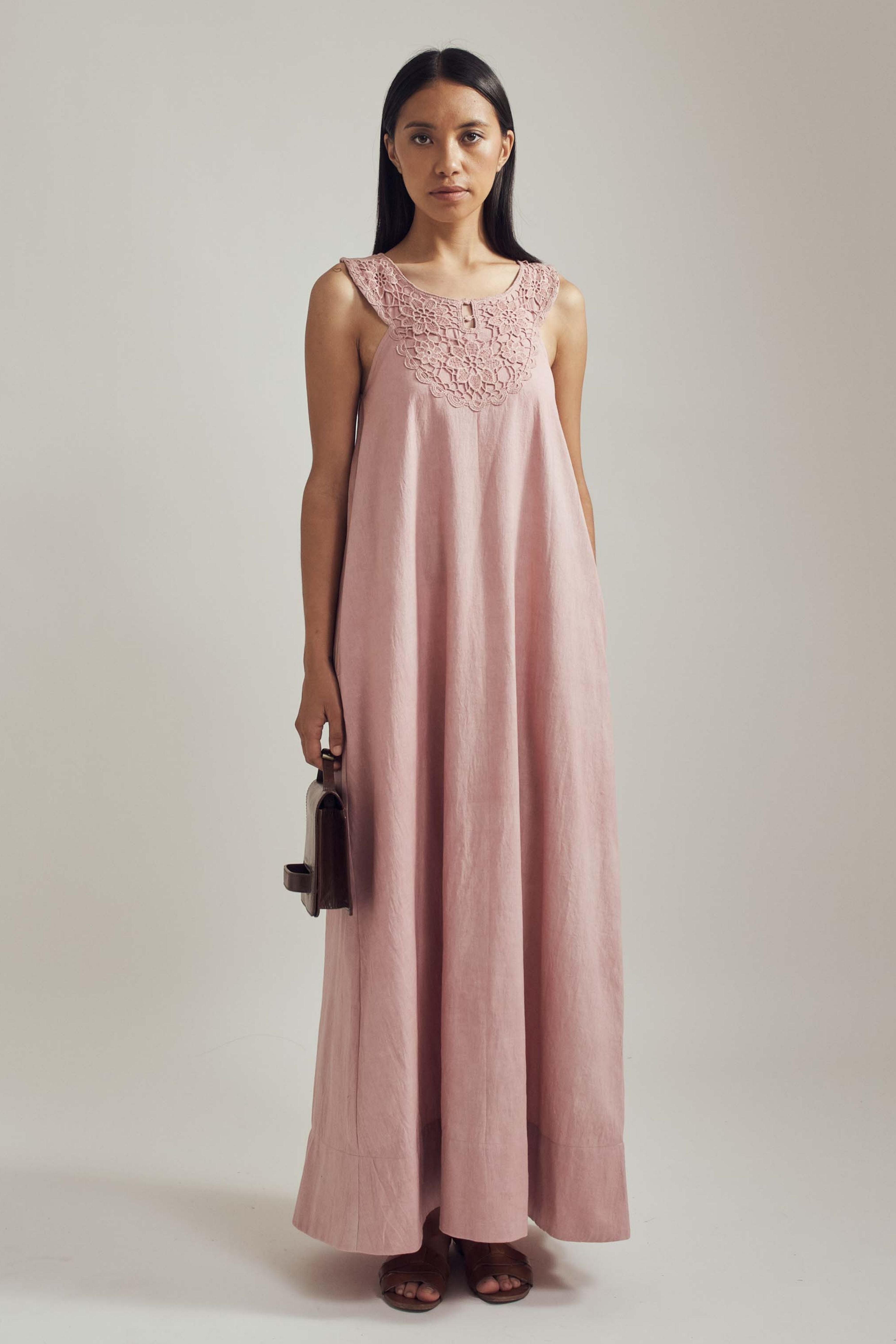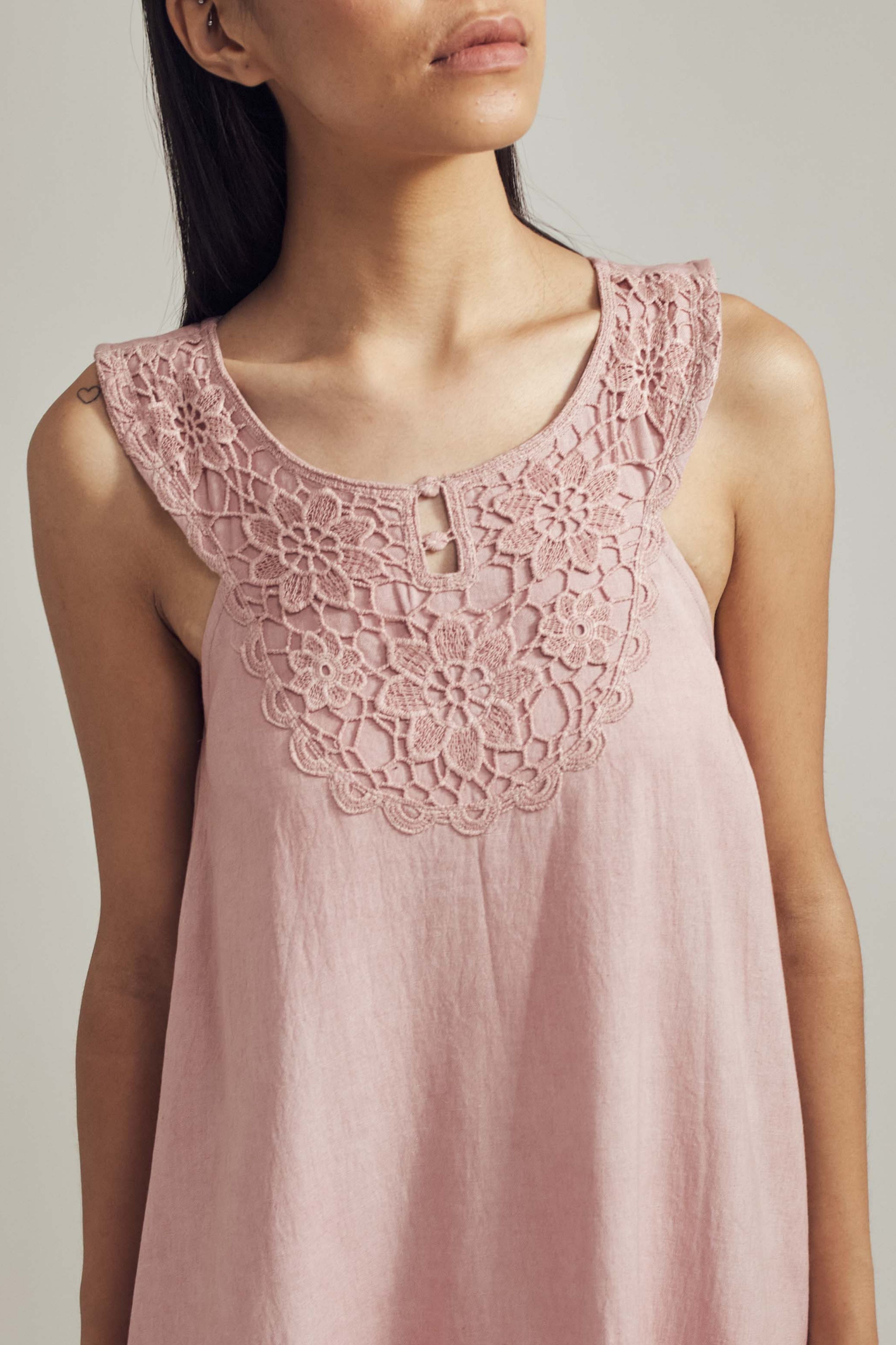 Handcrafted from cotton flax, this dress is comfortable, stylish and versatile. Lace patch on the neck, racerback, A line fit and pockets, this is a must have this summer. Team it up with sneakers or dress it up with your heels and you're good to go. The model is 5 feet 6 inches tall wearing size XS.