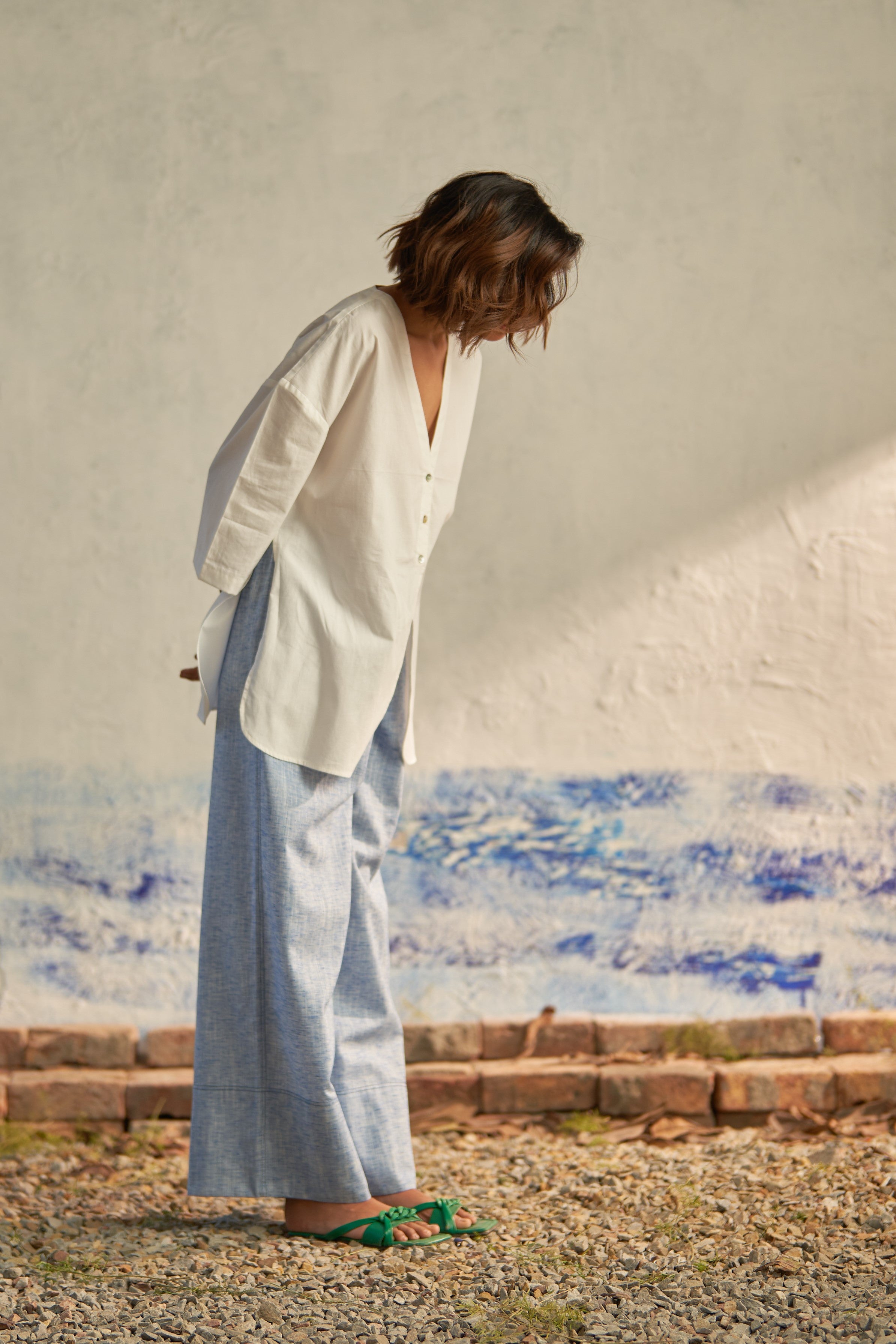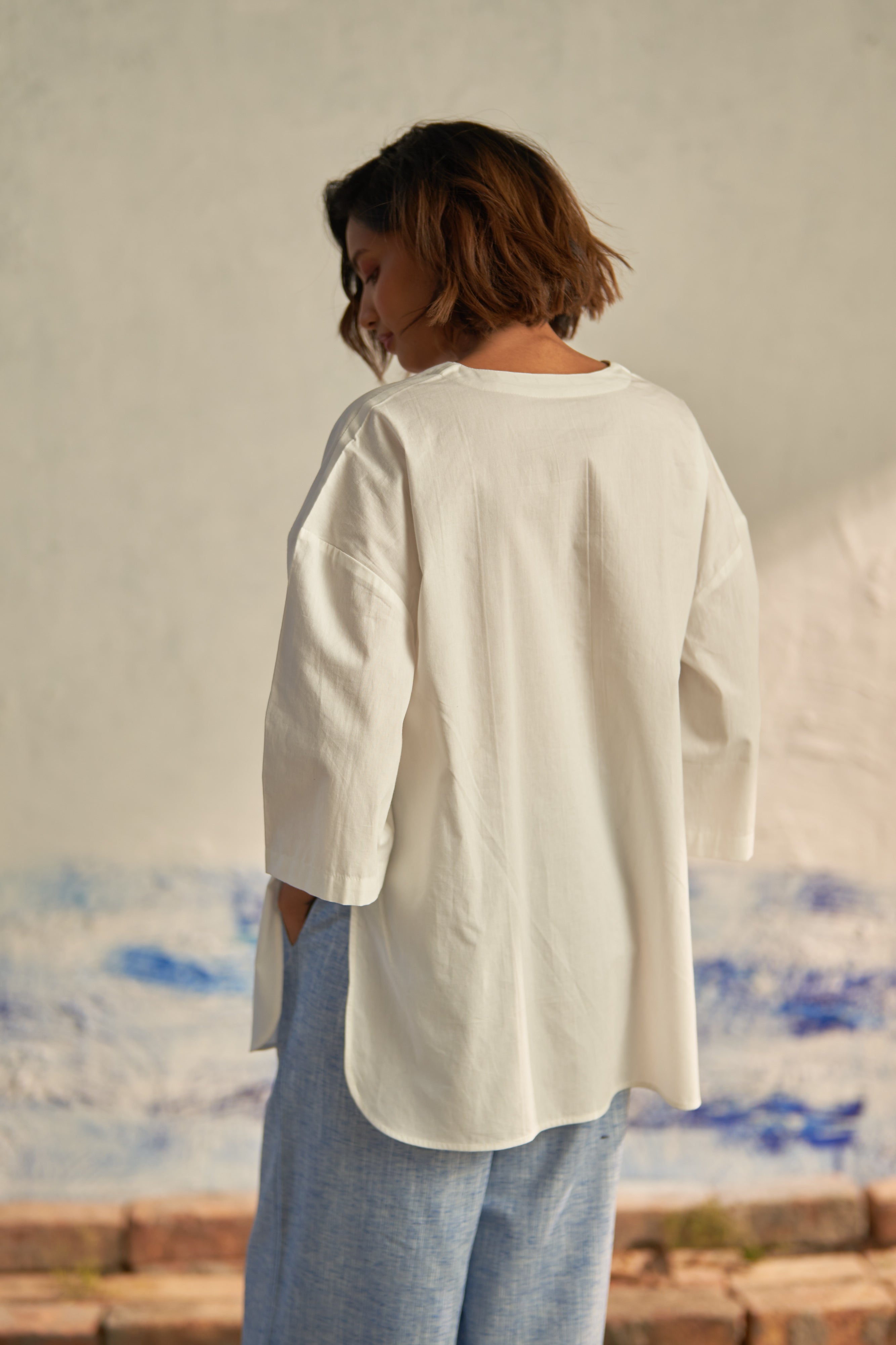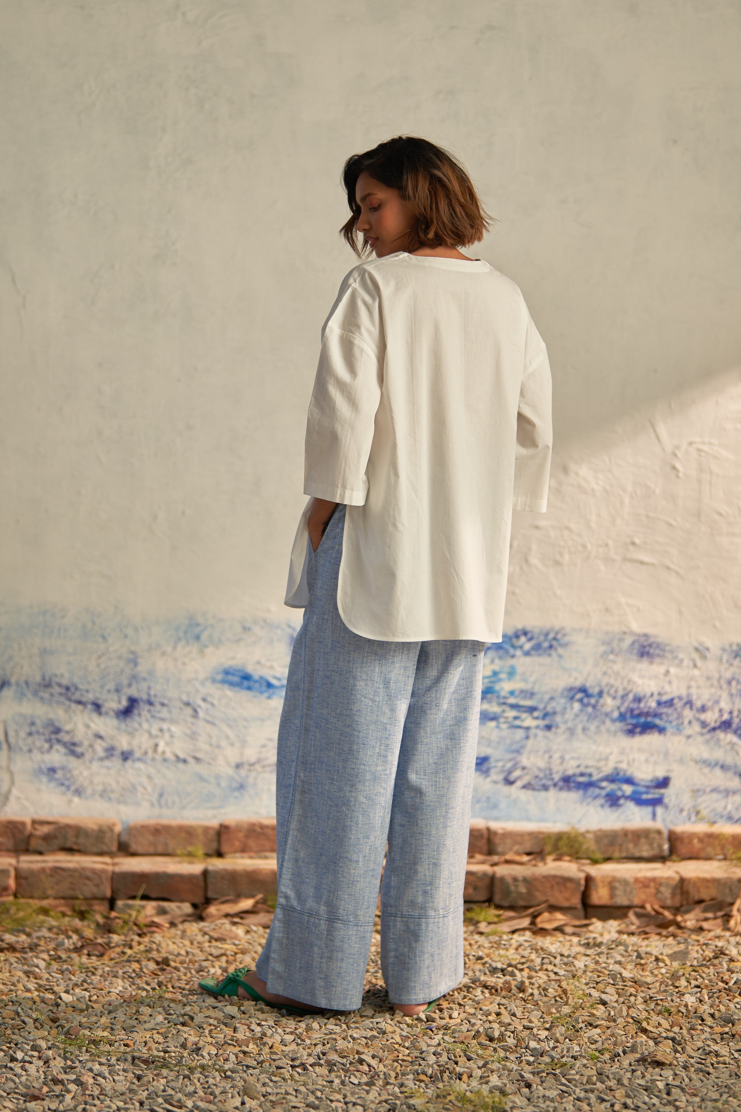 Effortlessly blend sophistication with modern flair in this ensemble. The premium cotton poplin shirt features a collarless design and oversized silhouette, exuding contemporary elegance. Paired with textured pants that offer both comfort and style with their wide legs and broad folds at the bottom, this outfit is a statement of relaxed refinement. The elasticated waistband adds to their laid-back appeal, ensuring a leisurewear feel that's perfect for any casual outing.