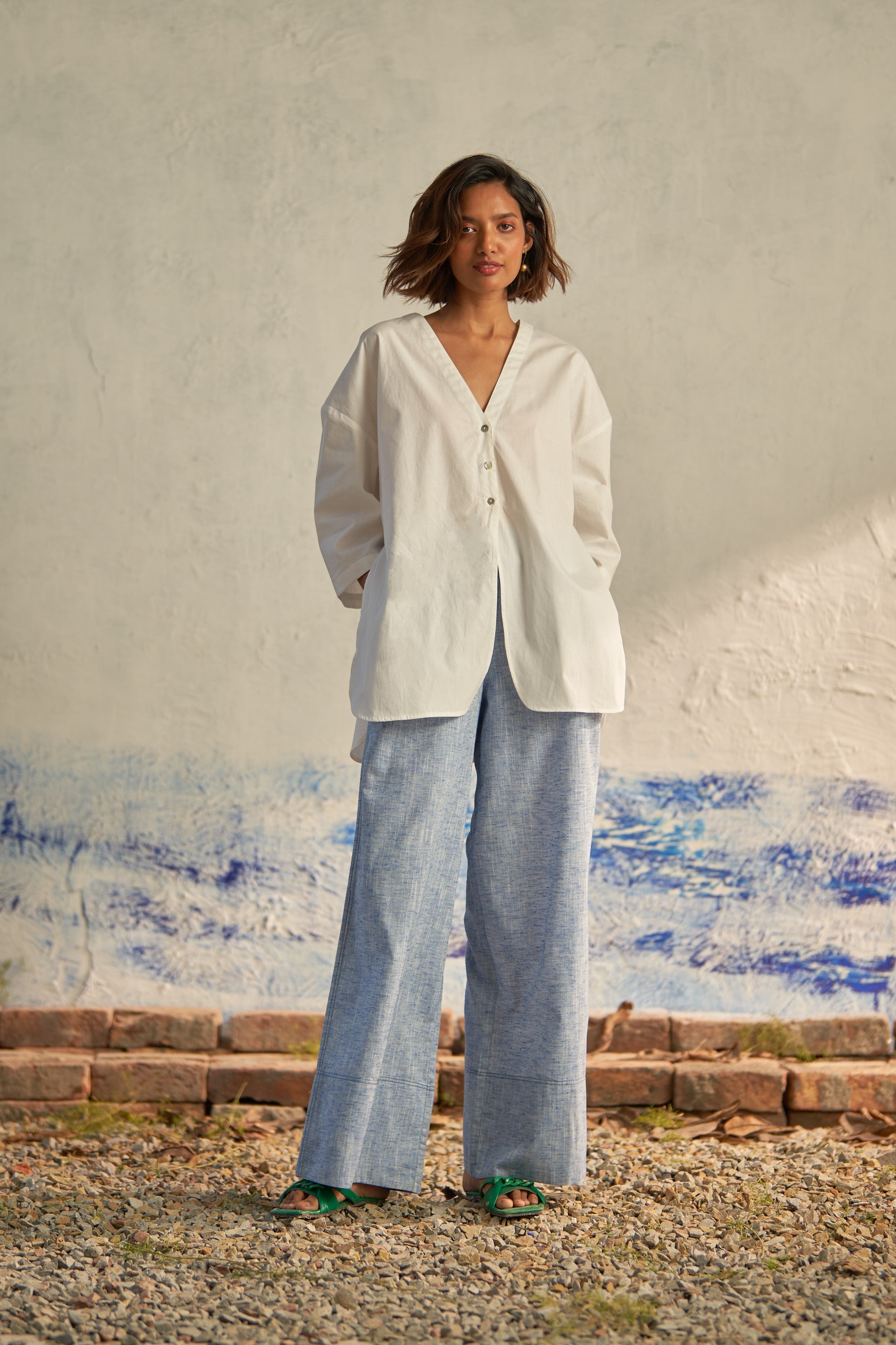 Effortlessly blend sophistication with modern flair in this ensemble. The premium cotton poplin shirt features a collarless design and oversized silhouette, exuding contemporary elegance. Paired with textured pants that offer both comfort and style with their wide legs and broad folds at the bottom, this outfit is a statement of relaxed refinement. The elasticated waistband adds to their laid-back appeal, ensuring a leisurewear feel that's perfect for any casual outing.