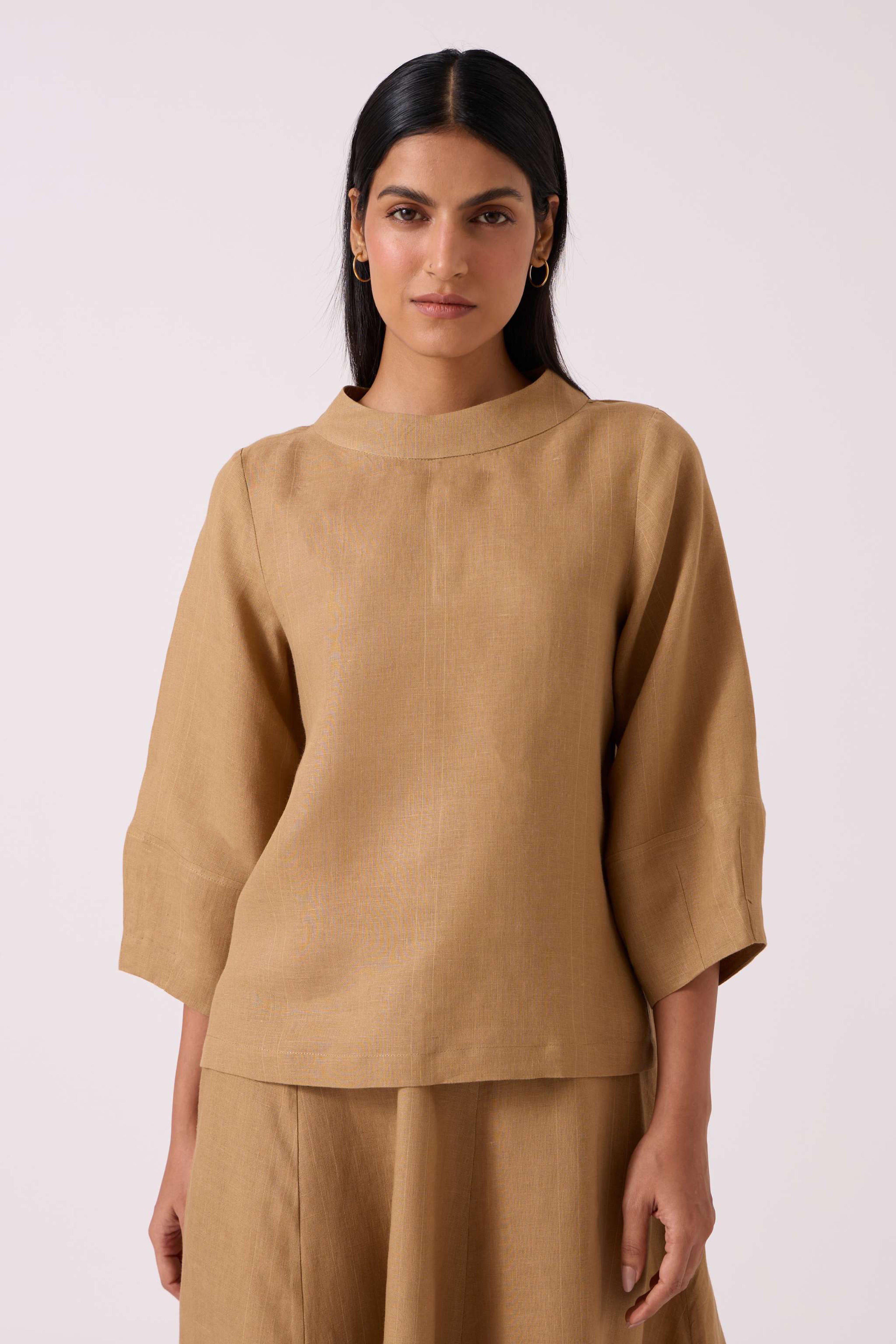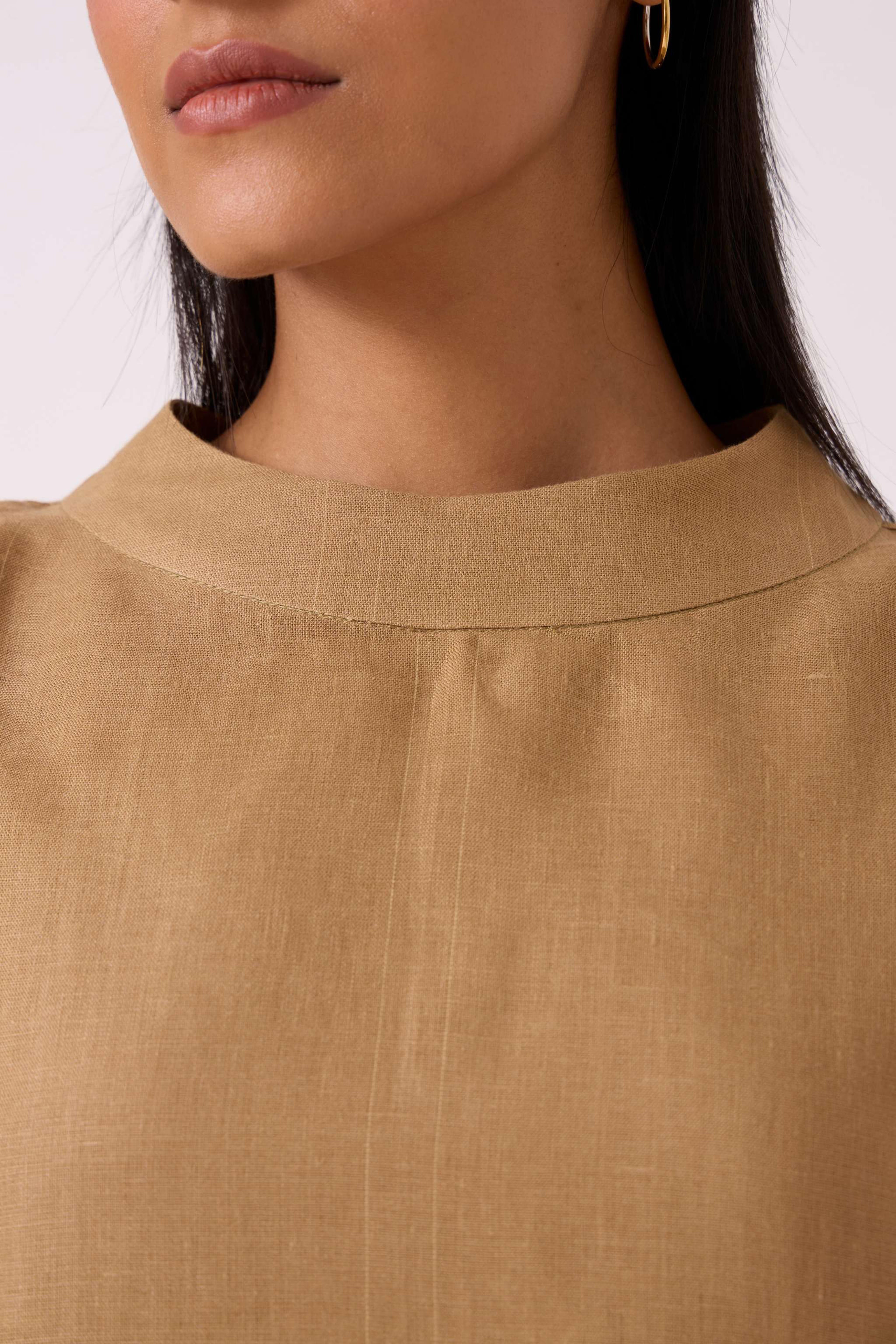 This *boxy, regular-fit top* features a *raised band collar* and a *back button fastening*. It is detailed with unique *set-in lantern sleeves*. The model, Chhavi, is 5'6" and is wearing a size XS.