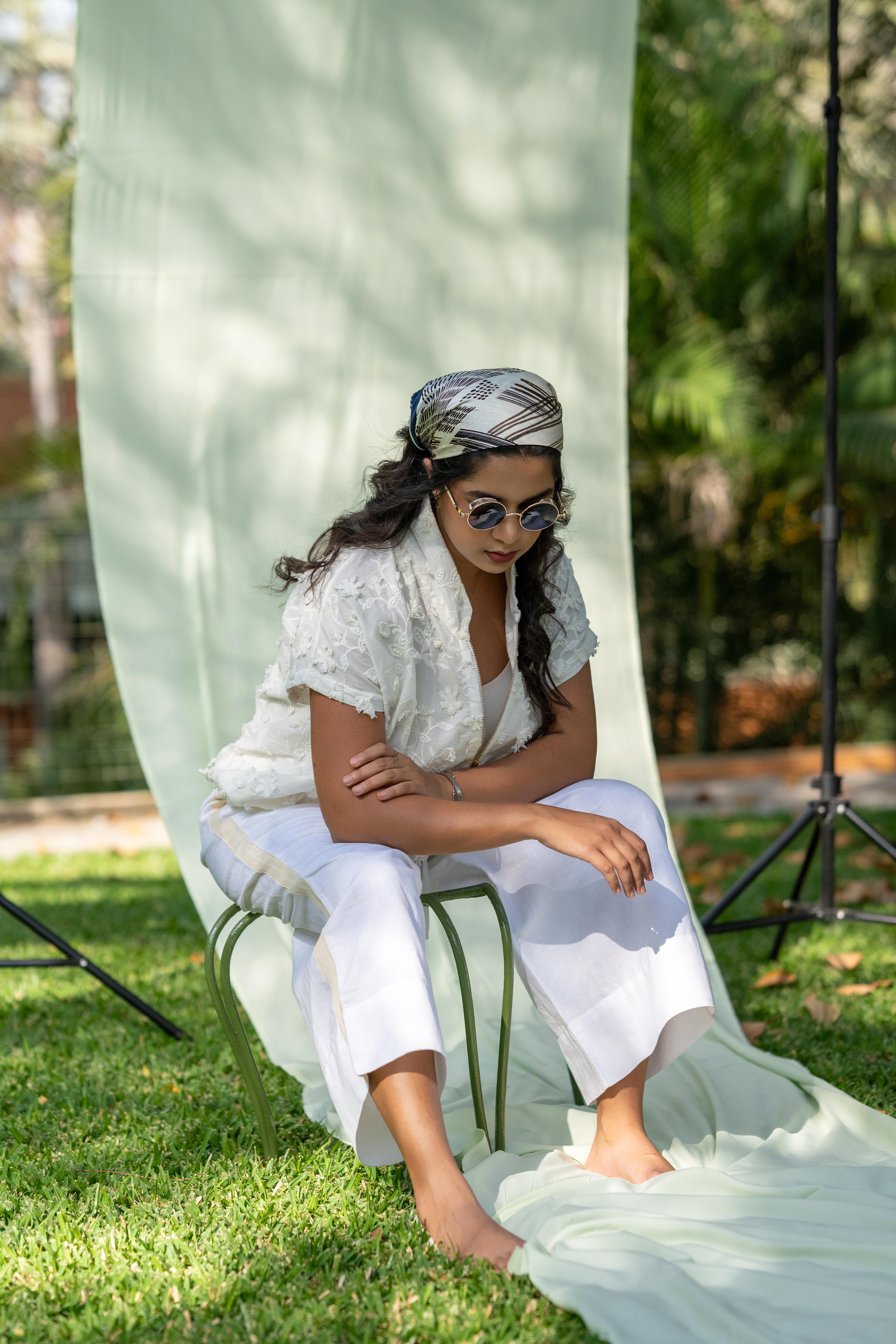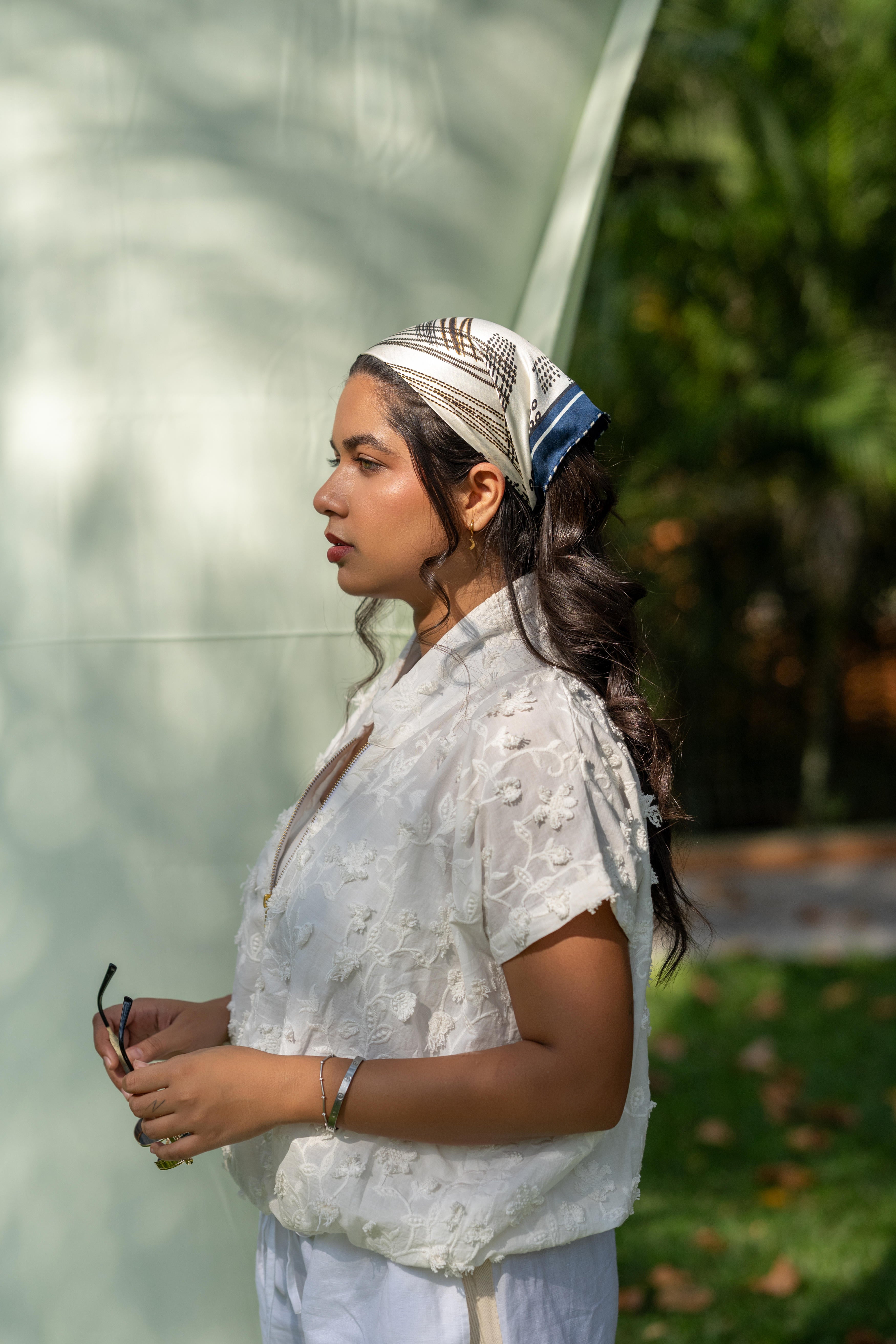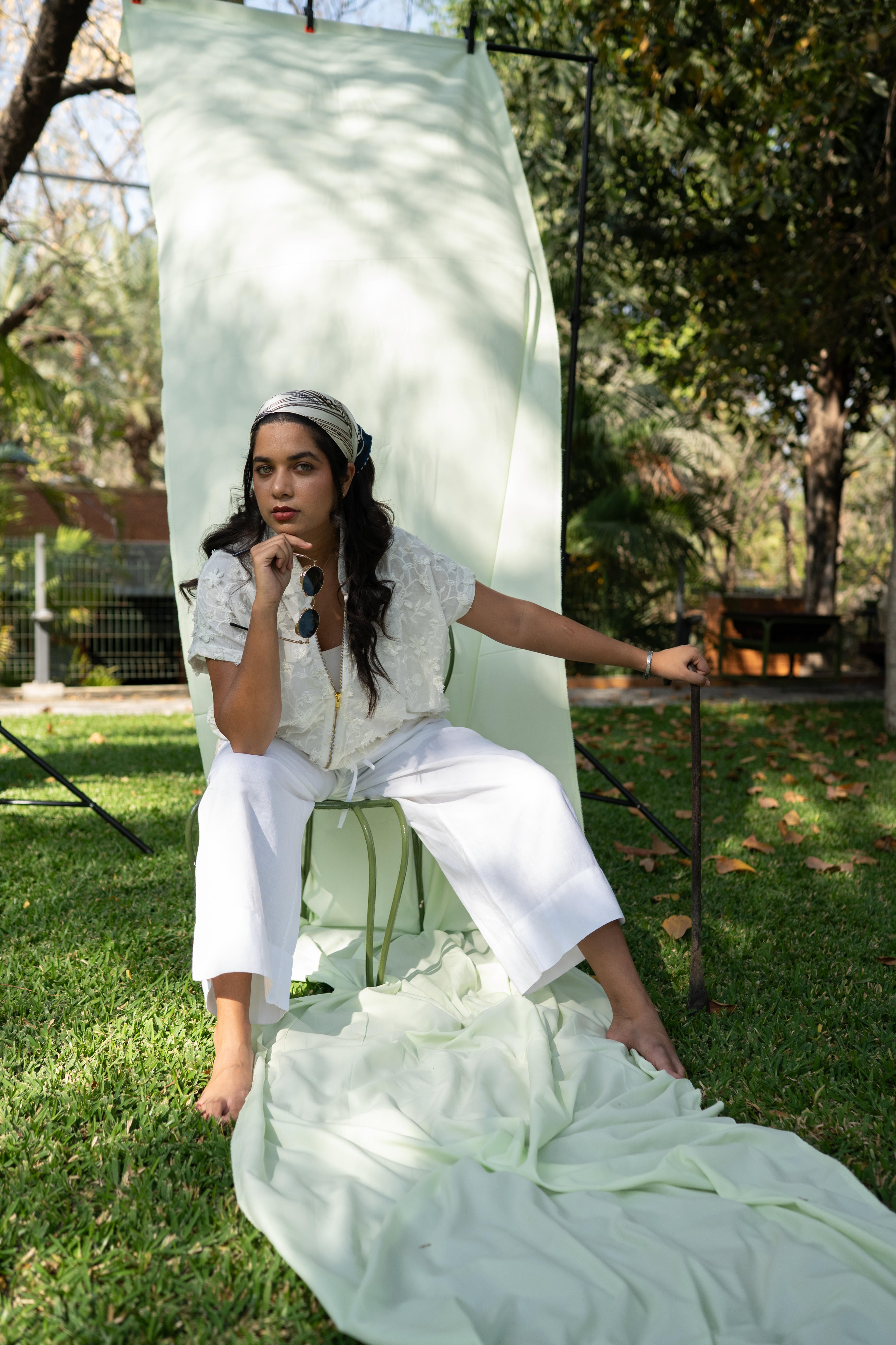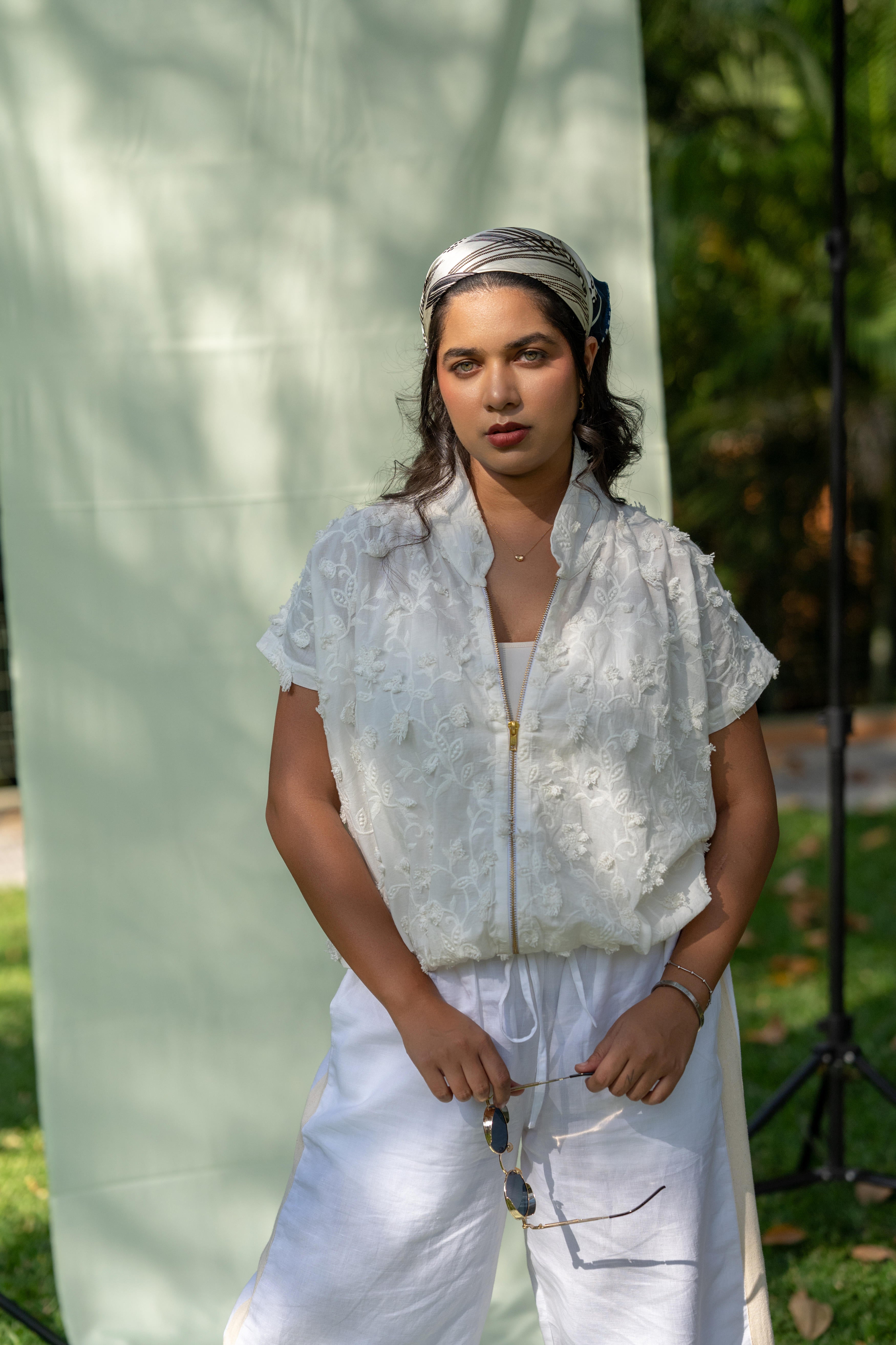 A structured yet lightweight layer, with appliqué details that echo the textures of landscapes. Meant to be thrown over prints for contrast or paired with tonal separates for a monochrome, textural play. The perfect balance of softness and structure