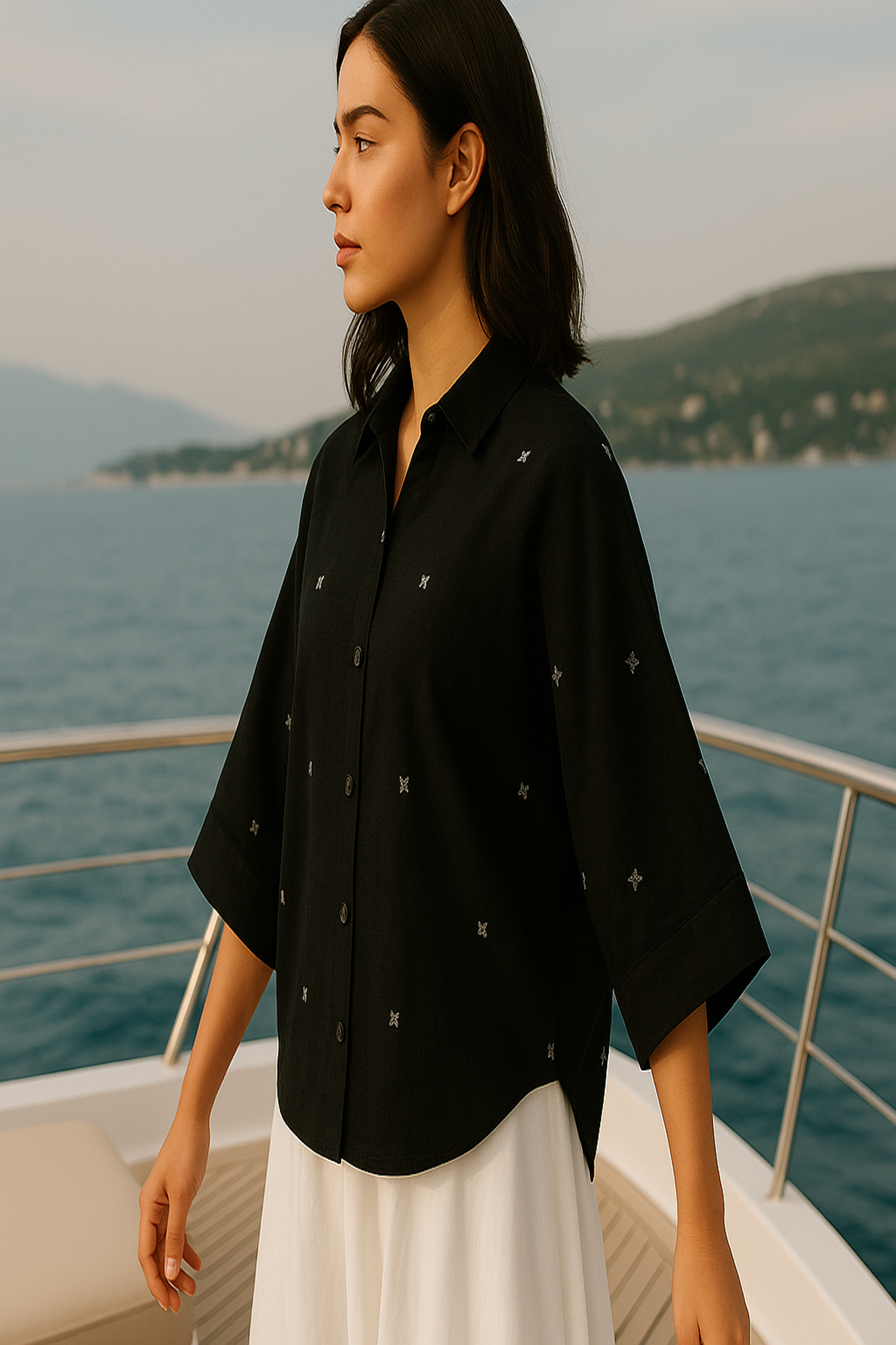 The Bia shirt has a flowy silhouette for maximum comfortability. It features slightly cropped but cuffed sleeves, a round collar, a gently curved hem and elegant Dolman sleeves for an elevated feel. Wooden button closure to make the shirt more classy and feminine. This piece can be easily tucked into pants, with denims for a more laid-back look or with a fitted skirt for more formal occasions. The fabric is breathable and lightweight in an all time favourite natural black with artisanal motifs all over.
