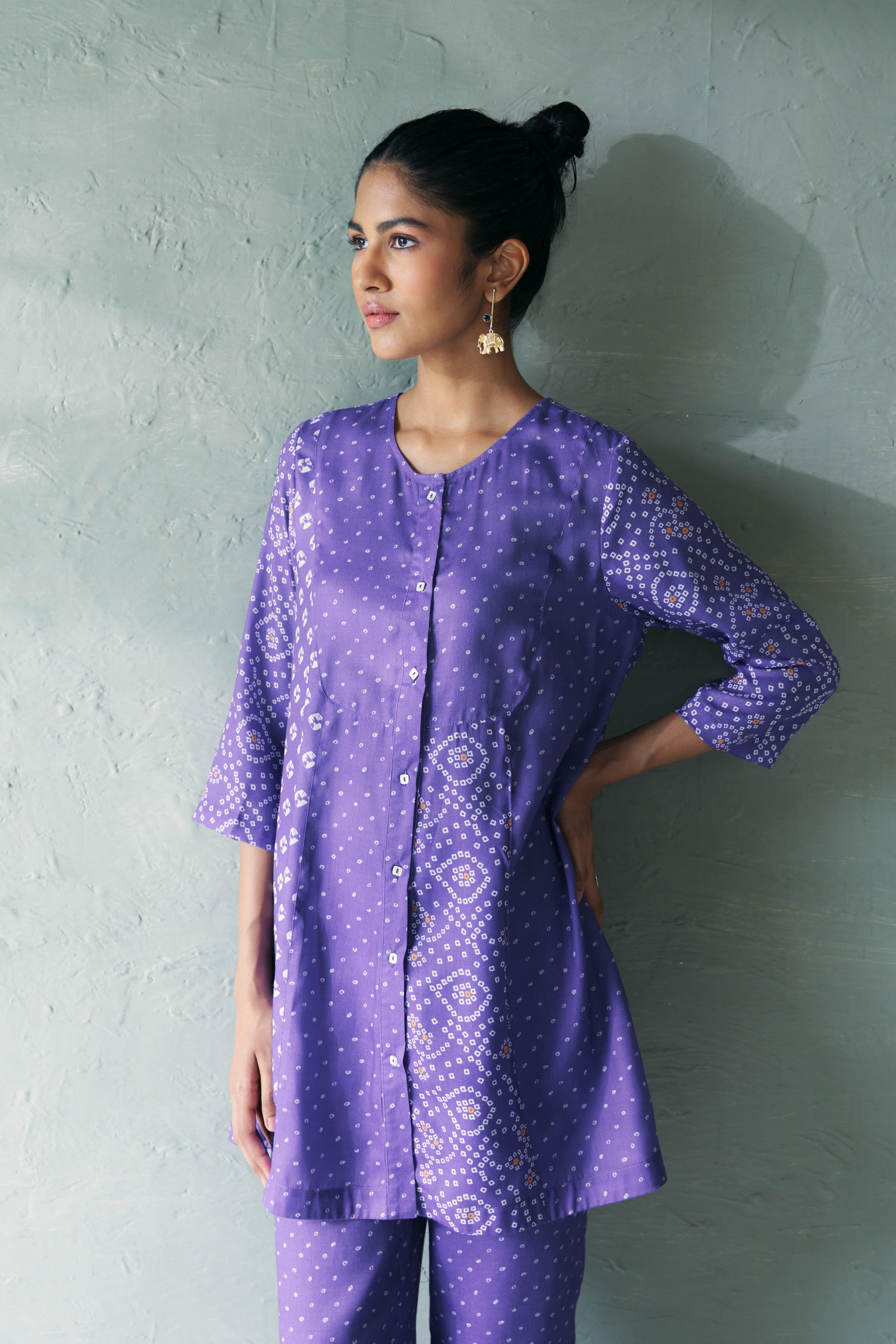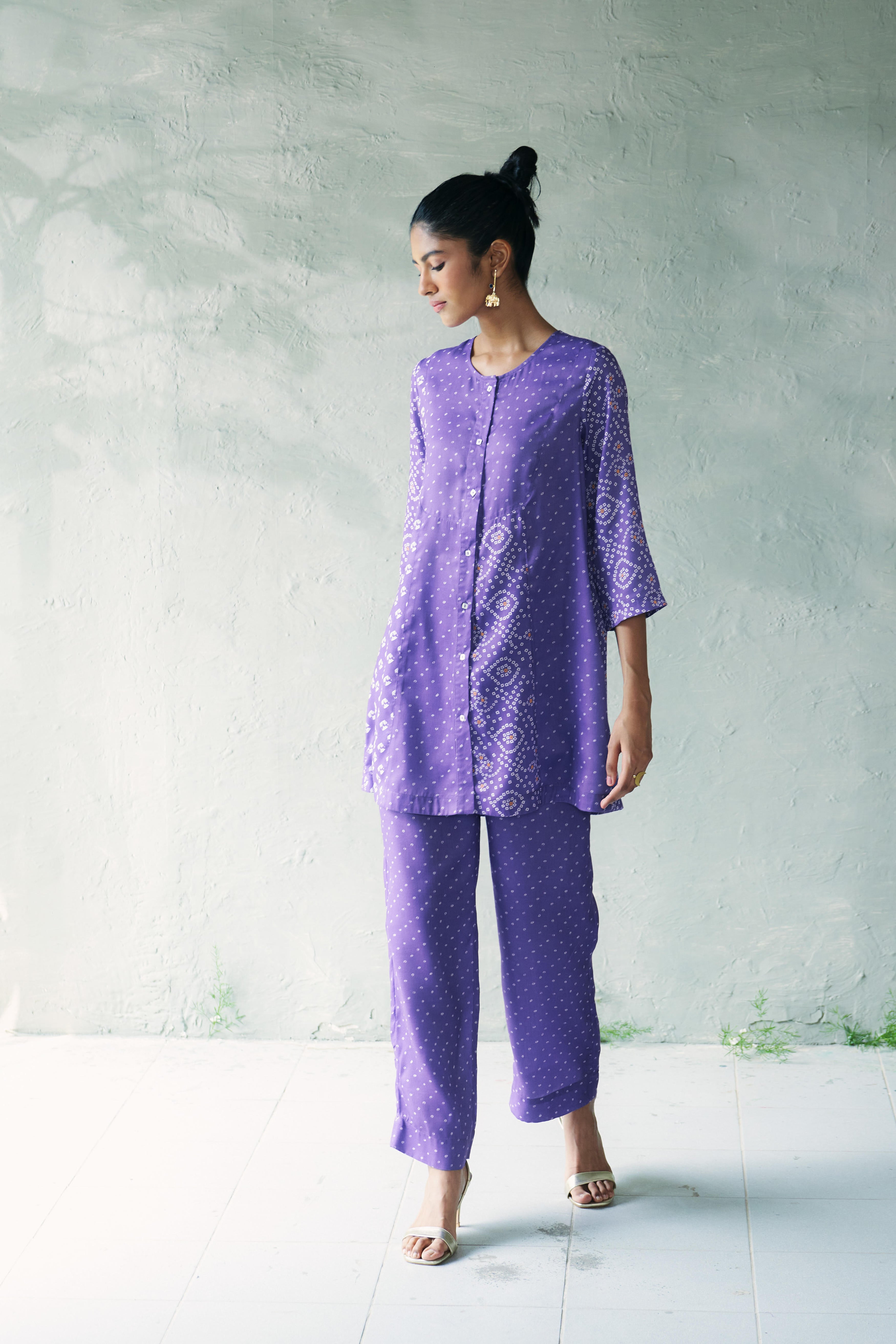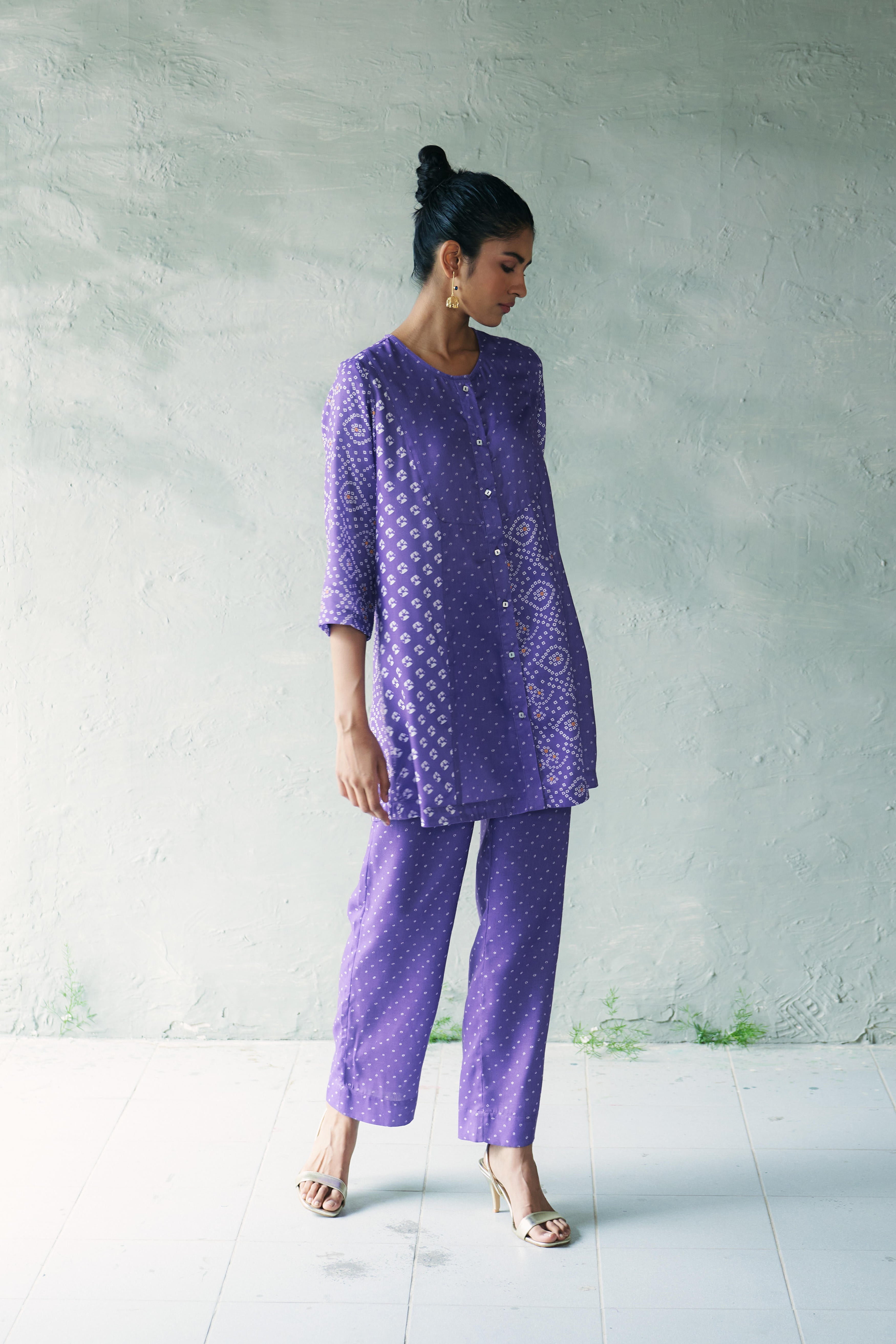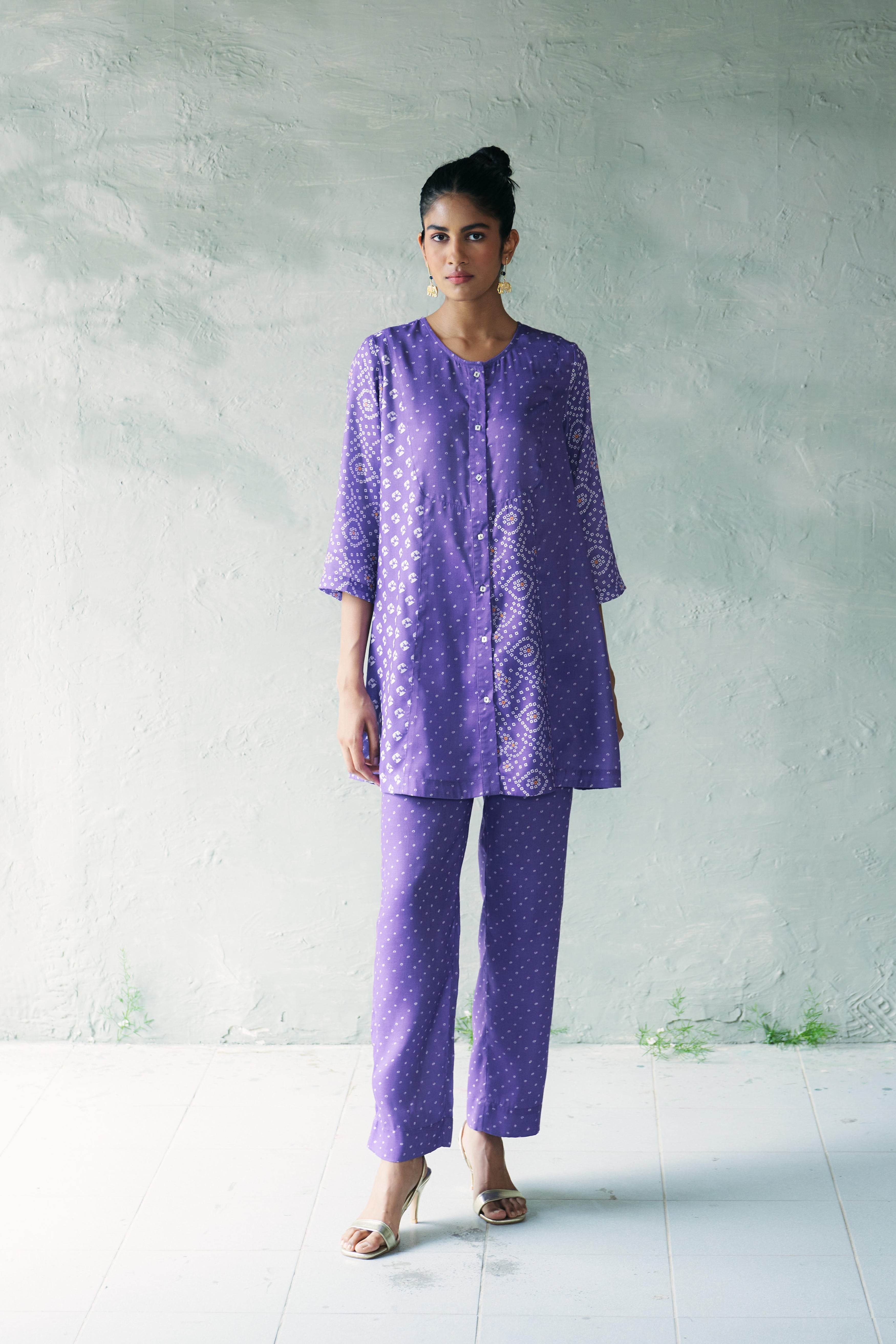 The Bindu Amethyst Kurta Set offers an elevated take on Bandhani tradition in a rich purple hue. With a short, front-buttoned kurta designed in a panelled structure and accented by contrast print detailing, the set is complete with straight pleated pants featuring a side zip. A stylish ensemble ideal for semi-formal occasions and festive evenings.