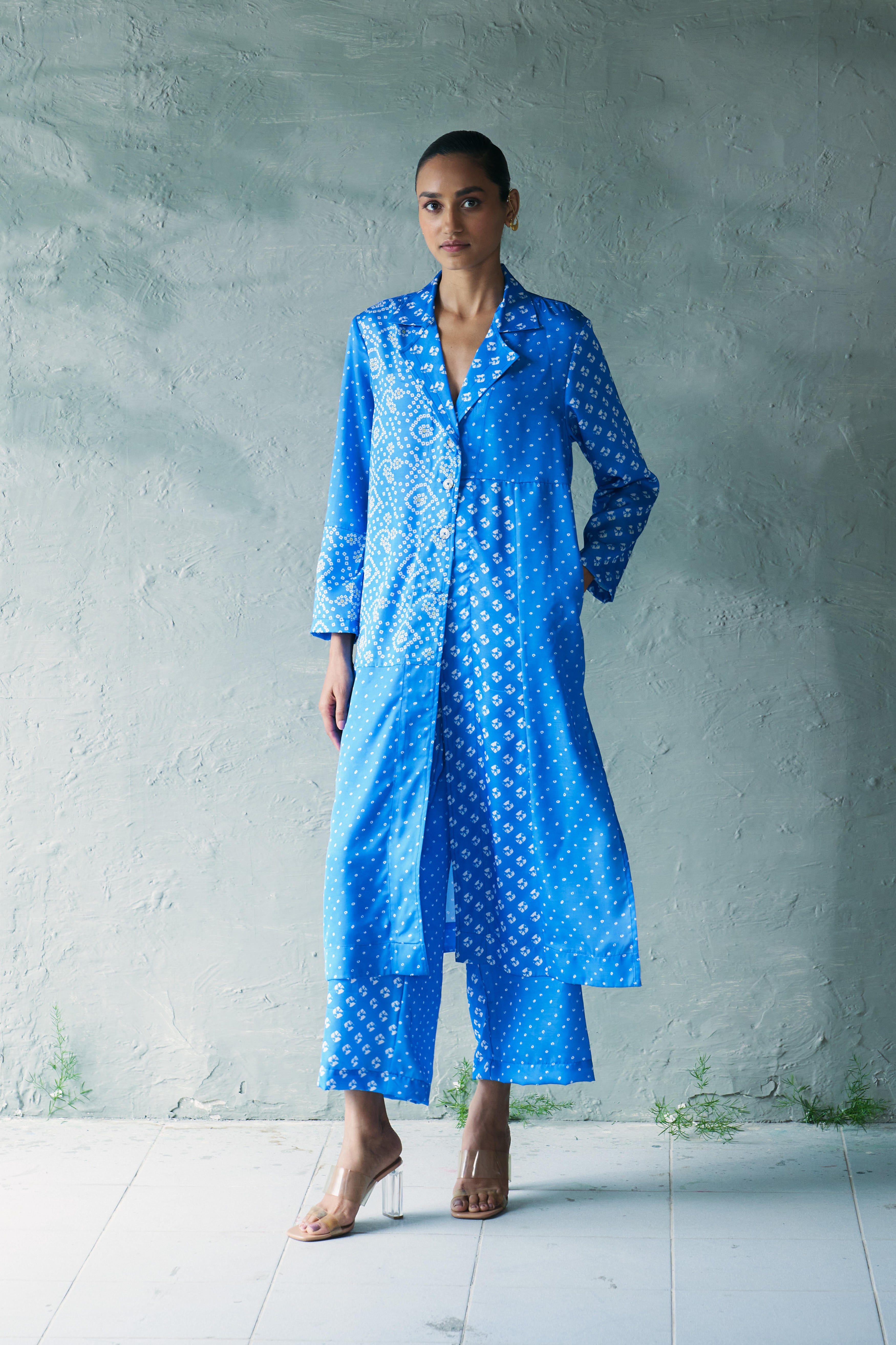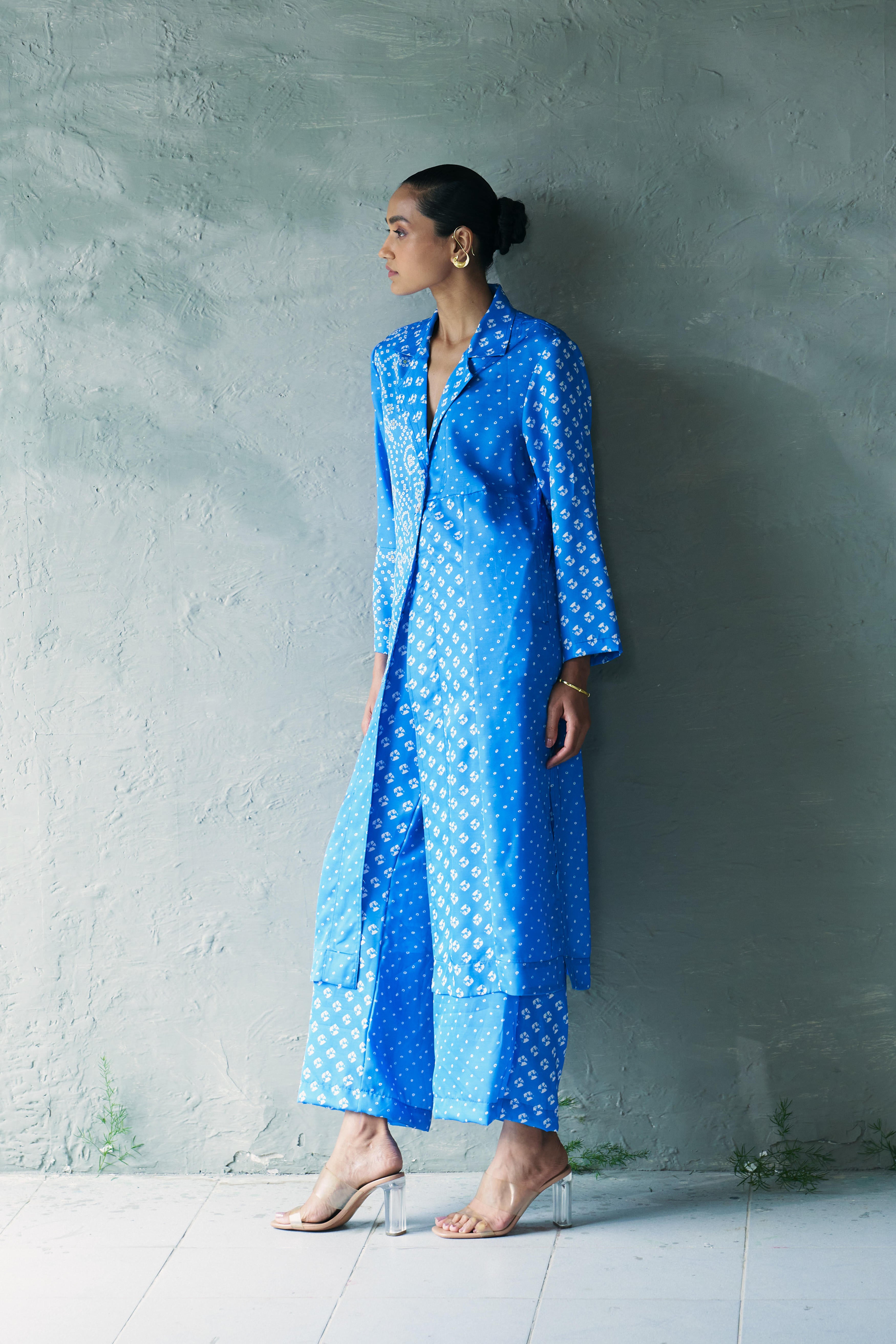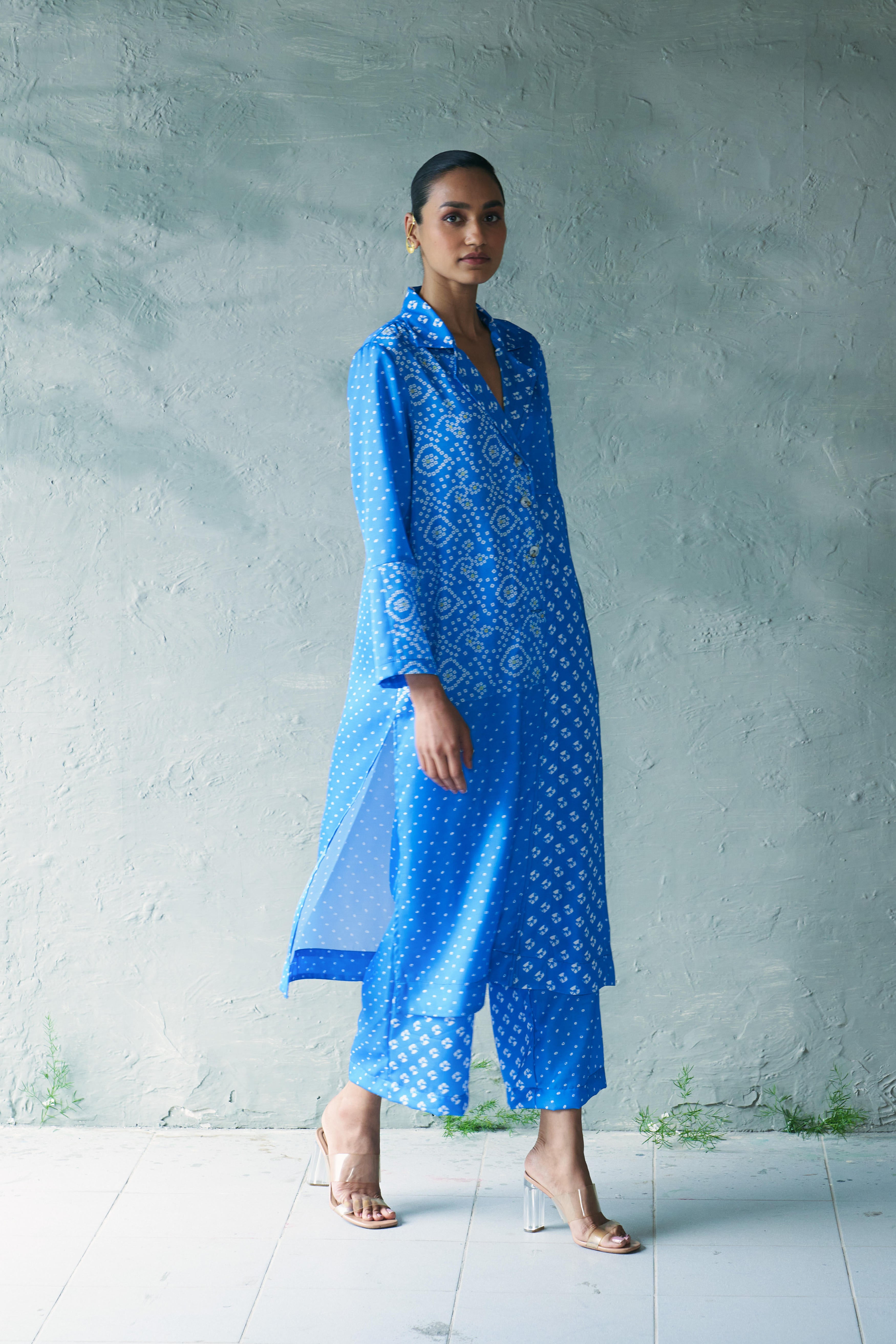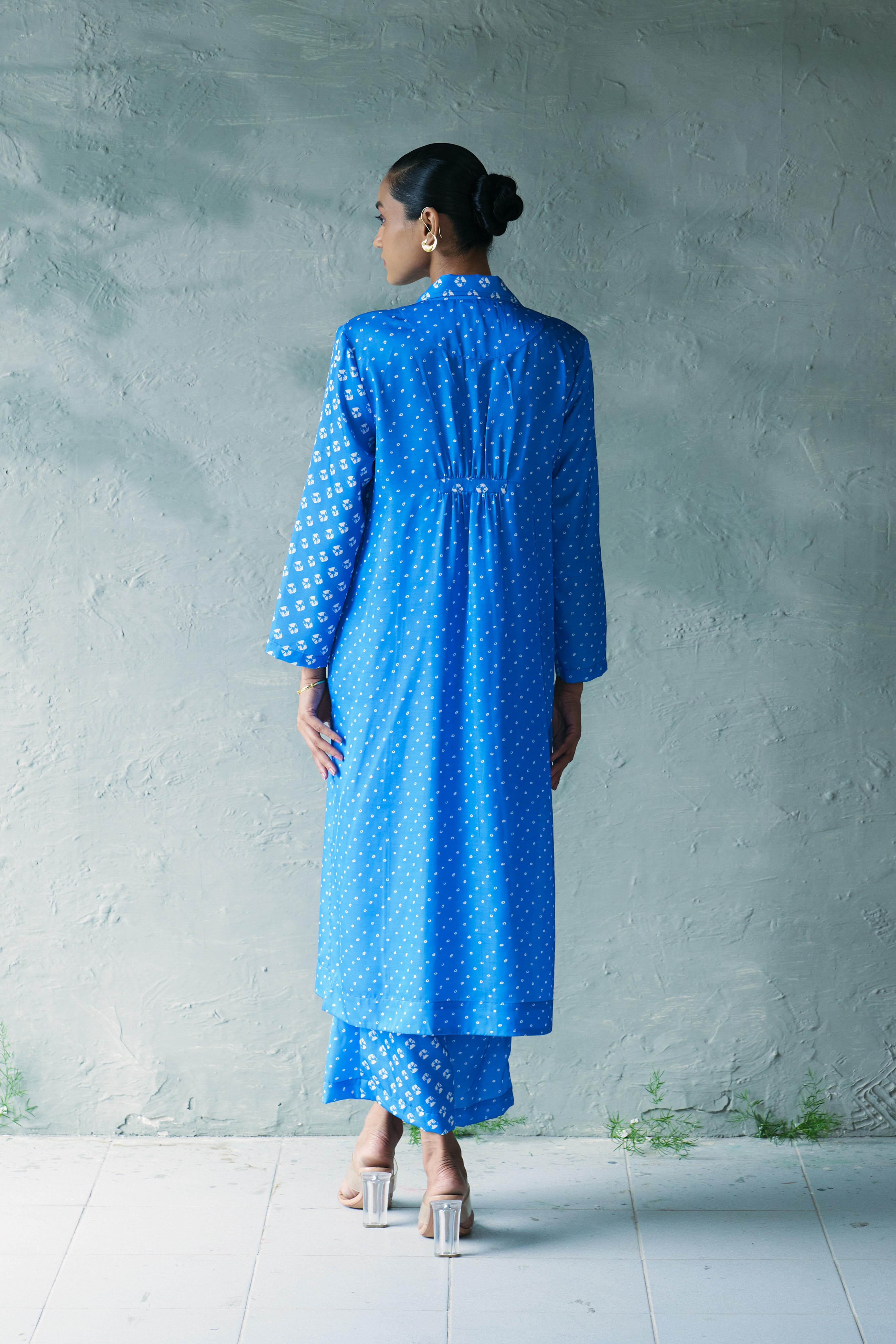 The Bindu Collared Kurta Set captures the rhythmic beauty of Bandhani with its refined long shirt-style silhouette. Designed with a structured collar and soft tailoring, this semi-formal ensemble features a panelled kurta with side pockets and matching fully elasticated pants with drawstring for comfort. Thoughtful placement of prints and a modern twist on tradition make it perfect for festive gatherings, workdays, or elevated everyday moments.