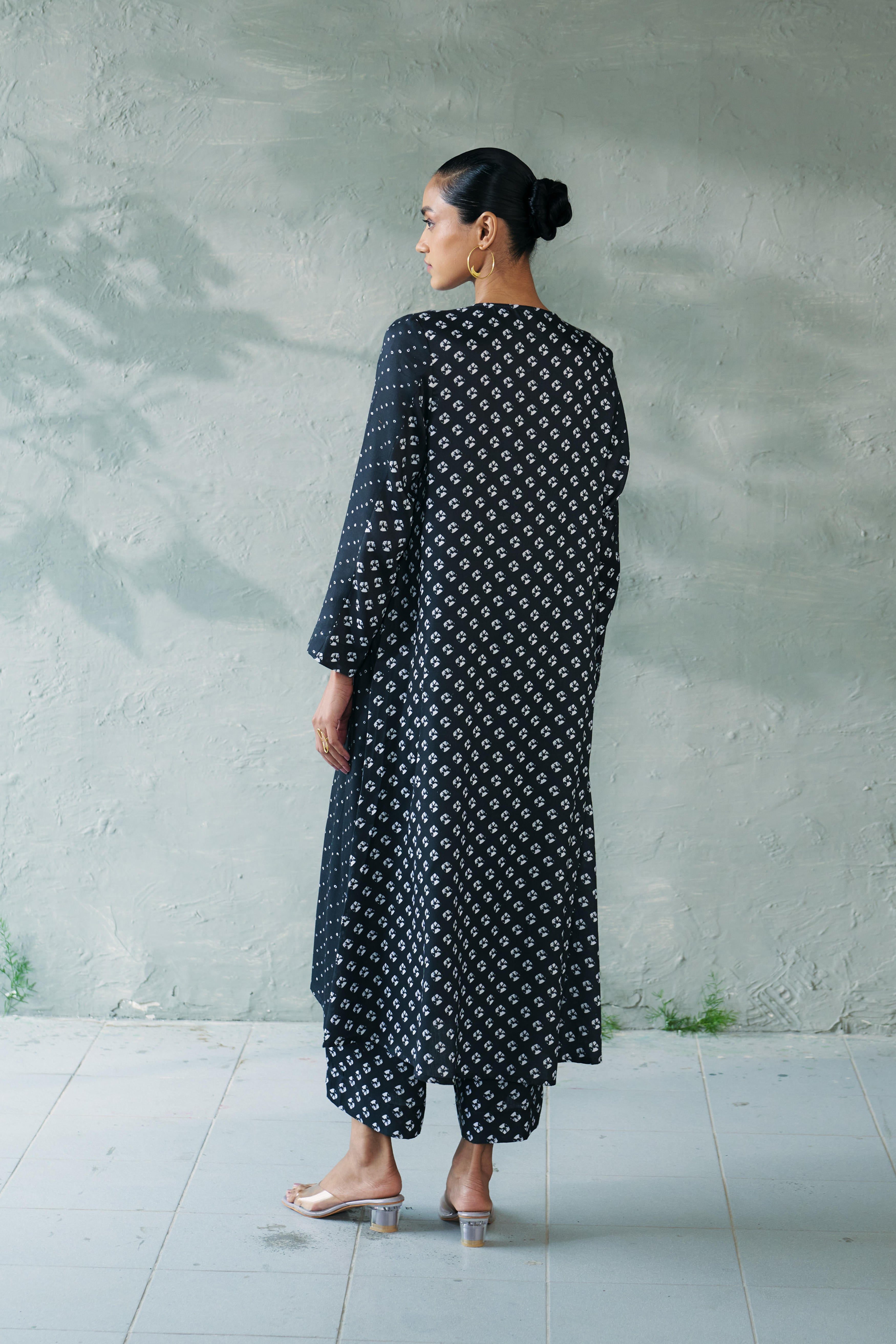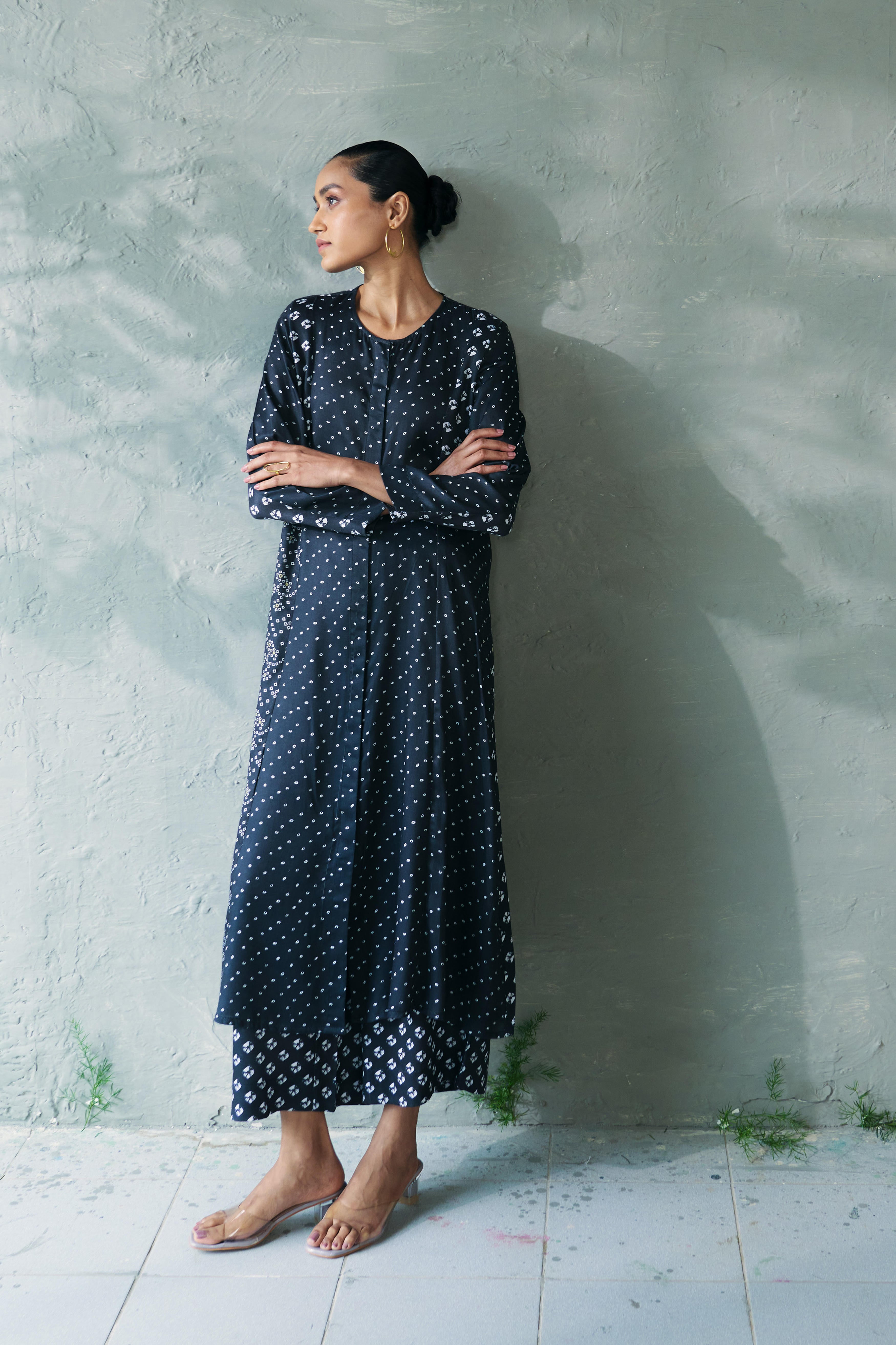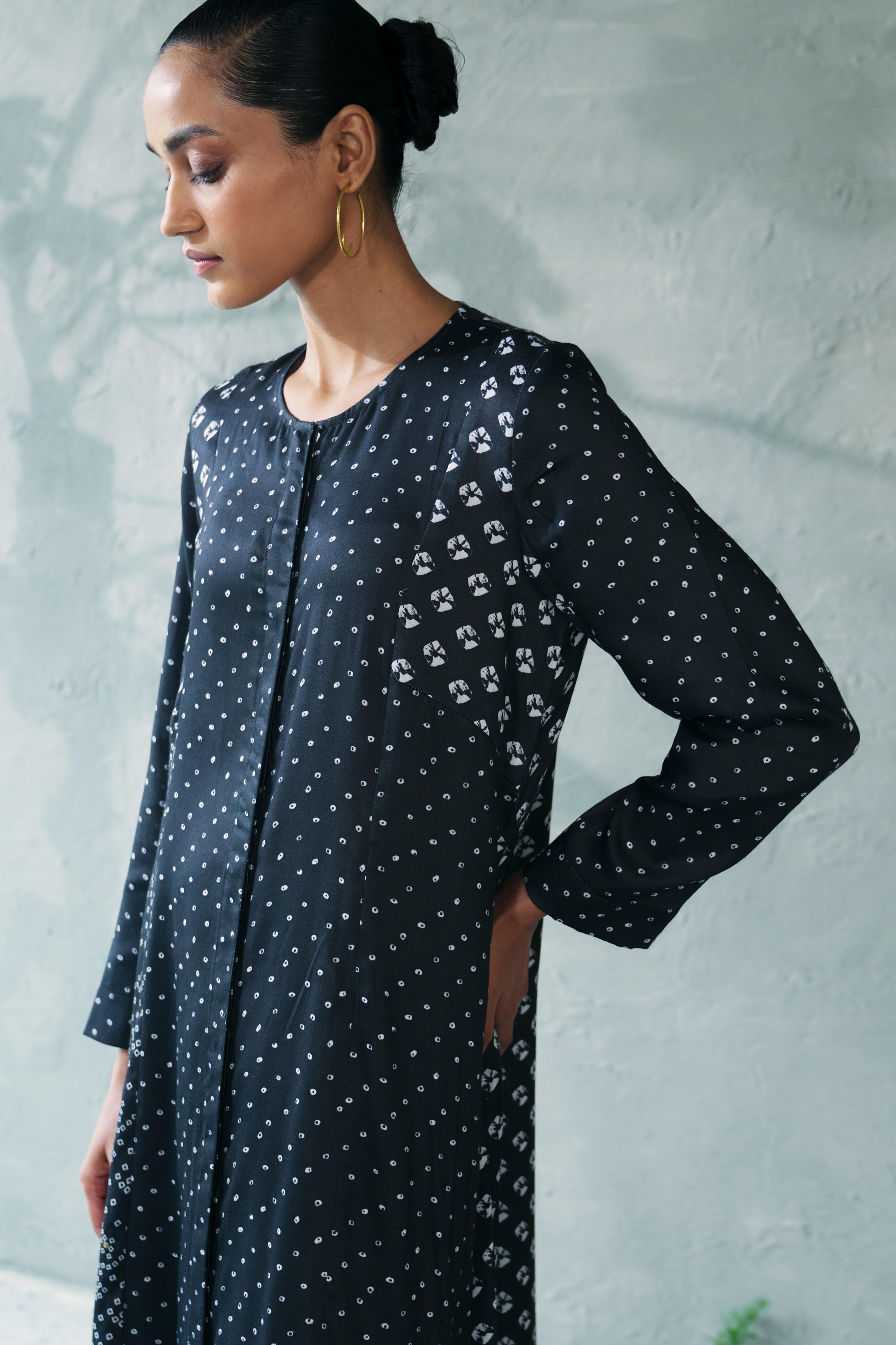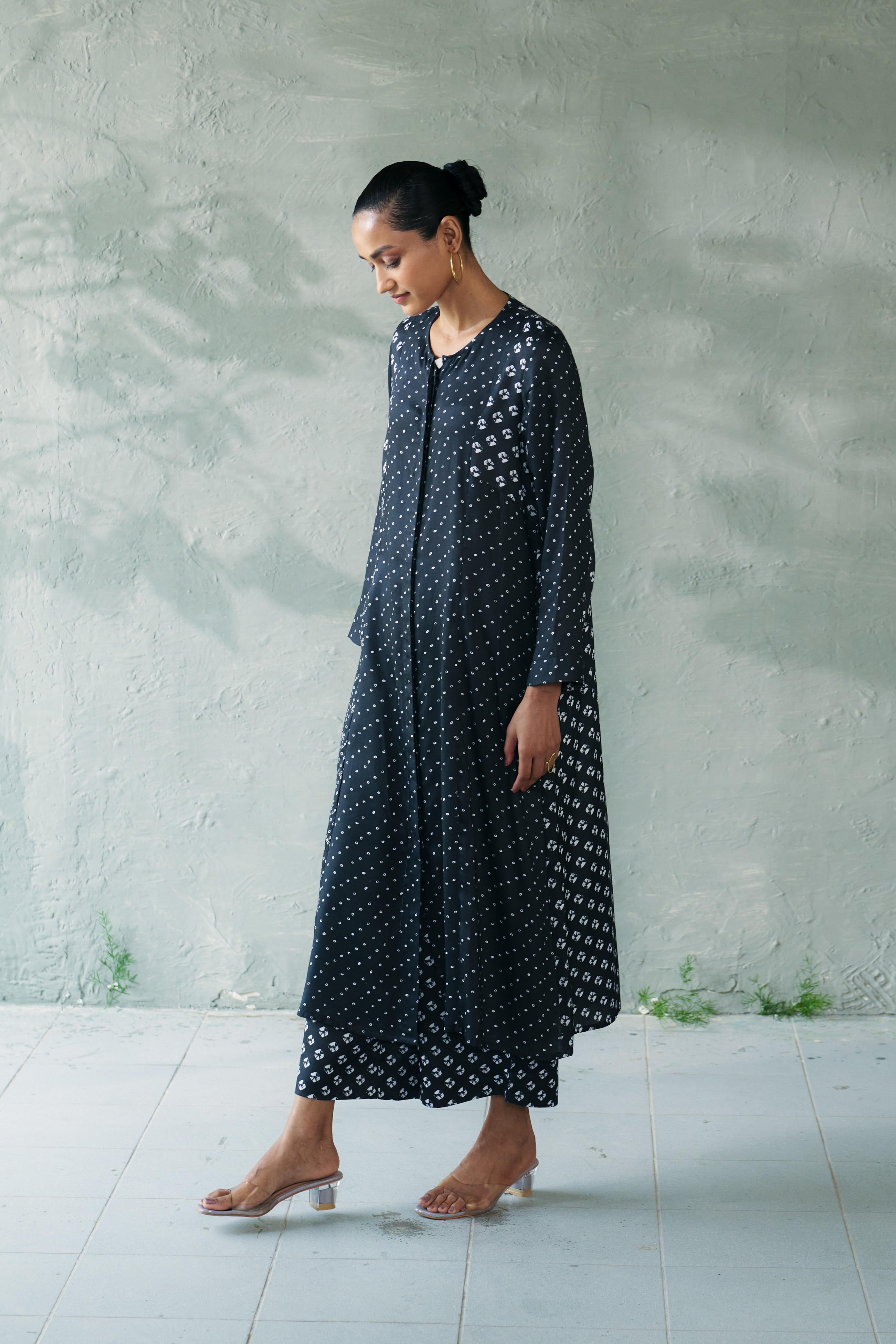In timeless black, the Bindu Noir Kurta Set showcases the elegance of Bandhani in a modern front-placket design. Concealed buttons and contrast-printed side panels and sleeves add visual intrigue. Paired with a fully elasticated pant featuring a drawstring waist for all-day ease. Perfect for intimate gatherings and festive family moments in the season ahead.