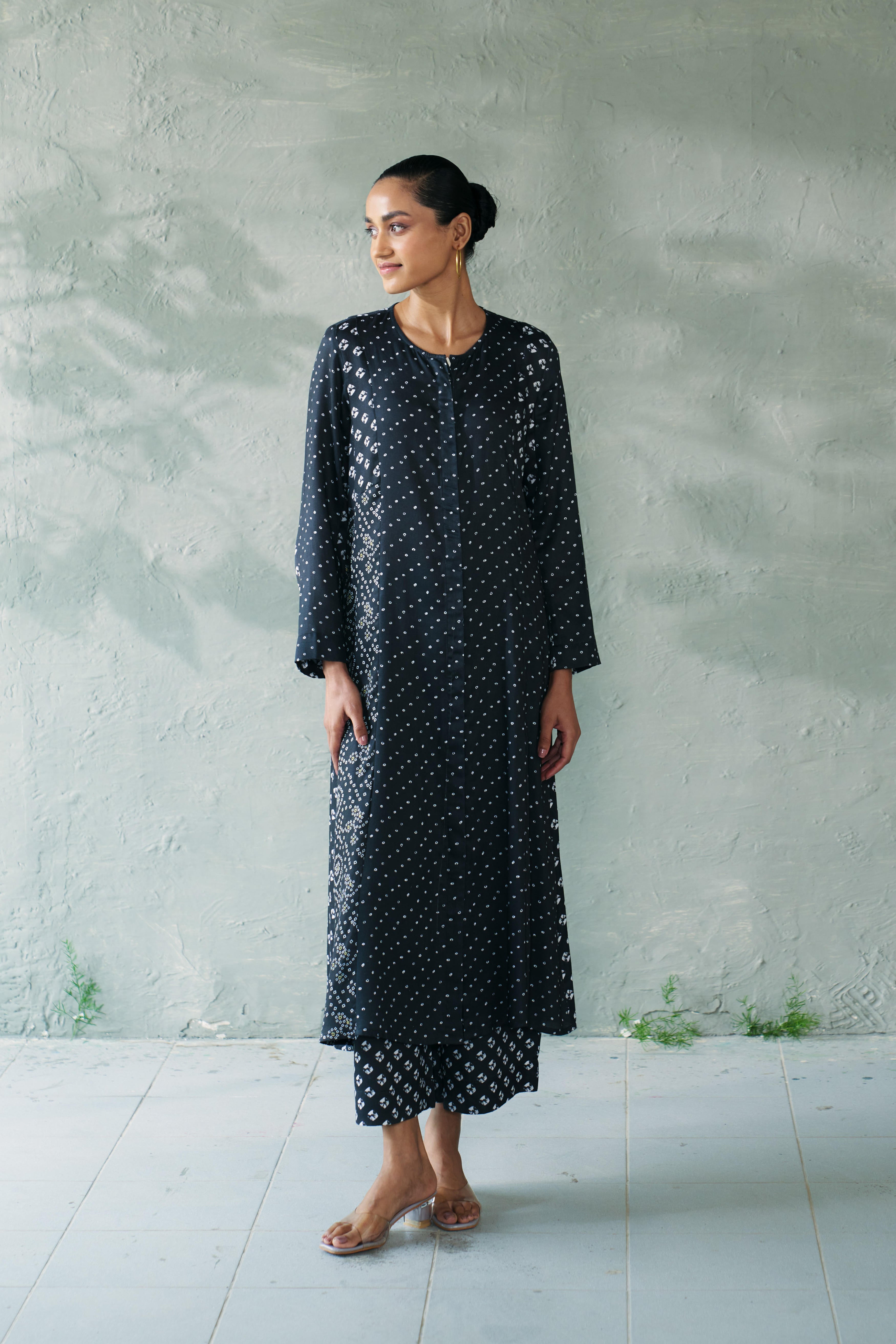 In timeless black, the Bindu Noir Kurta Set showcases the elegance of Bandhani in a modern front-placket design. Concealed buttons and contrast-printed side panels and sleeves add visual intrigue. Paired with a fully elasticated pant featuring a drawstring waist for all-day ease. Perfect for intimate gatherings and festive family moments in the season ahead.